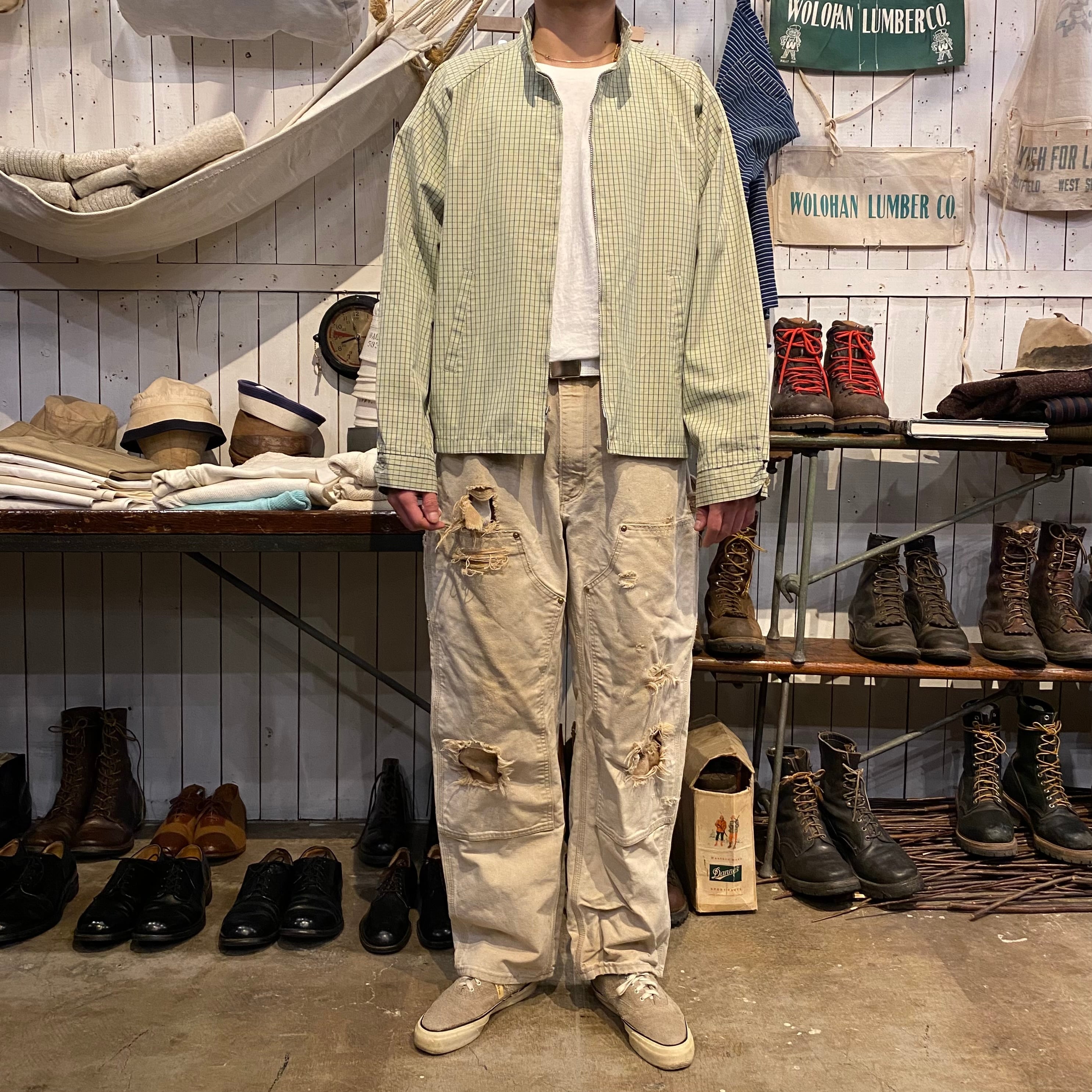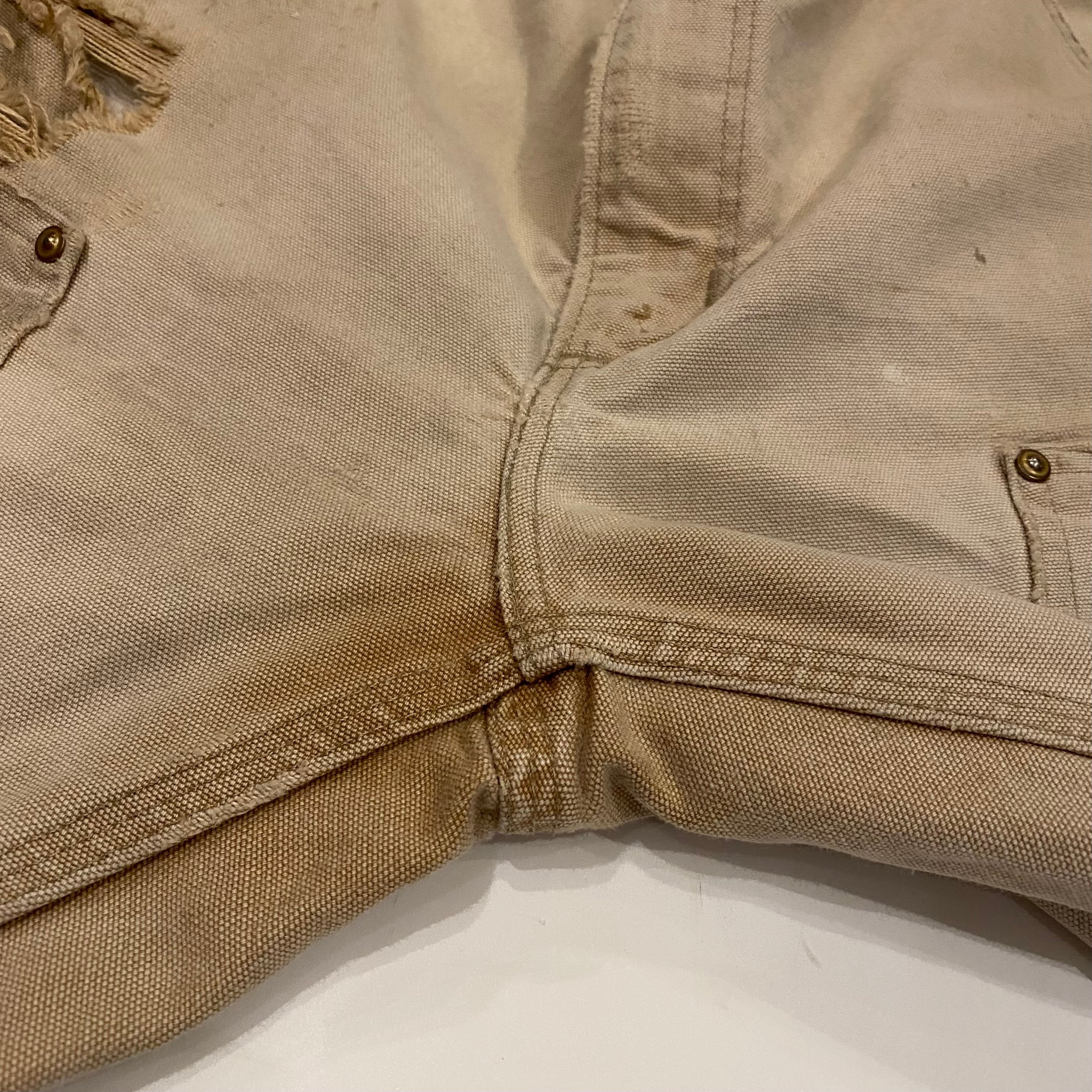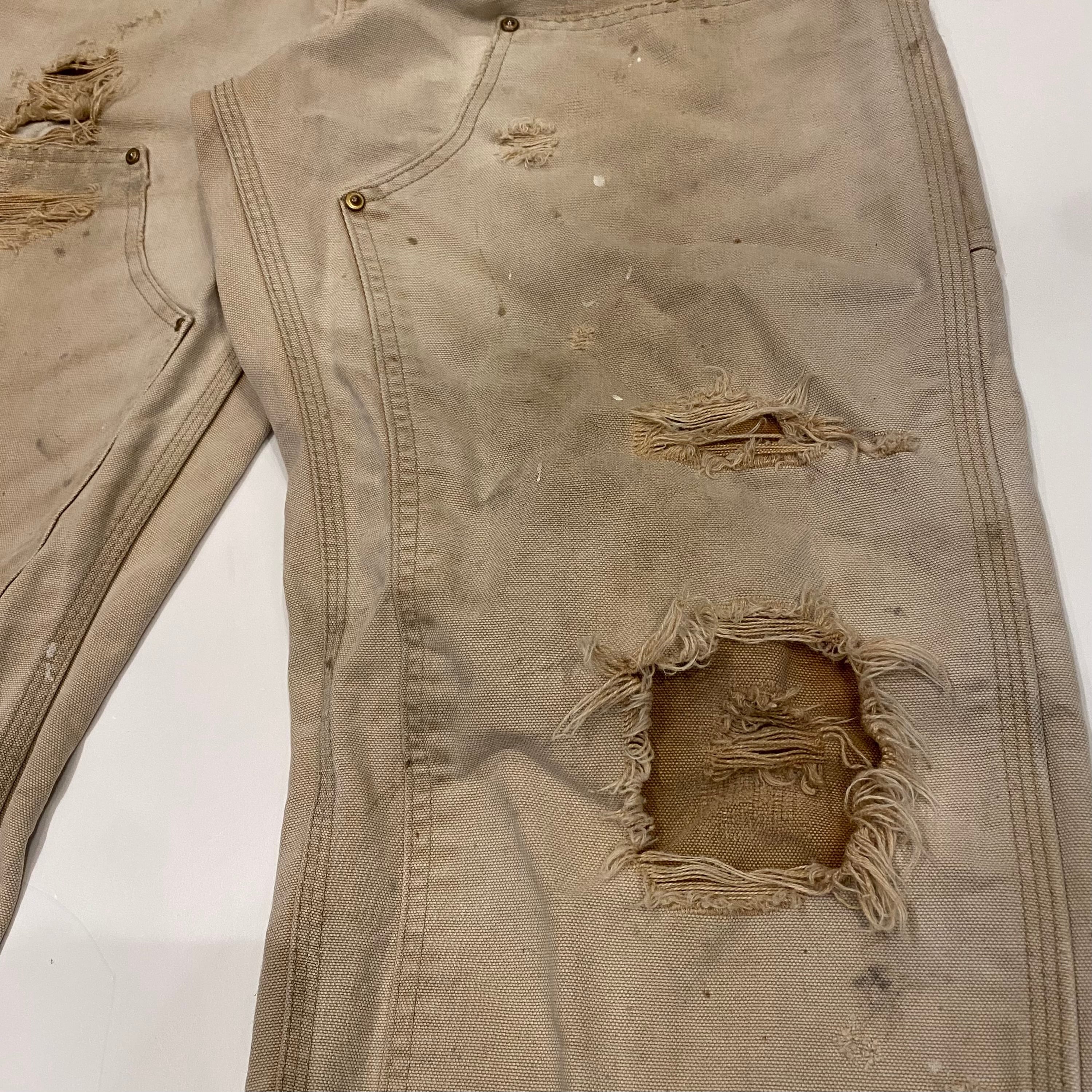 USA製のカーハート、全体的にダメージのあるカラーも白っぽくフェードしたダブルニーのワークパンツになります。洗濯済みです。しっかりとしたダック地でここまで穿きこまれた雰囲気は古着ならではでしょう。ダブルニー部分の穴から下の生地が見えてきている破れ方とか最高です。明るめのトーンのコーディネートにもぴったりだと思います。