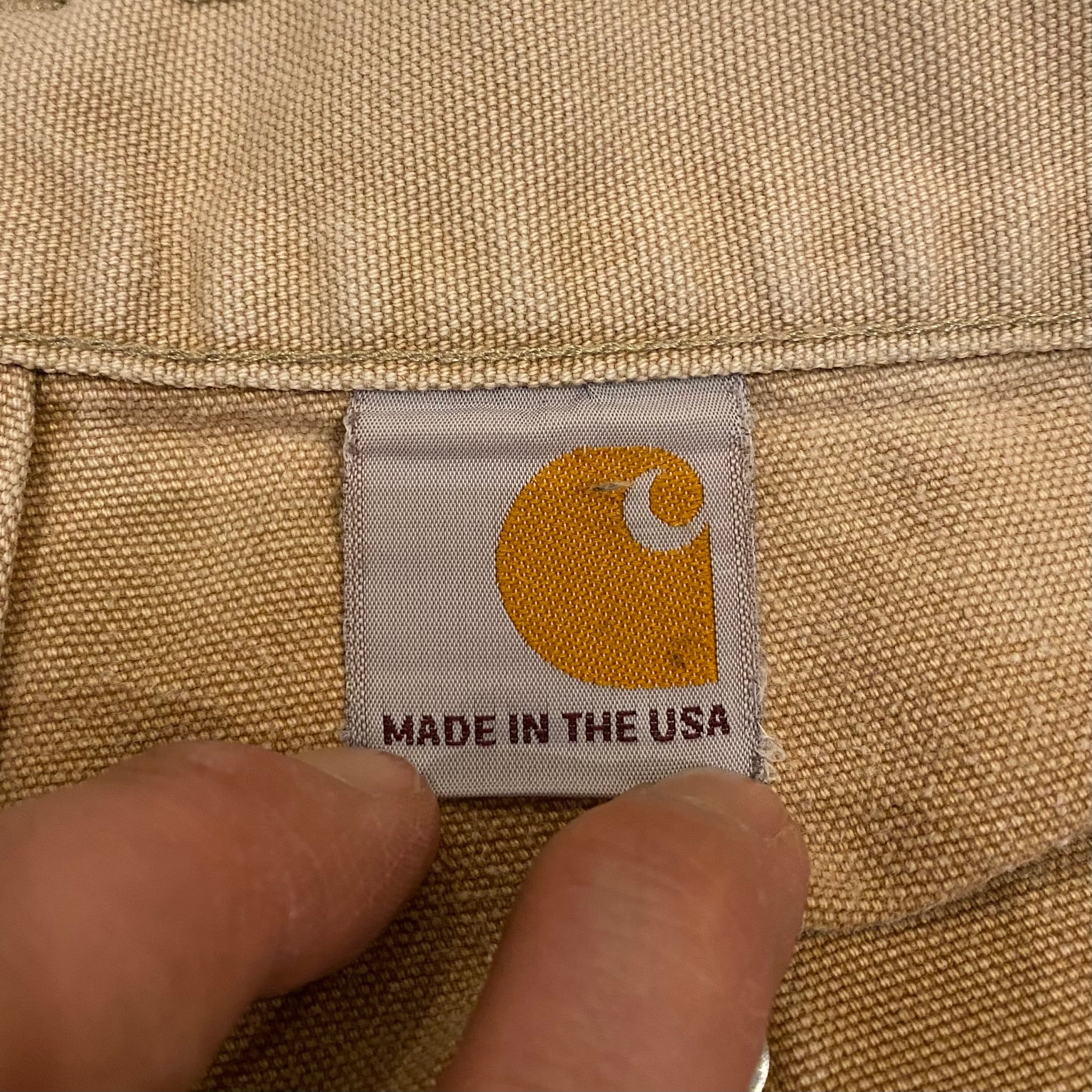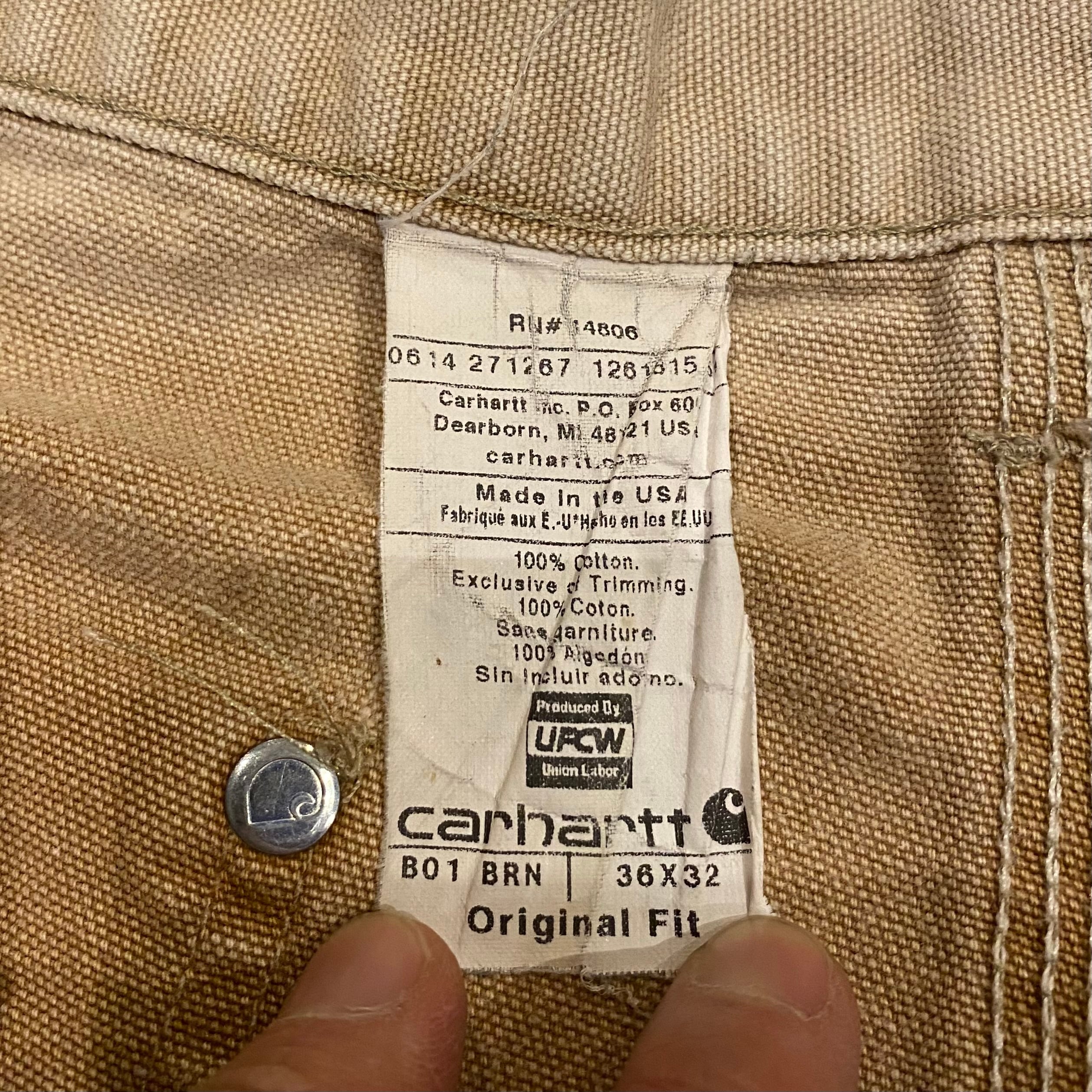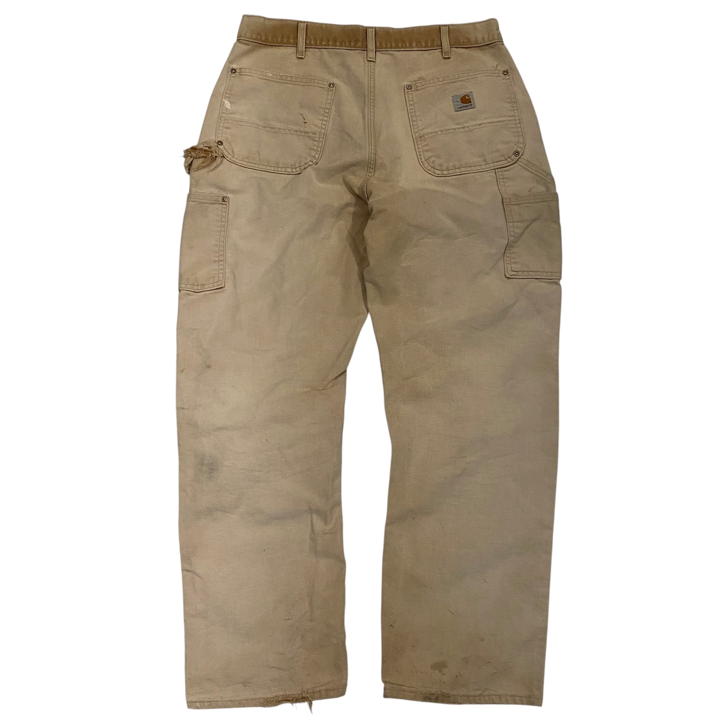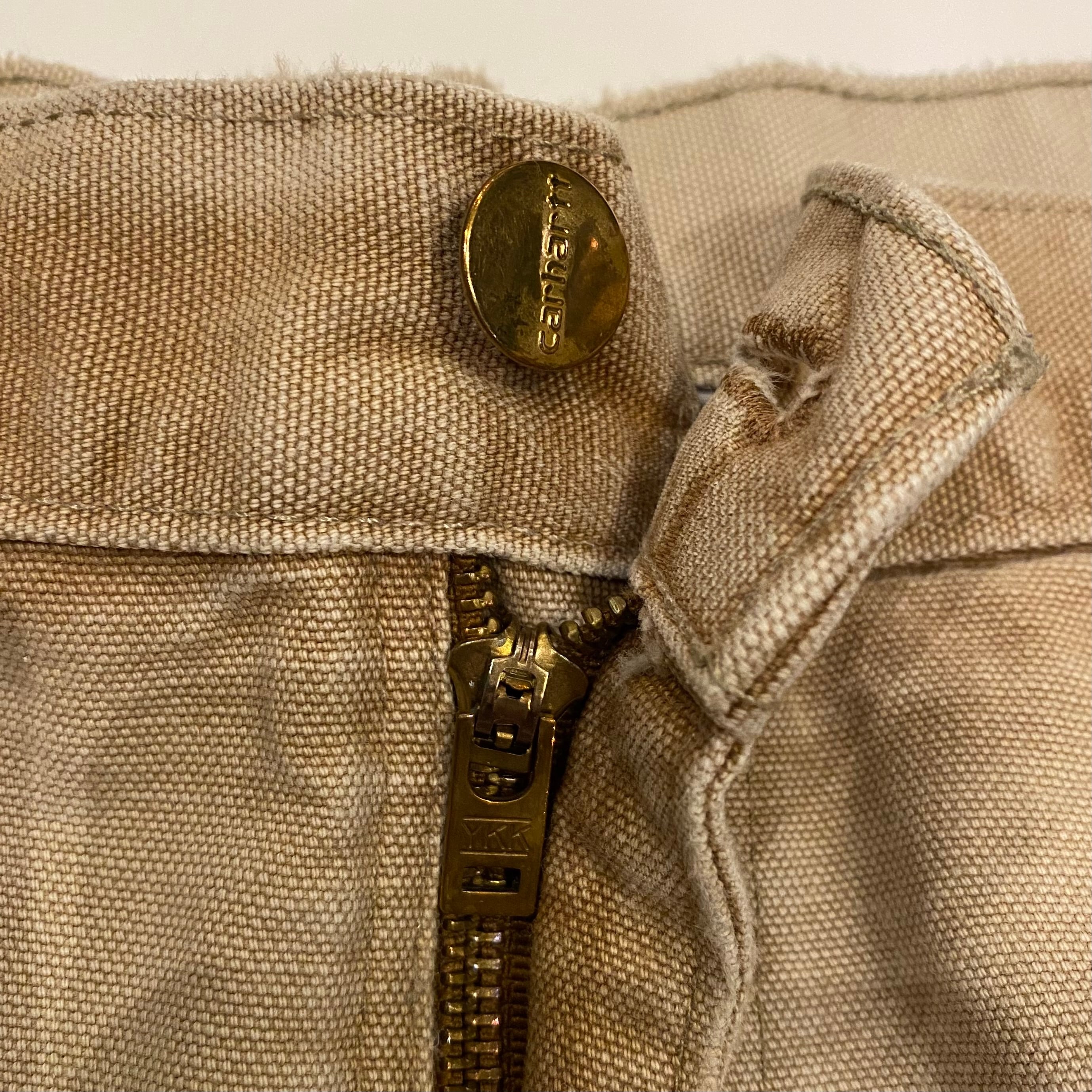 USA製のカーハート、全体的にダメージのあるカラーも白っぽくフェードしたダブルニーのワークパンツになります。洗濯済みです。しっかりとしたダック地でここまで穿きこまれた雰囲気は古着ならではでしょう。ダブルニー部分の穴から下の生地が見えてきている破れ方とか最高です。明るめのトーンのコーディネートにもぴったりだと思います。