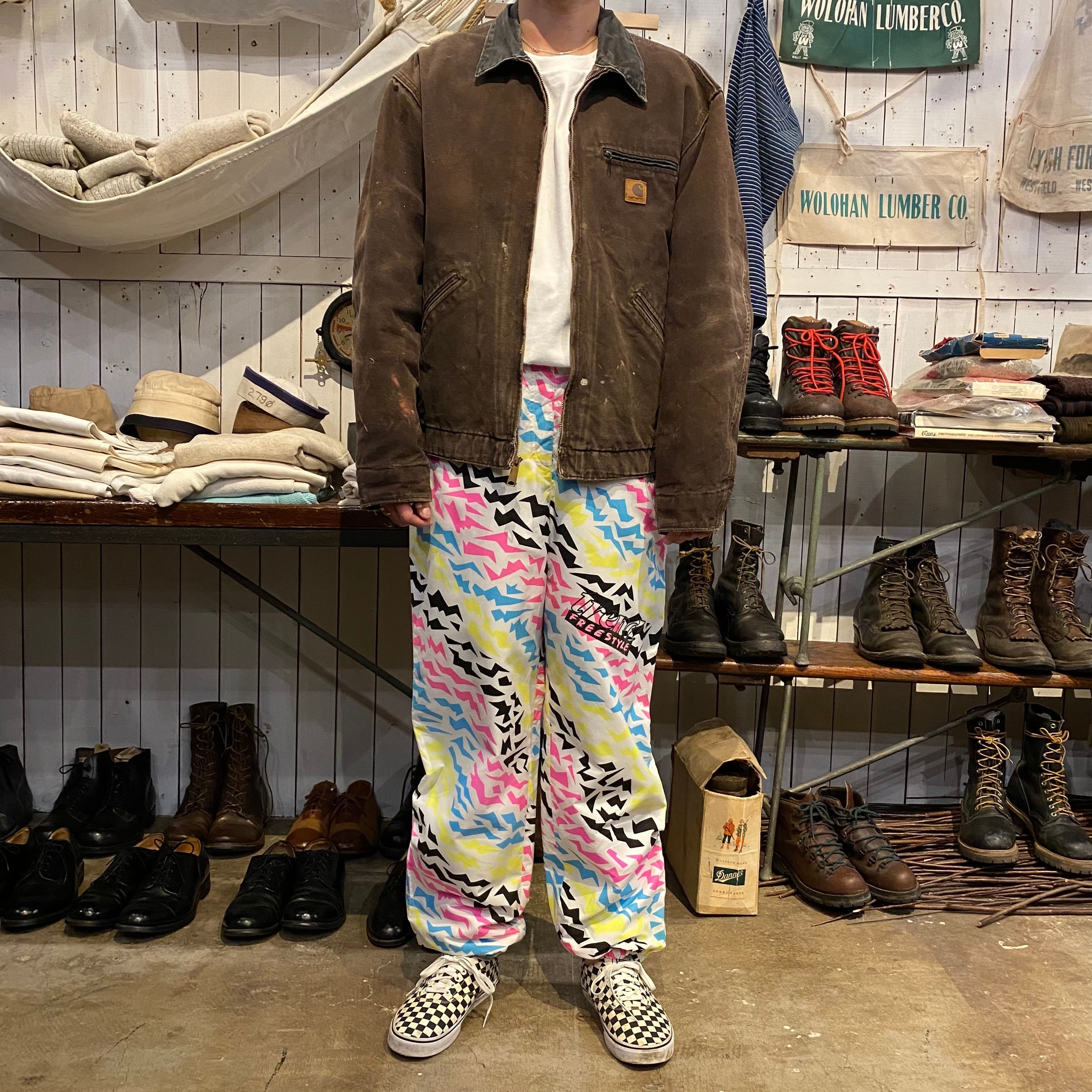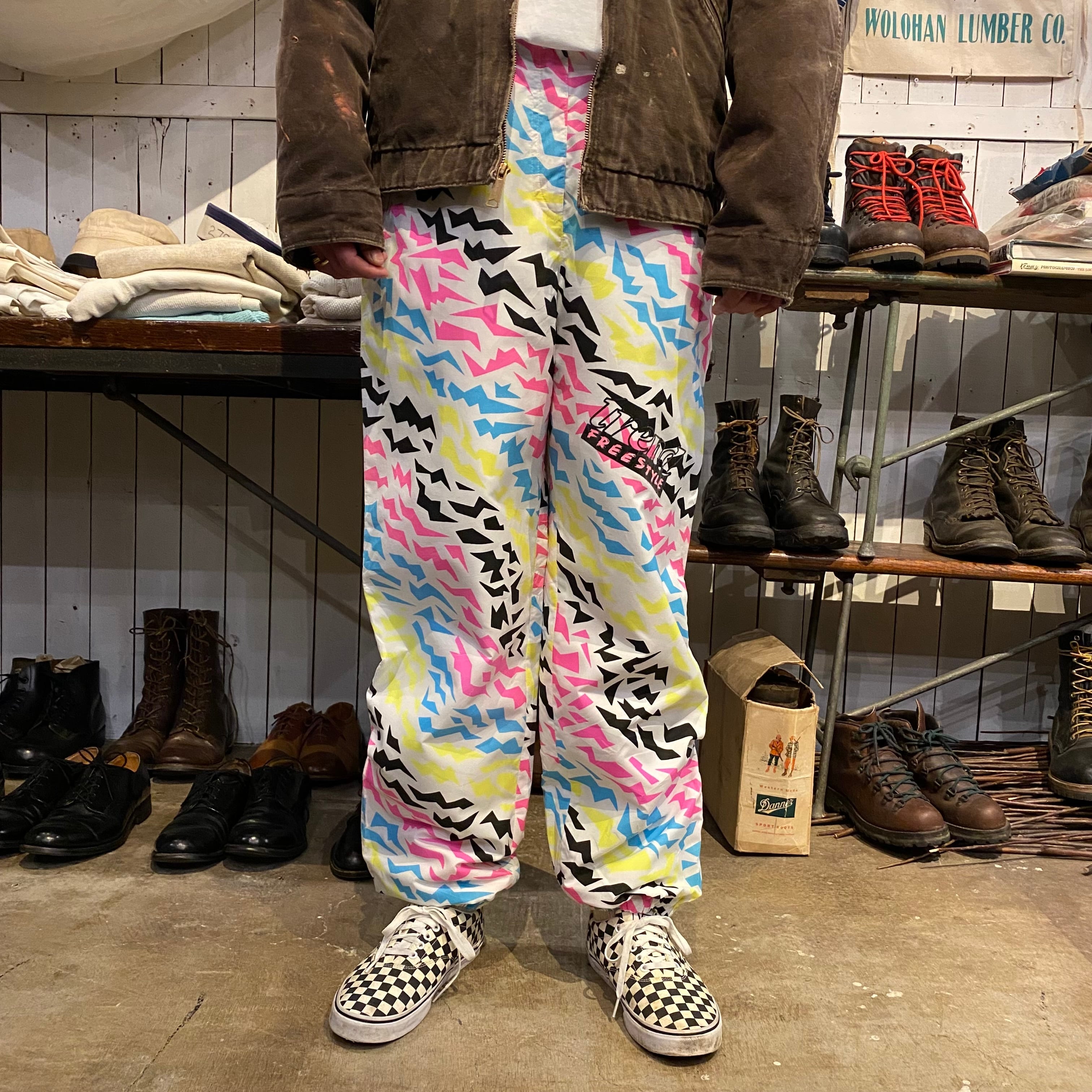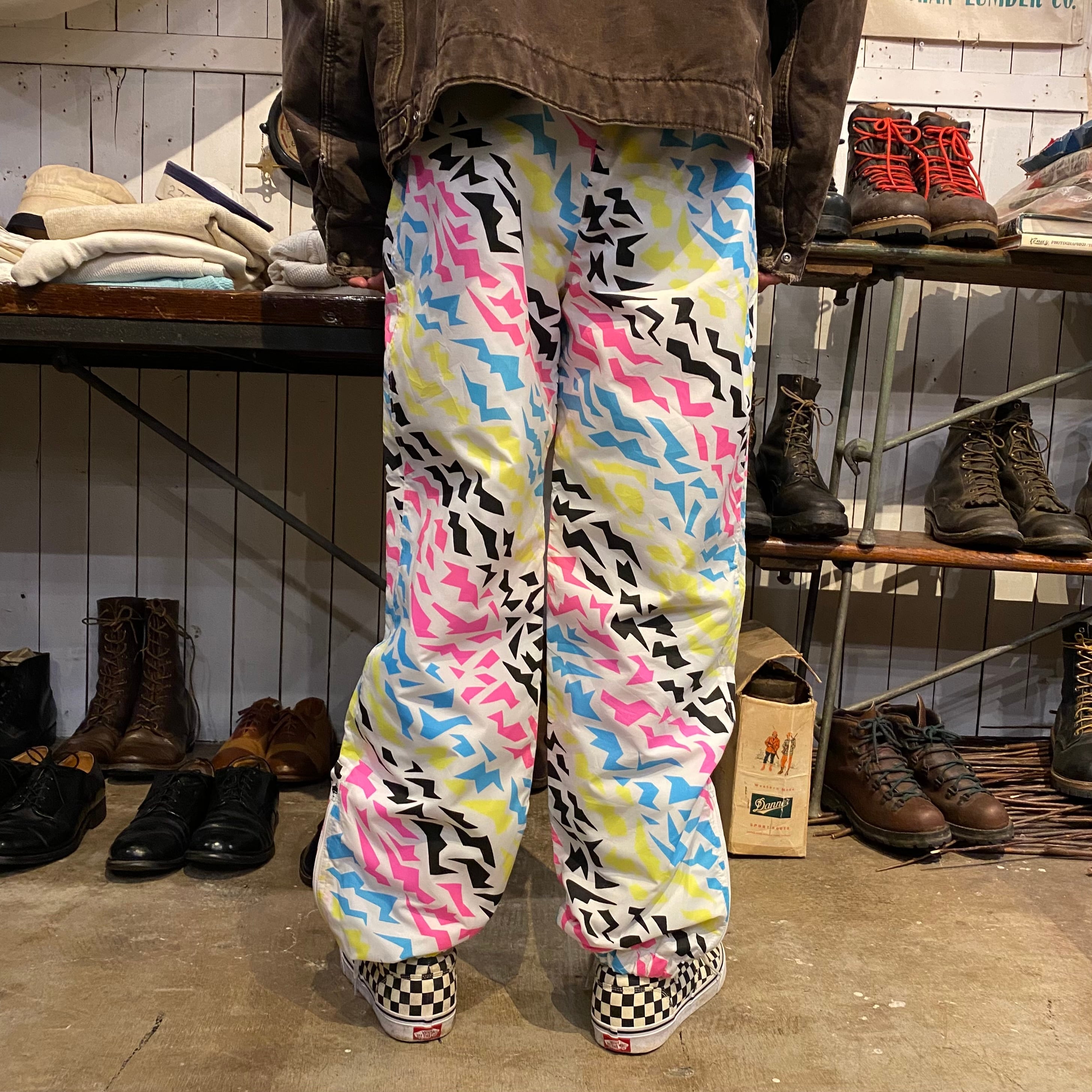 ザ・80'sな総柄、ヨーロッパのジョギングパンツになります。ウエストはゴムで伸びる仕様で、さらにベルトループも付くので幅広い方に着用していただけると思います。裾にはジッパーが付き、裾幅を広げての着用も可能です。洒落た総柄でコーディネートのポイントになりますし良い古着だと思います。