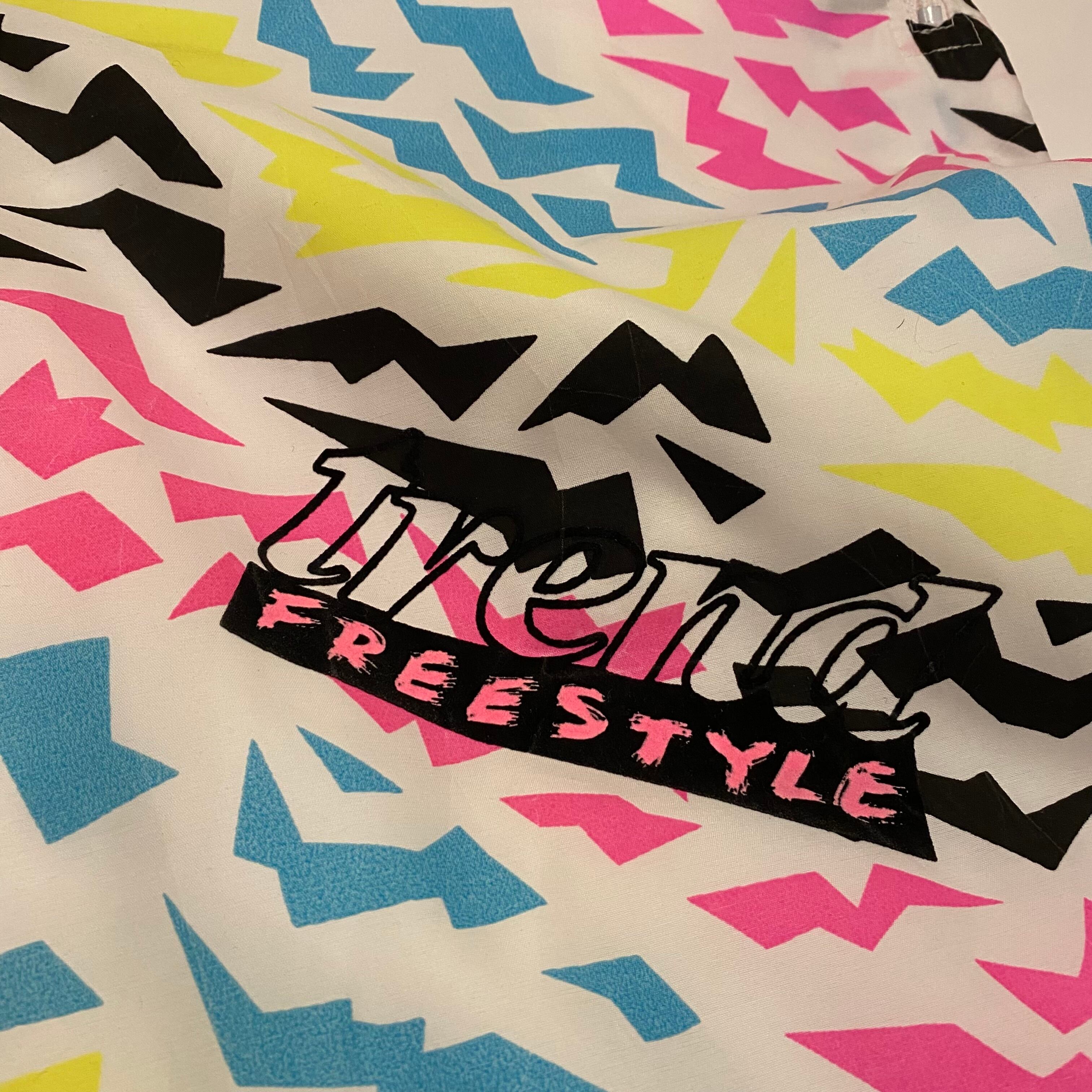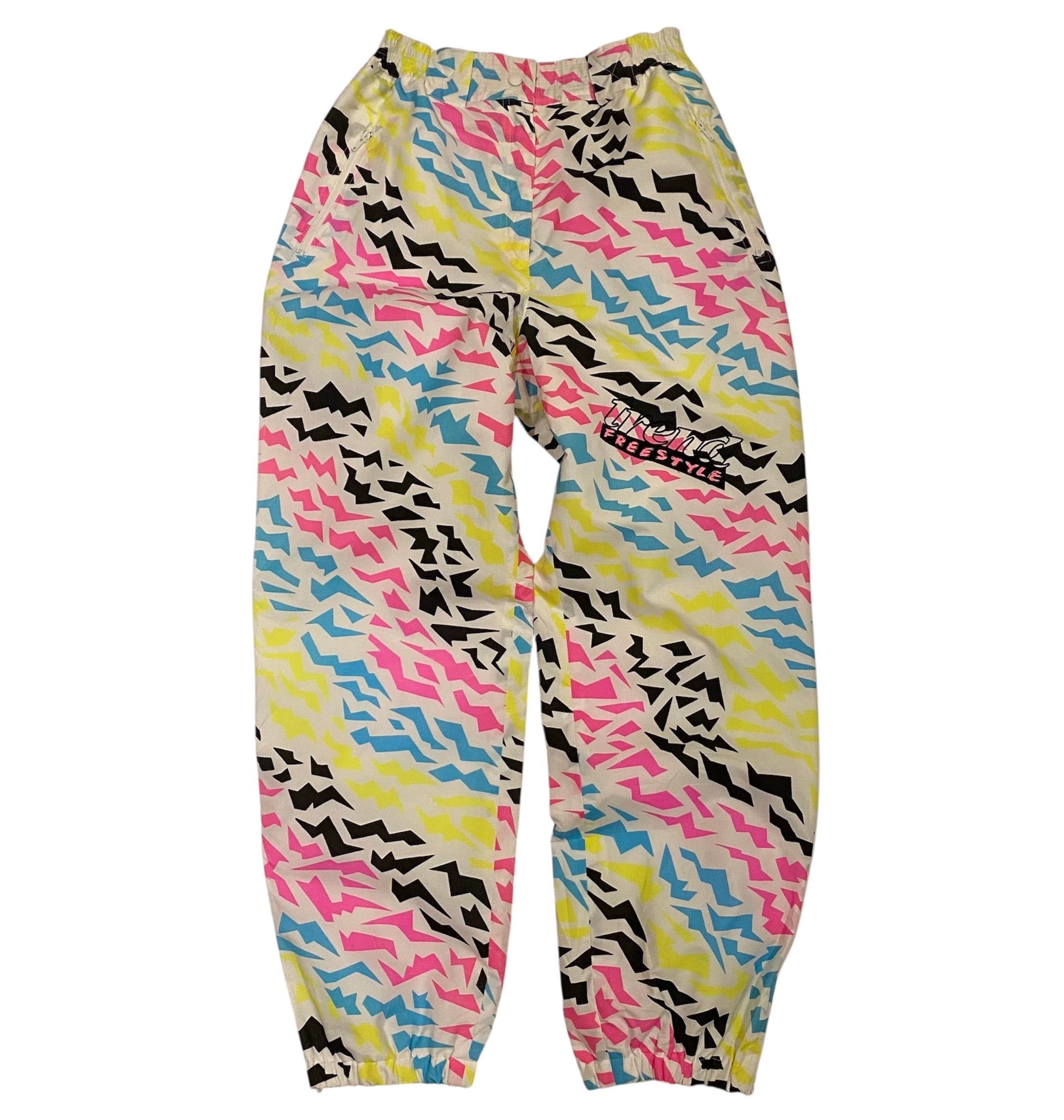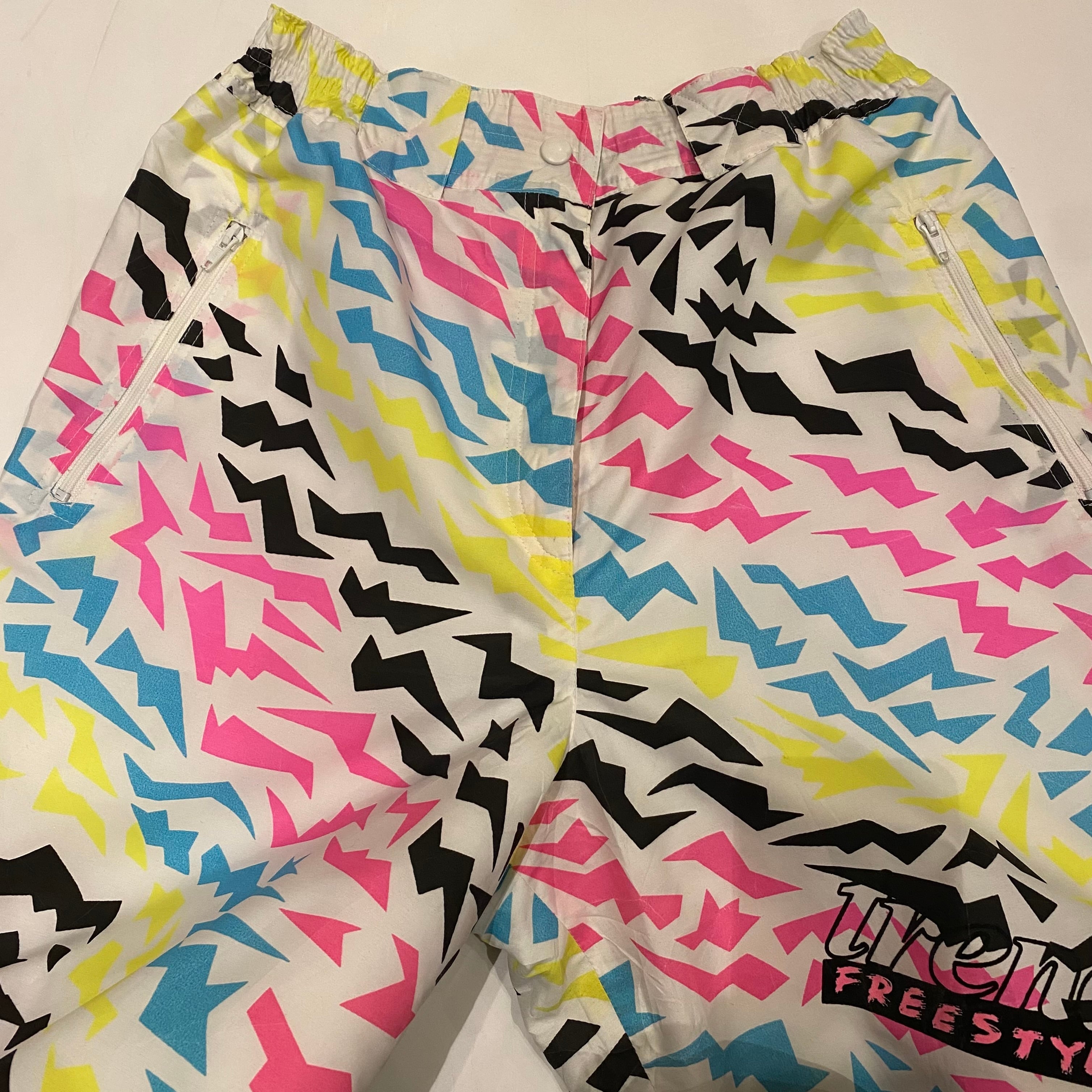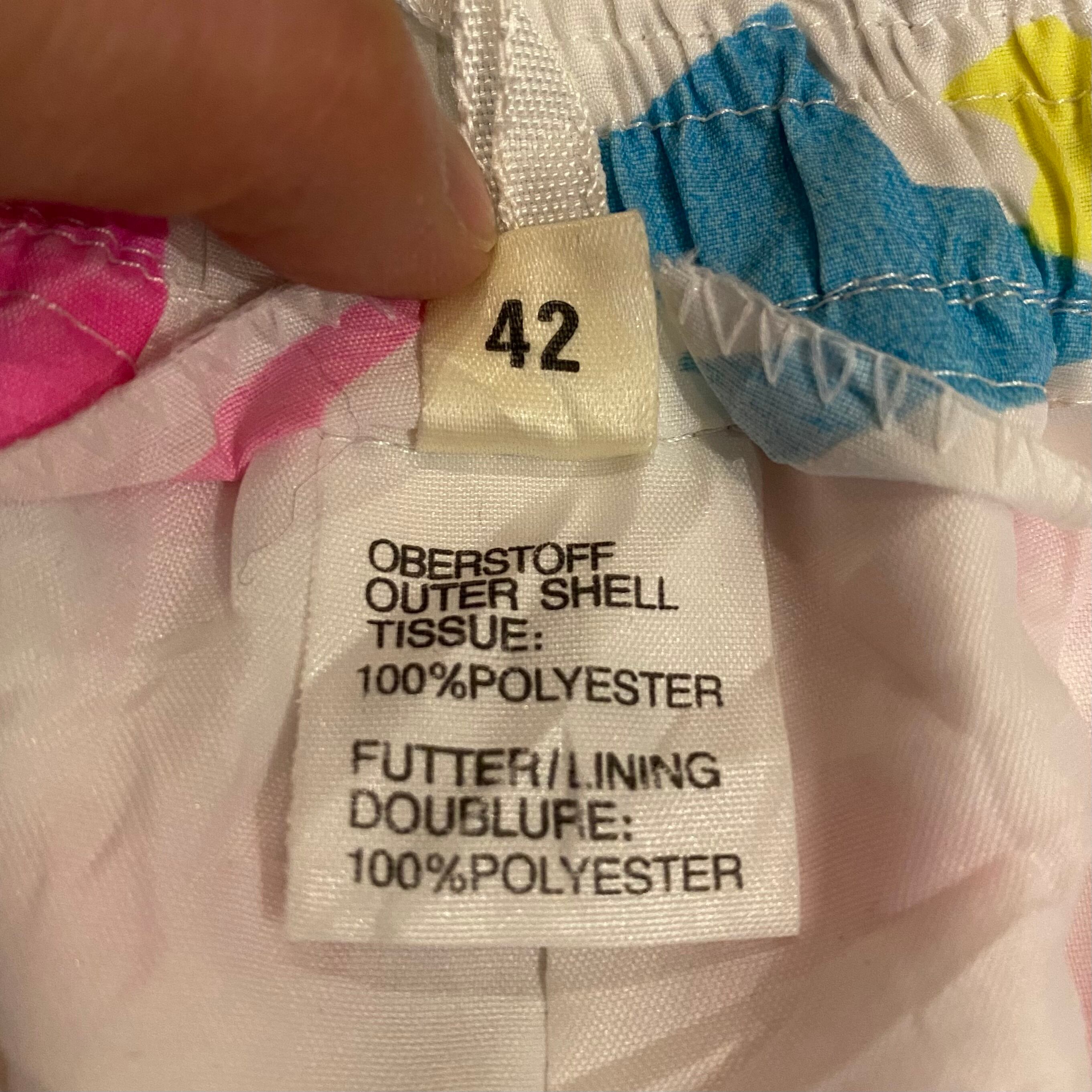 ザ・80'sな総柄、ヨーロッパのジョギングパンツになります。ウエストはゴムで伸びる仕様で、さらにベルトループも付くので幅広い方に着用していただけると思います。裾にはジッパーが付き、裾幅を広げての着用も可能です。洒落た総柄でコーディネートのポイントになりますし良い古着だと思います。