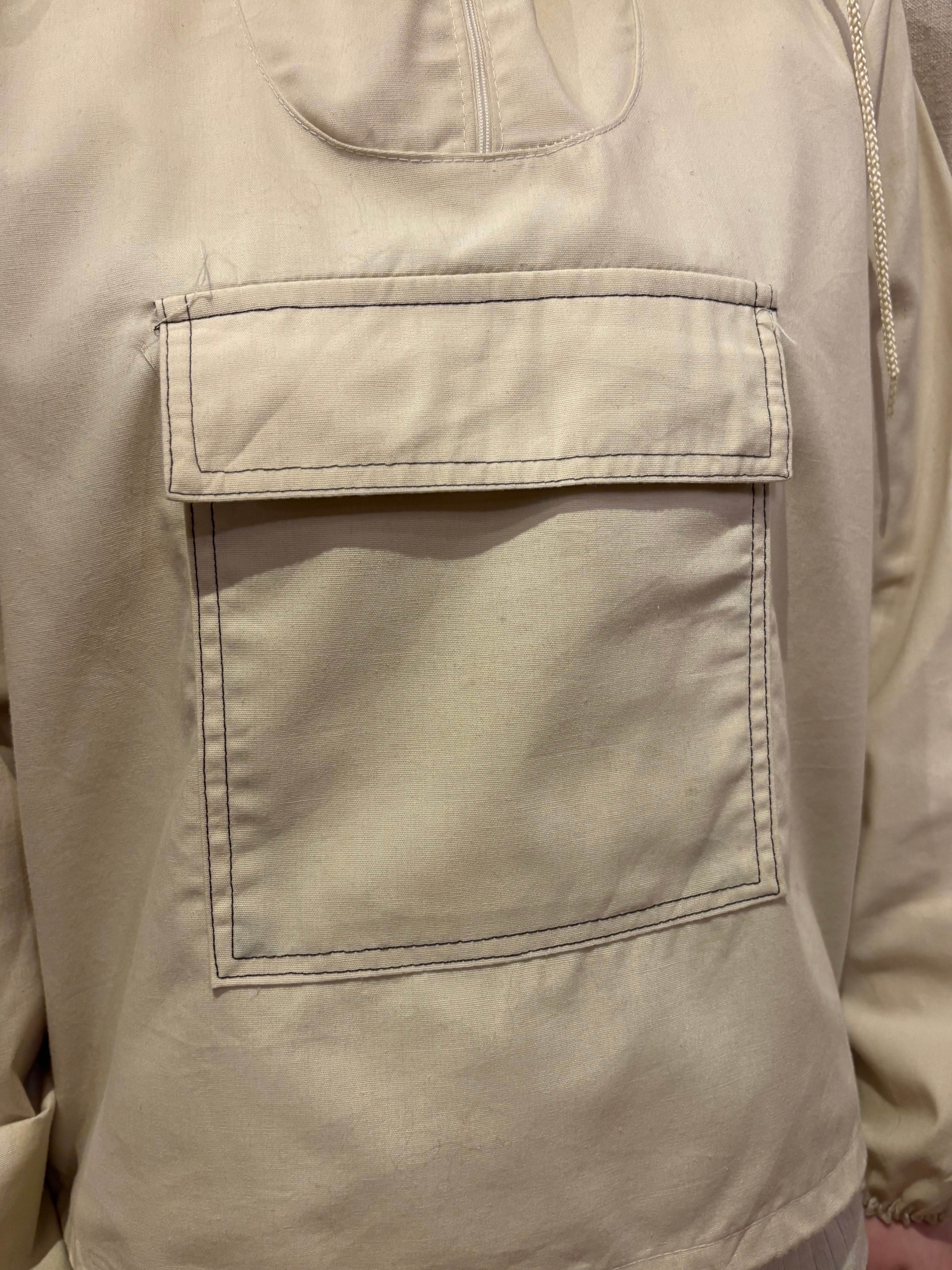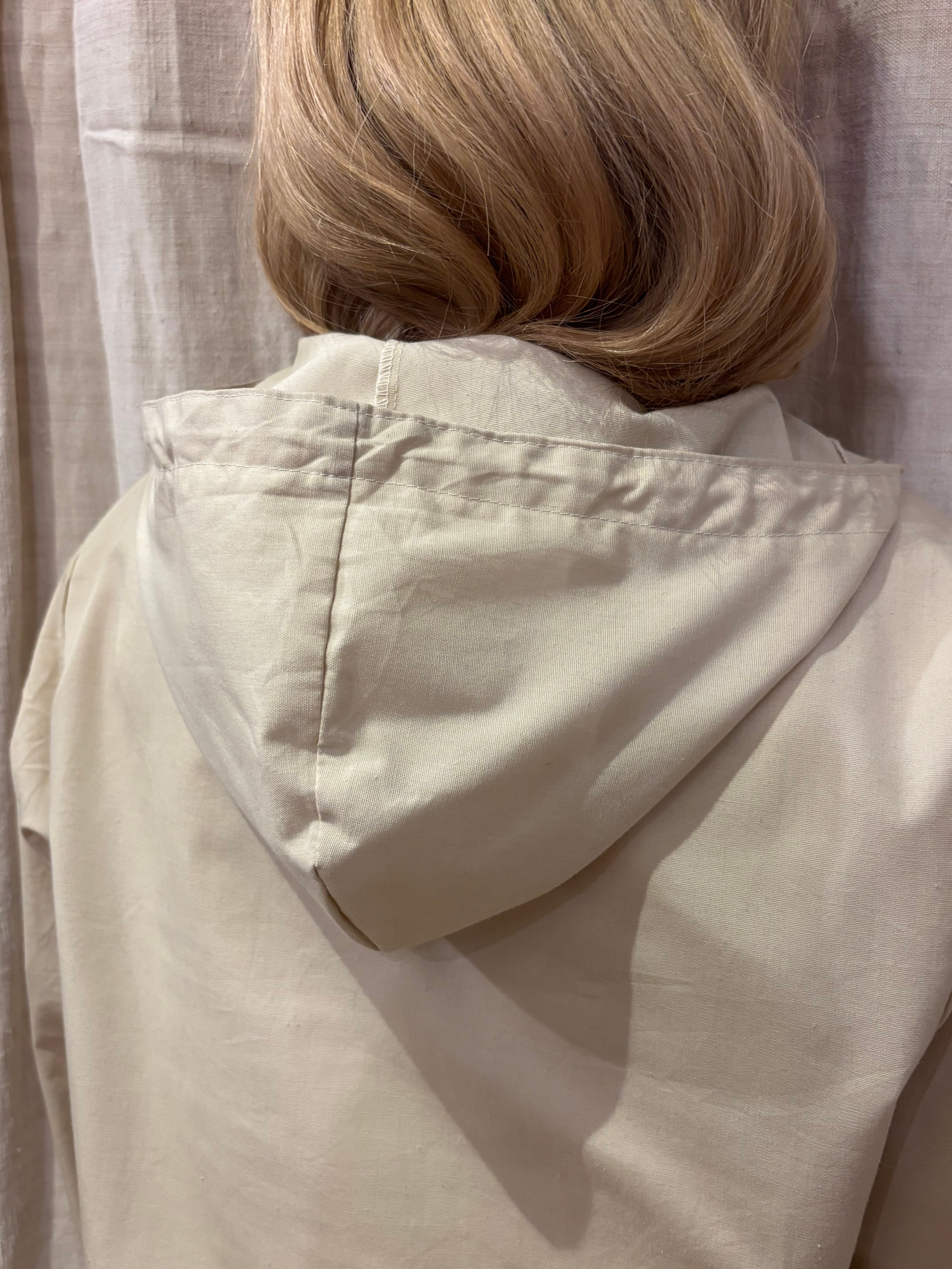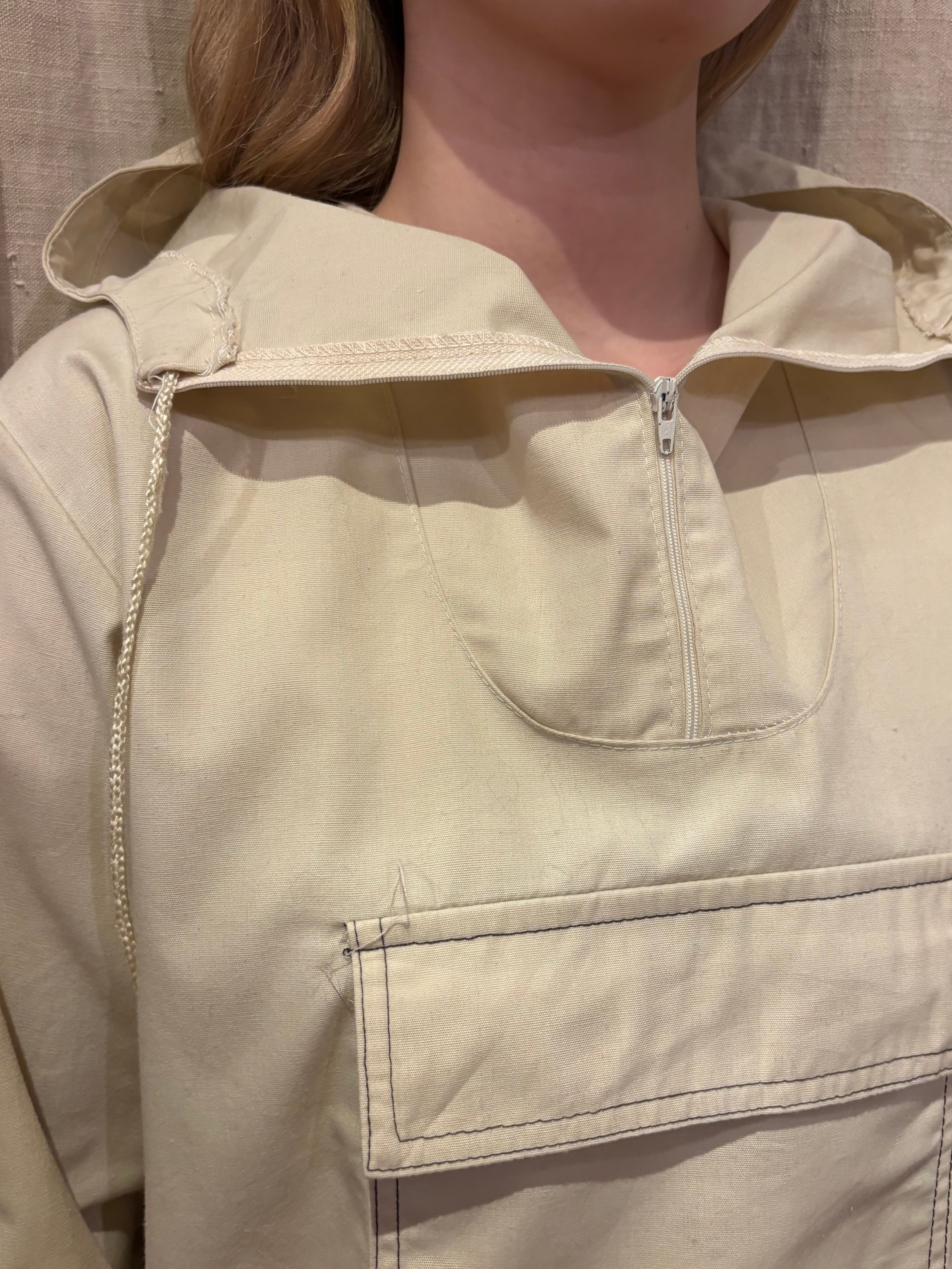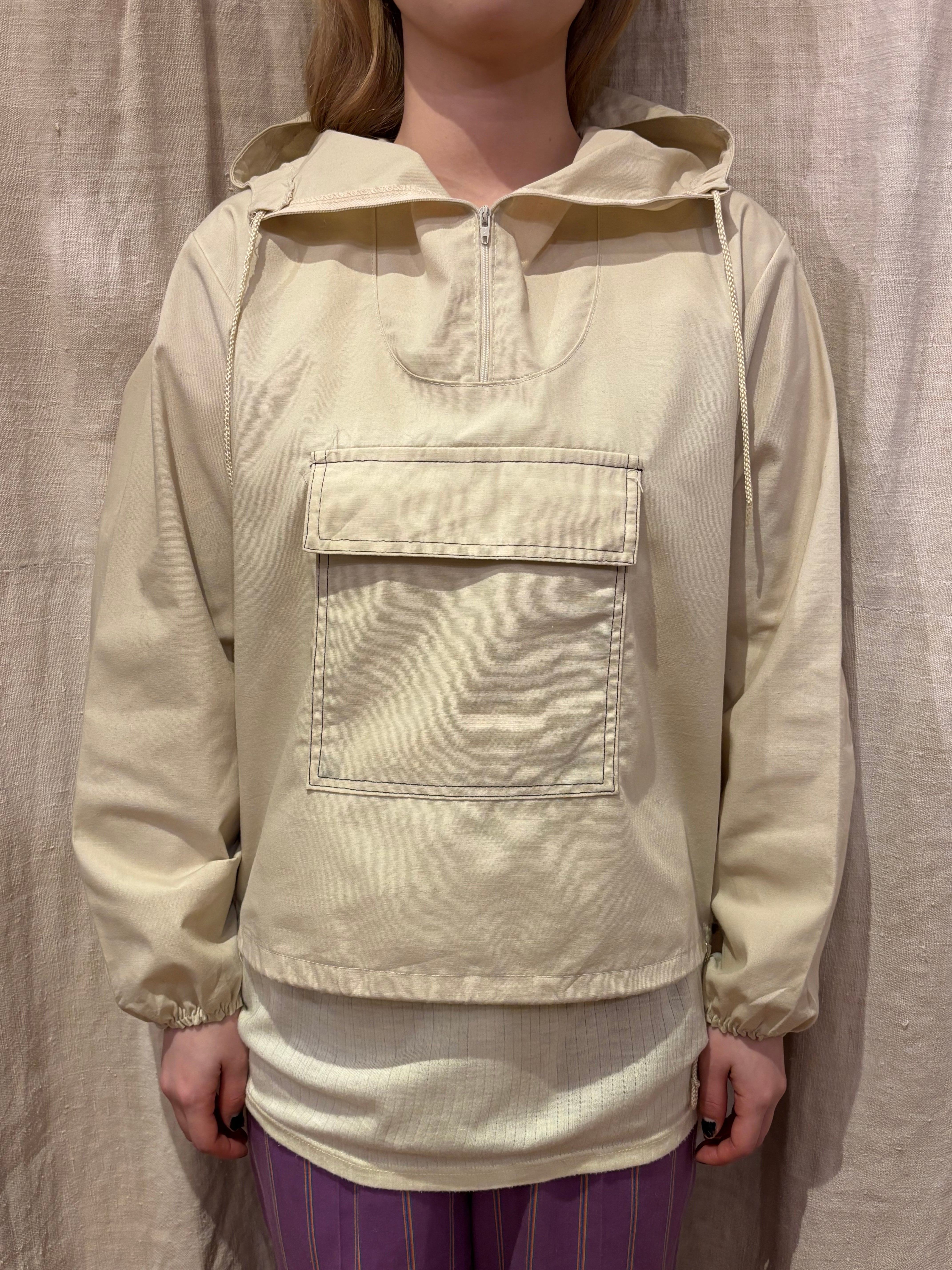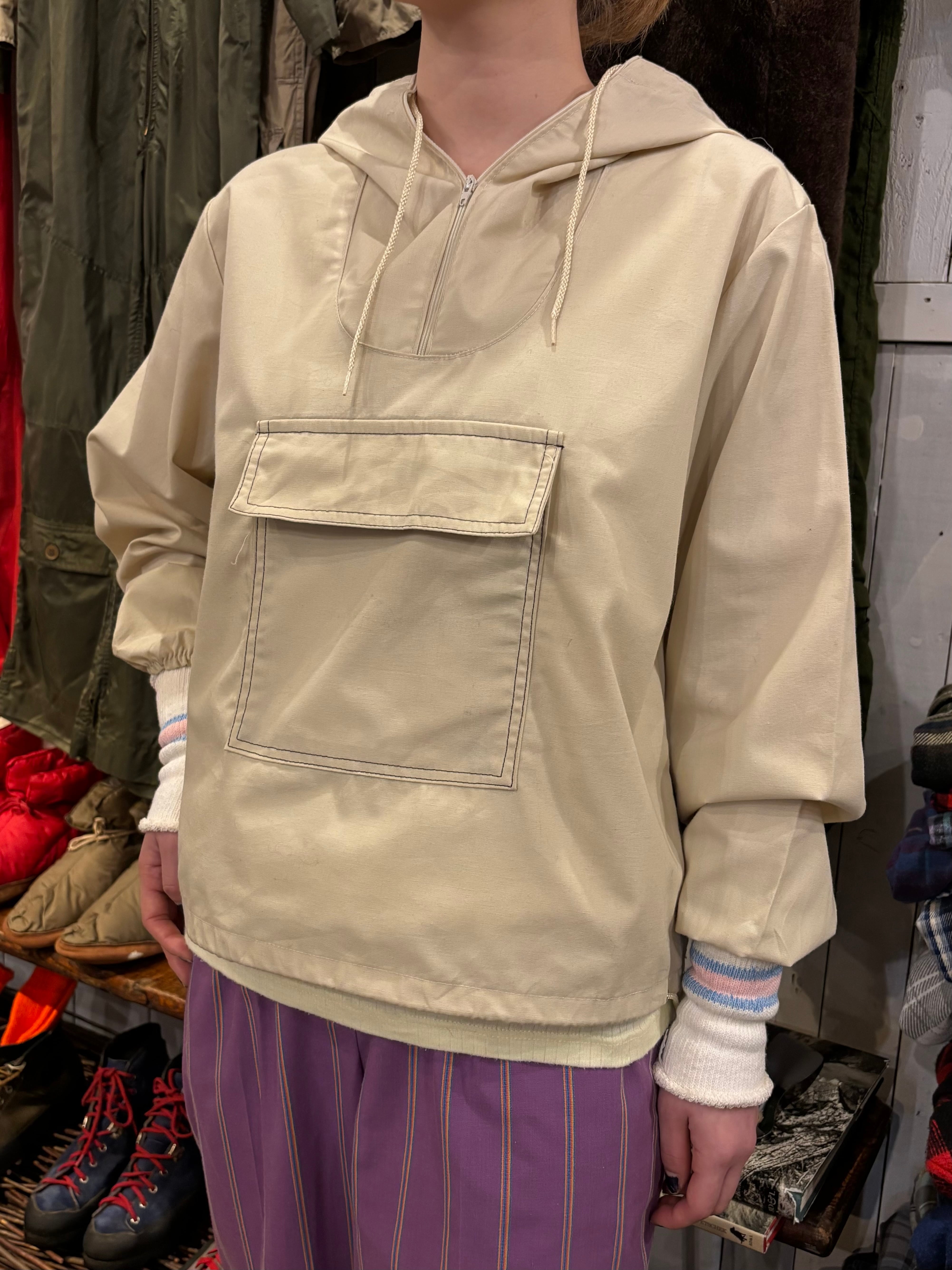 コットンポリのアノラックです。白では無く生成りなのが好きです。14サイズのやや小さめな作りで、これからの季節は一枚で着ても良さそうです。裾にはドローコードが付いているので、絞って丈感の調節も可能です。やや透け感があるので柄物をインナーに仕込んでも可愛らしいです。
