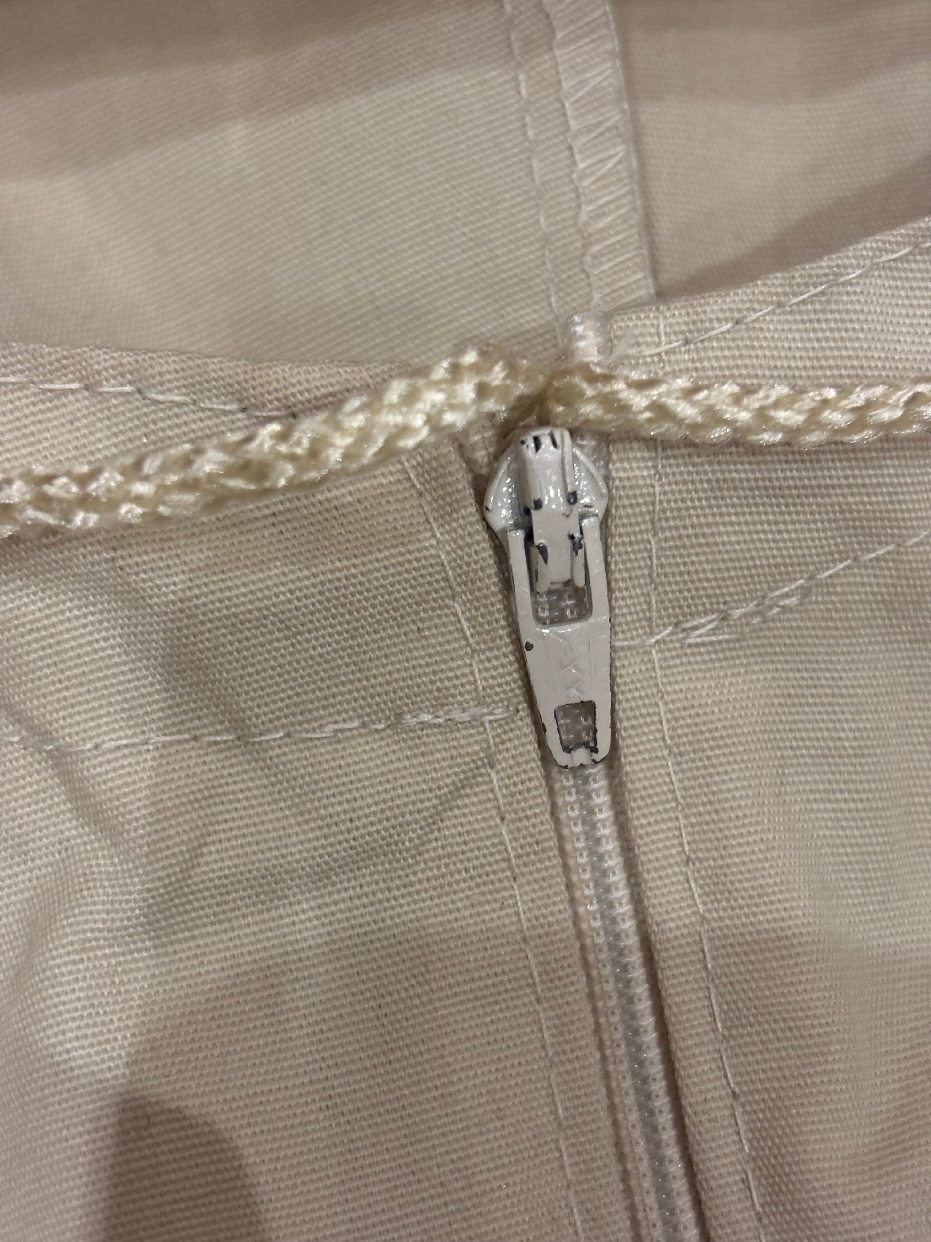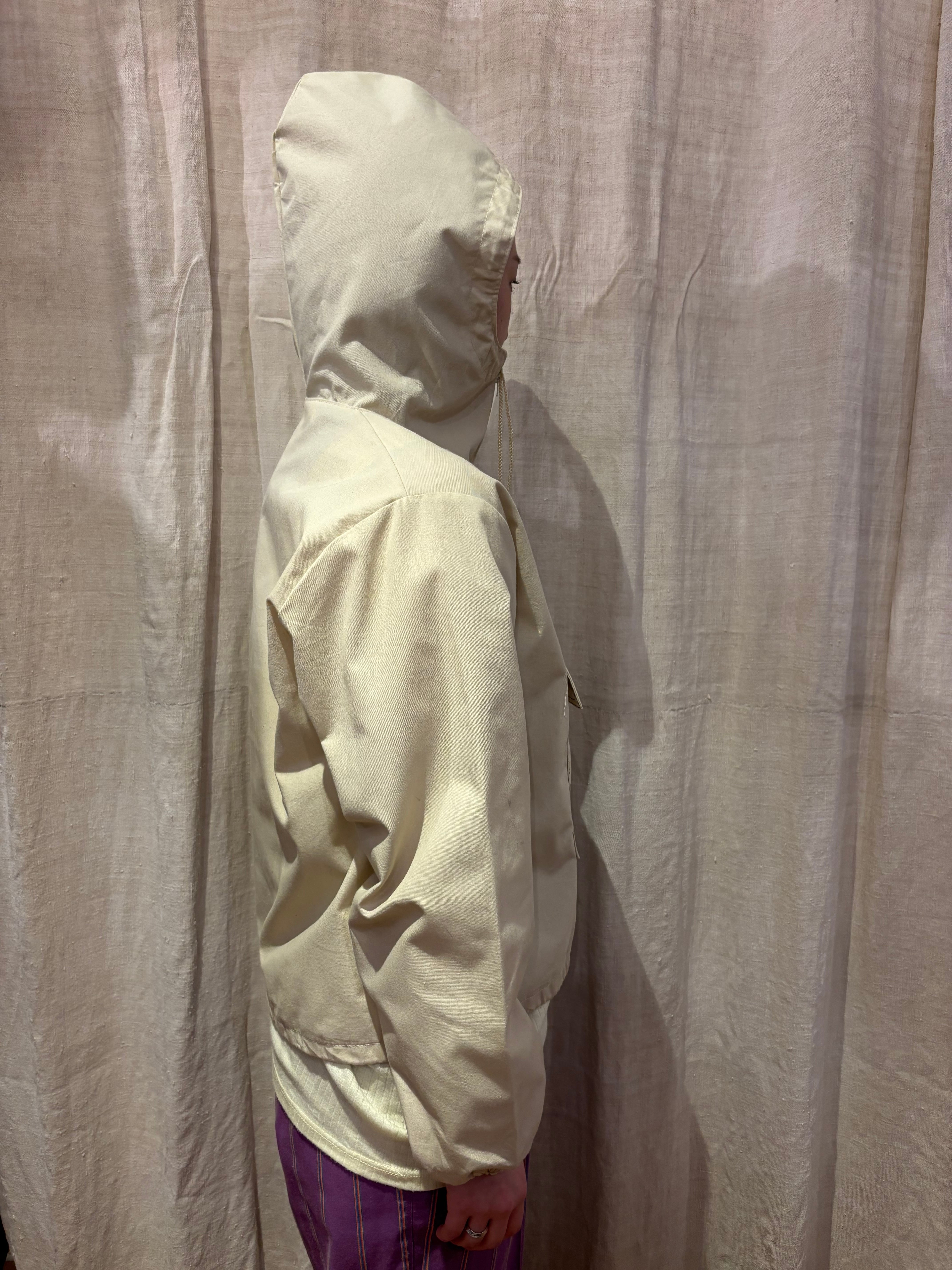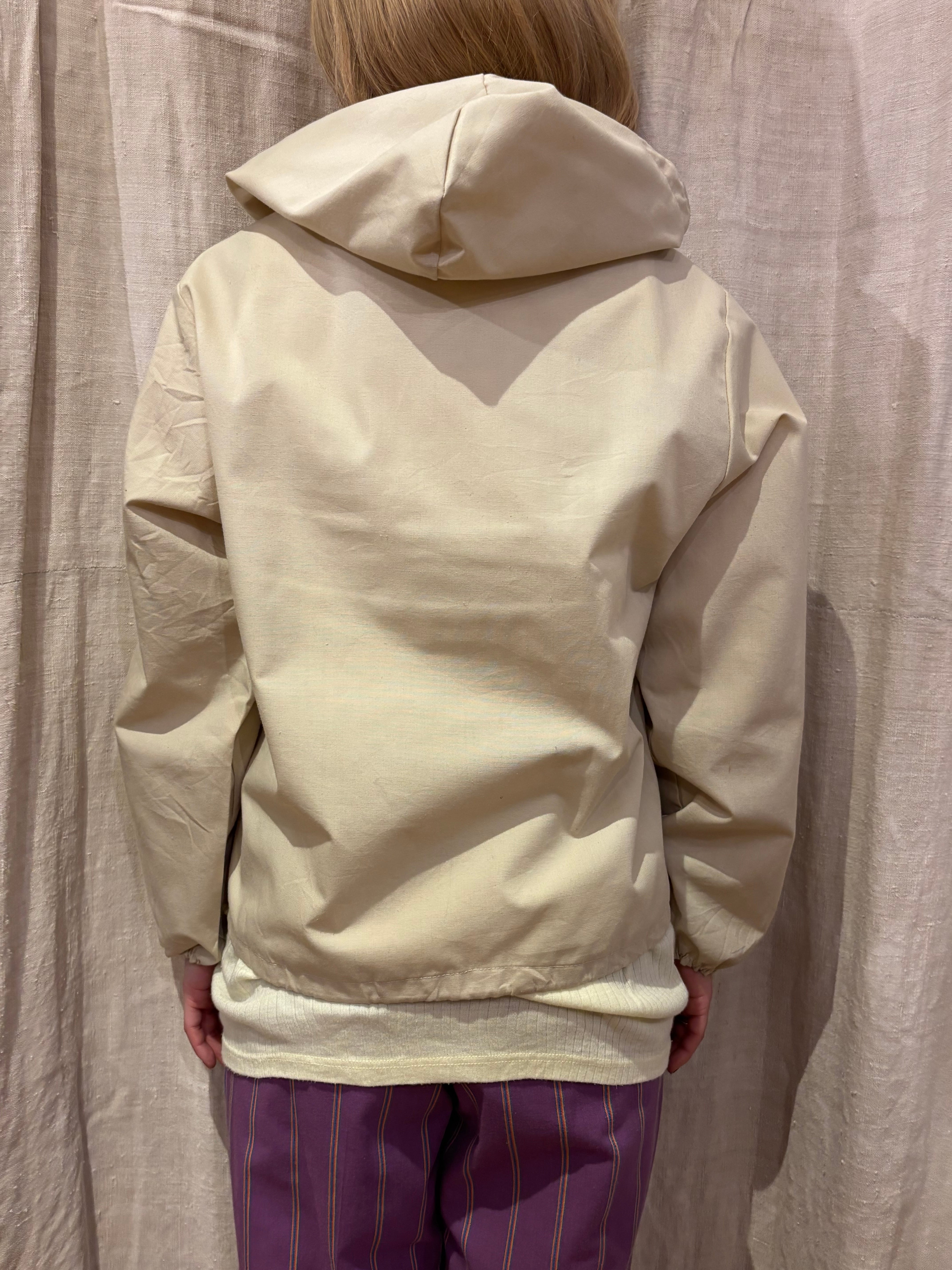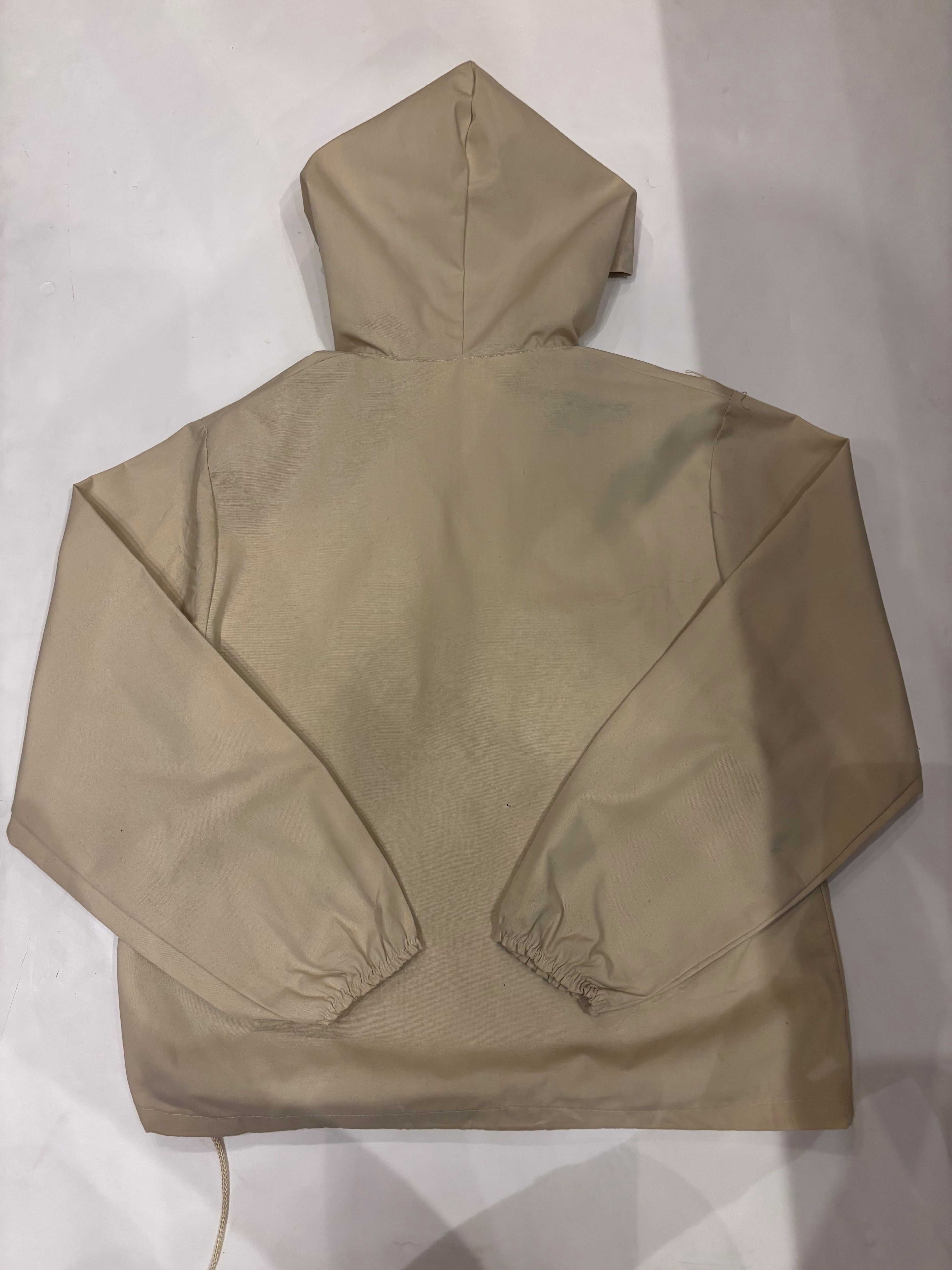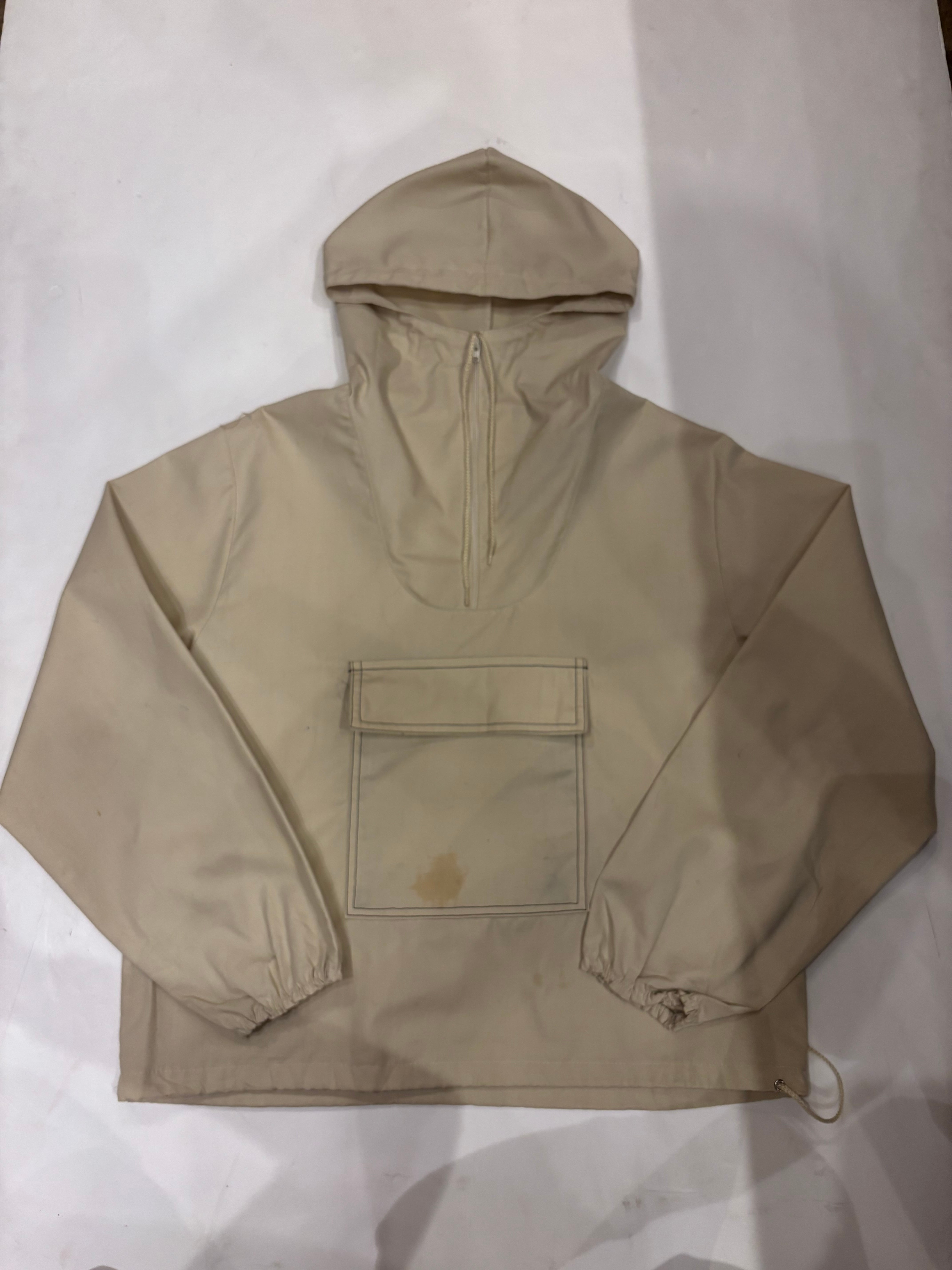 コットンポリのアノラックです。白では無く生成りなのが好きです。14サイズのやや小さめな作りで、これからの季節は一枚で着ても良さそうです。裾にはドローコードが付いているので、絞って丈感の調節も可能です。やや透け感があるので柄物をインナーに仕込んでも可愛らしいです。