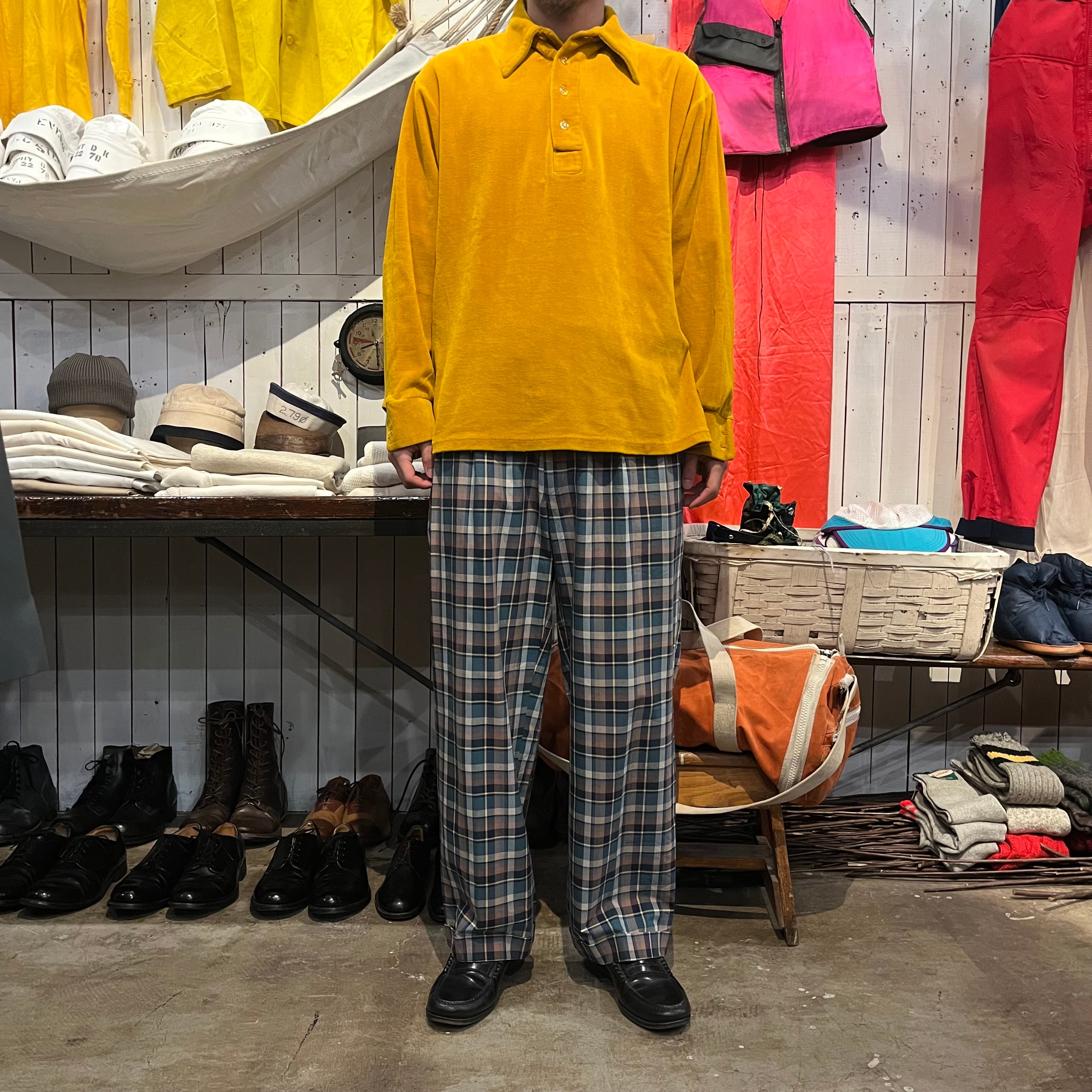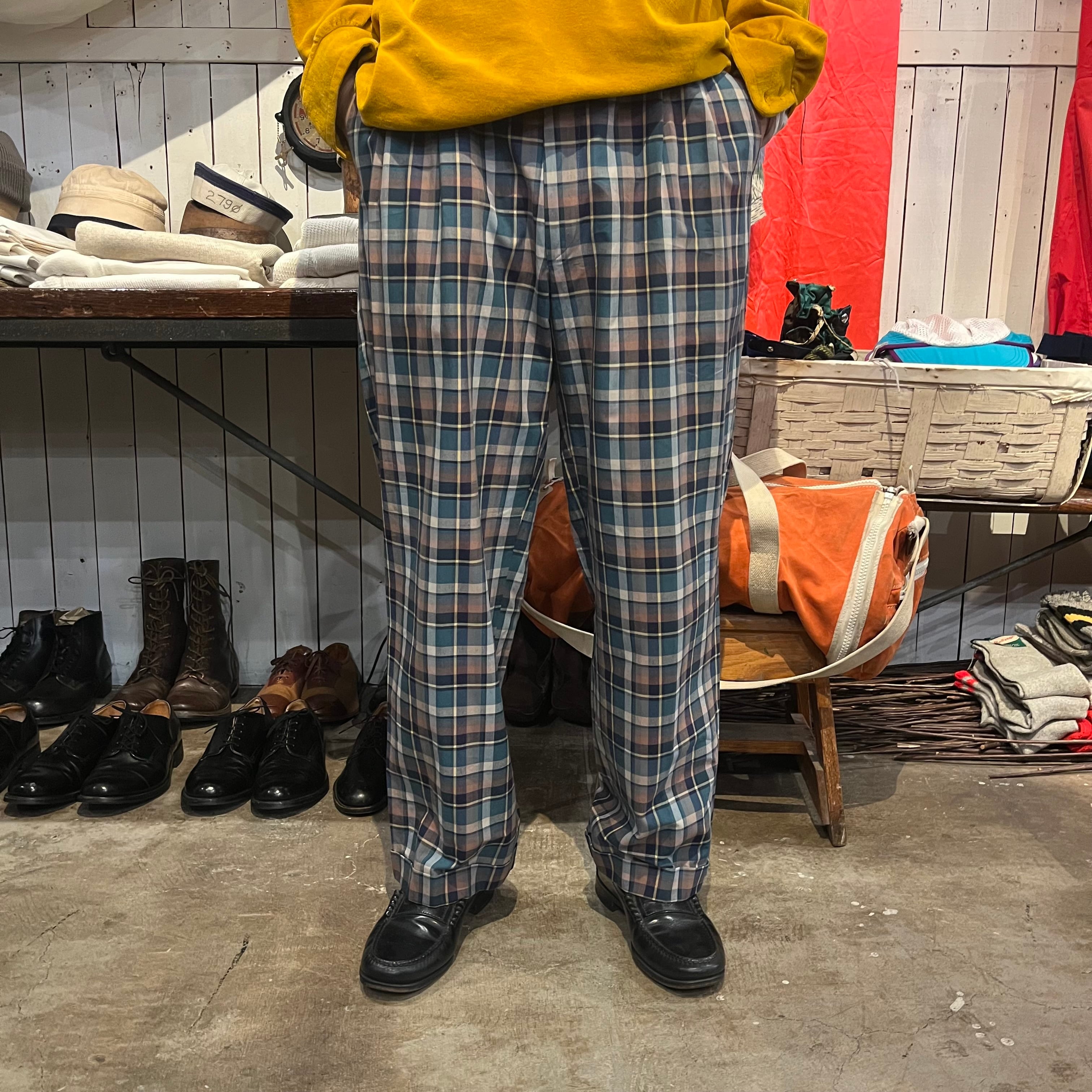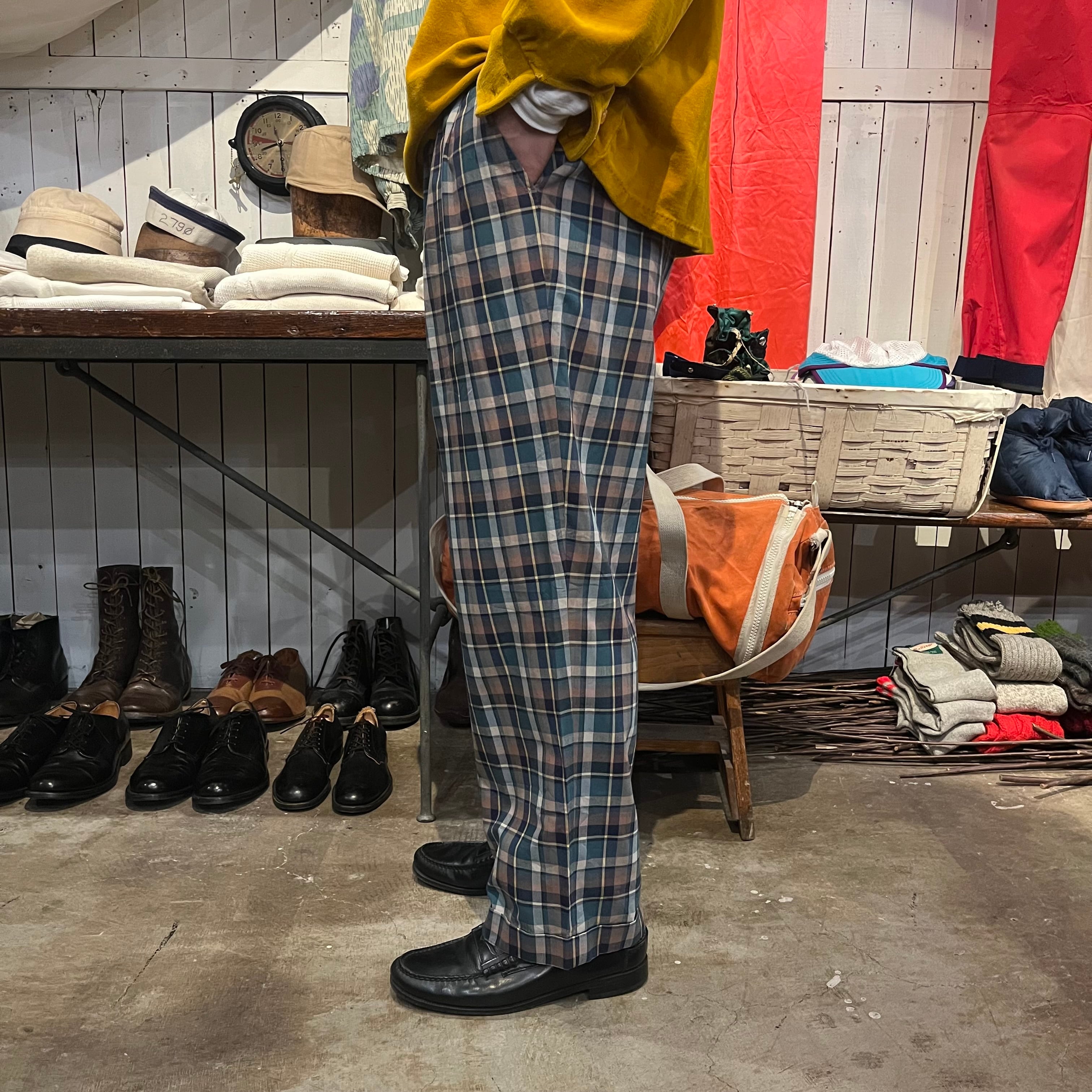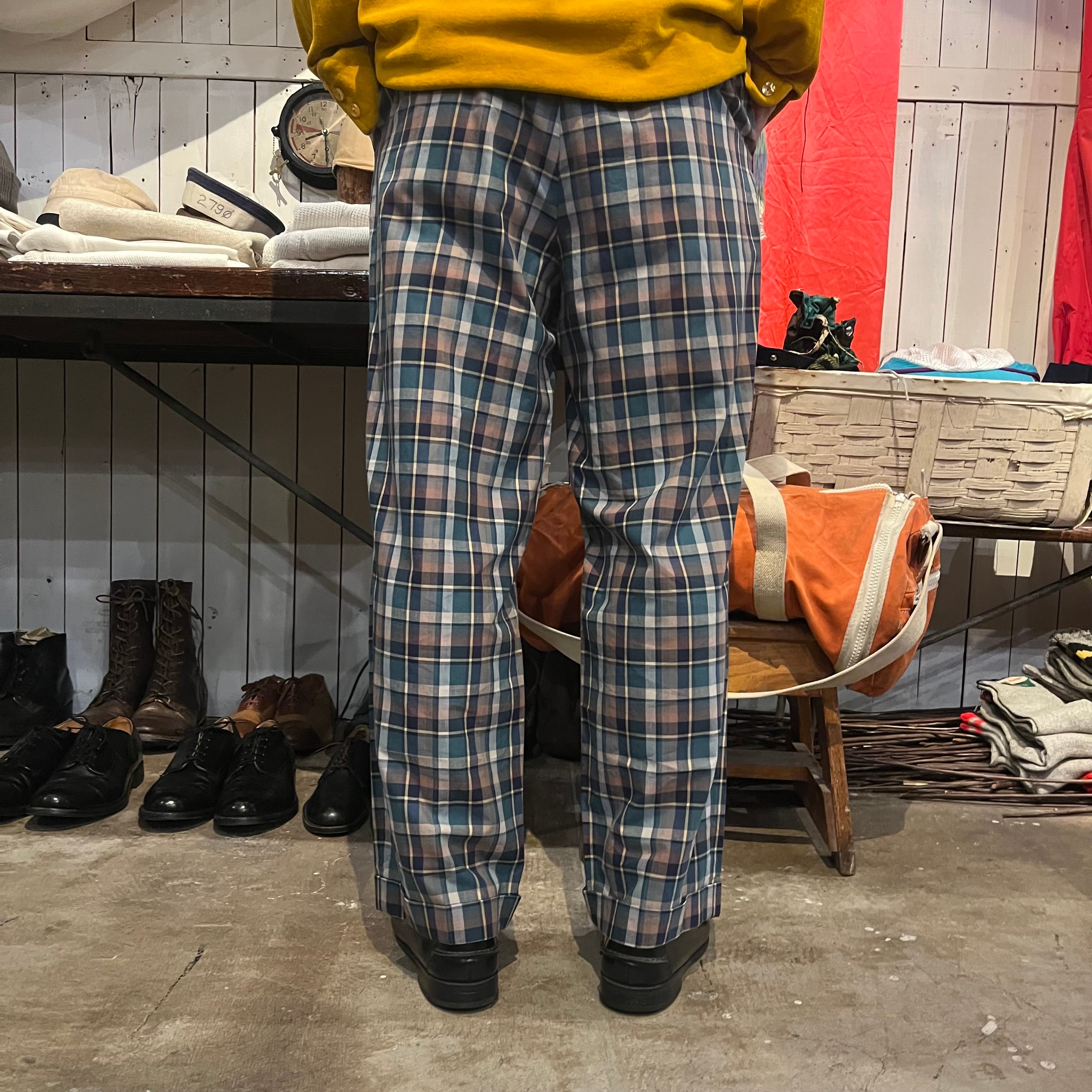 コットン、ポリエステルのスラックスになります。表記はポリエステル30%の表記は見えますが、それ以外は消えていて恐らくコットンが70%だと思います。optiジッパーなのでユーロの企画のものかと思います。裾はダブル仕様。タックが2箇所入っていて外向き、内向き同じところににタックが入っています。内側向きにもう一つタックが入っていてワイドなシルエットが特徴です。