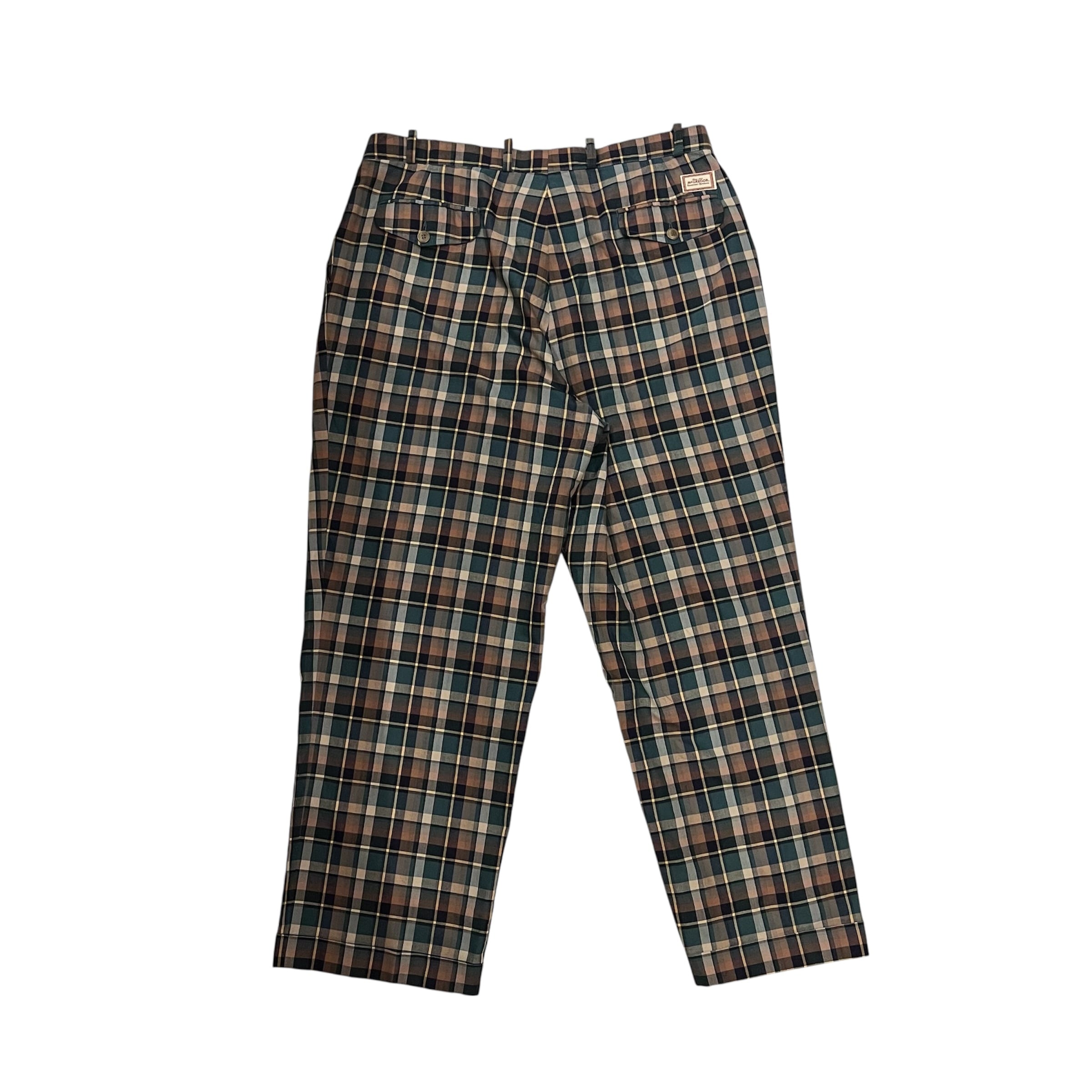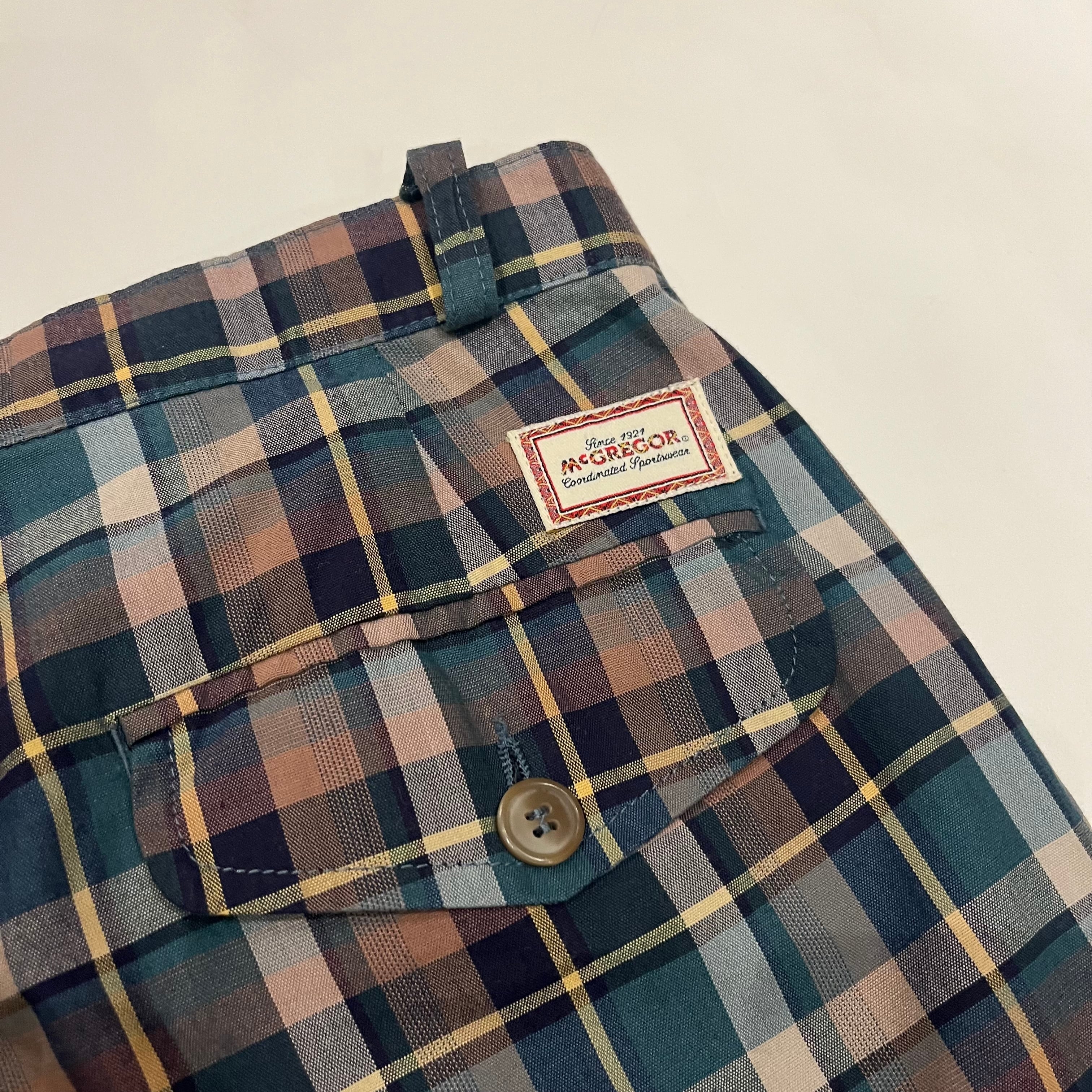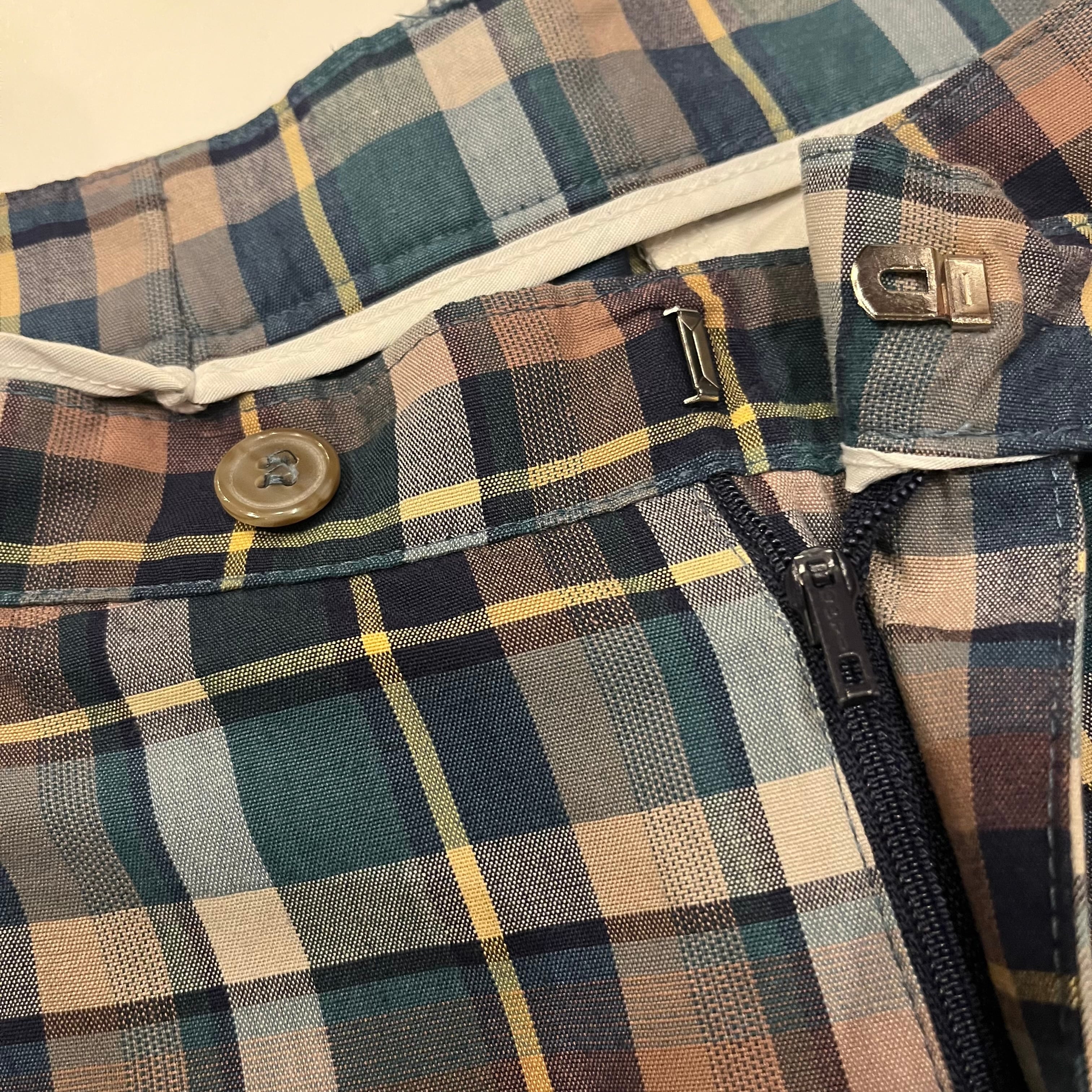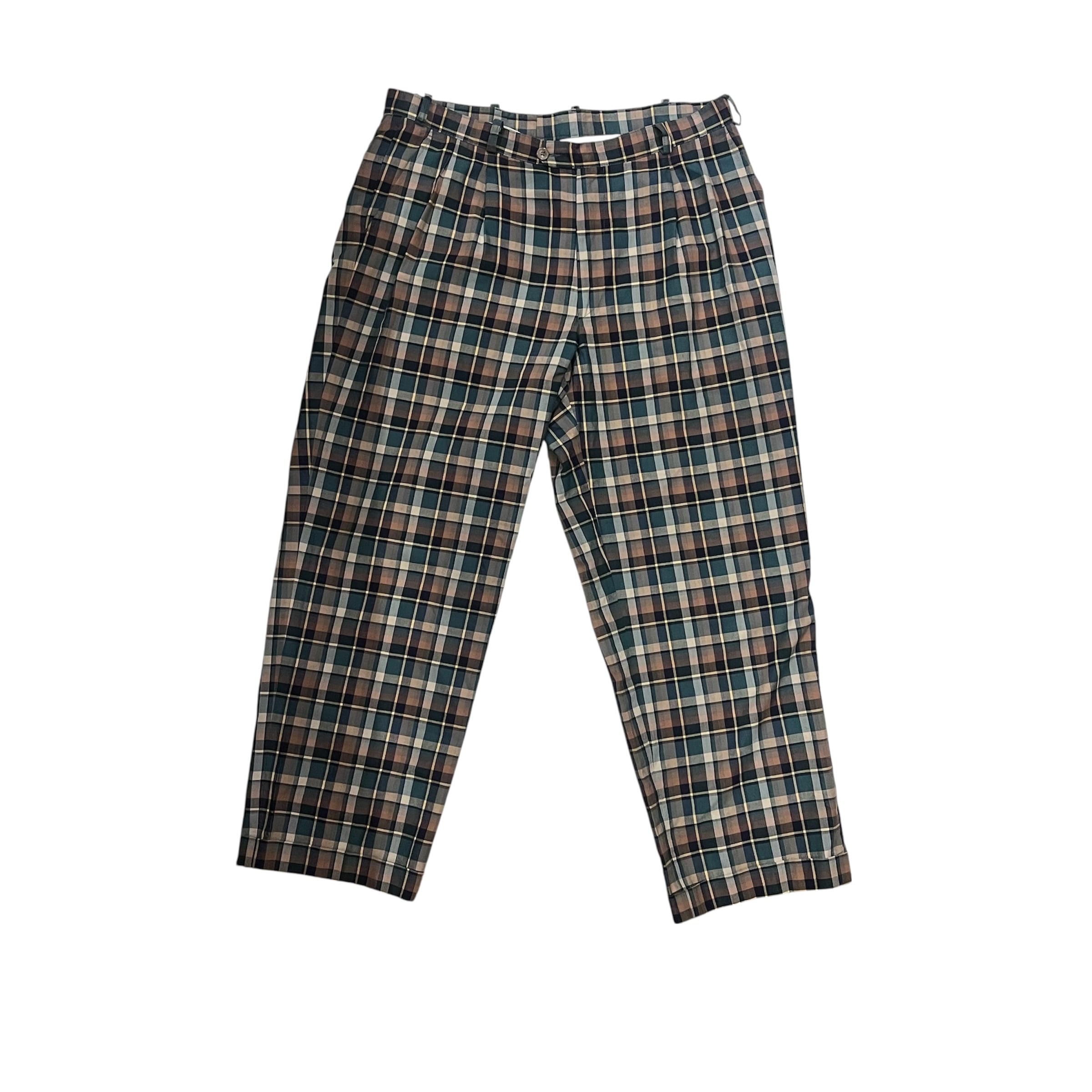 コットン、ポリエステルのスラックスになります。表記はポリエステル30%の表記は見えますが、それ以外は消えていて恐らくコットンが70%だと思います。optiジッパーなのでユーロの企画のものかと思います。裾はダブル仕様。タックが2箇所入っていて外向き、内向き同じところににタックが入っています。内側向きにもう一つタックが入っていてワイドなシルエットが特徴です。