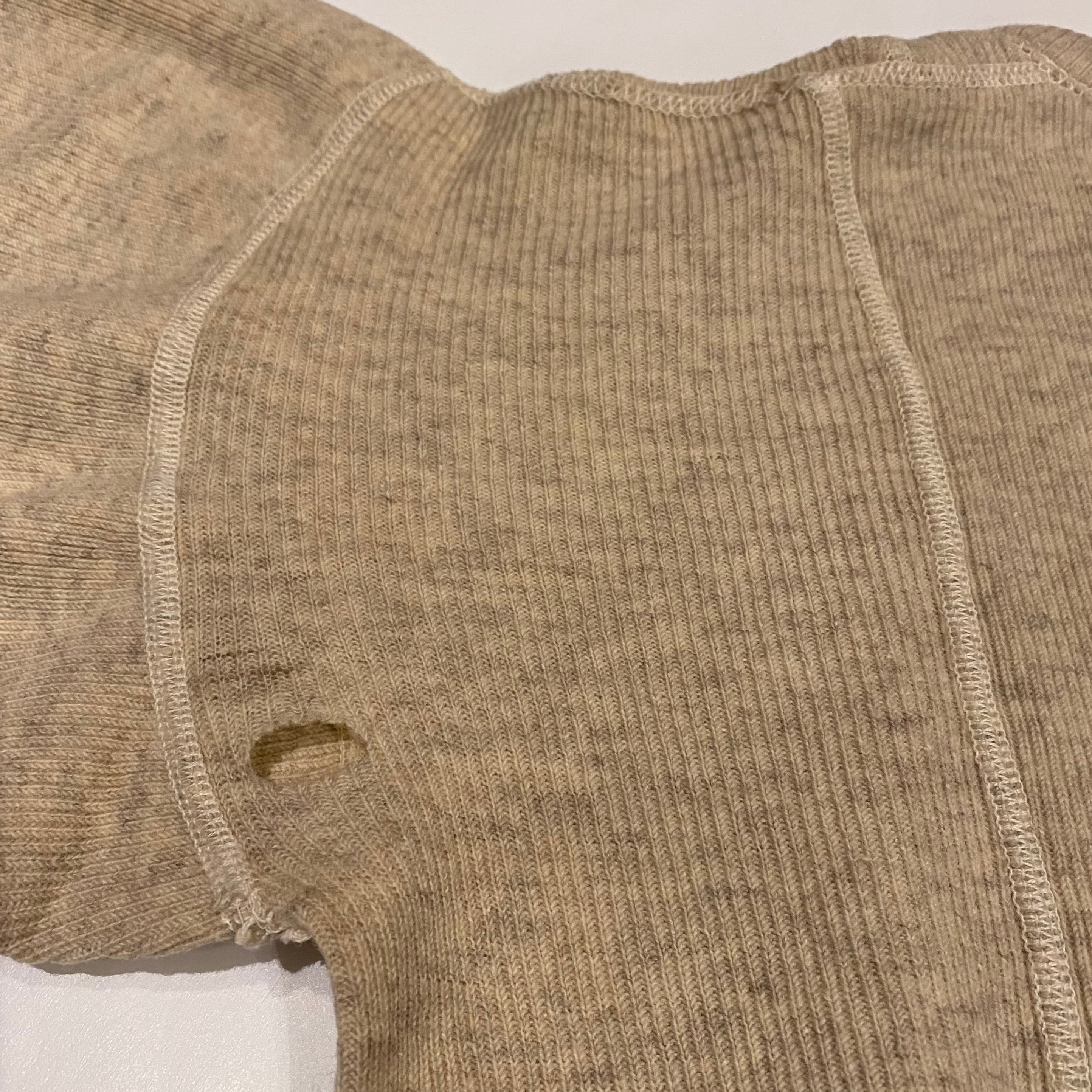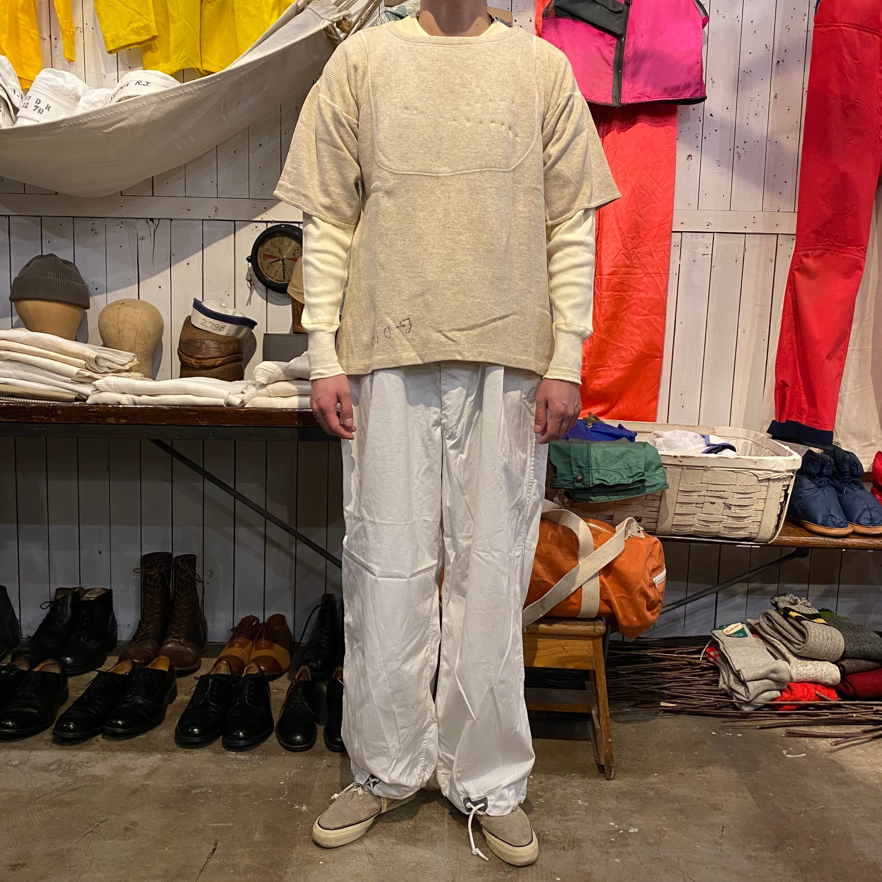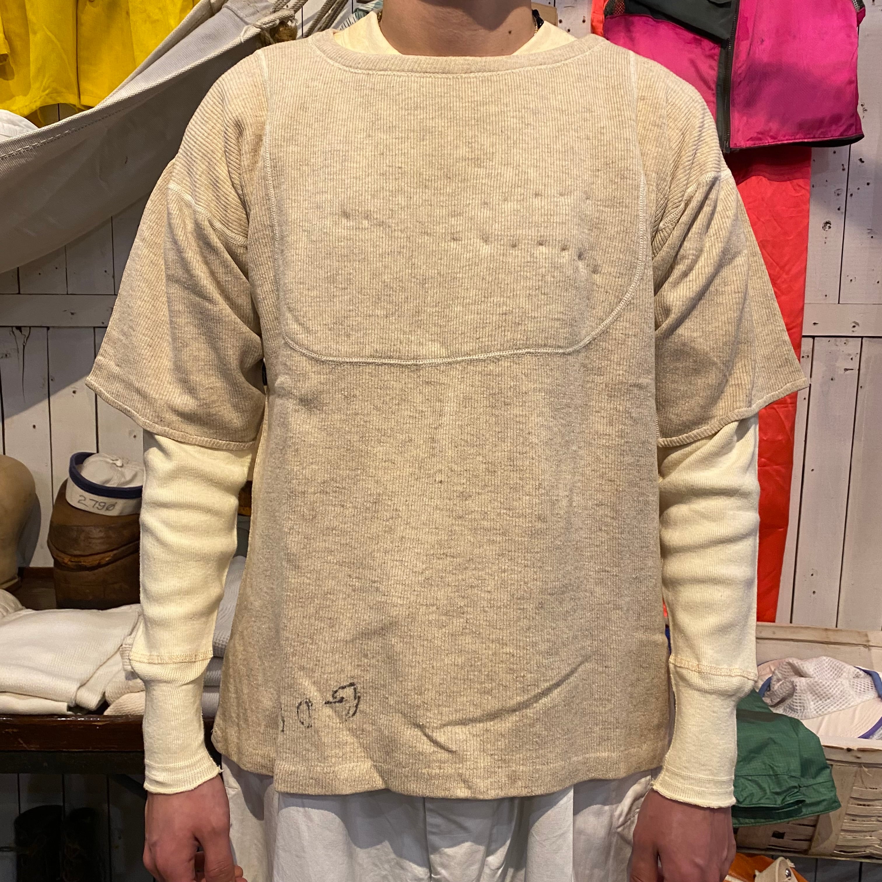 大変希少な1940年代のU.S.NAVYのアンダーウエア、カットオフTシャツになります。フロントとバックに大きく入るステッチが最大の特徴です。昔にハンドステッチでショートスリーブに直された袖口もとても雰囲気があって良いです。元々はアンダーウエアですが身幅もあって全体のサイズバランスがとても良いので格好良く着ていただけると思います。※後ろ身頃袖に穴があります。肩のステッチほつれがあります。フロントにポツポツと生地が凹んだような箇所があります。