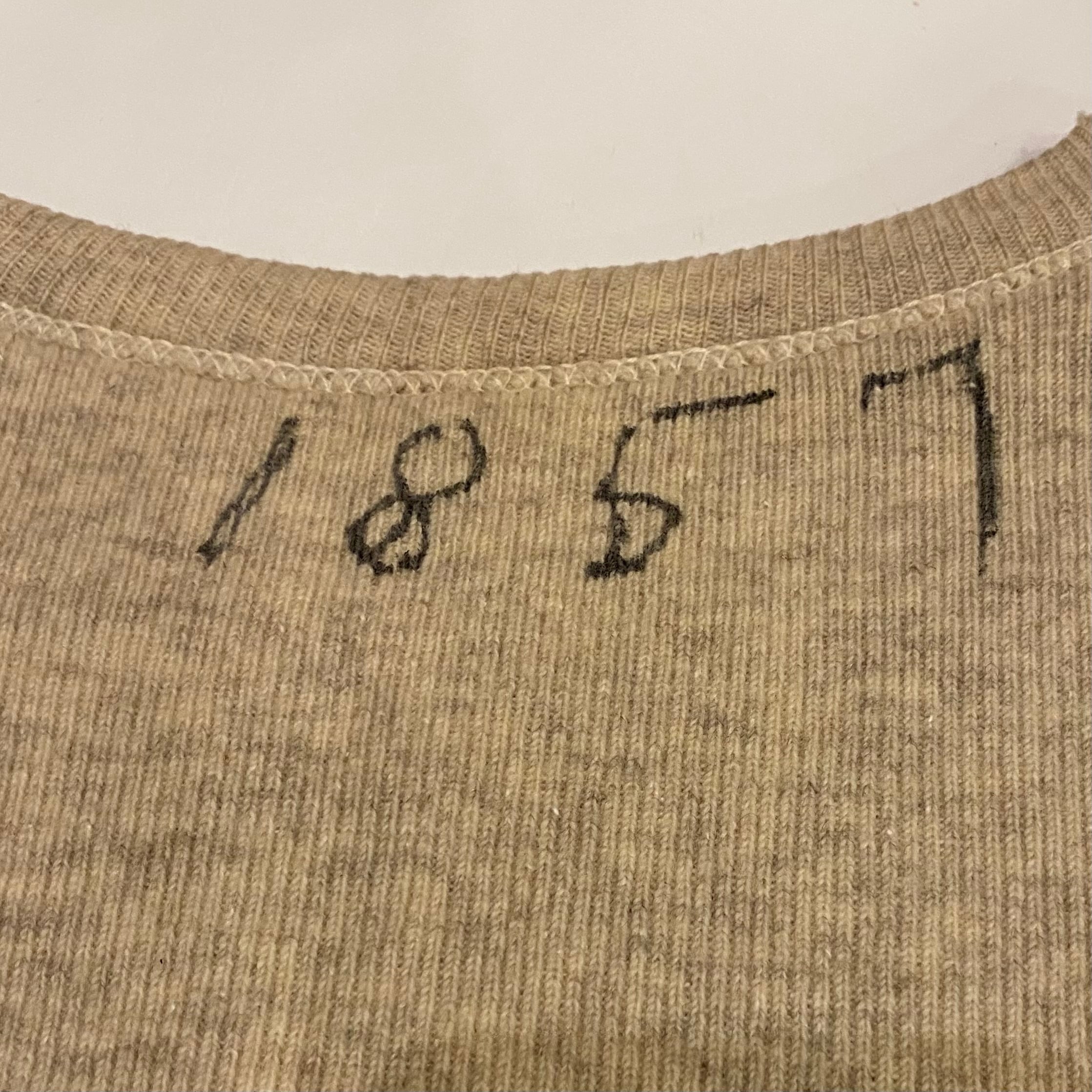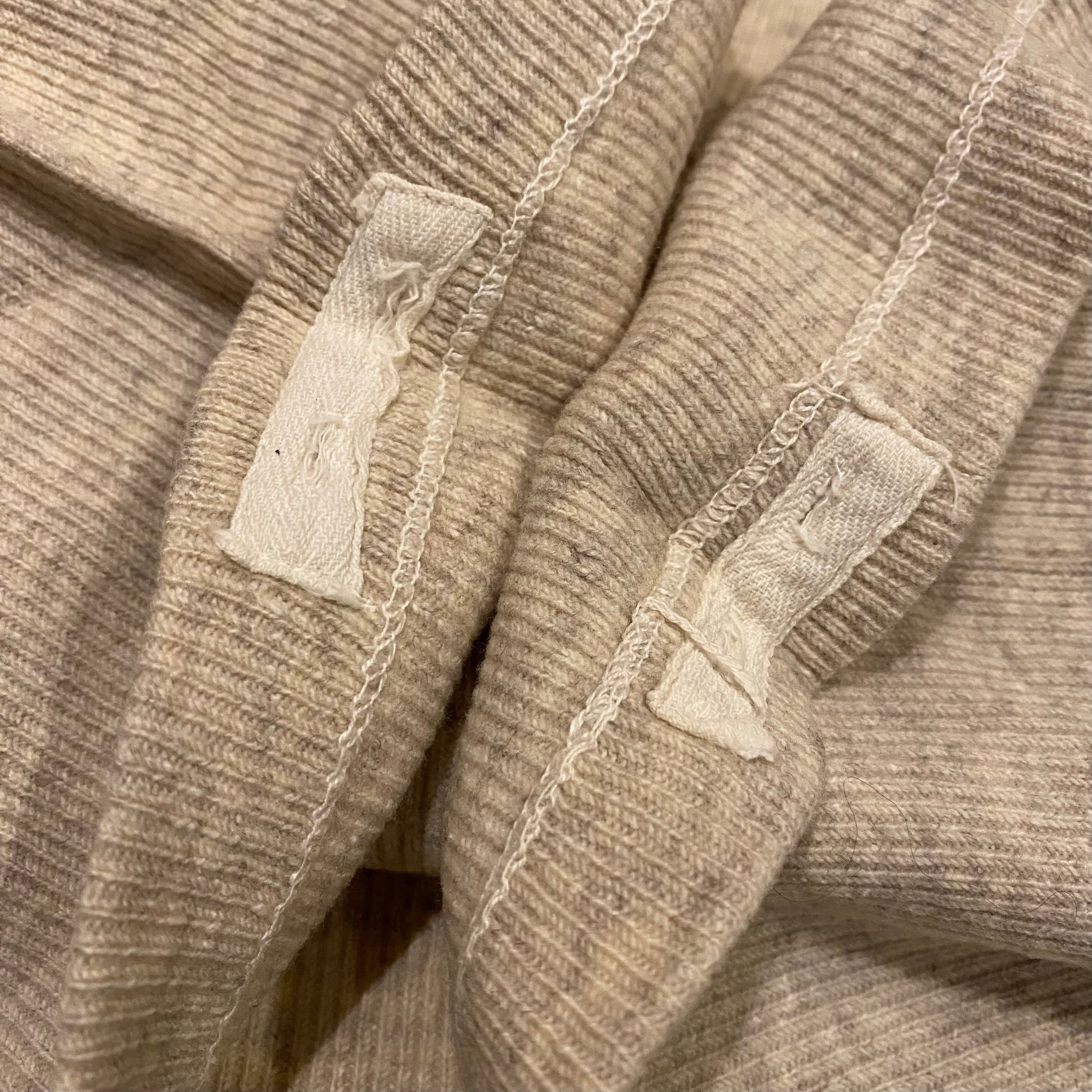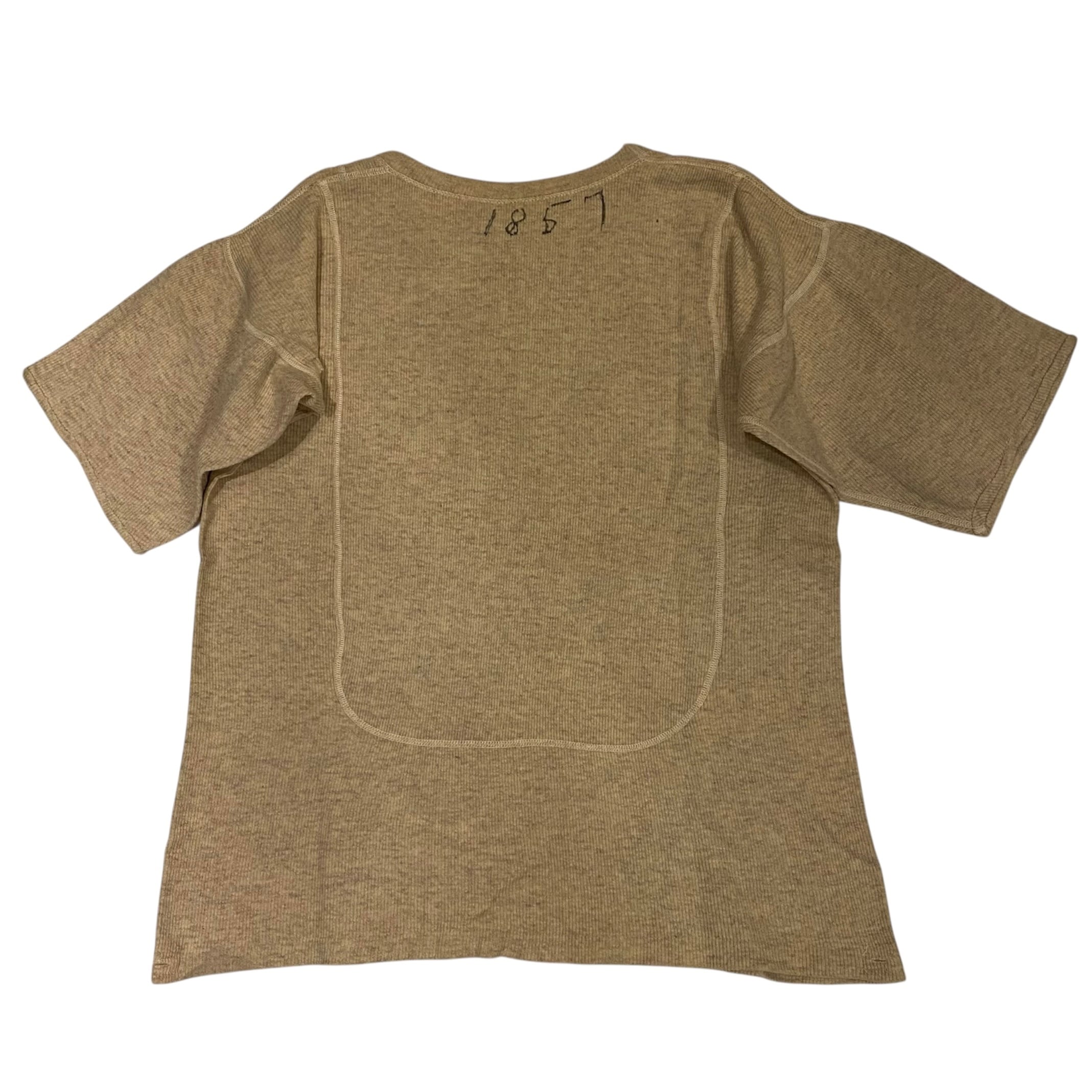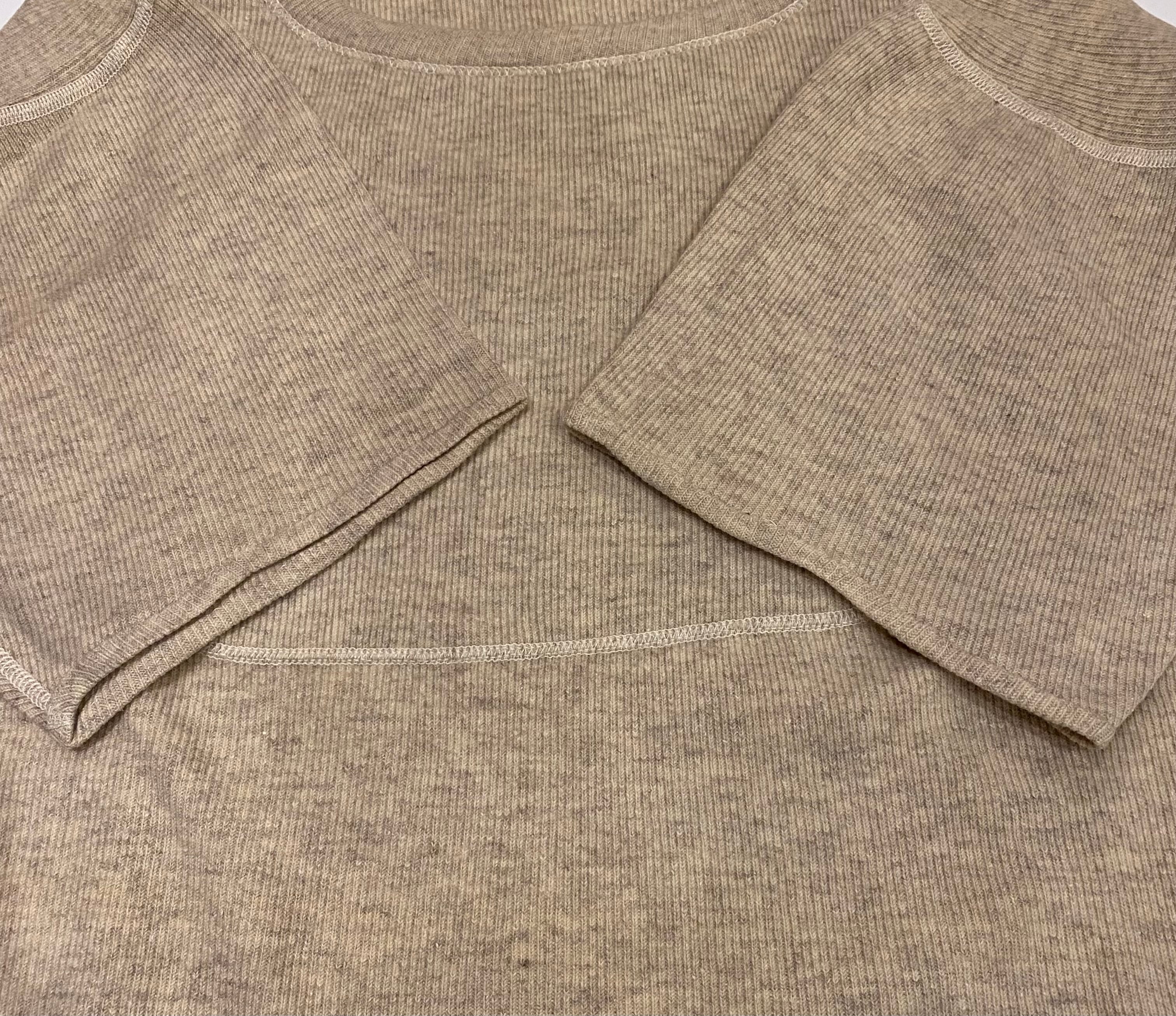 大変希少な1940年代のU.S.NAVYのアンダーウエア、カットオフTシャツになります。フロントとバックに大きく入るステッチが最大の特徴です。昔にハンドステッチでショートスリーブに直された袖口もとても雰囲気があって良いです。元々はアンダーウエアですが身幅もあって全体のサイズバランスがとても良いので格好良く着ていただけると思います。※後ろ身頃袖に穴があります。肩のステッチほつれがあります。フロントにポツポツと生地が凹んだような箇所があります。