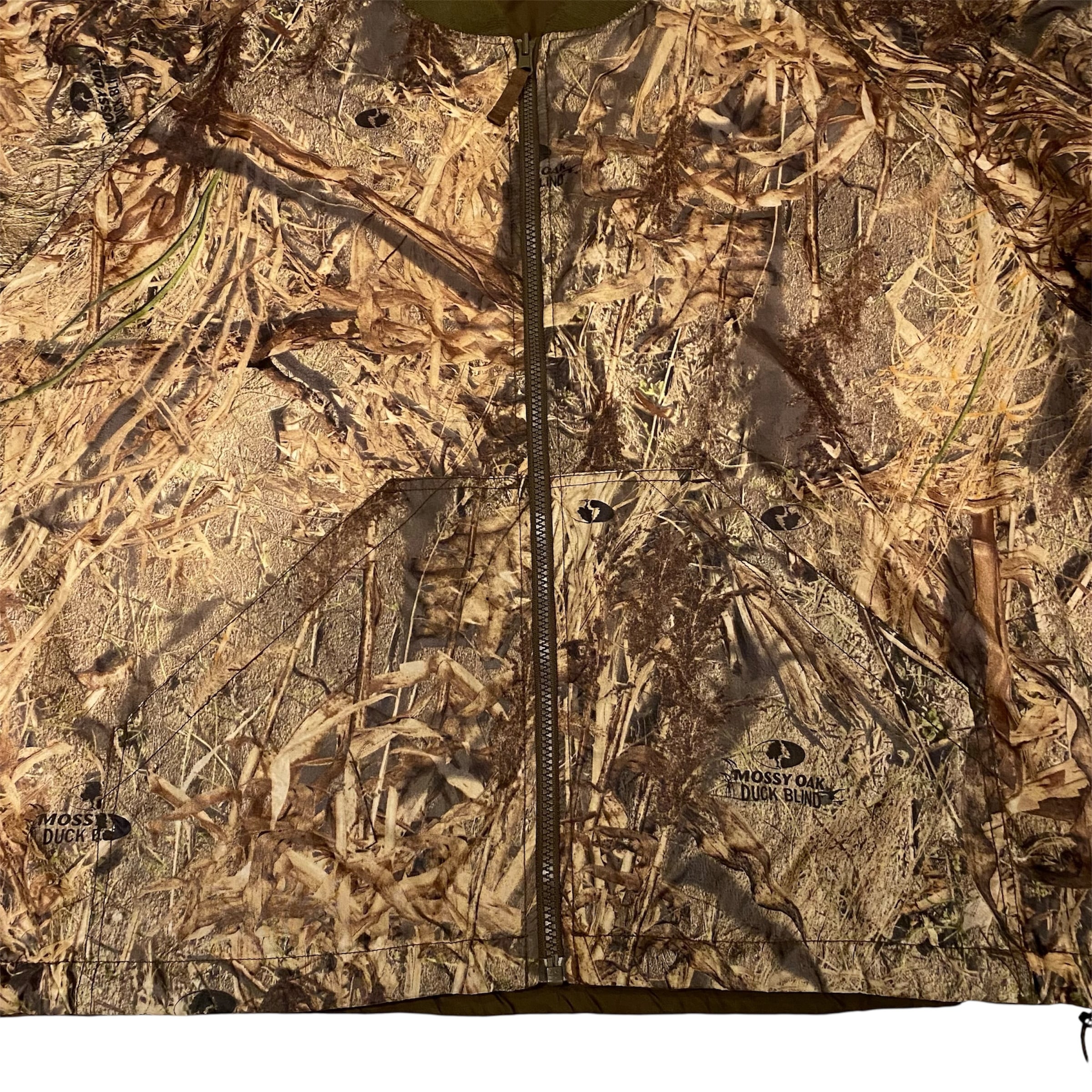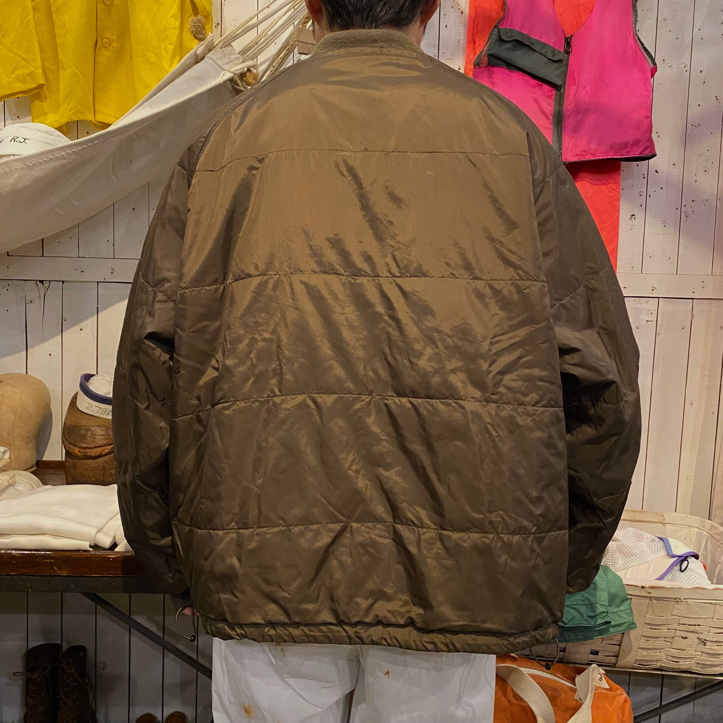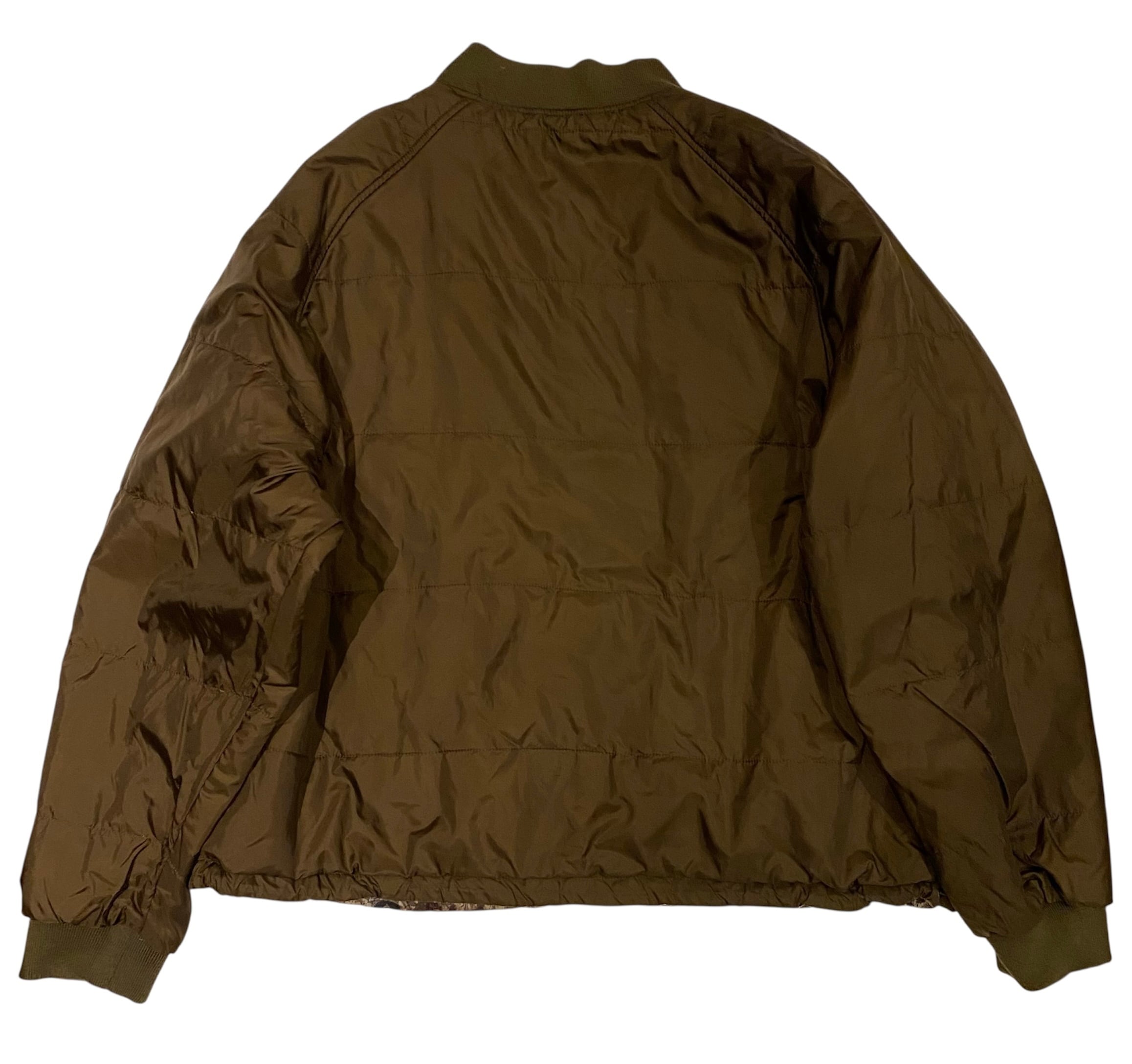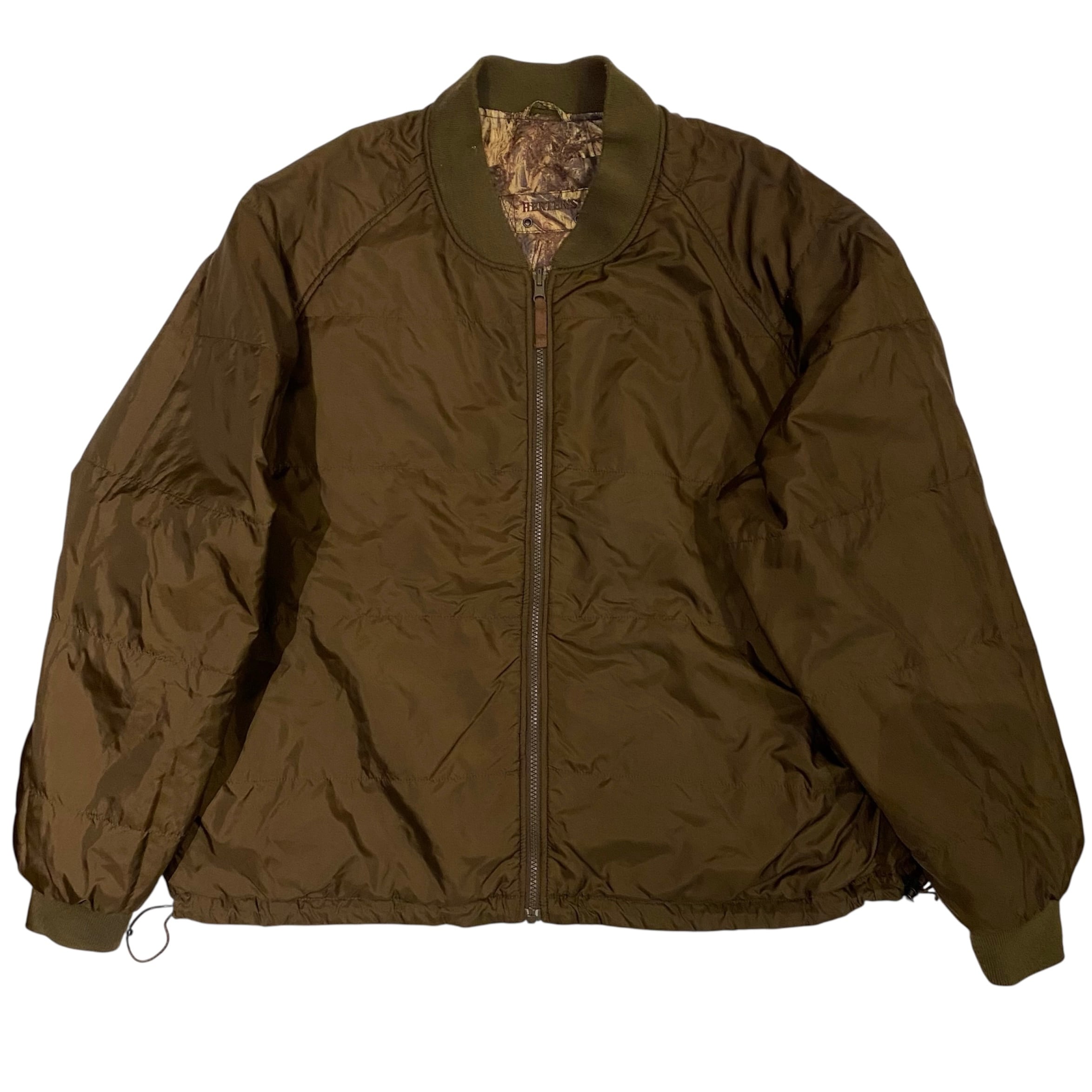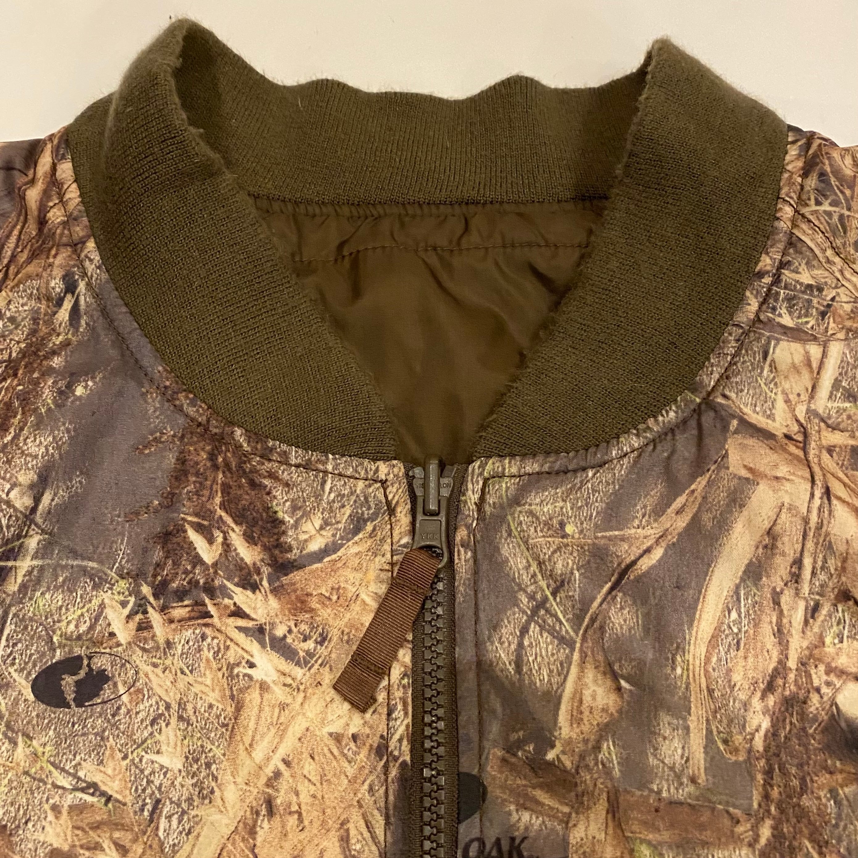 A面リアルツリー柄、B面ブラウンの無地、の中綿入りのリバーシブルジップジャケットになります。回転式YKKジッパー仕様。両面とても良いので気分で変えてみてはいかがでしょうか。中綿入りで温かく、でも見た目は重たくはみえないバランスがいま時期に最高でしょう。ジッパーを閉めて裾のドローコードを絞って着丈を調整して着るのも格好良いと思います。