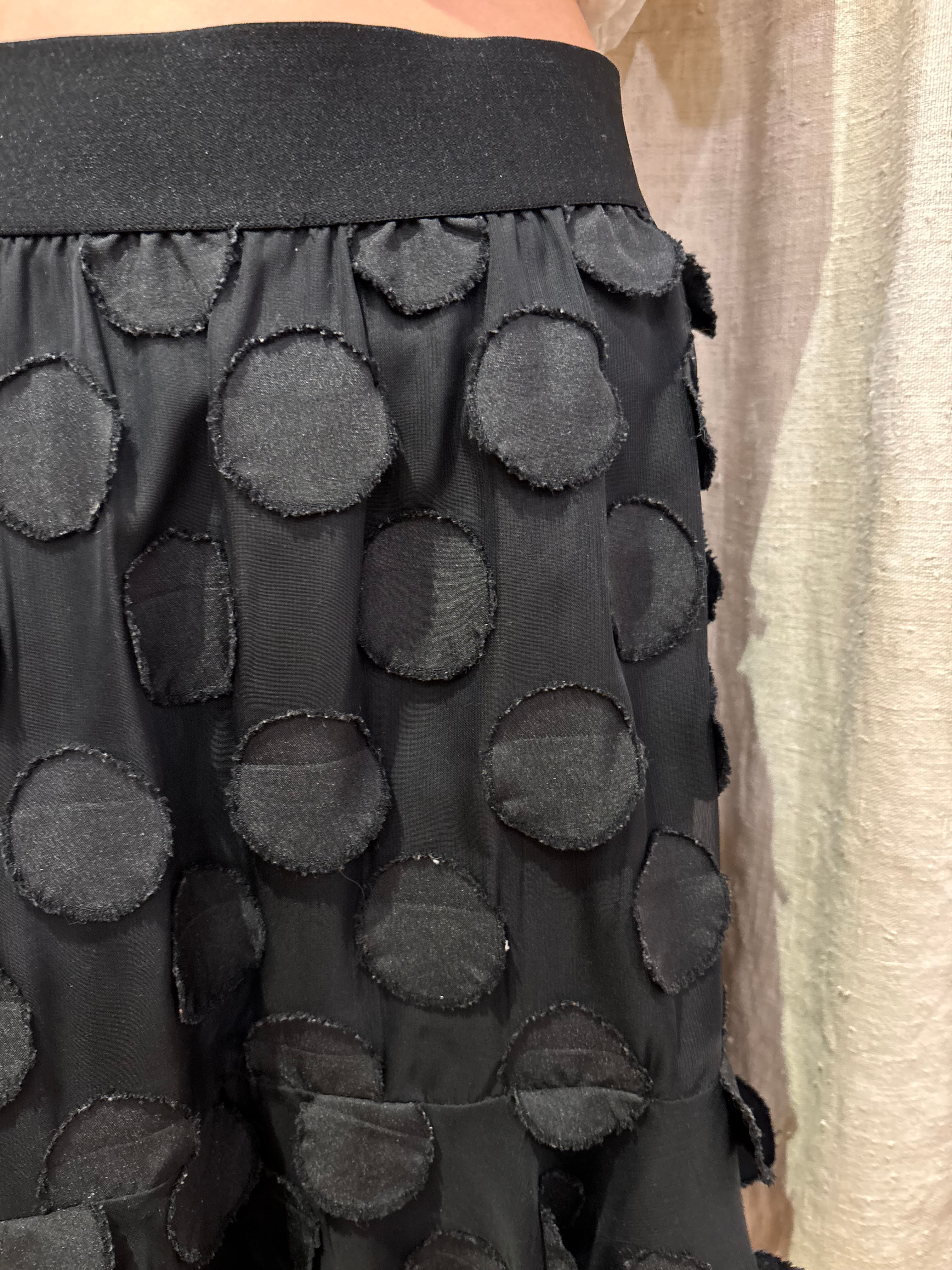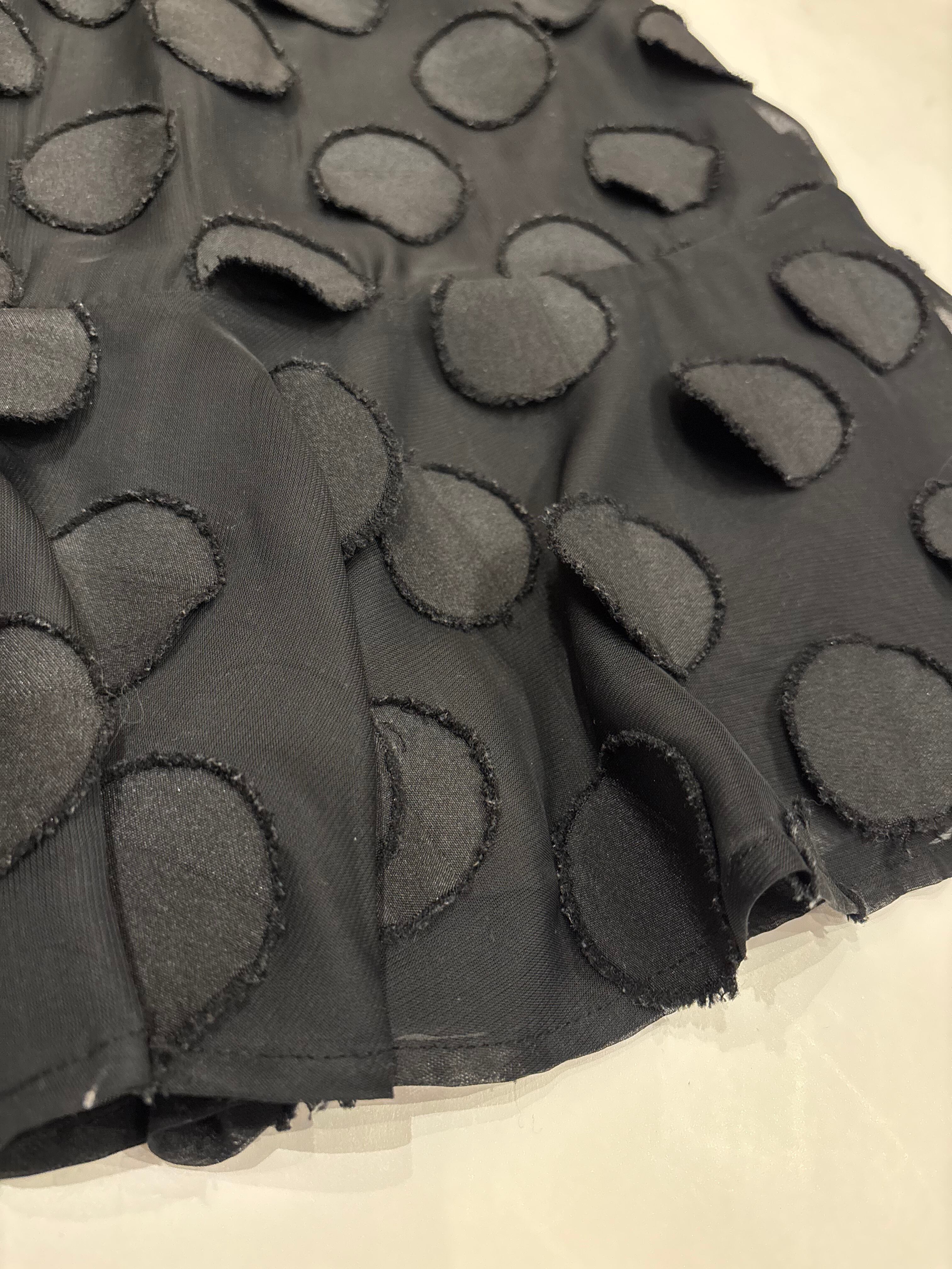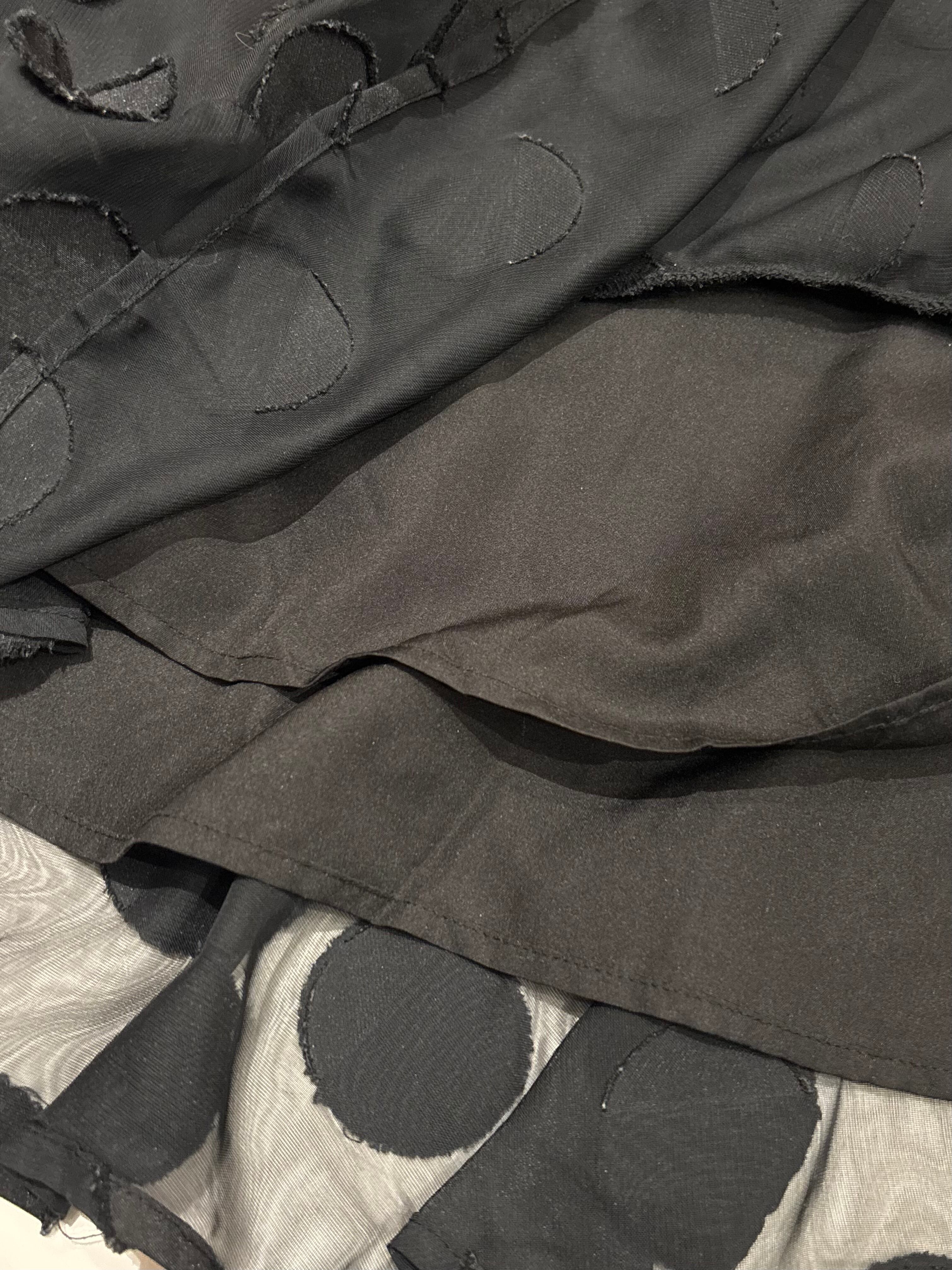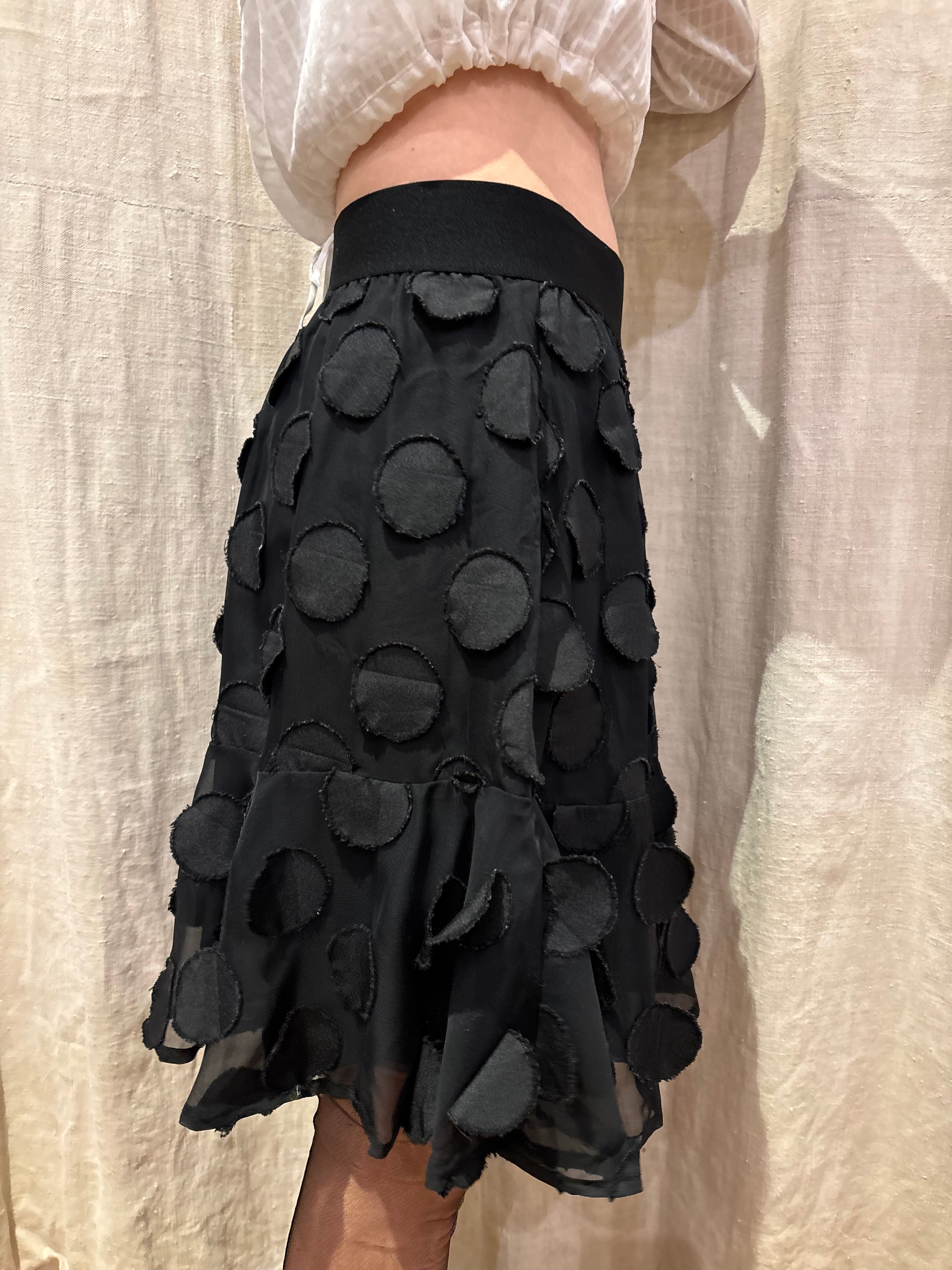 春らしいシフォン生地のひざ丈のスカートです。全てのドットが半分だけ縫い付けられており、残りの半分がヒラヒラとしていて、立体的で動きがありとても可愛いです。普通のドット柄のスカートとはまた一味違い、個性もありつつブラックのワントーンで上品な雰囲気なので、普段ドット柄に少し抵抗がある方でも挑戦しやすいアイテムです。