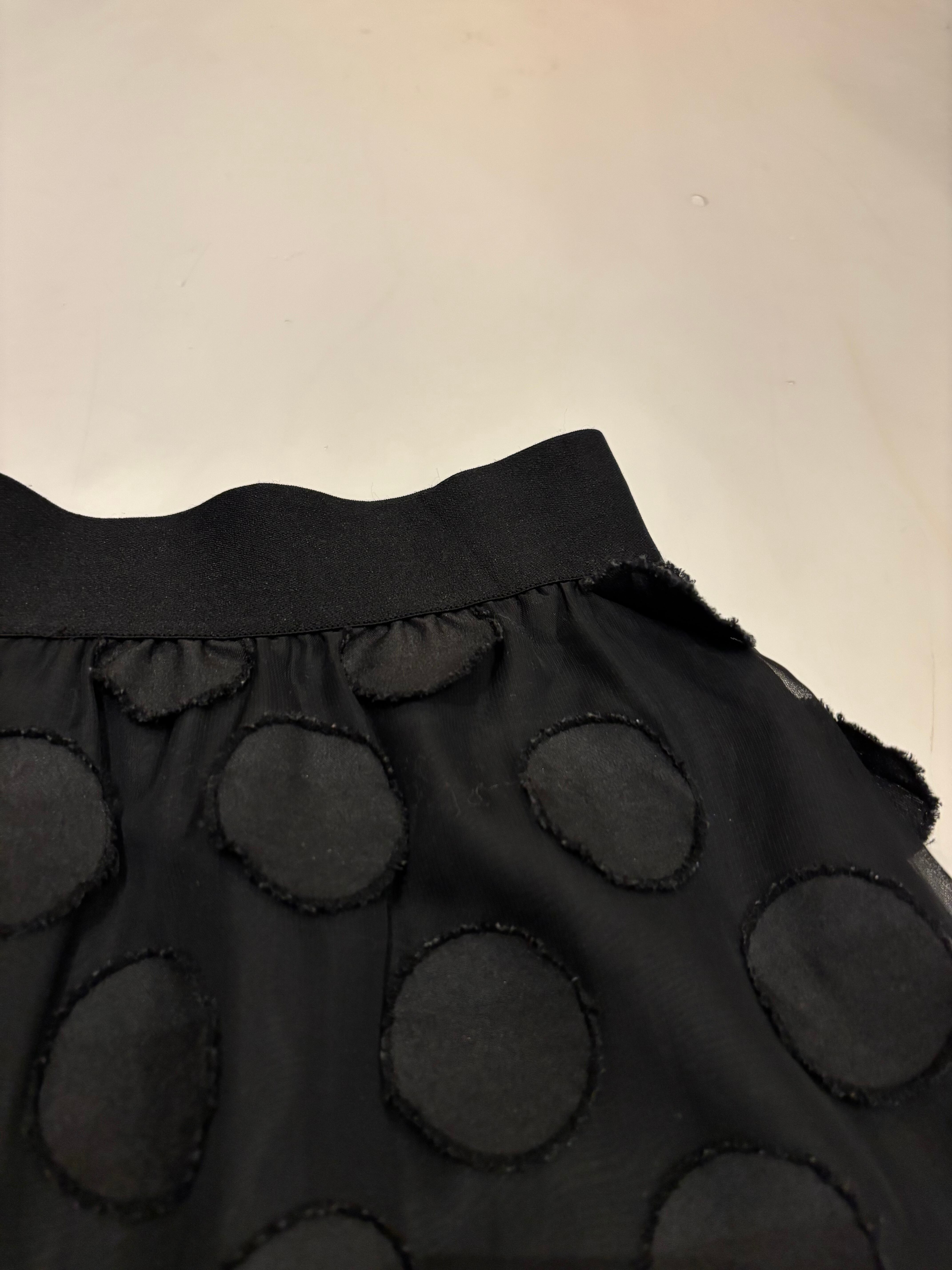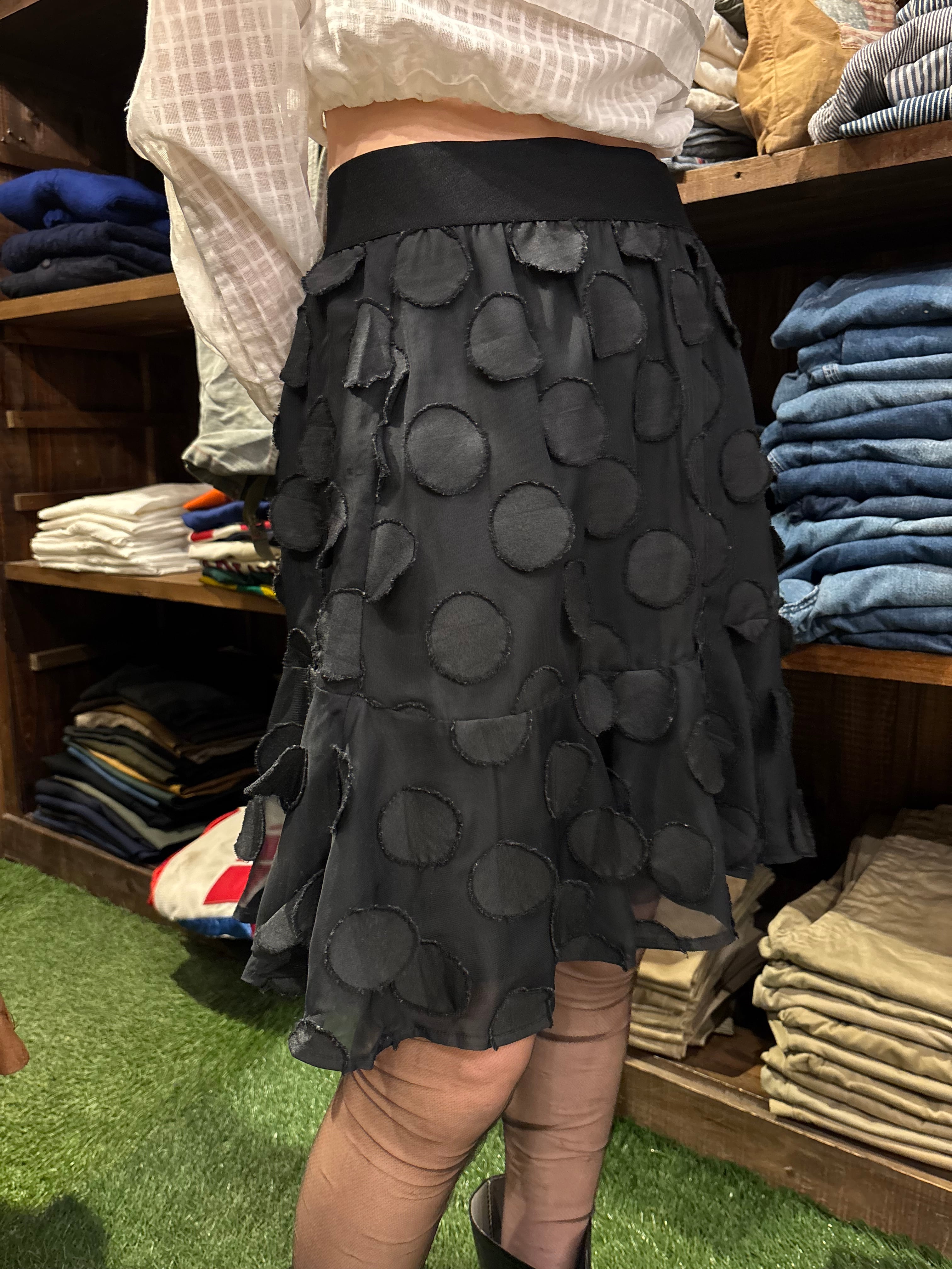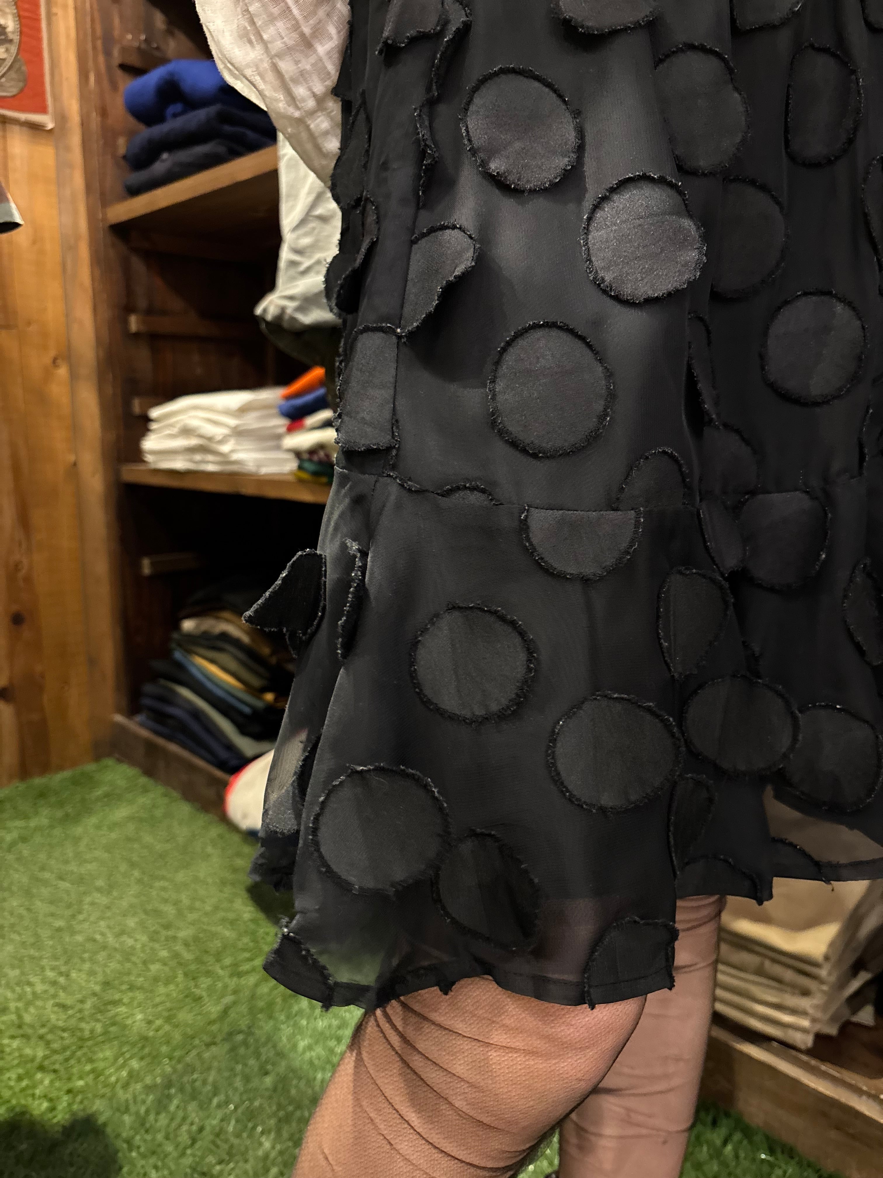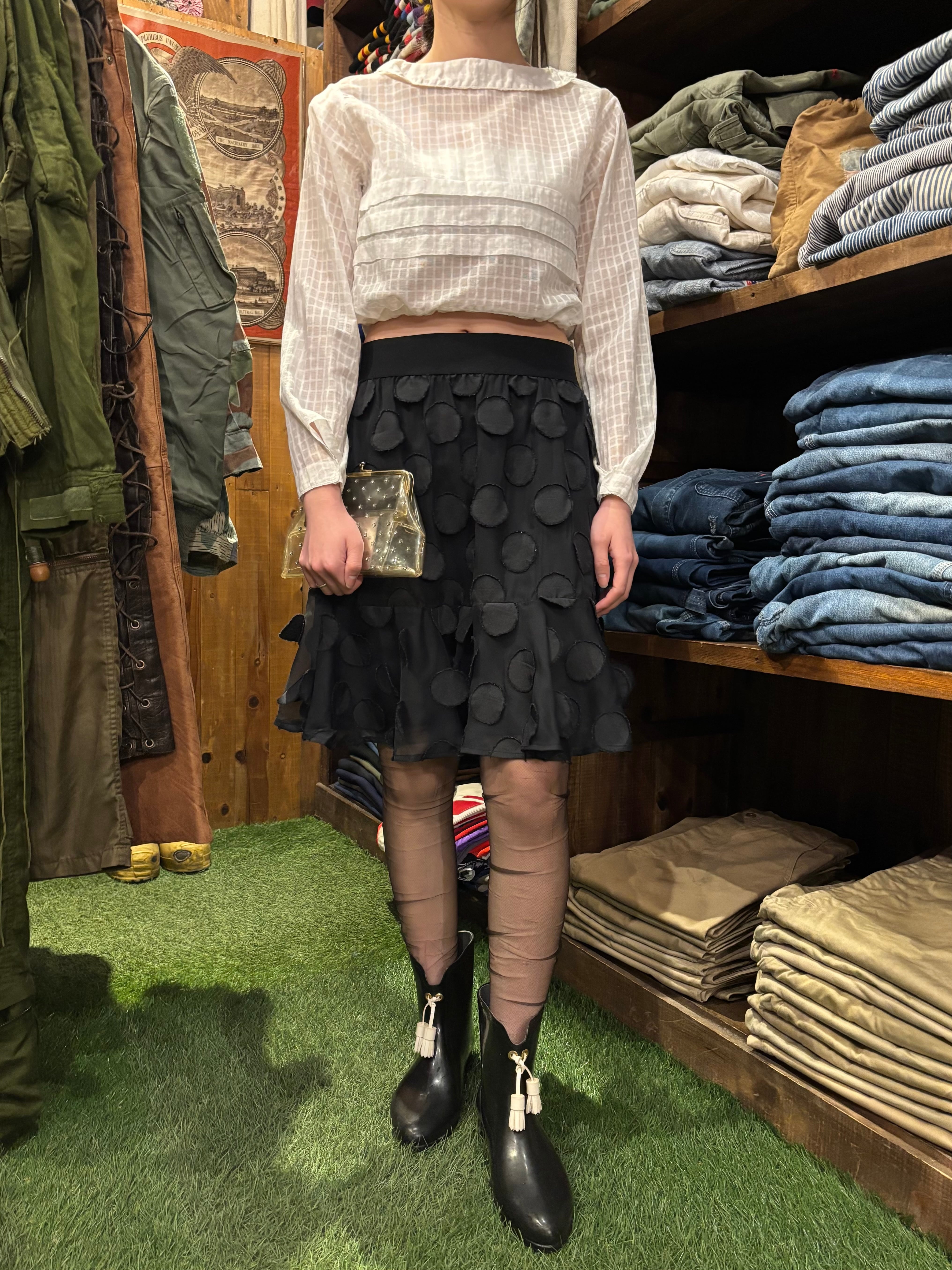 春らしいシフォン生地のひざ丈のスカートです。全てのドットが半分だけ縫い付けられており、残りの半分がヒラヒラとしていて、立体的で動きがありとても可愛いです。普通のドット柄のスカートとはまた一味違い、個性もありつつブラックのワントーンで上品な雰囲気なので、普段ドット柄に少し抵抗がある方でも挑戦しやすいアイテムです。