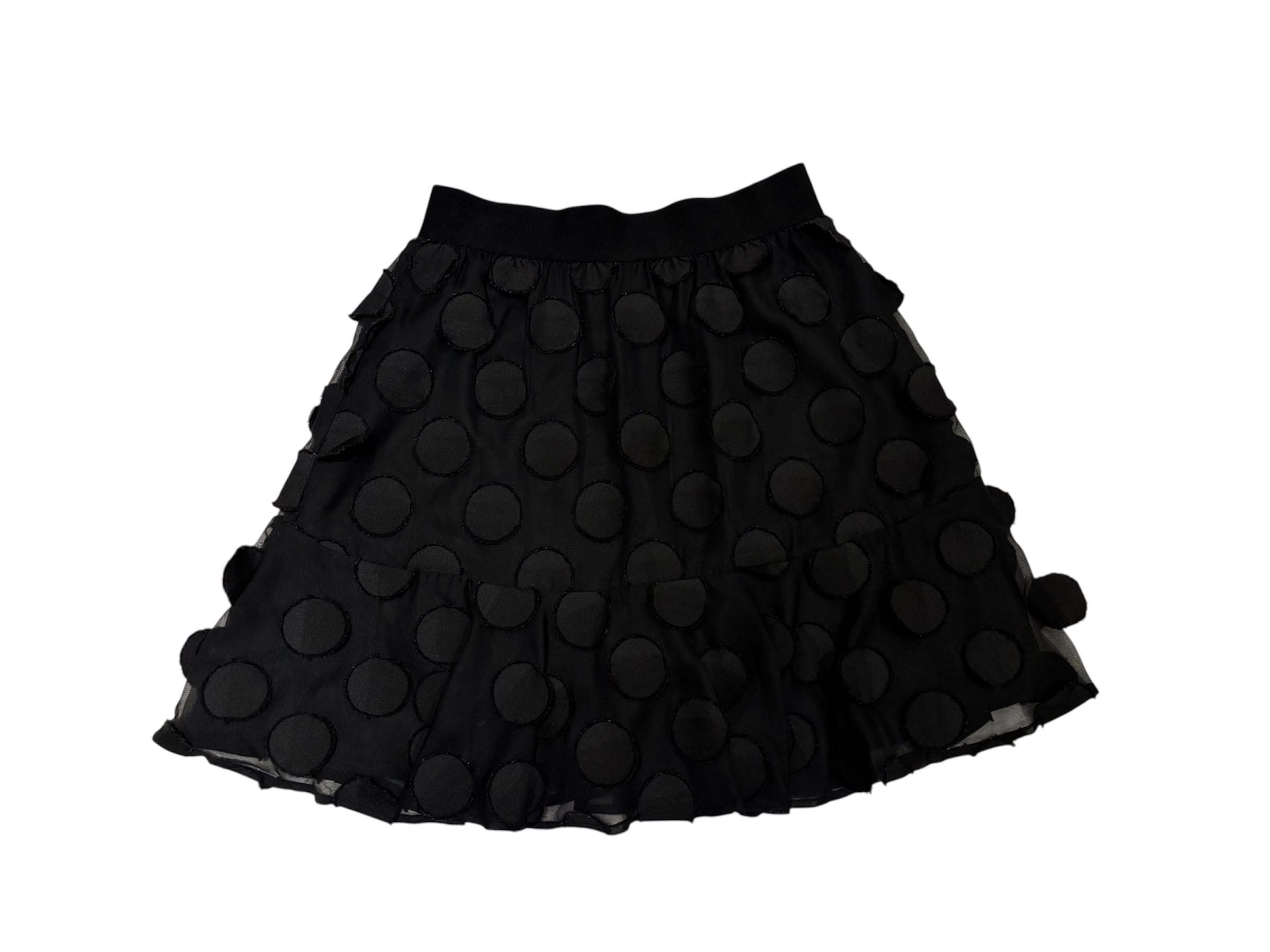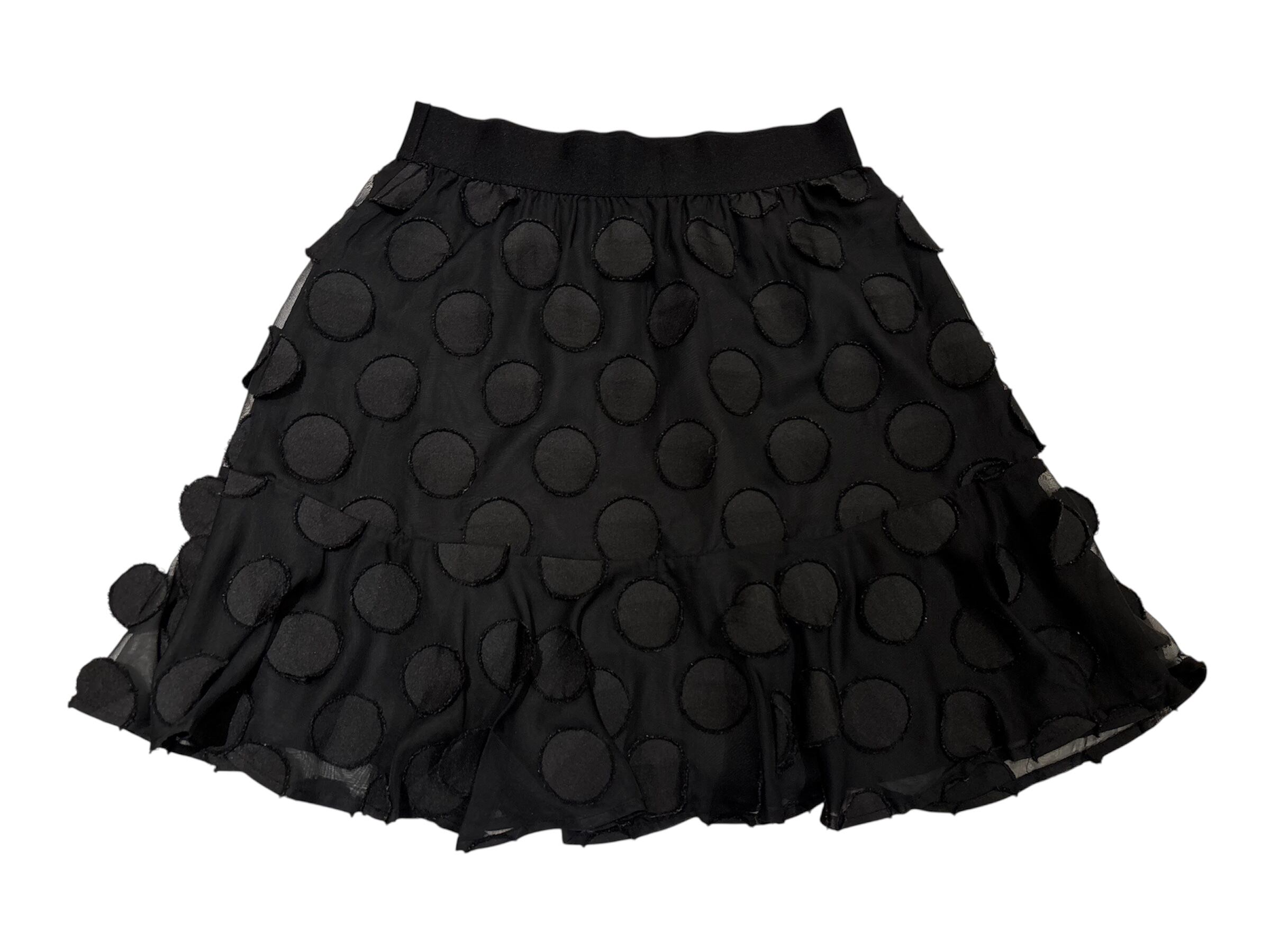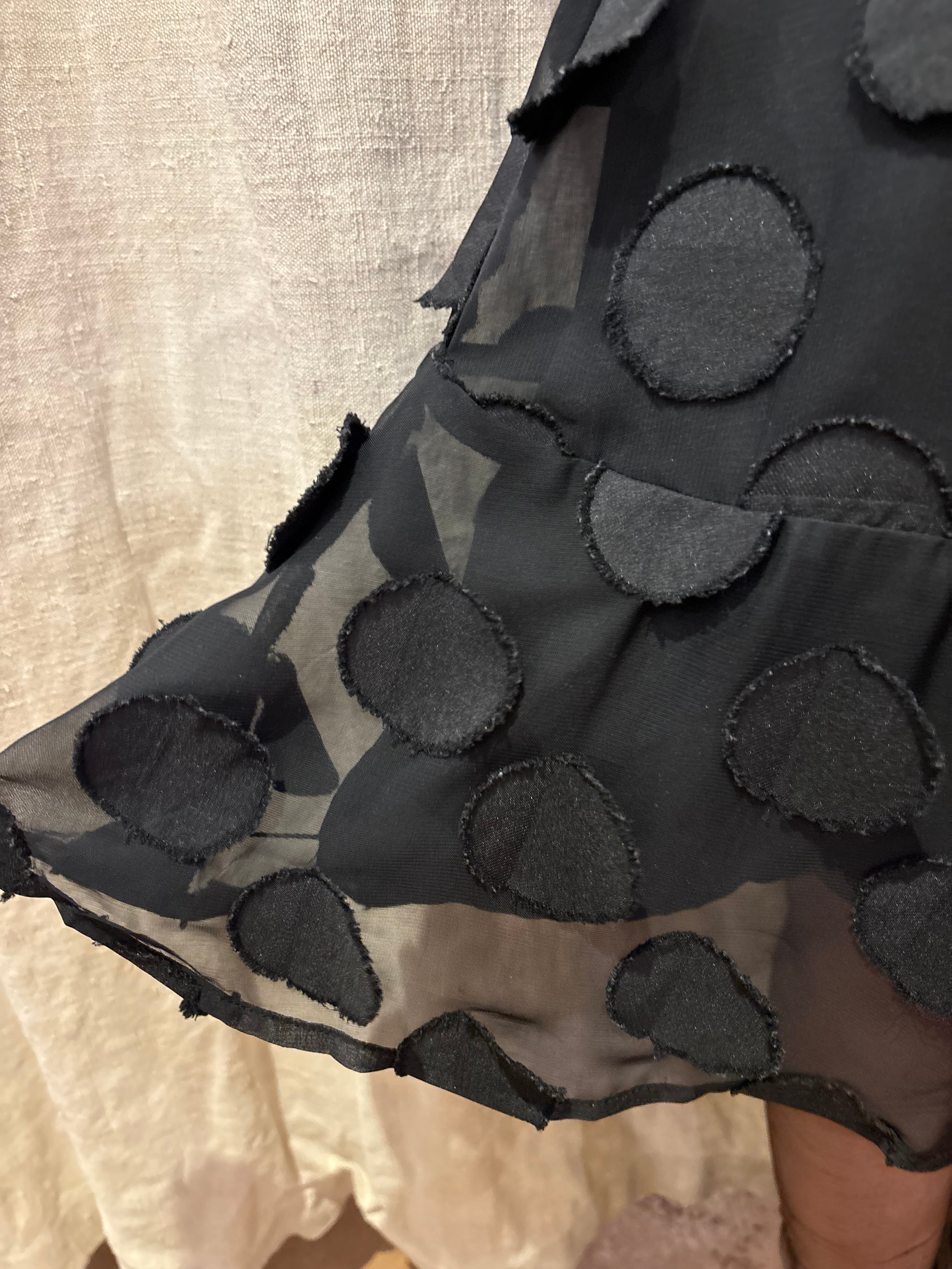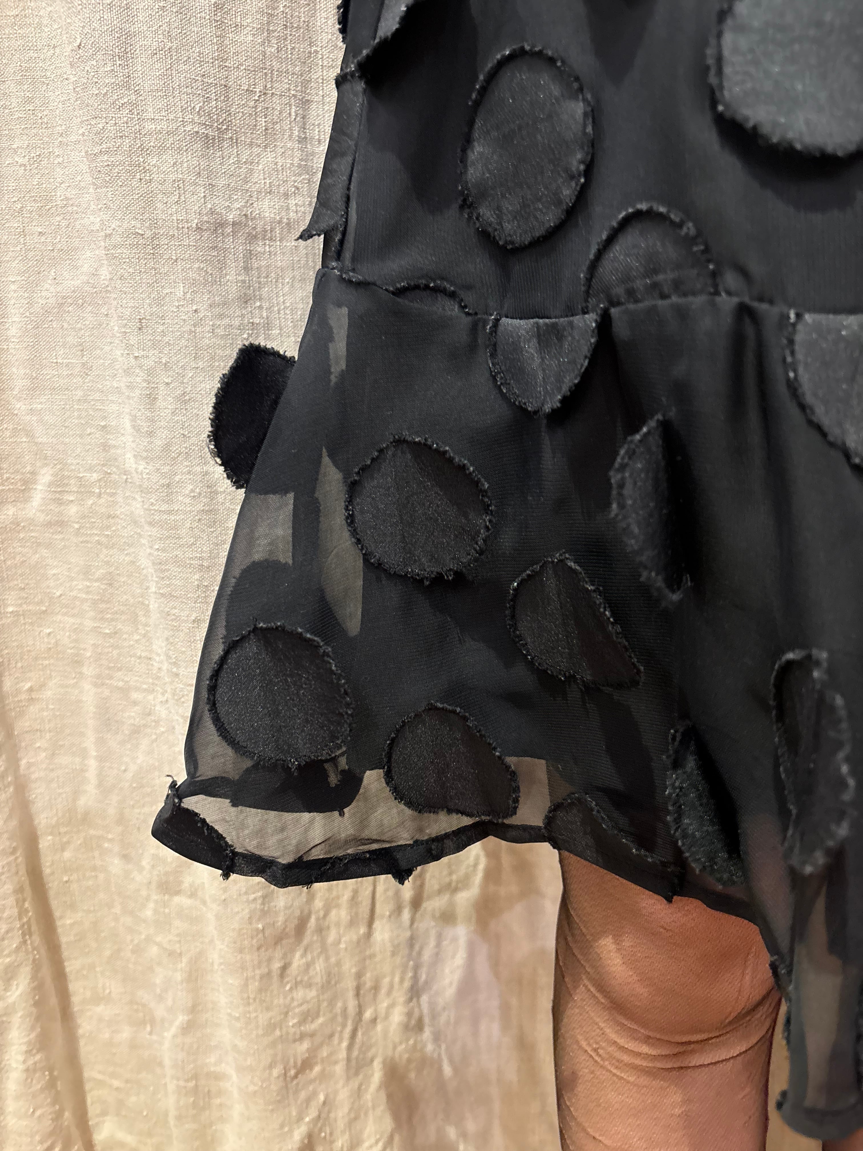 春らしいシフォン生地のひざ丈のスカートです。全てのドットが半分だけ縫い付けられており、残りの半分がヒラヒラとしていて、立体的で動きがありとても可愛いです。普通のドット柄のスカートとはまた一味違い、個性もありつつブラックのワントーンで上品な雰囲気なので、普段ドット柄に少し抵抗がある方でも挑戦しやすいアイテムです。