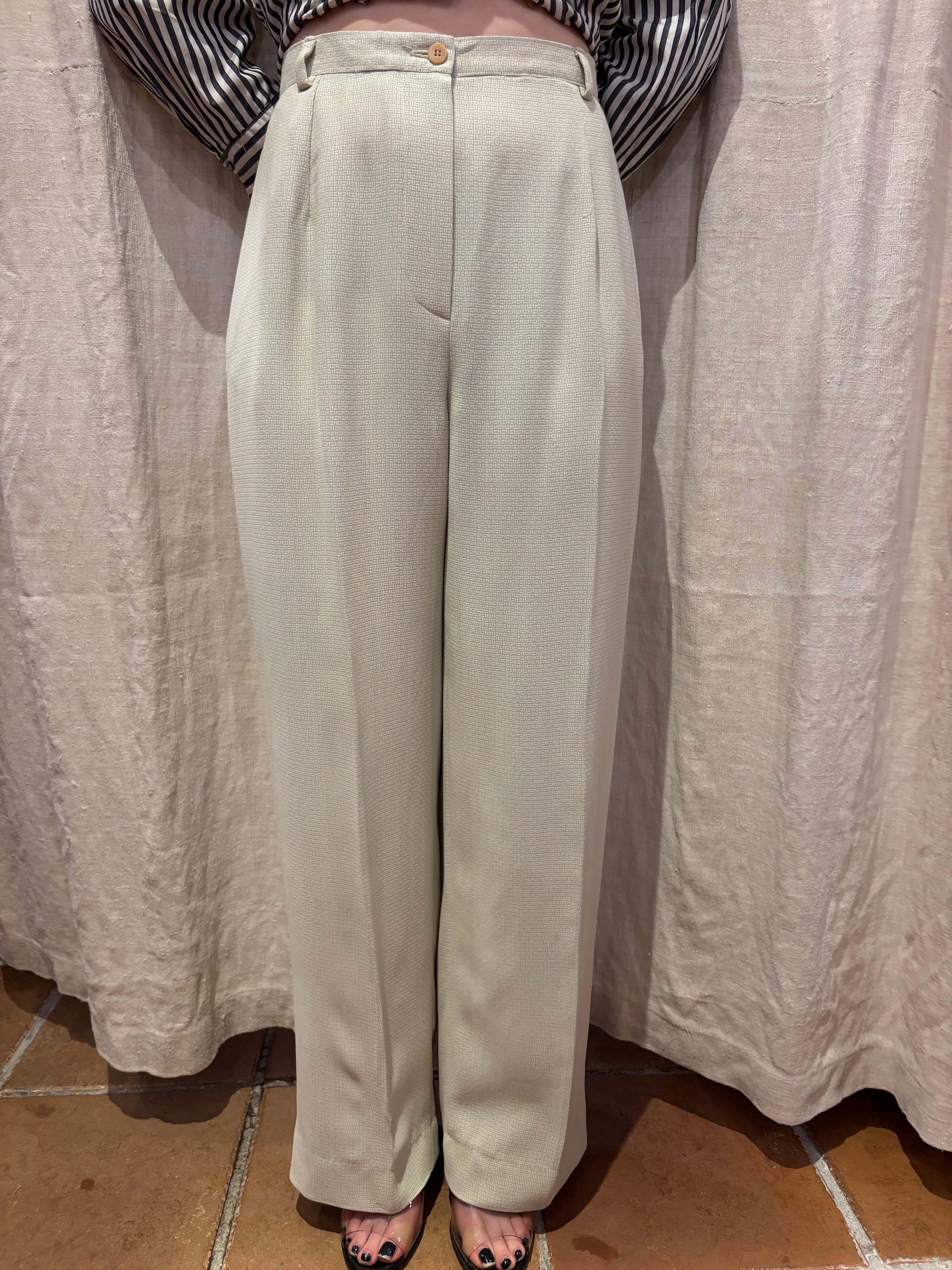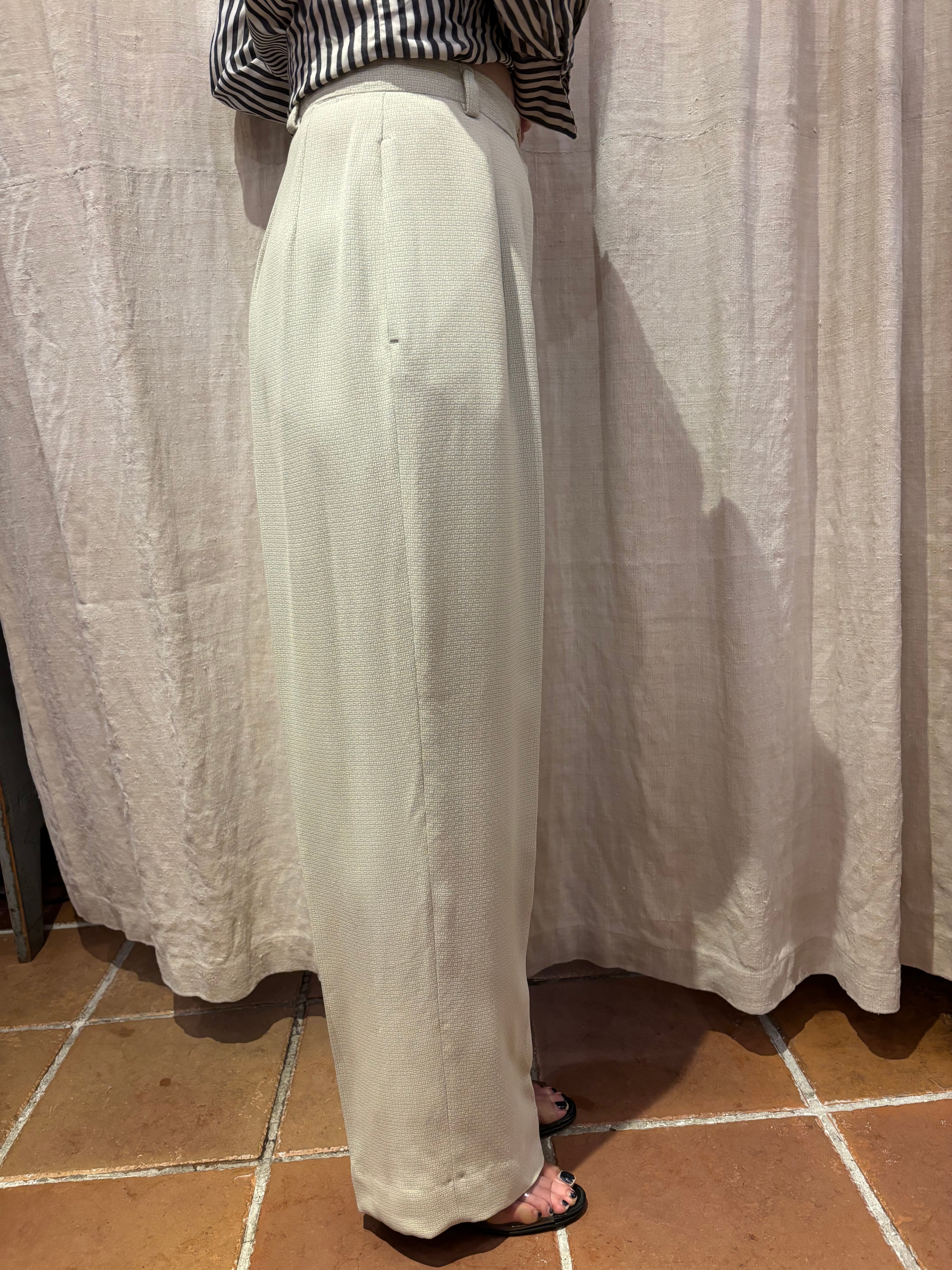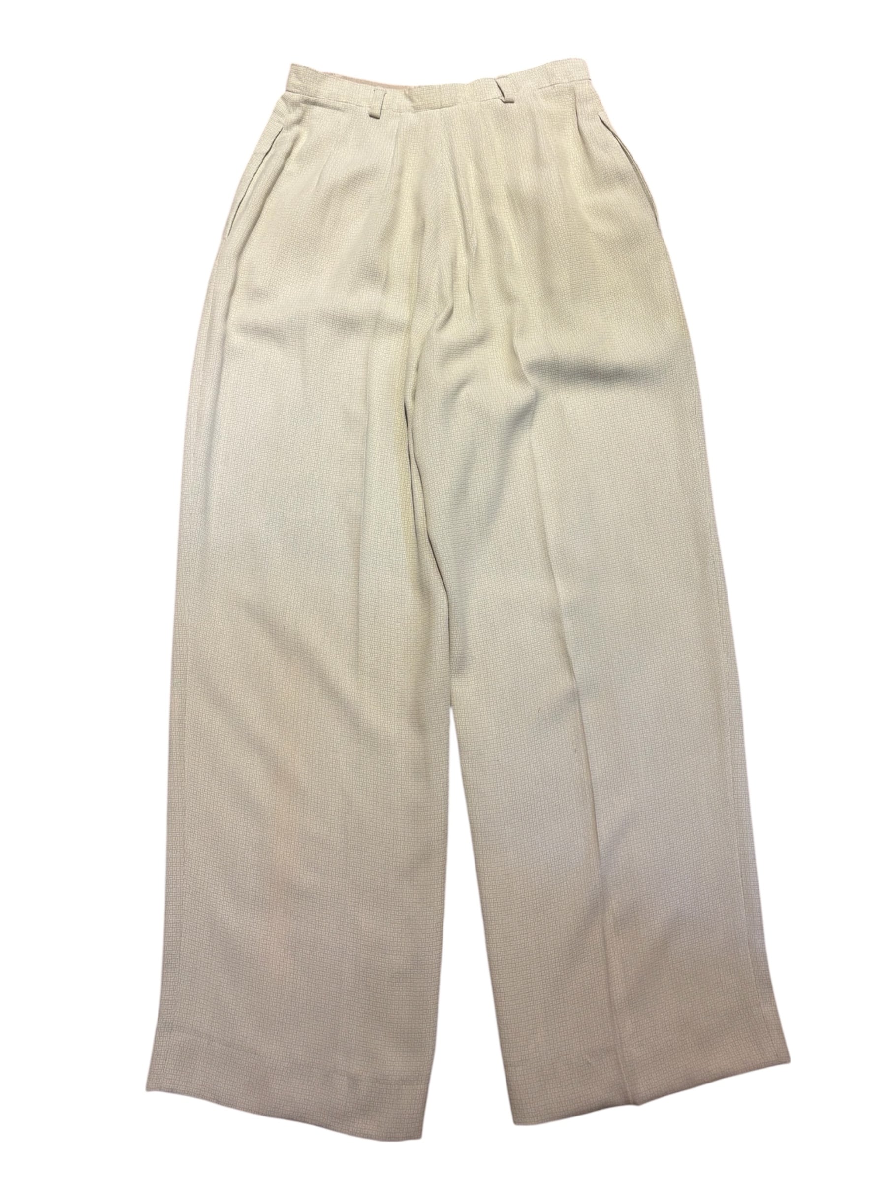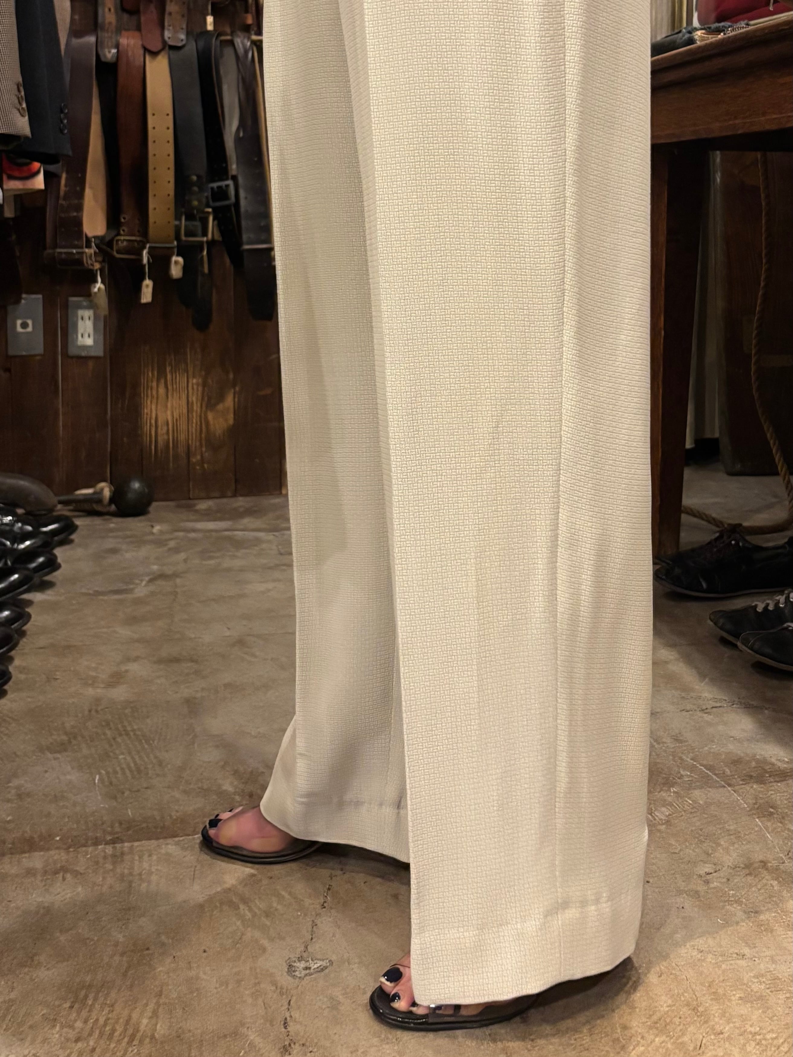ハイウエストにゆとりのあるツータック、裾までストンと落ちるワイドシルエットで、90年代らしいリラックスしたテーラリングが魅力です。