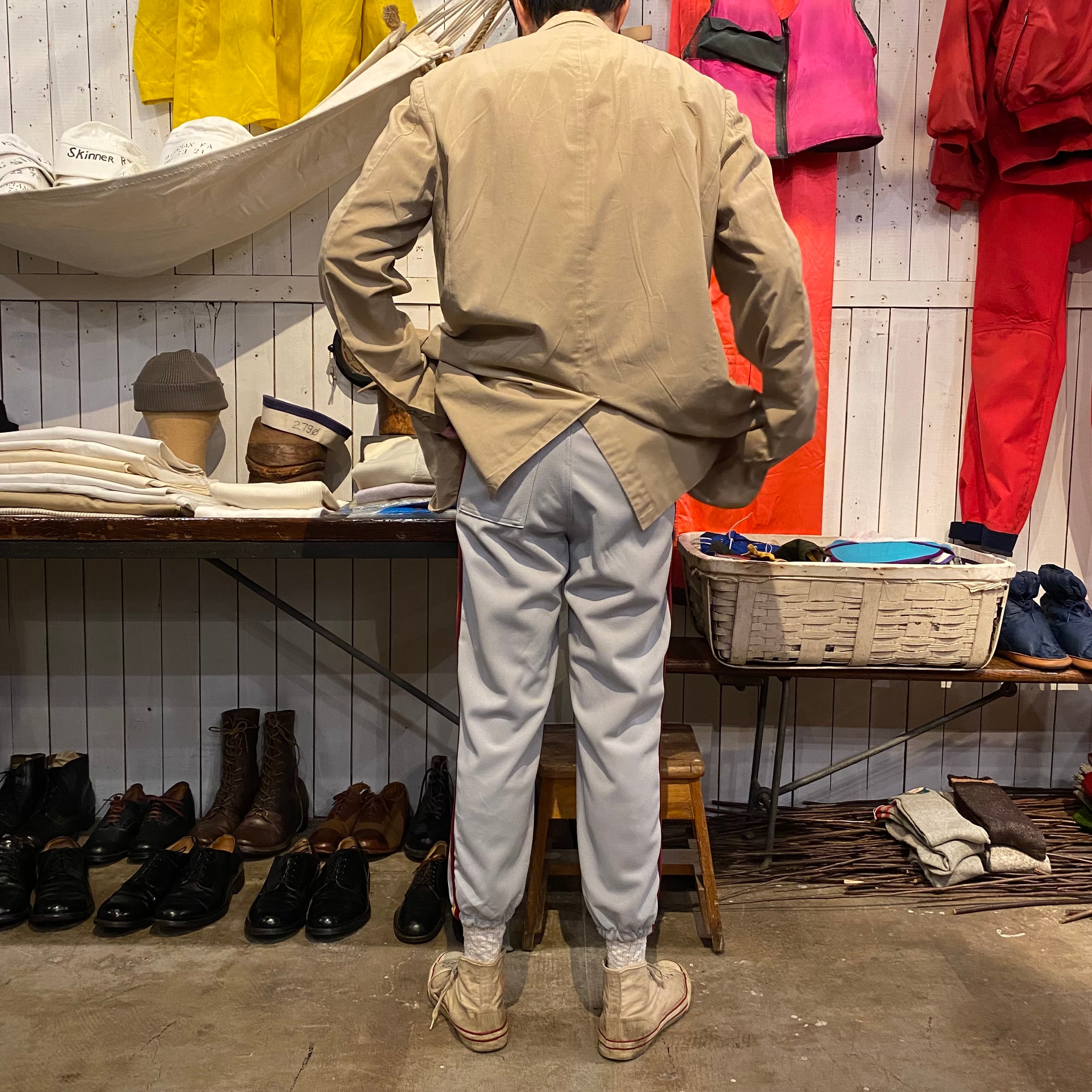 クロップド丈なので、ソックスやシューズで色々アレンジが効くと思います。履きこなせたら面白いアイテムです。