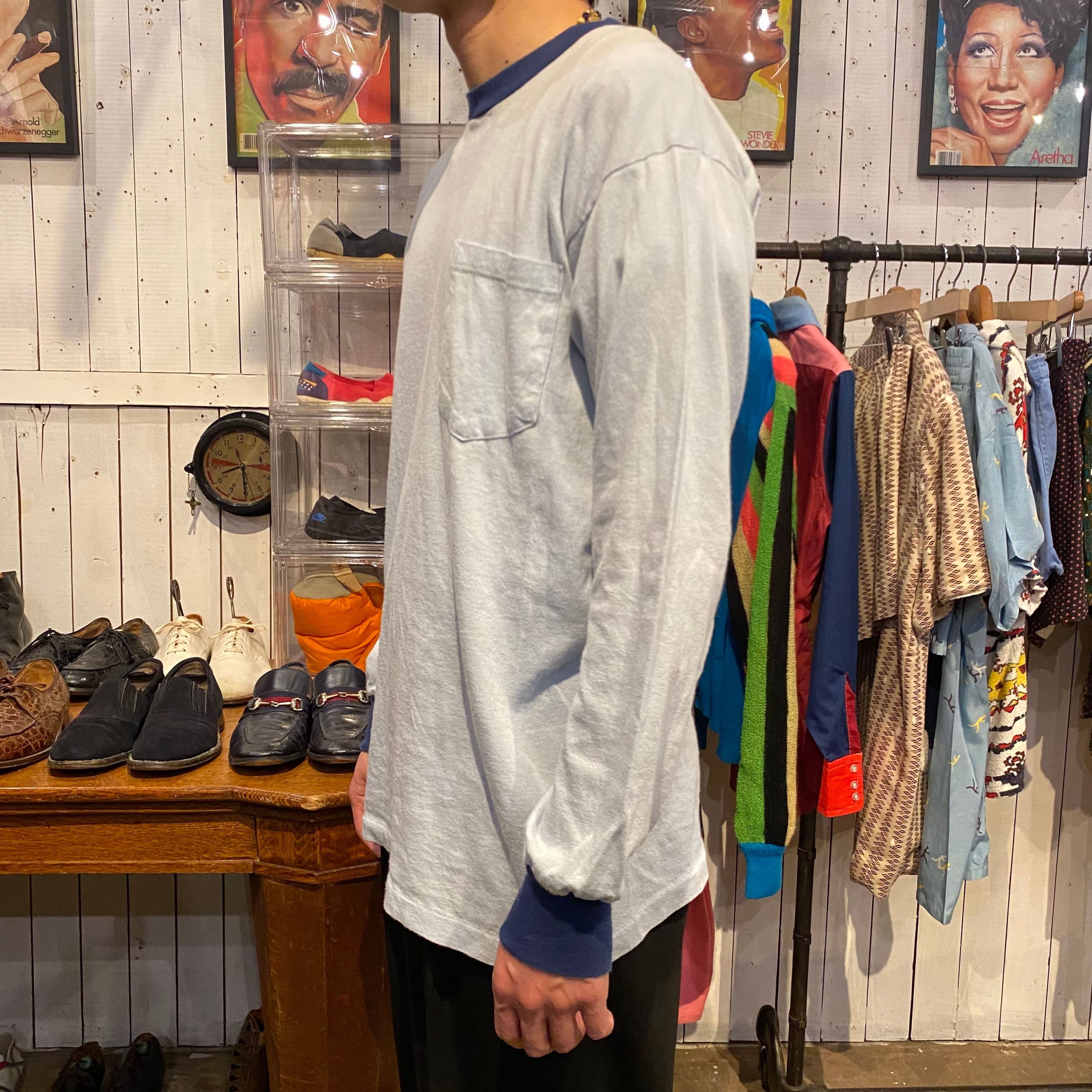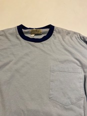 ポケット付きのトリムTシャツです。ボディは水色で、リブはネイビーです。