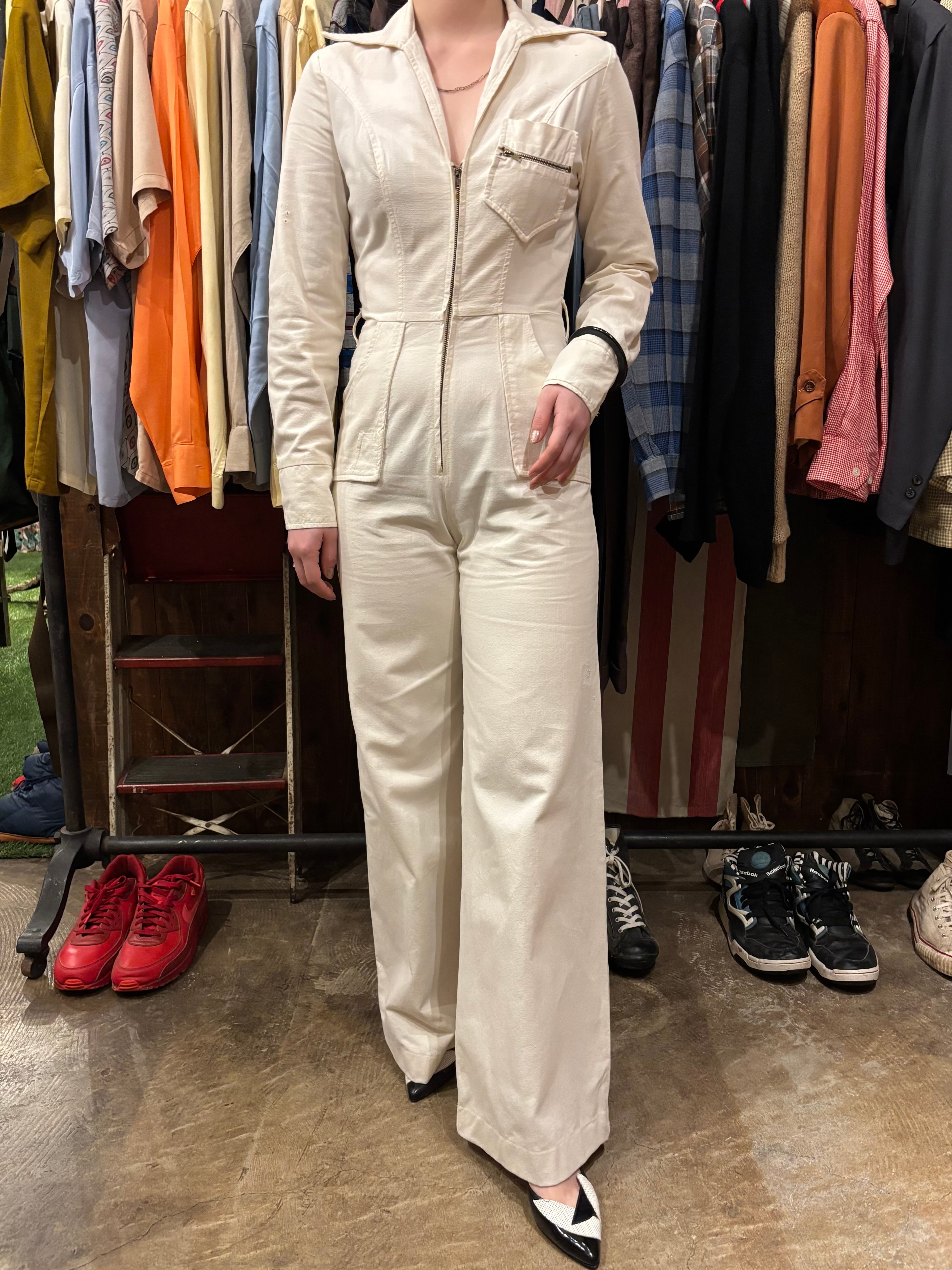 柔らかなアイボリーカラーが洗練された印象を与える、ヴィンテージジャンプスーツ。