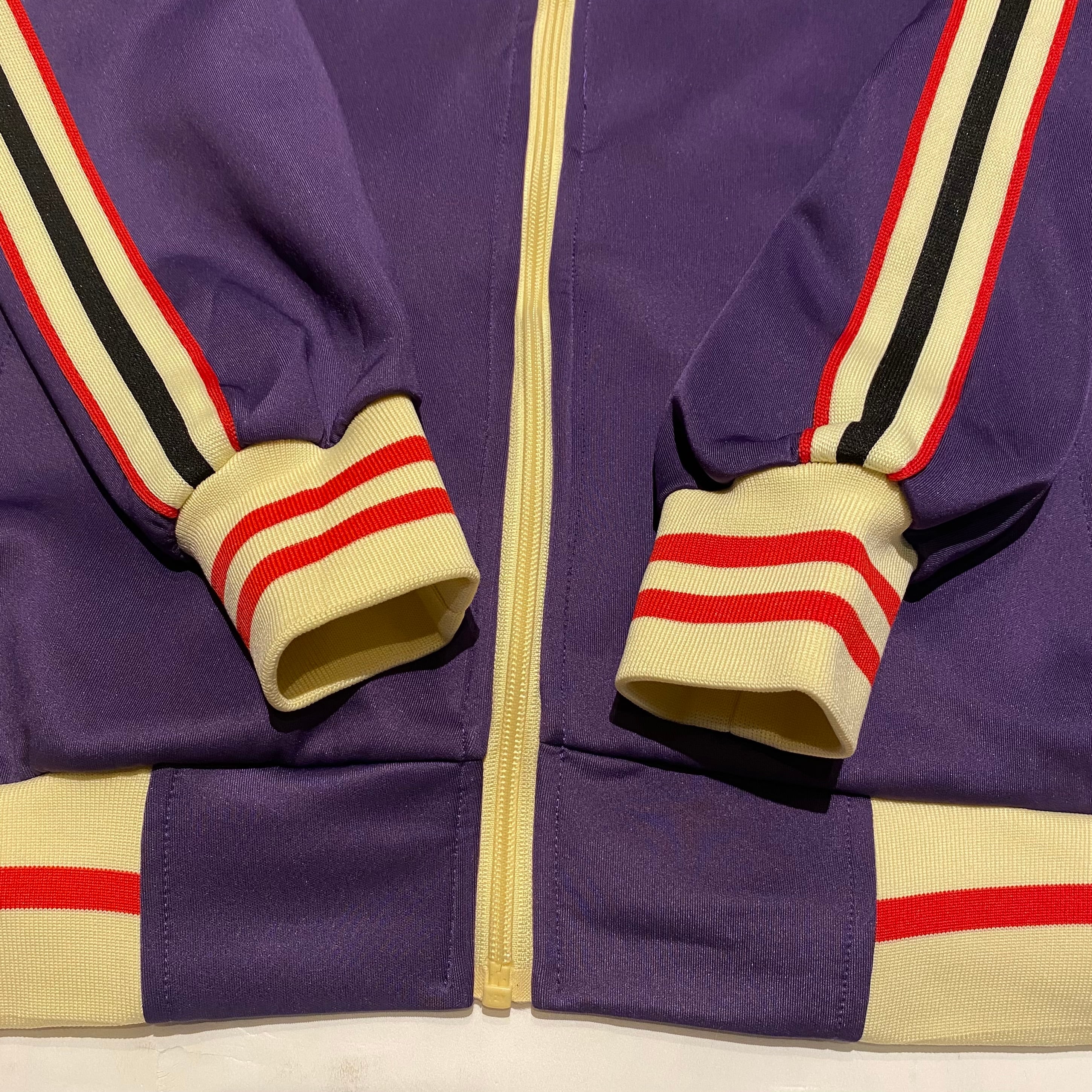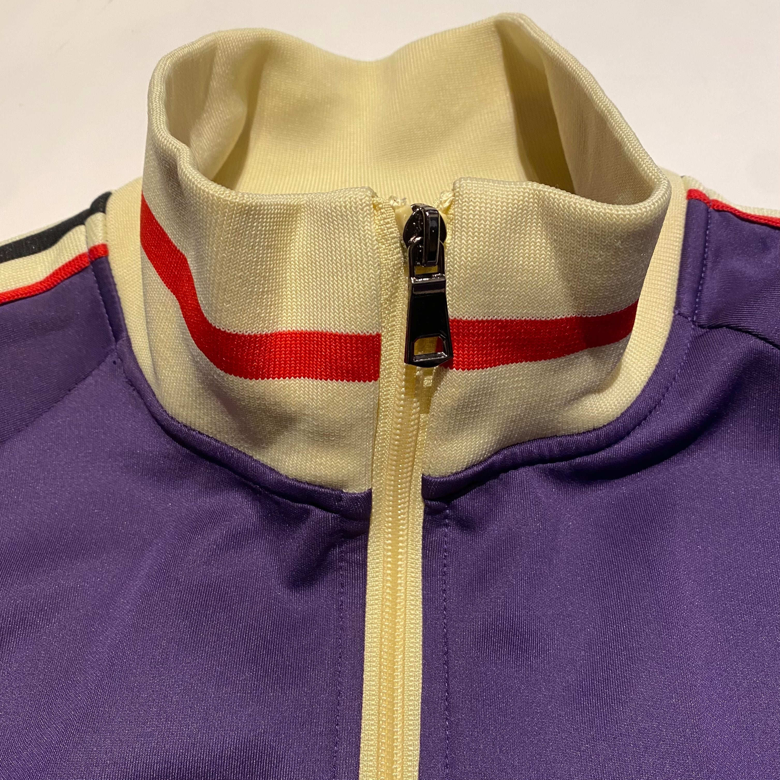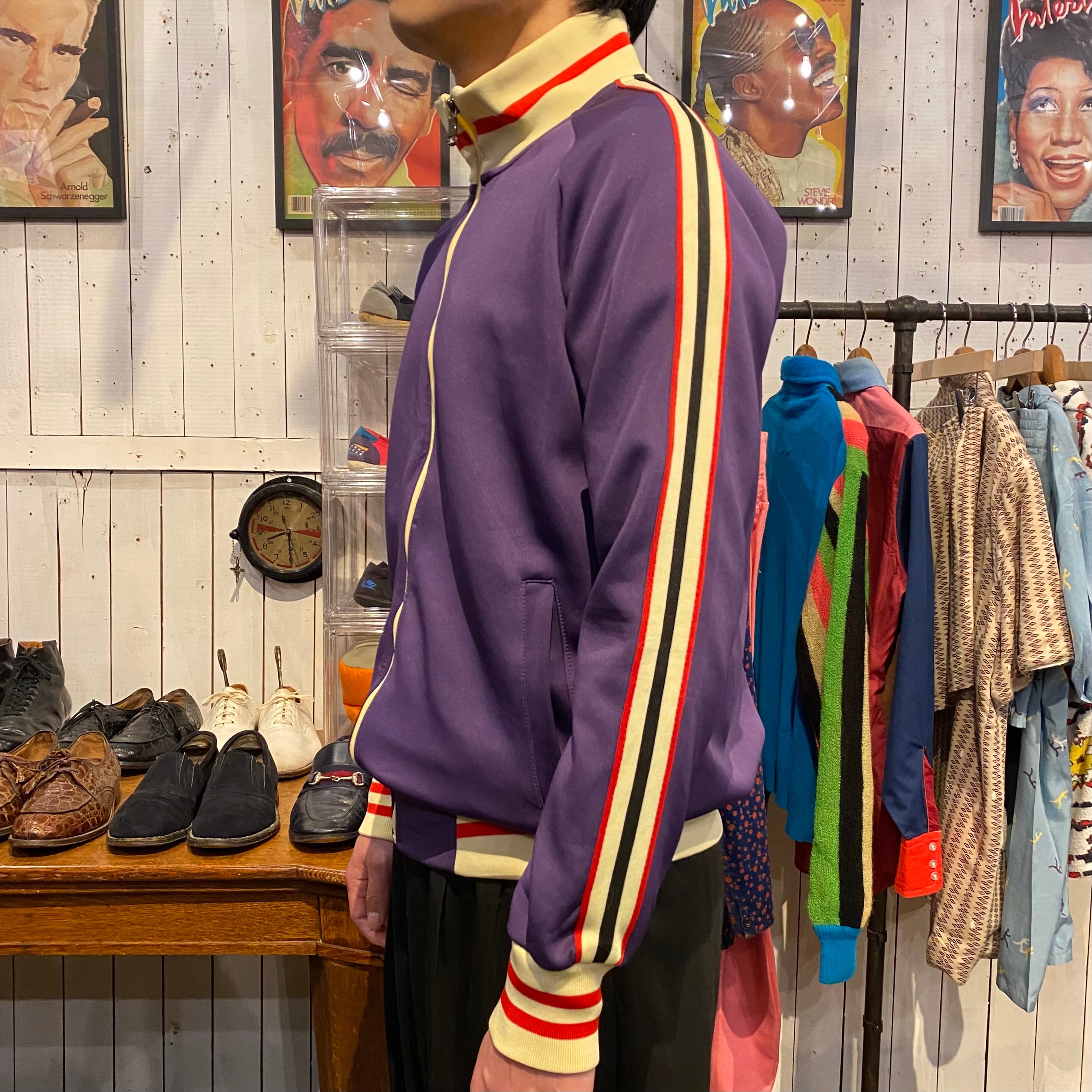 パープルをベースに肩から袖にラインの入るトラックジャケットになります。ジャージー素材。見える部分にマークやロゴがいっさい入らないシンプルなデザインで配色がとても良いです。人と被らないジャージーをお探しの方におすすめです。使用感の少ない綺麗なコンディションになります。
