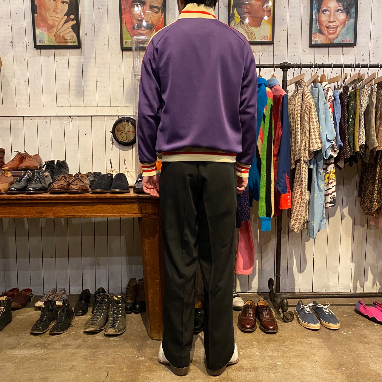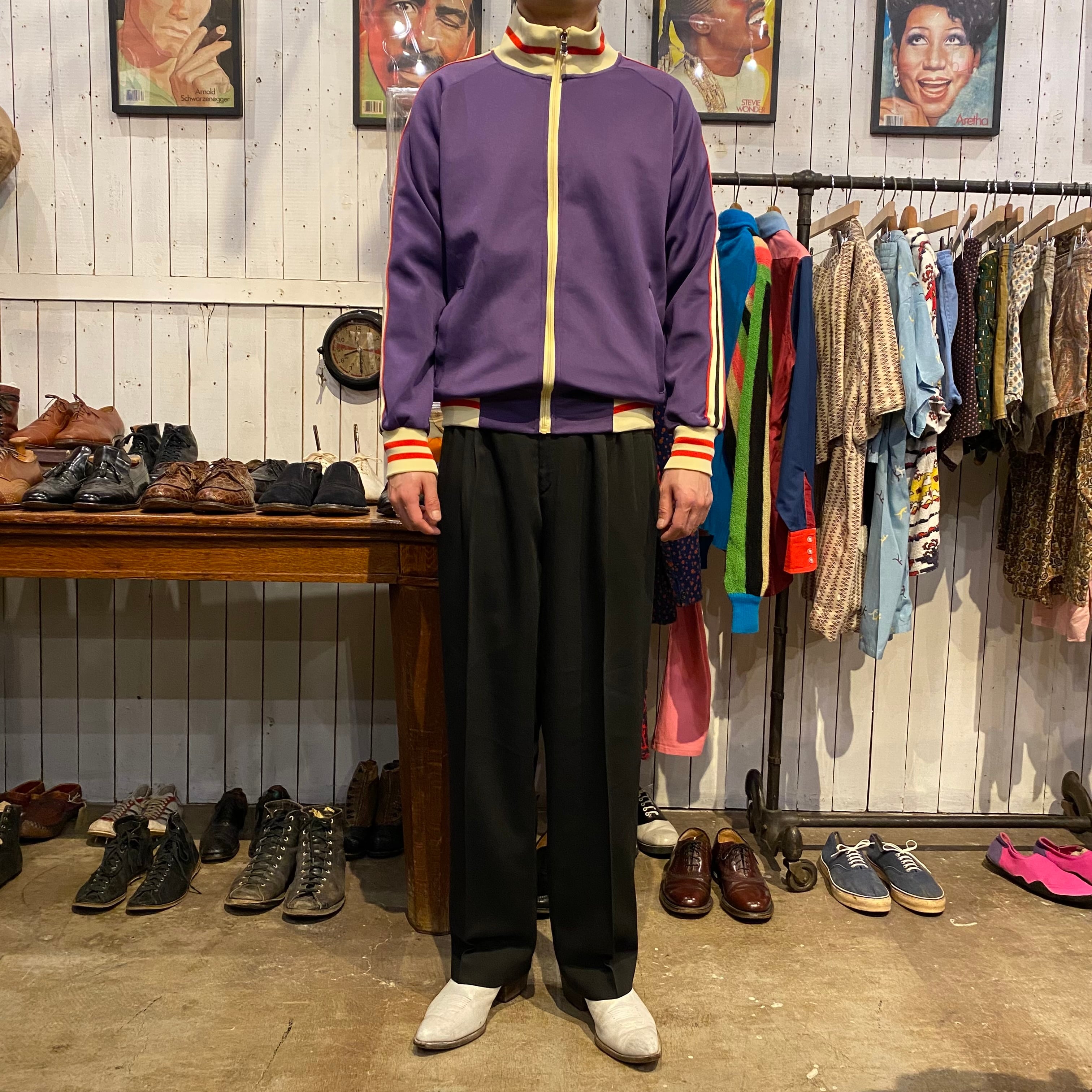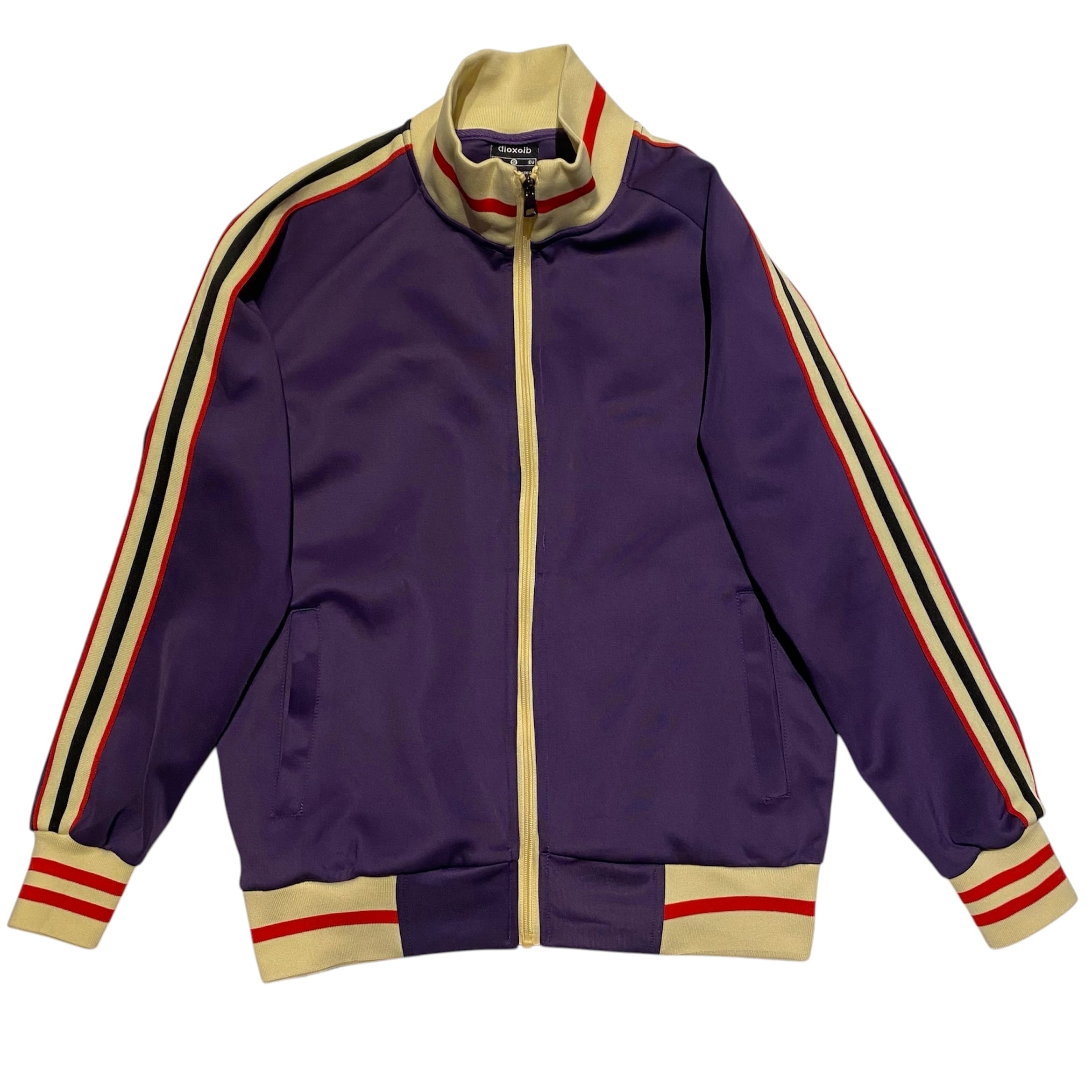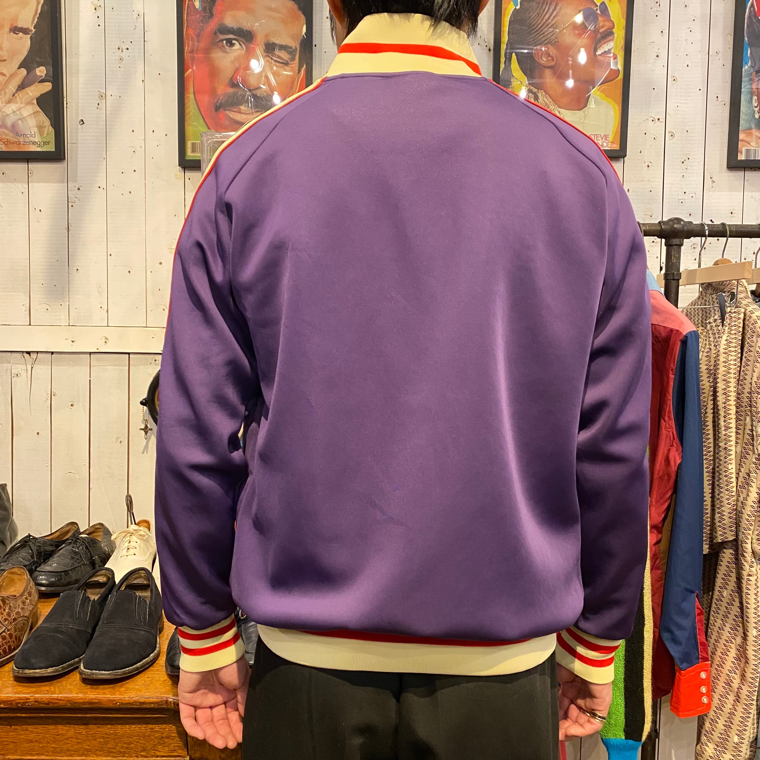 パープルをベースに肩から袖にラインの入るトラックジャケットになります。ジャージー素材。見える部分にマークやロゴがいっさい入らないシンプルなデザインで配色がとても良いです。人と被らないジャージーをお探しの方におすすめです。使用感の少ない綺麗なコンディションになります。