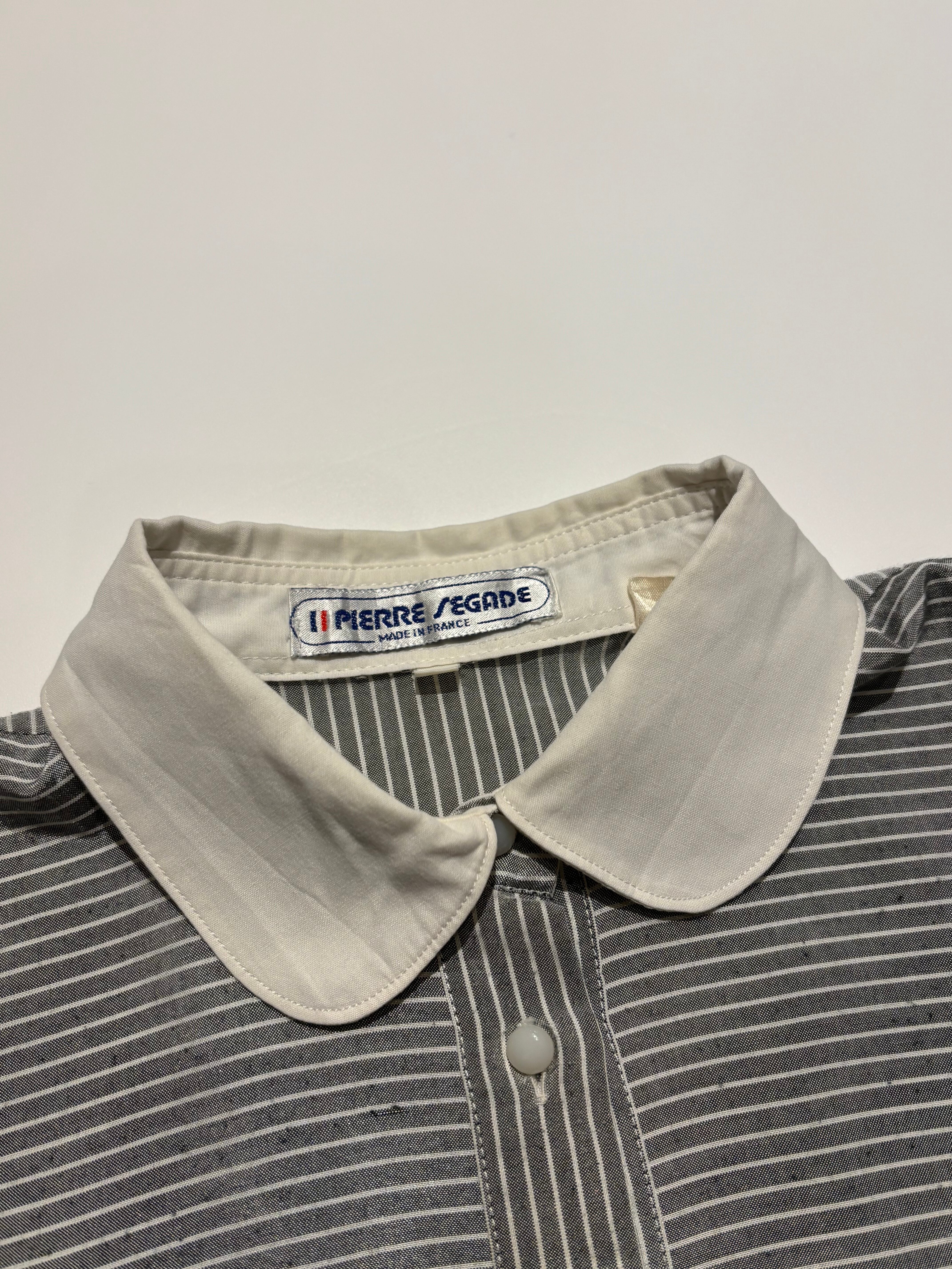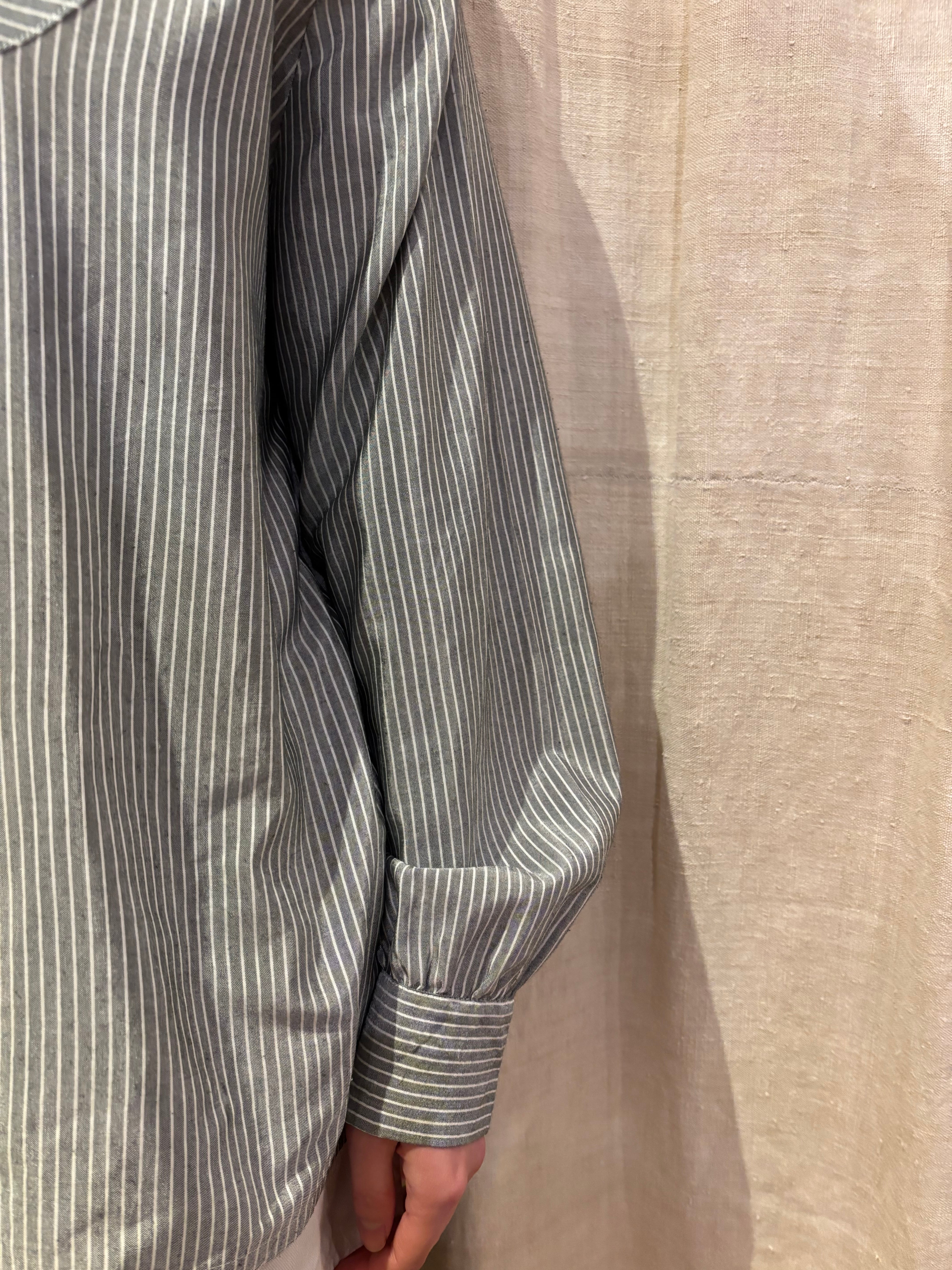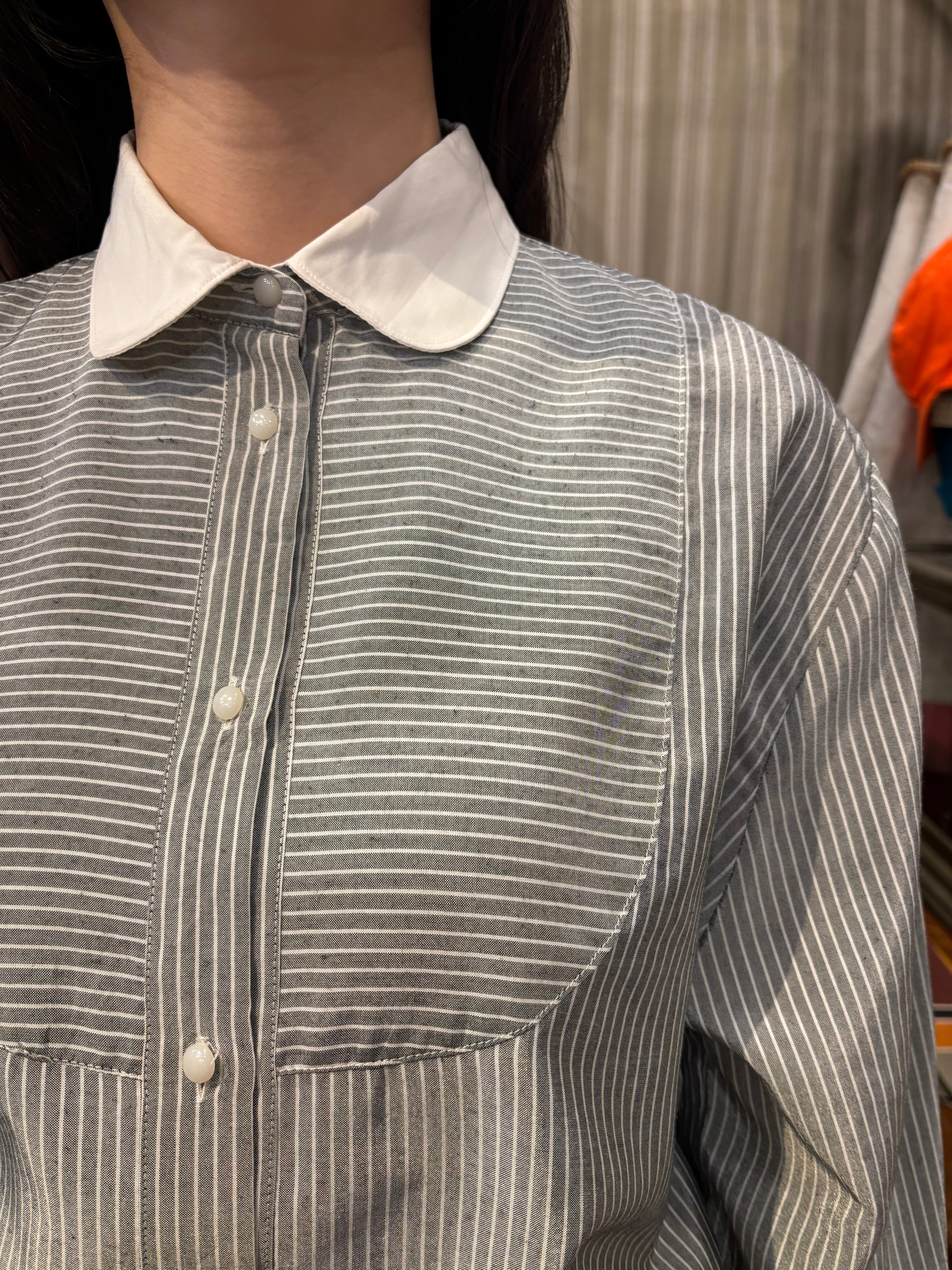 ホワイトとグレーのシャツです。シルクっぽい生地感で光沢感があります。フロントに切り替えがあり、ドレスシャツのような雰囲気ですが、ゆとりのあるサイズ感に丸襟でカチッとしすぎず、ボタンもコロっとしていて可愛らしさもあります。フェミニンなスカートと合わせても素敵です。