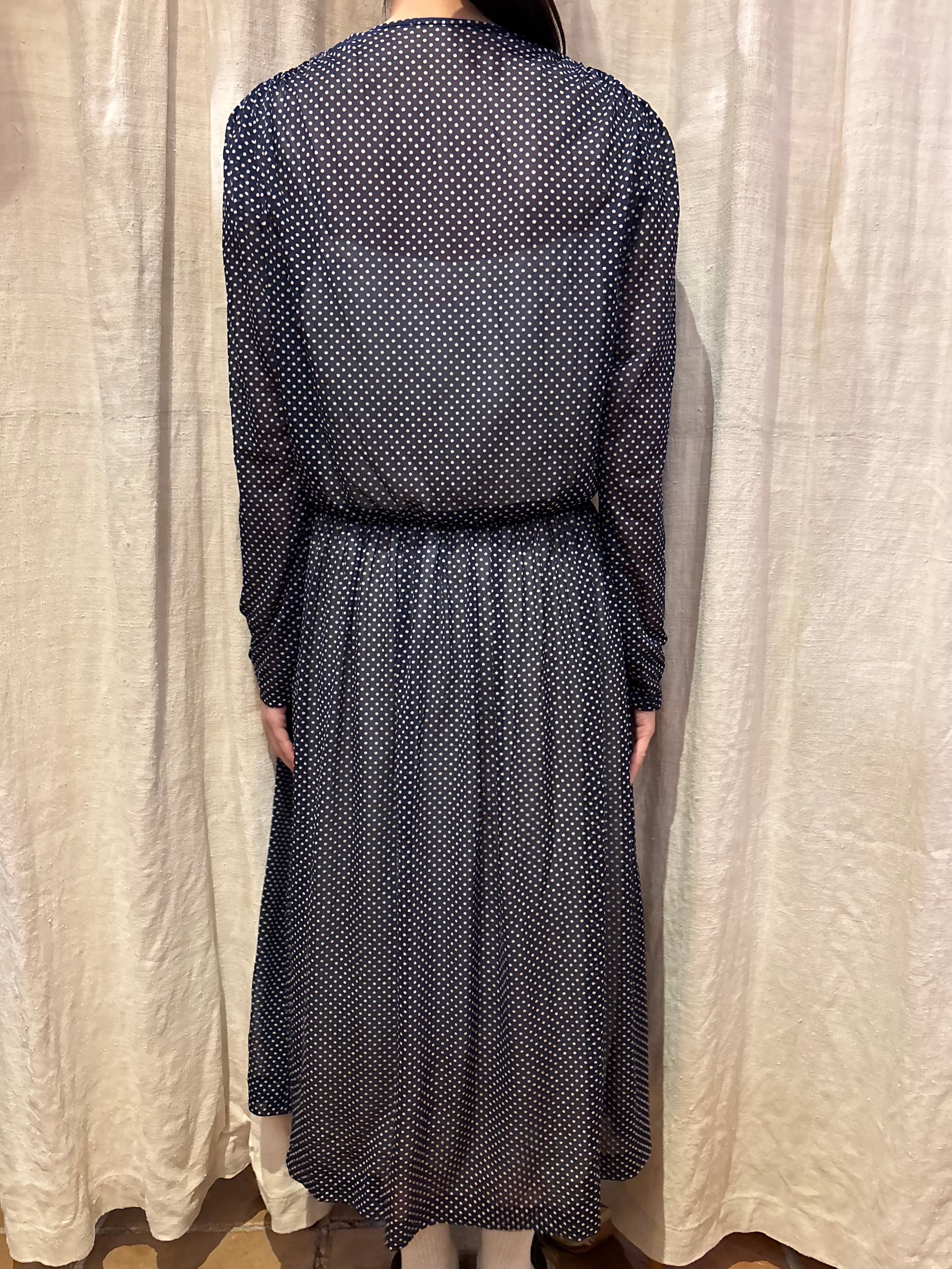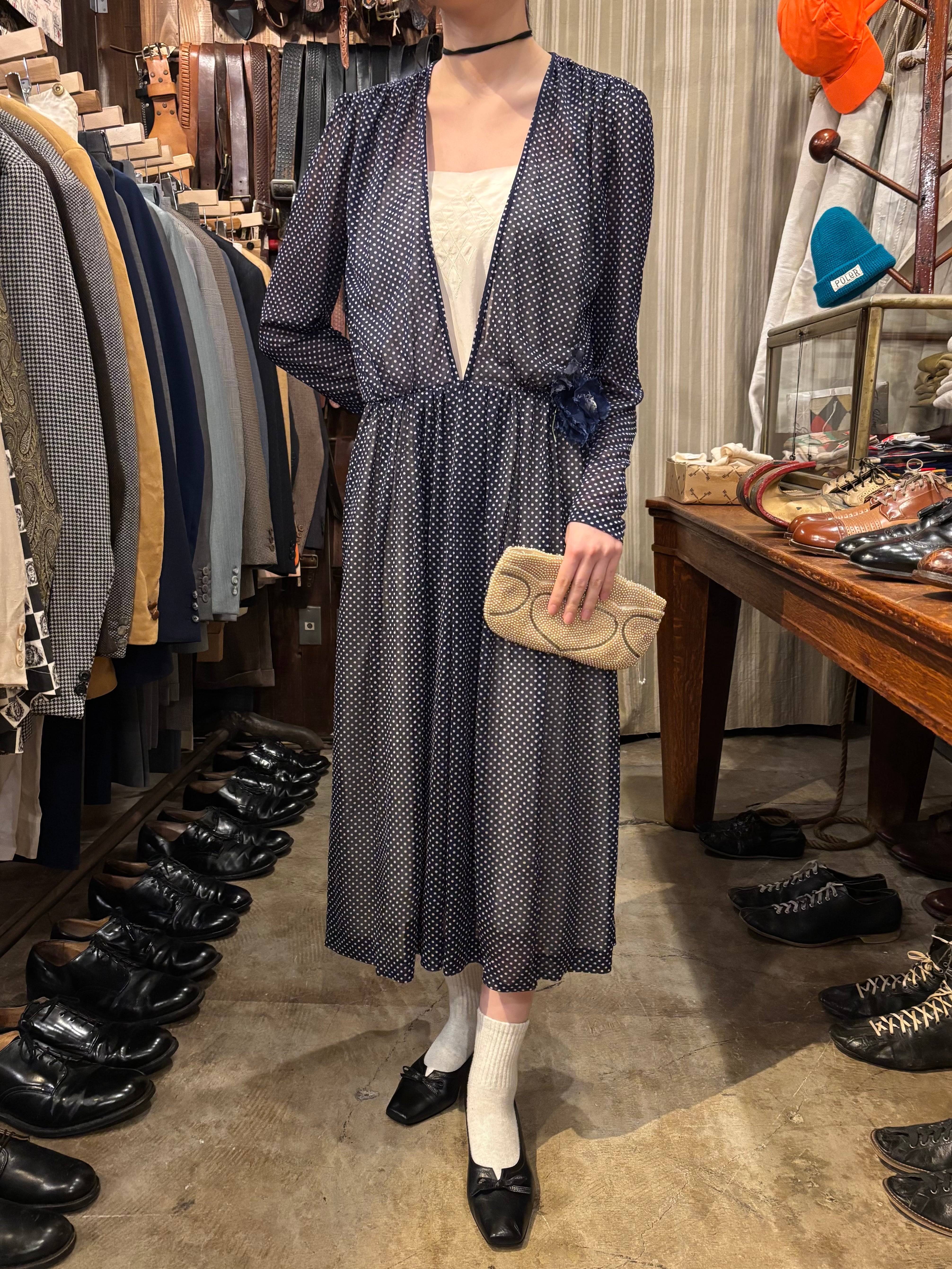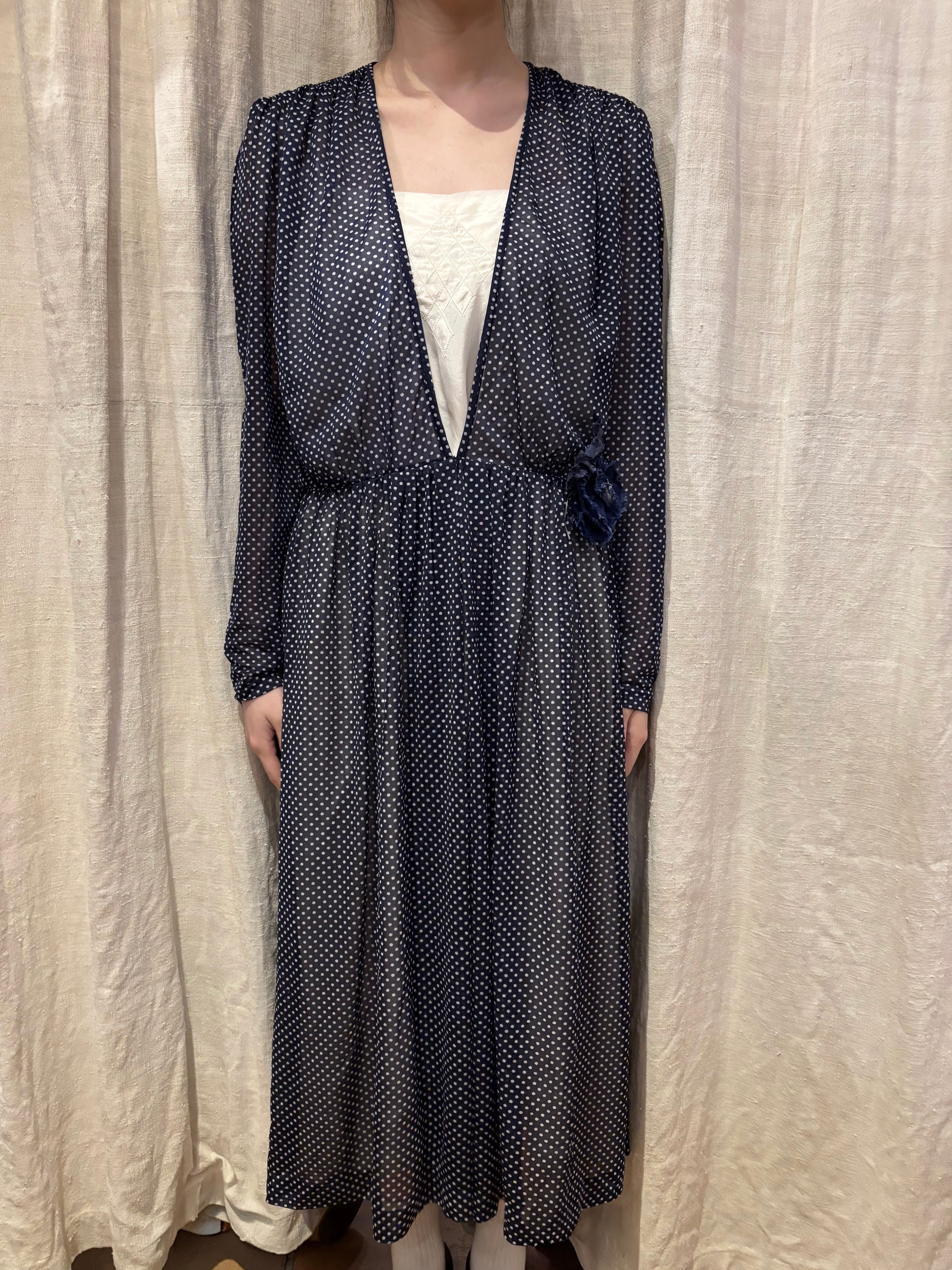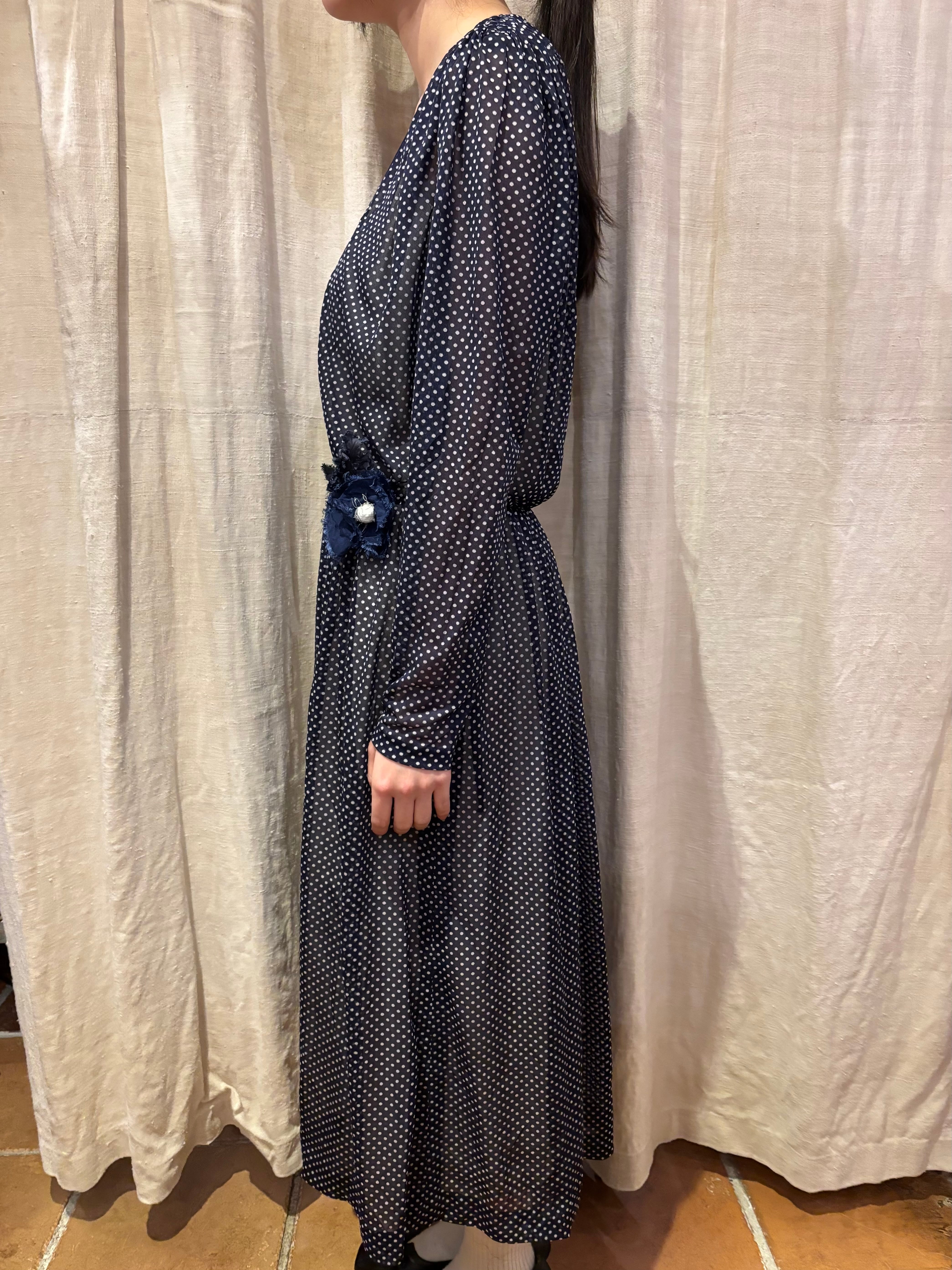 細かいドット柄が可愛いワンピースです。シフォン生地で軽い着心地。真夏でも活躍しそうです。透け感があるので着用画像のようにスリップワンピースを忍ばせてもいいですし、パンツなどをレイヤードしても素敵です。落ち感のある生地なのでゆとりを持たせながらも身体に程良くフィットし、女性らしく綺麗なシルエットです。ウエスト部分には取り外し可能なコサージュが付いております。