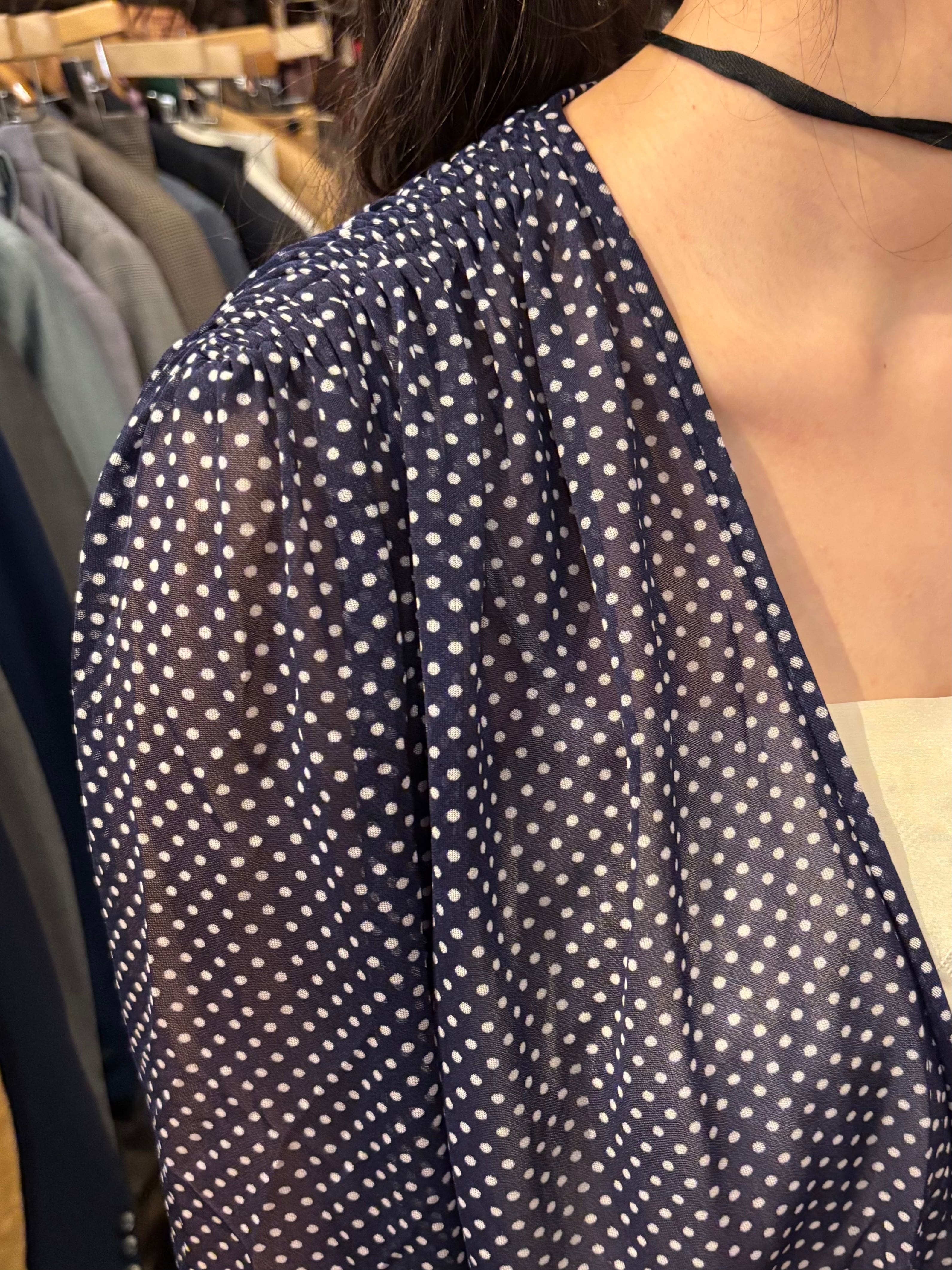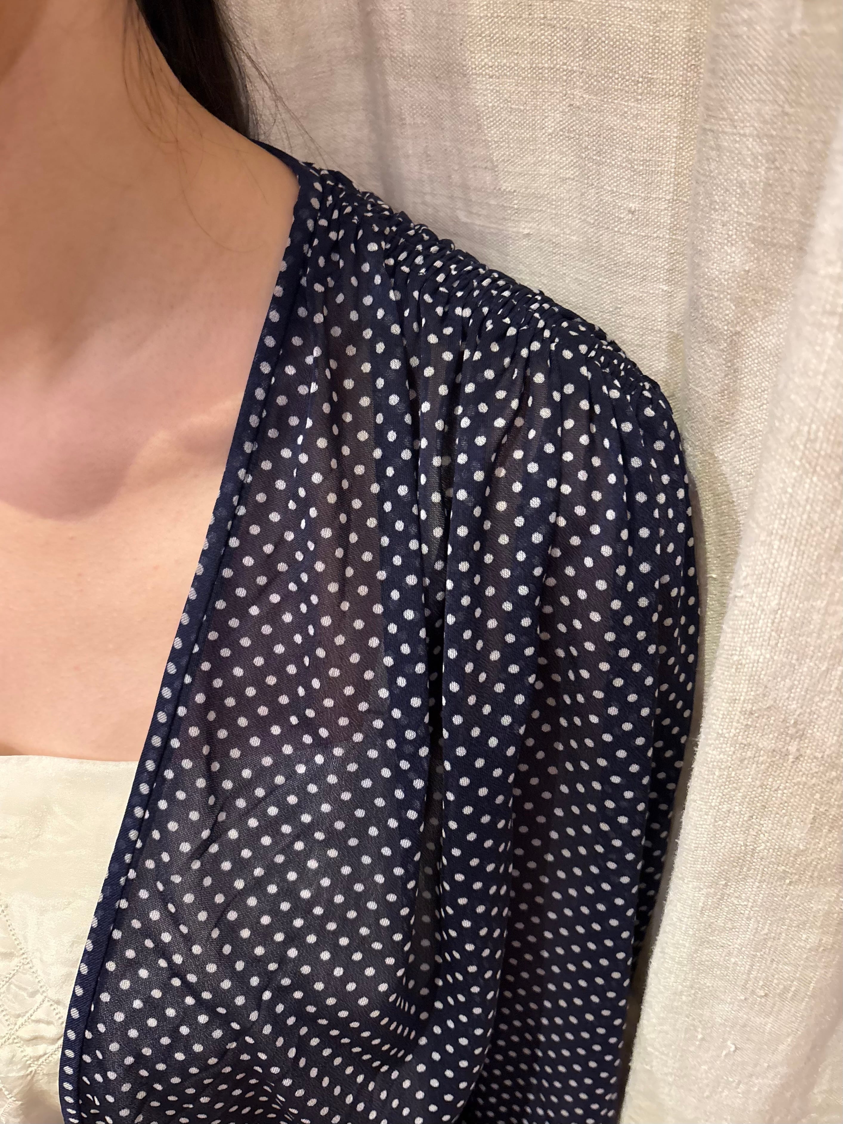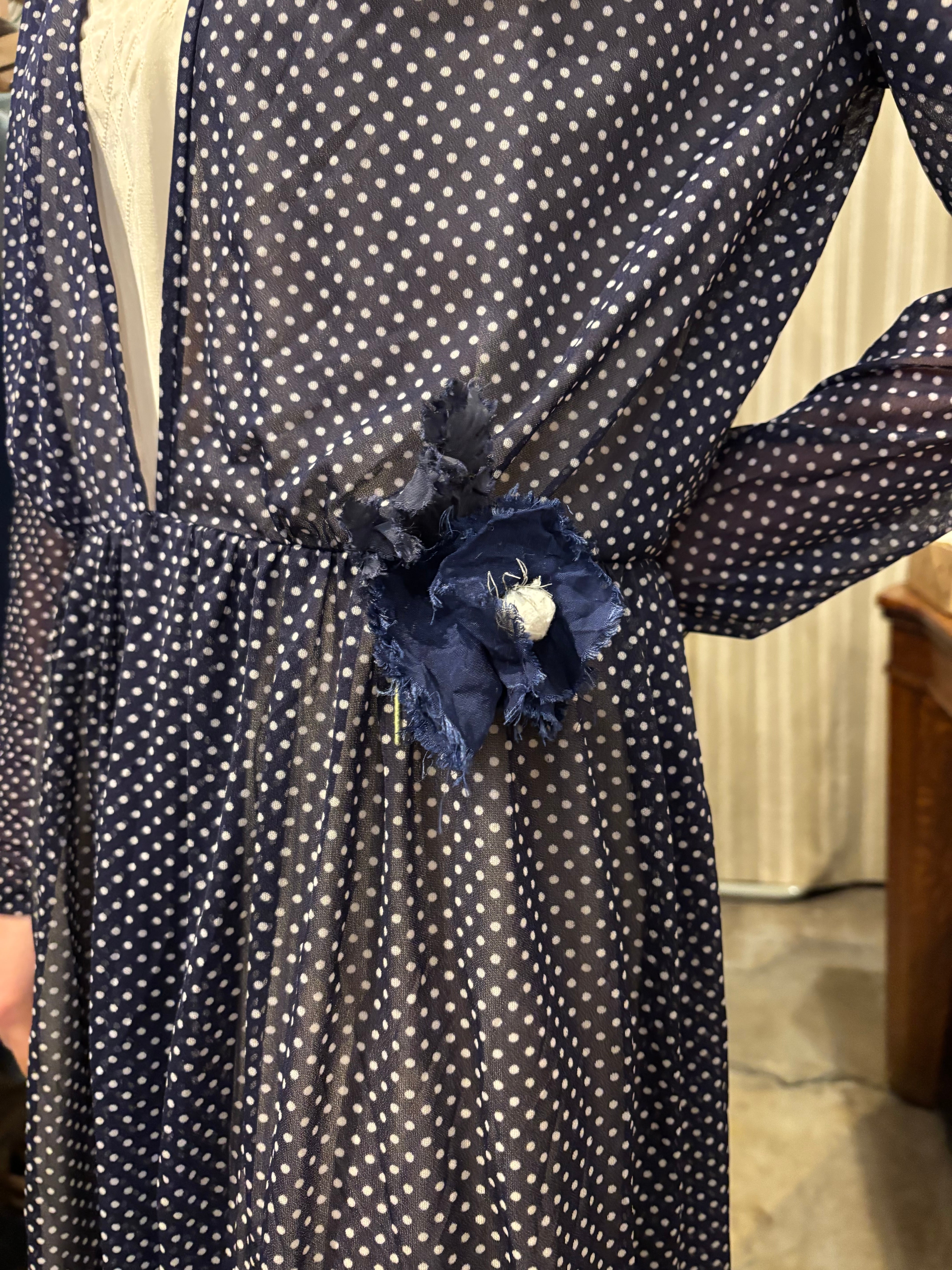細かいドット柄が可愛いワンピースです。シフォン生地で軽い着心地。真夏でも活躍しそうです。透け感があるので着用画像のようにスリップワンピースを忍ばせてもいいですし、パンツなどをレイヤードしても素敵です。落ち感のある生地なのでゆとりを持たせながらも身体に程良くフィットし、女性らしく綺麗なシルエットです。ウエスト部分には取り外し可能なコサージュが付いております。