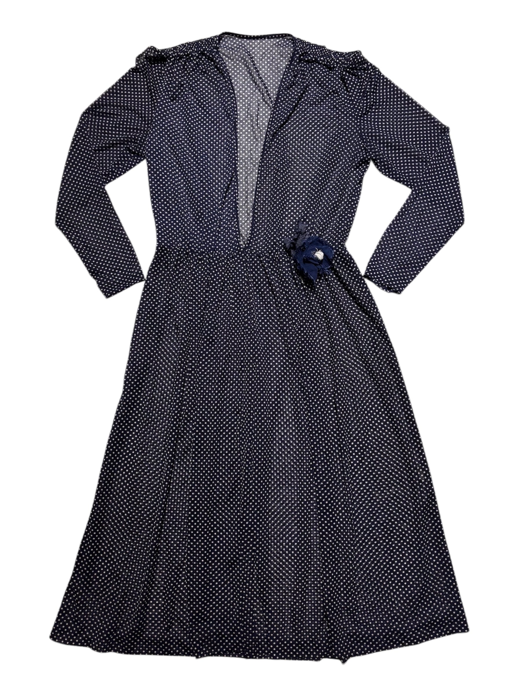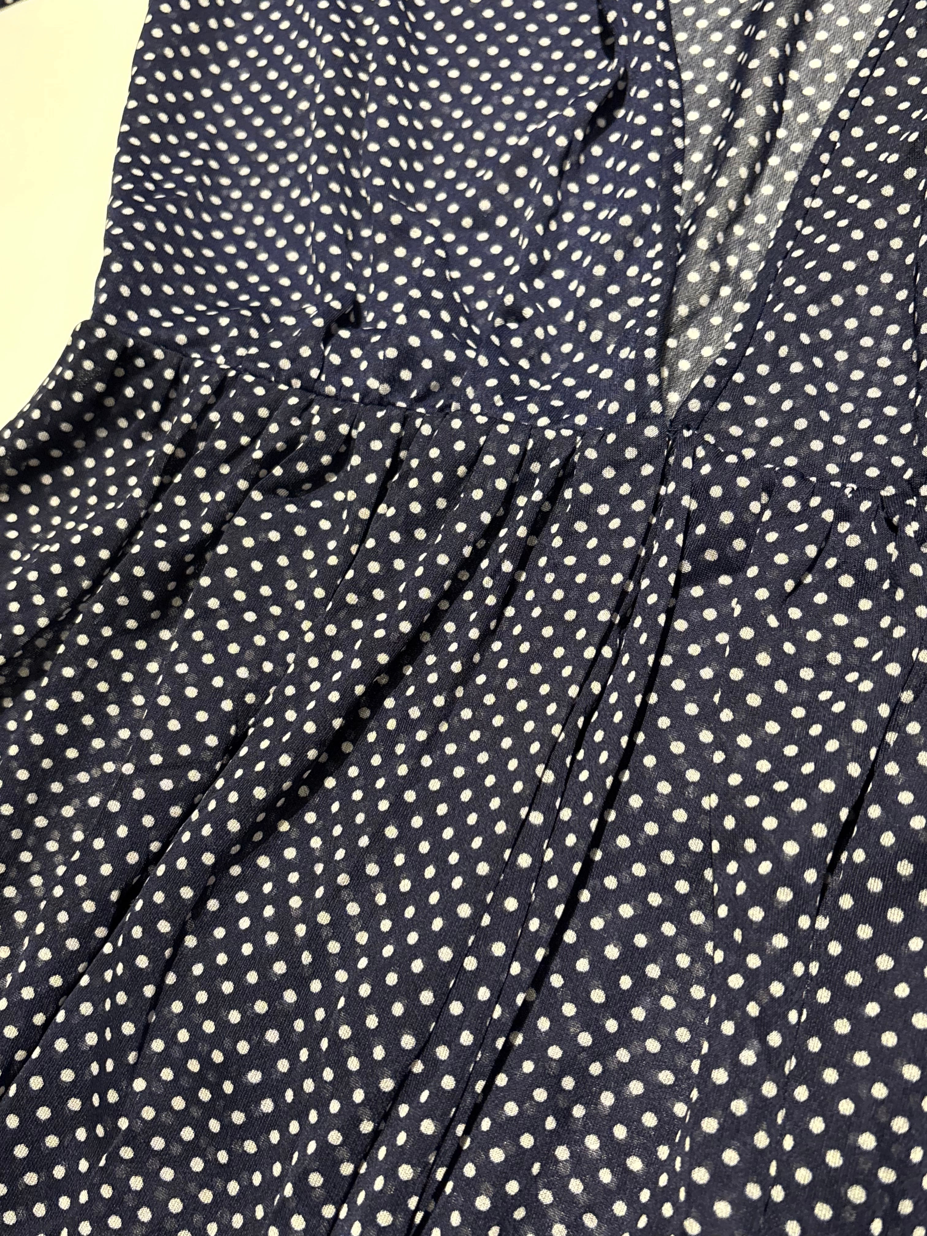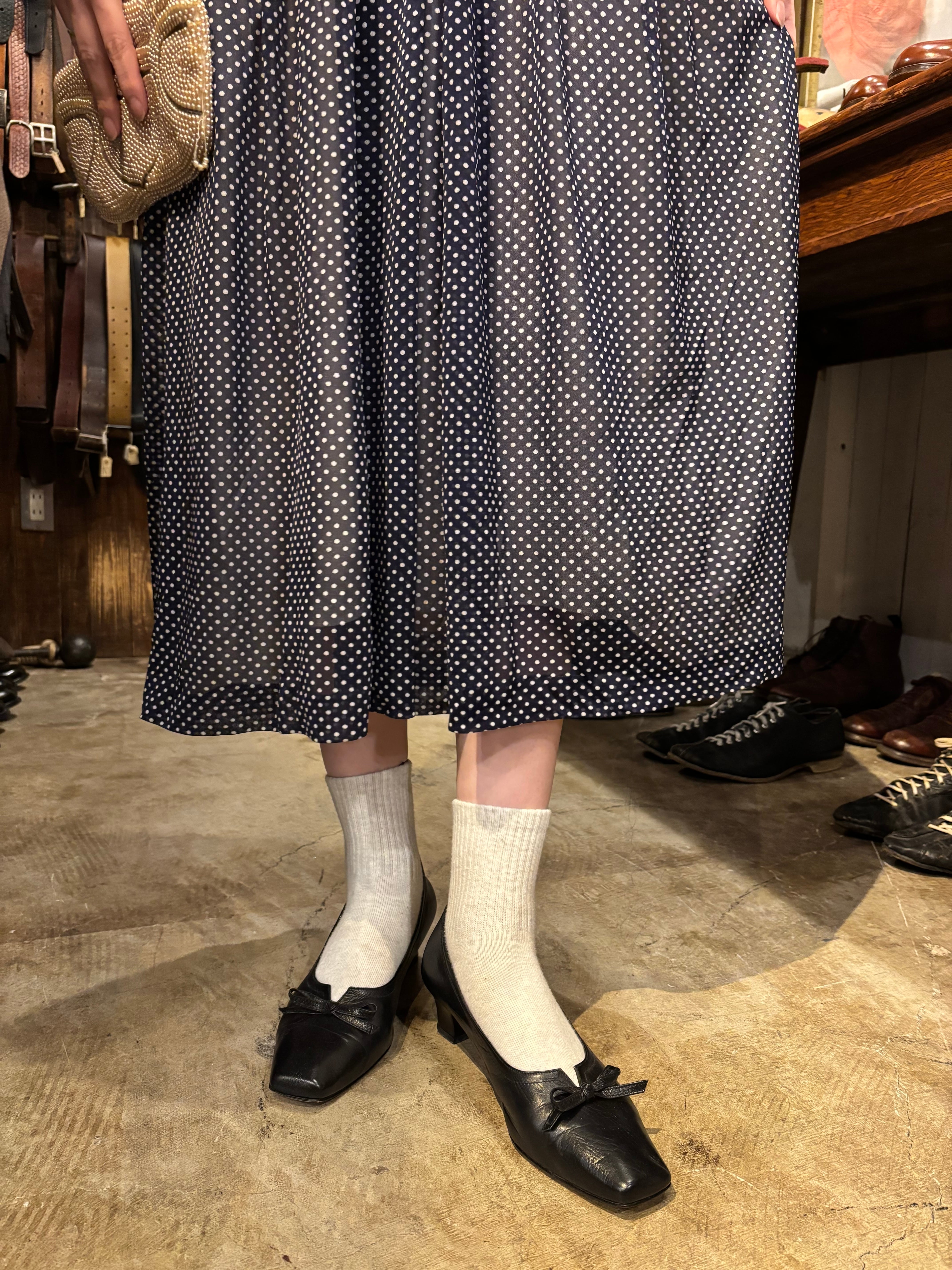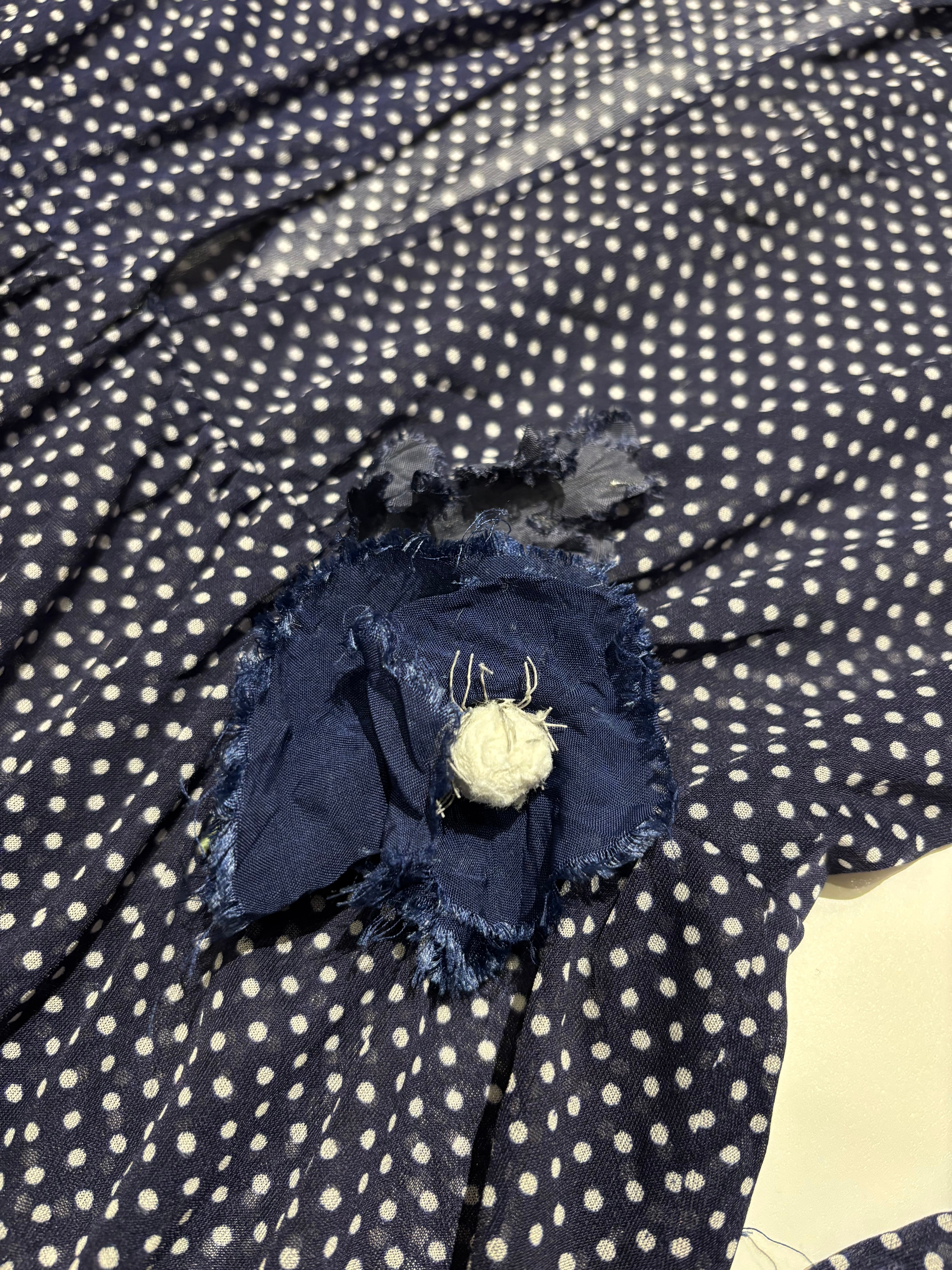 細かいドット柄が可愛いワンピースです。シフォン生地で軽い着心地。真夏でも活躍しそうです。透け感があるので着用画像のようにスリップワンピースを忍ばせてもいいですし、パンツなどをレイヤードしても素敵です。落ち感のある生地なのでゆとりを持たせながらも身体に程良くフィットし、女性らしく綺麗なシルエットです。ウエスト部分には取り外し可能なコサージュが付いております。