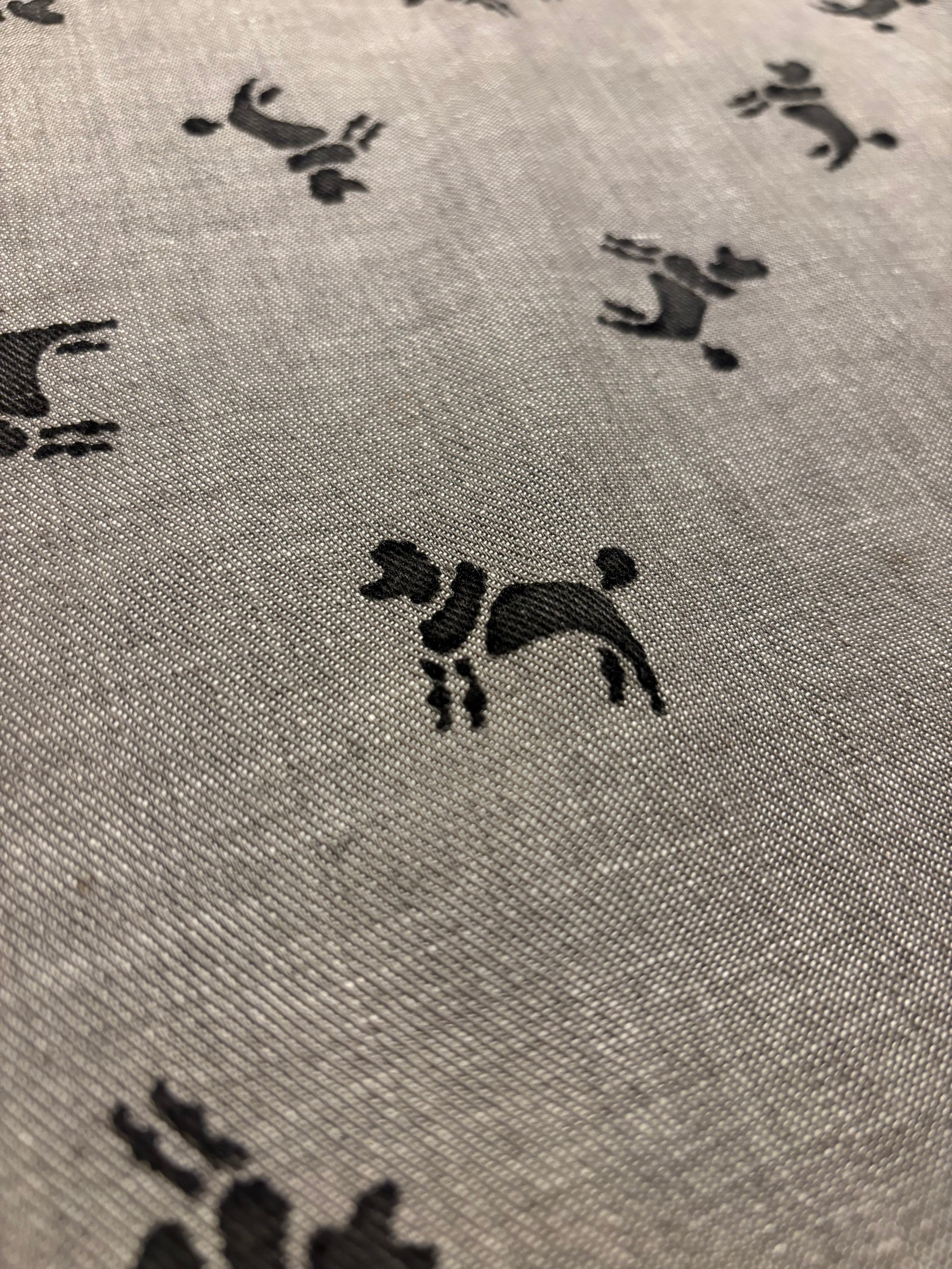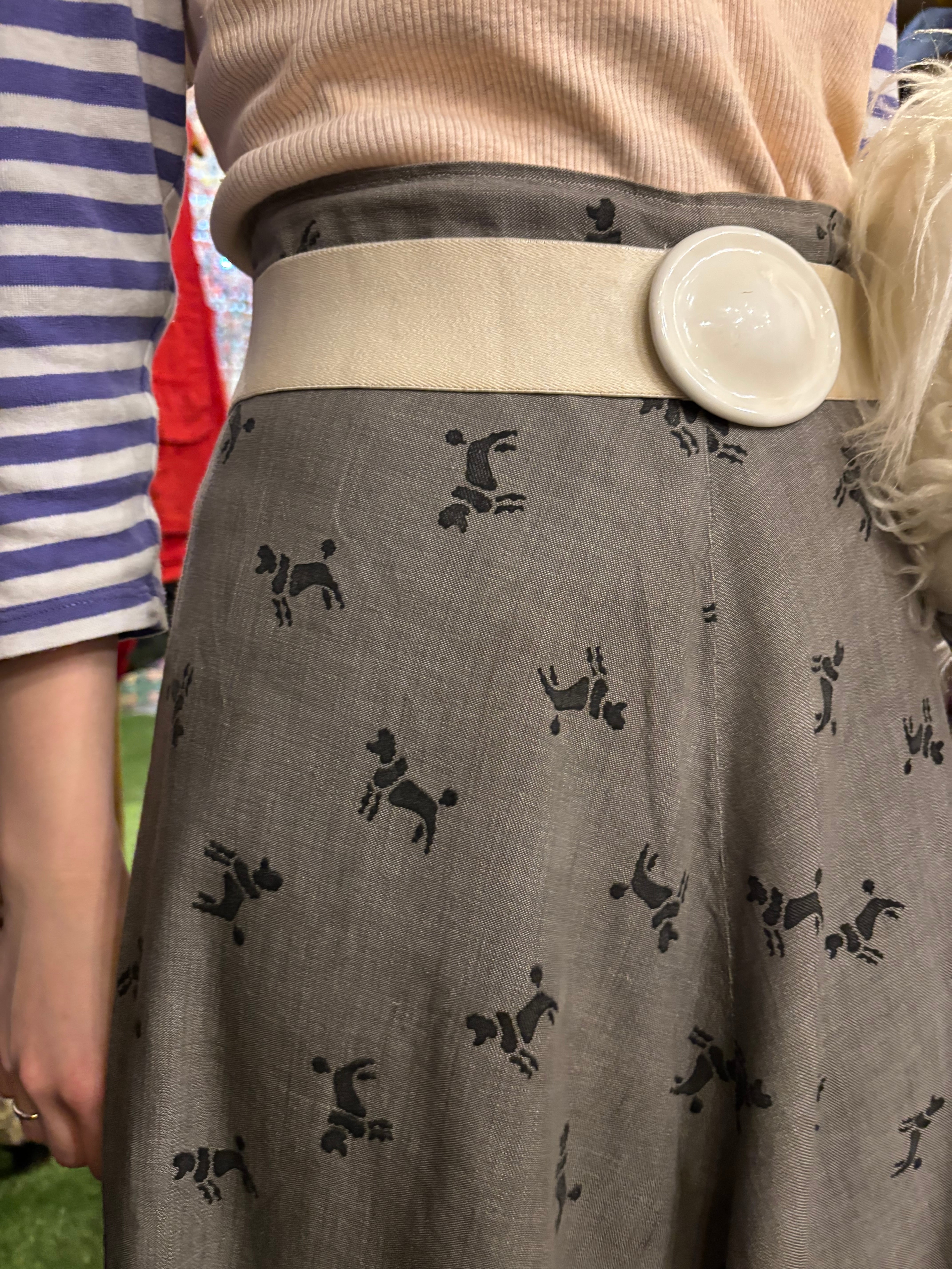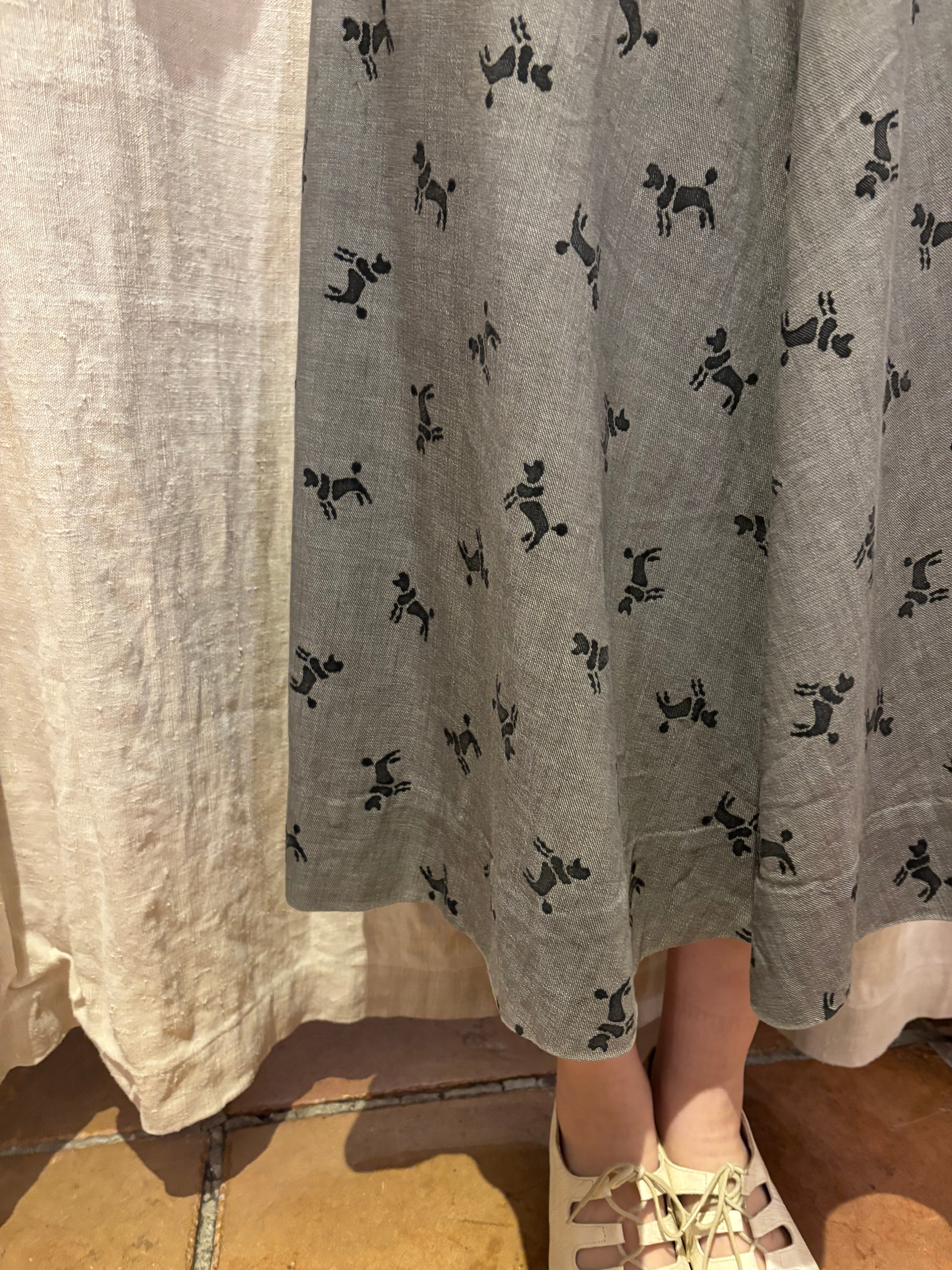 プードルのテキスタイルが可愛いスカートです。可愛らしい柄ですが、ミモレ丈の程良くフレアが効いた上品なシルエットに、モノトーンカラーなので使いやすいアイテムです。レトロな雰囲気でスタイリングを組んでも素敵ですし、春夏っぽいレースなどのブラウスなどと合わせてもとても可愛らしいです。イヌ好きさんにもオススメです♩