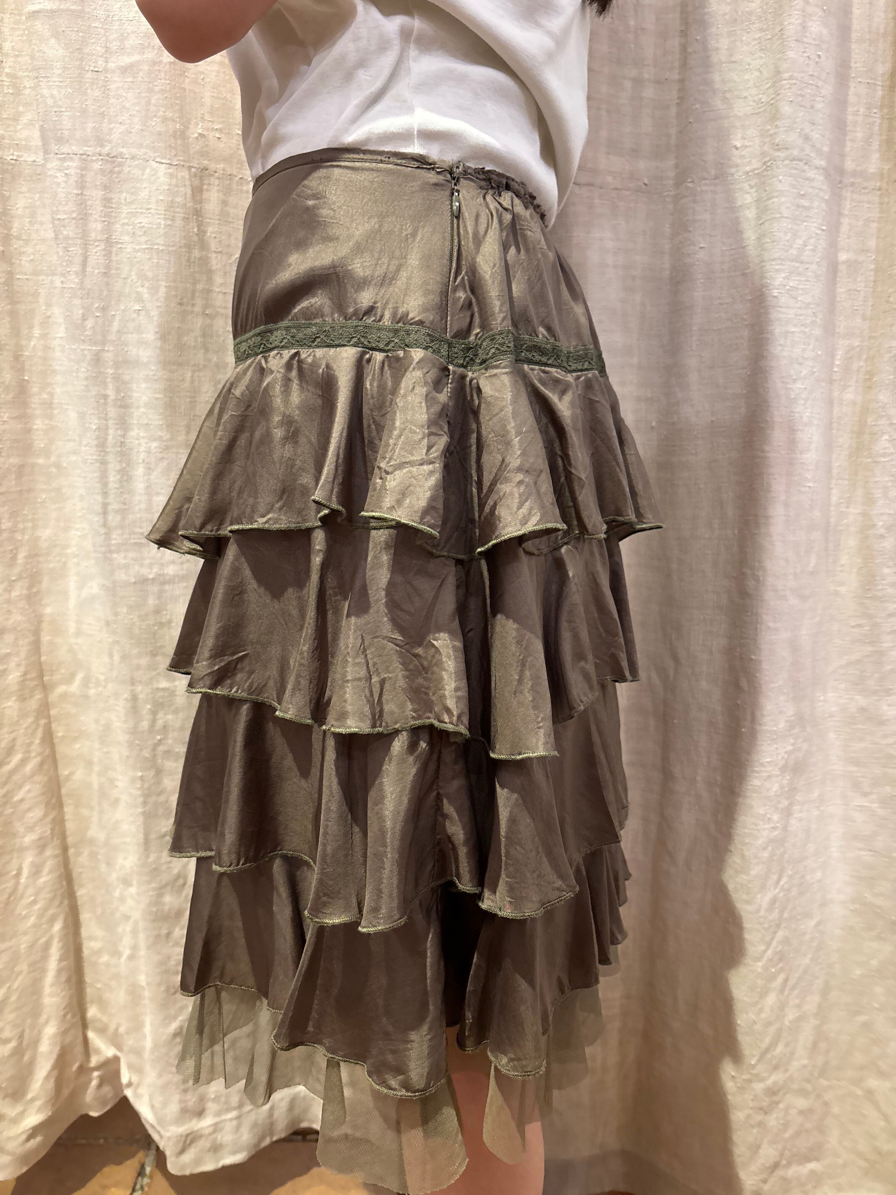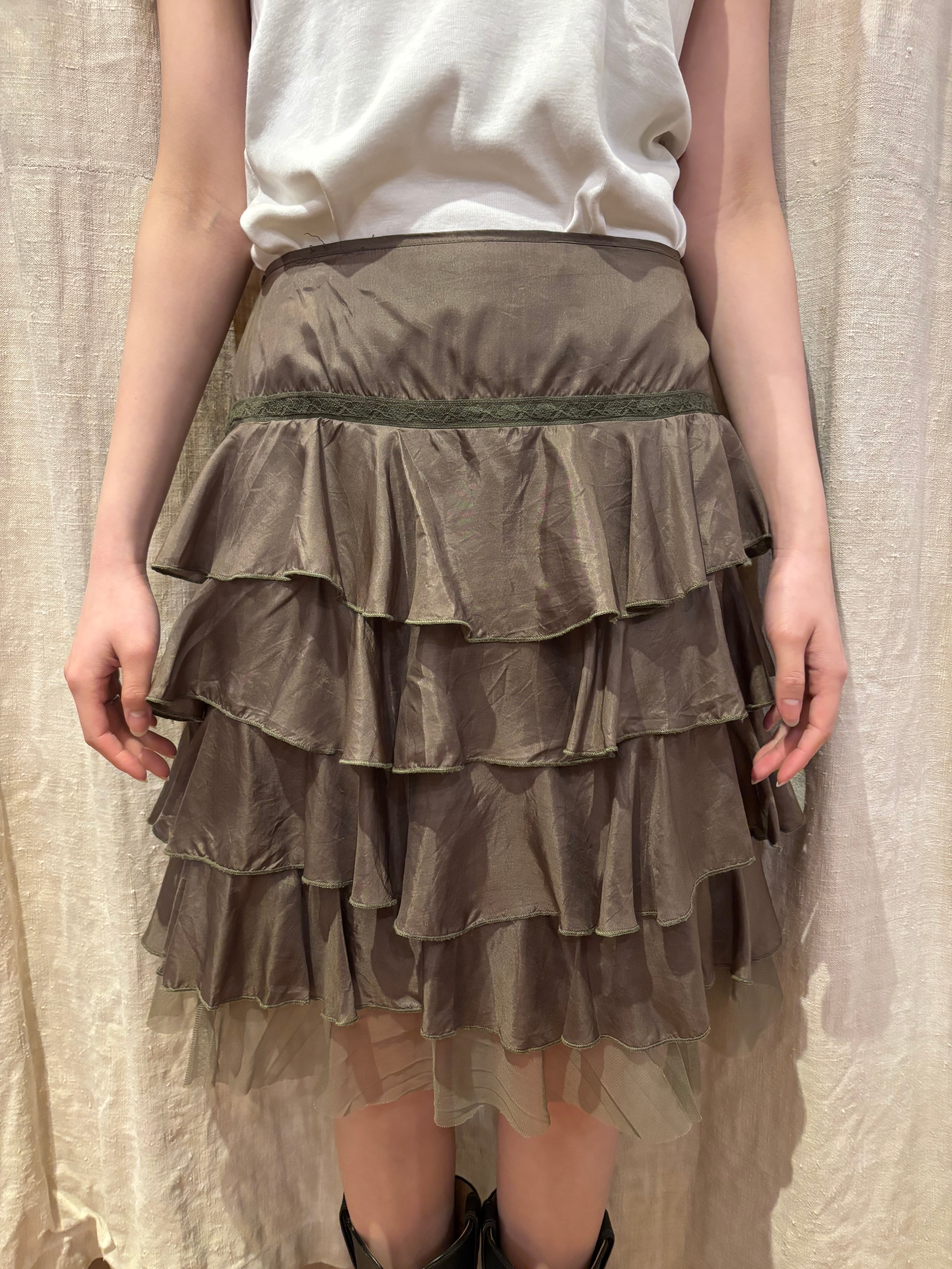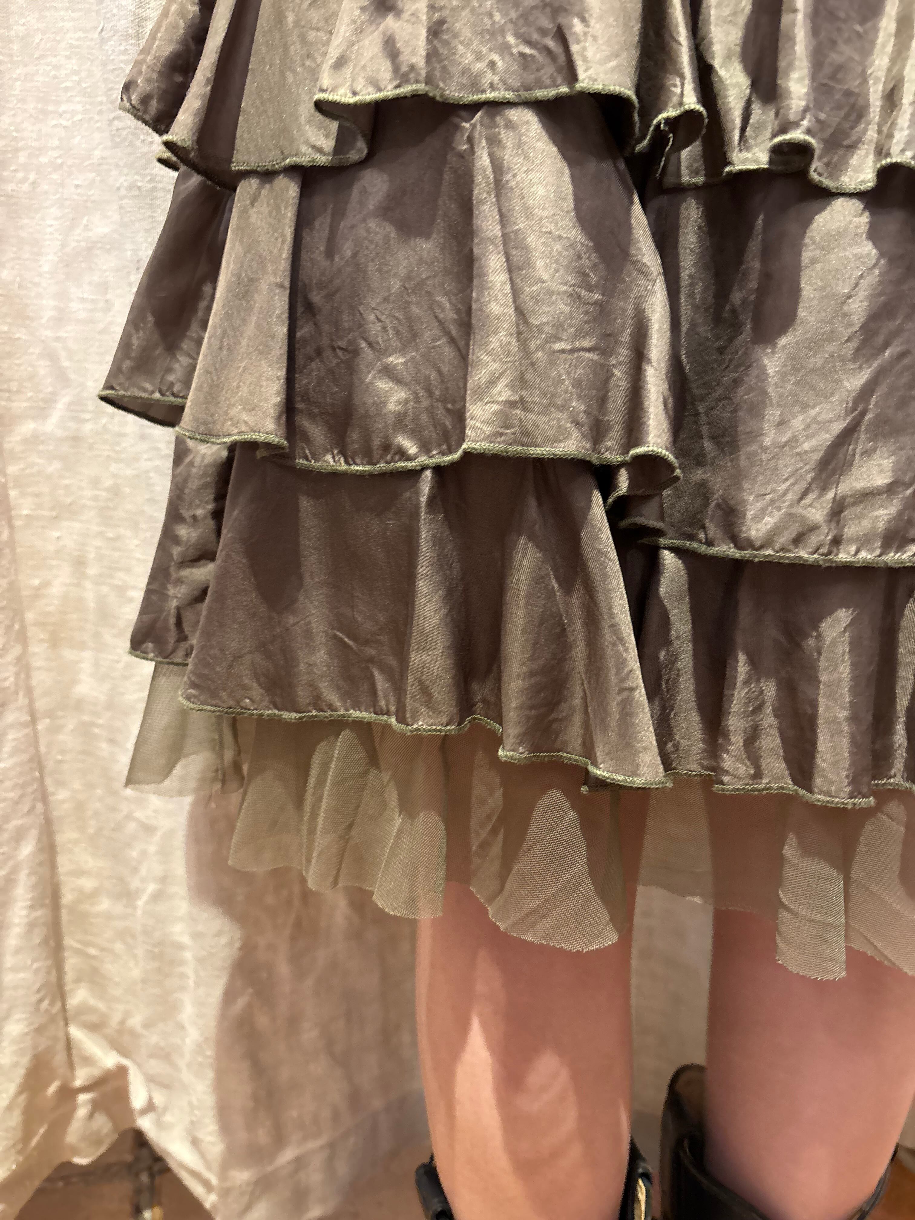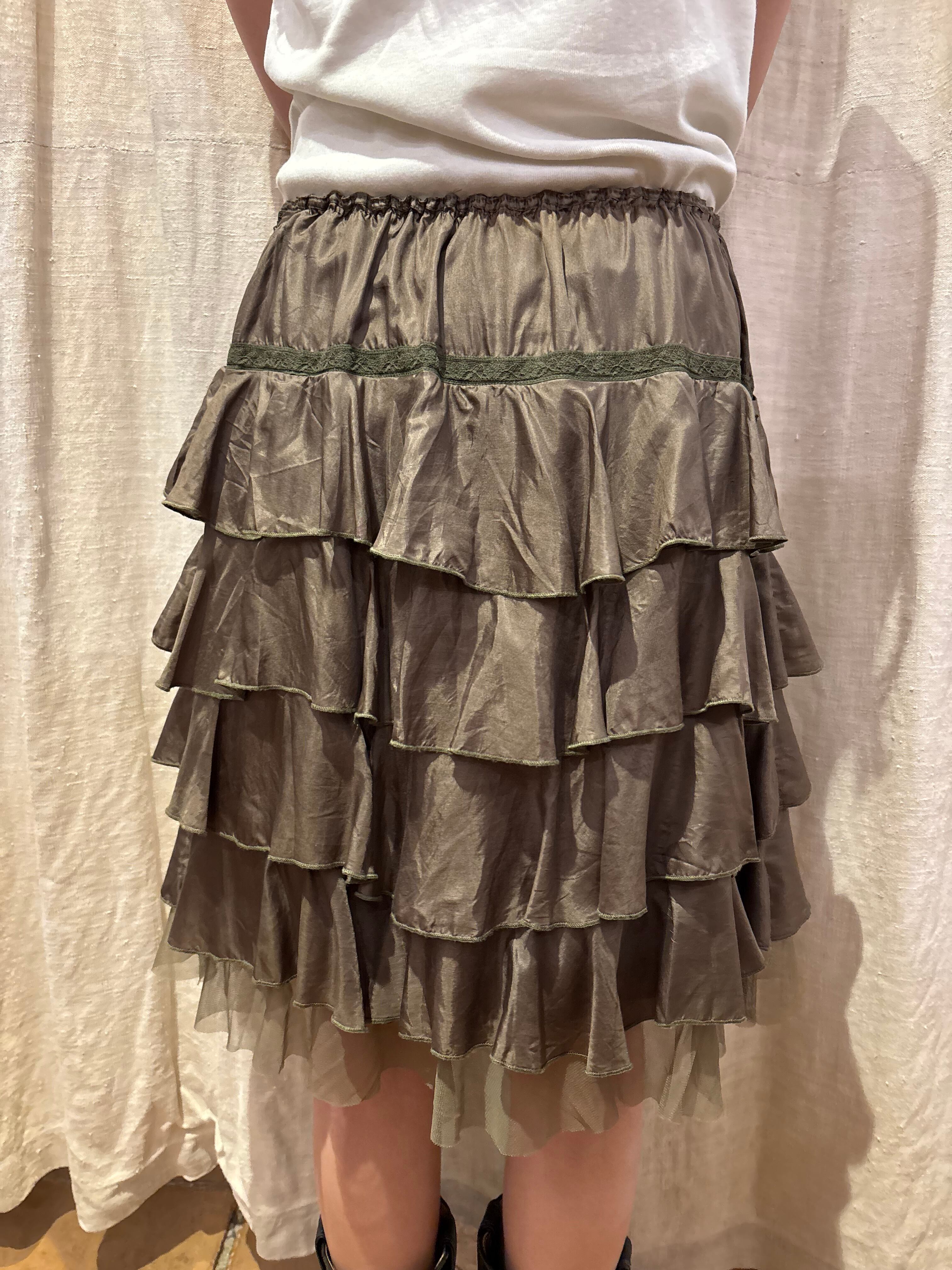 Y2Kなコーディネートにぴったりなスカートです。五段のフリルになっておりますが、シルク素材なので程よいボリューム感で使いやすく、また落ち着いた色味で光沢感も綺麗です。後ろのウエスト部分のみゴム仕様になっており、デニムなどパンツとレイヤードしても素敵です。
