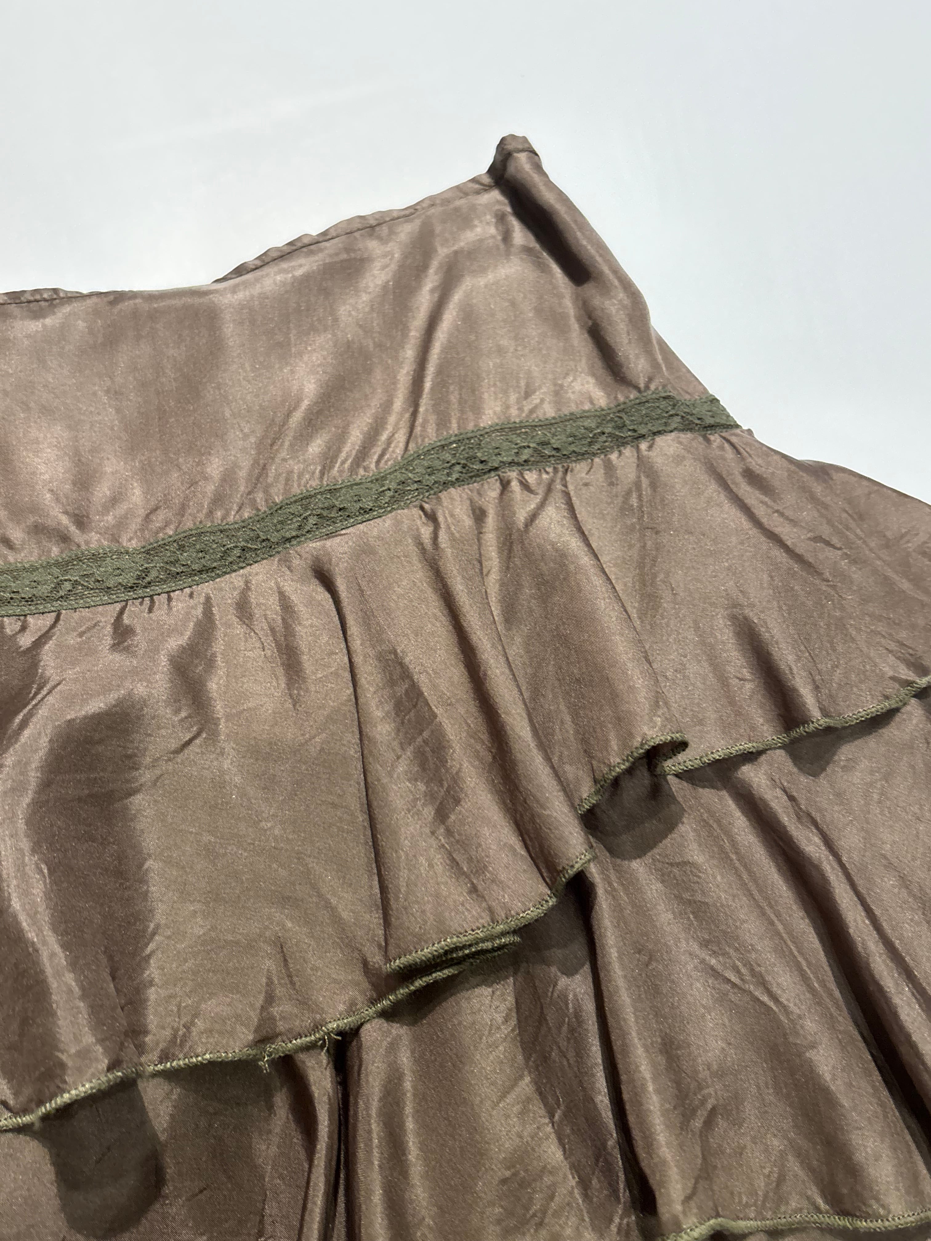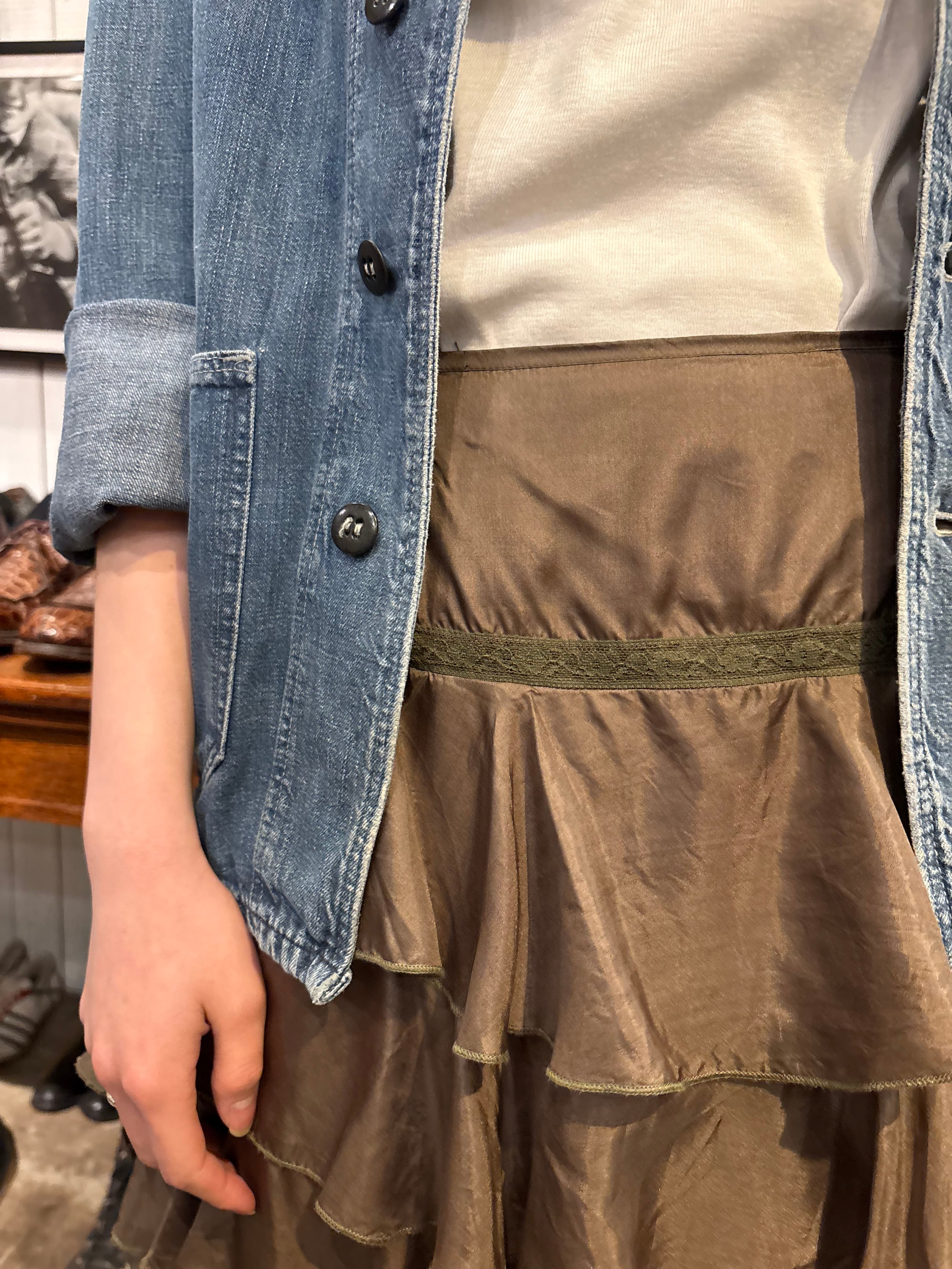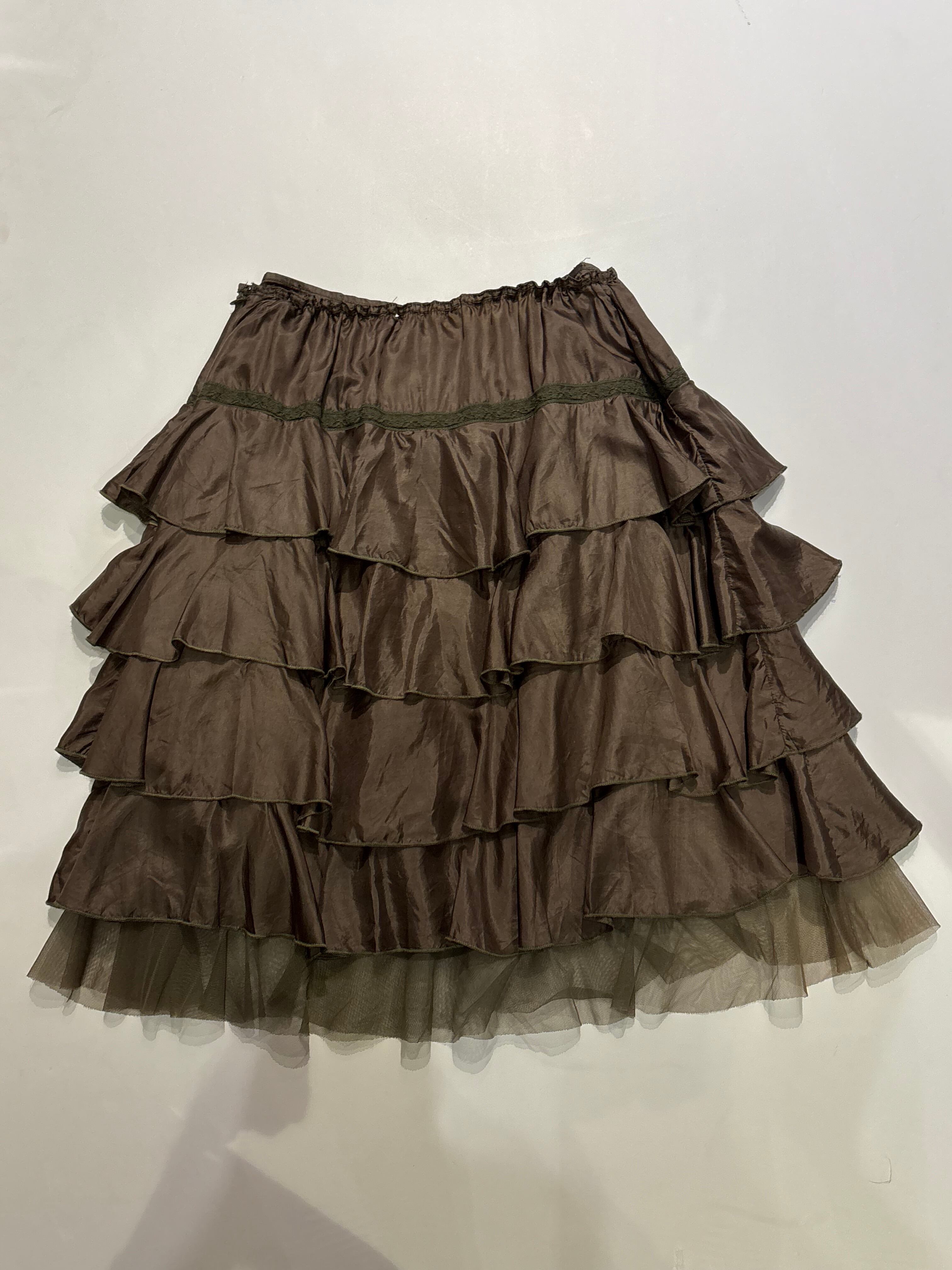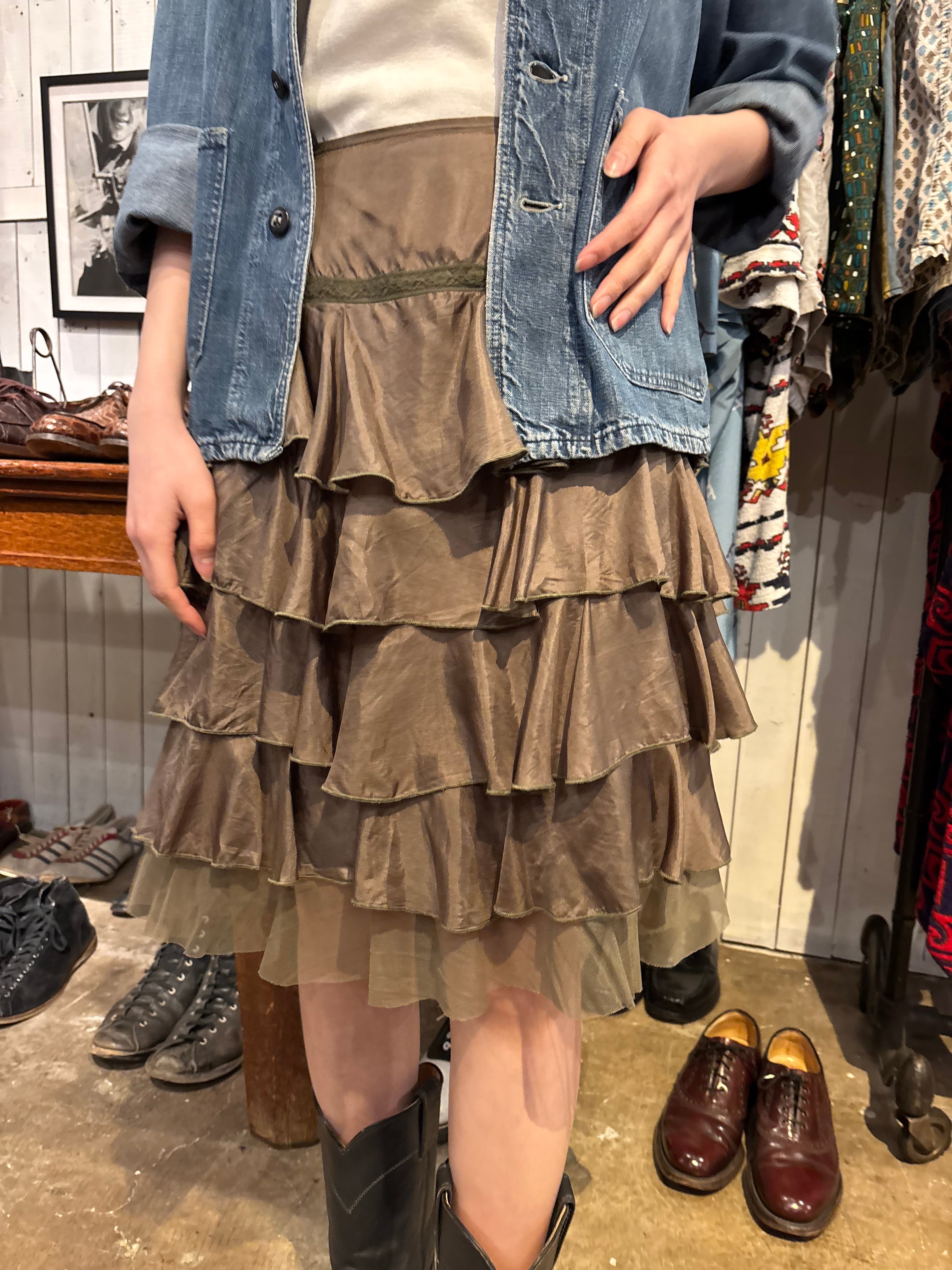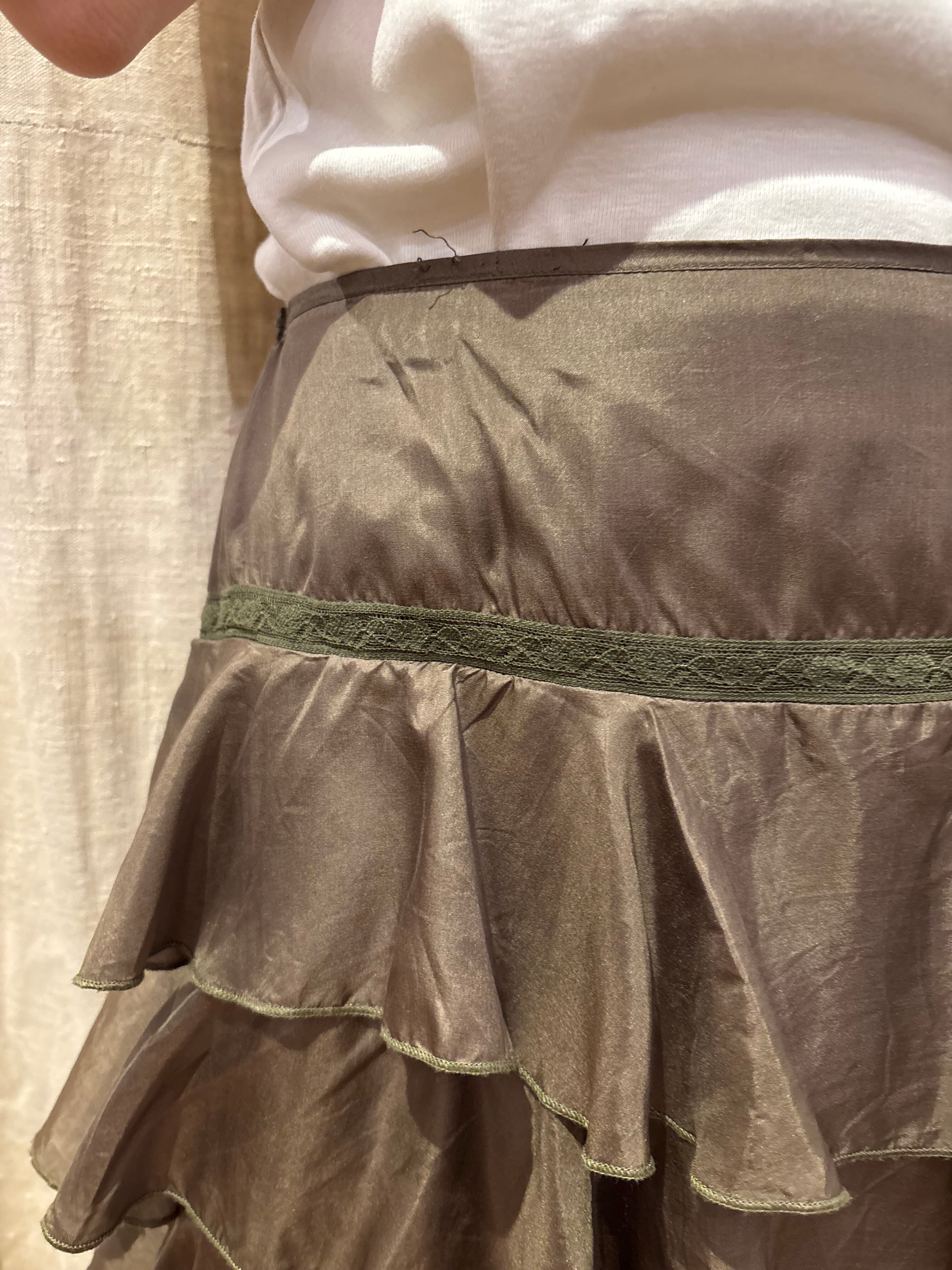 Y2Kなコーディネートにぴったりなスカートです。五段のフリルになっておりますが、シルク素材なので程よいボリューム感で使いやすく、また落ち着いた色味で光沢感も綺麗です。後ろのウエスト部分のみゴム仕様になっており、デニムなどパンツとレイヤードしても素敵です。