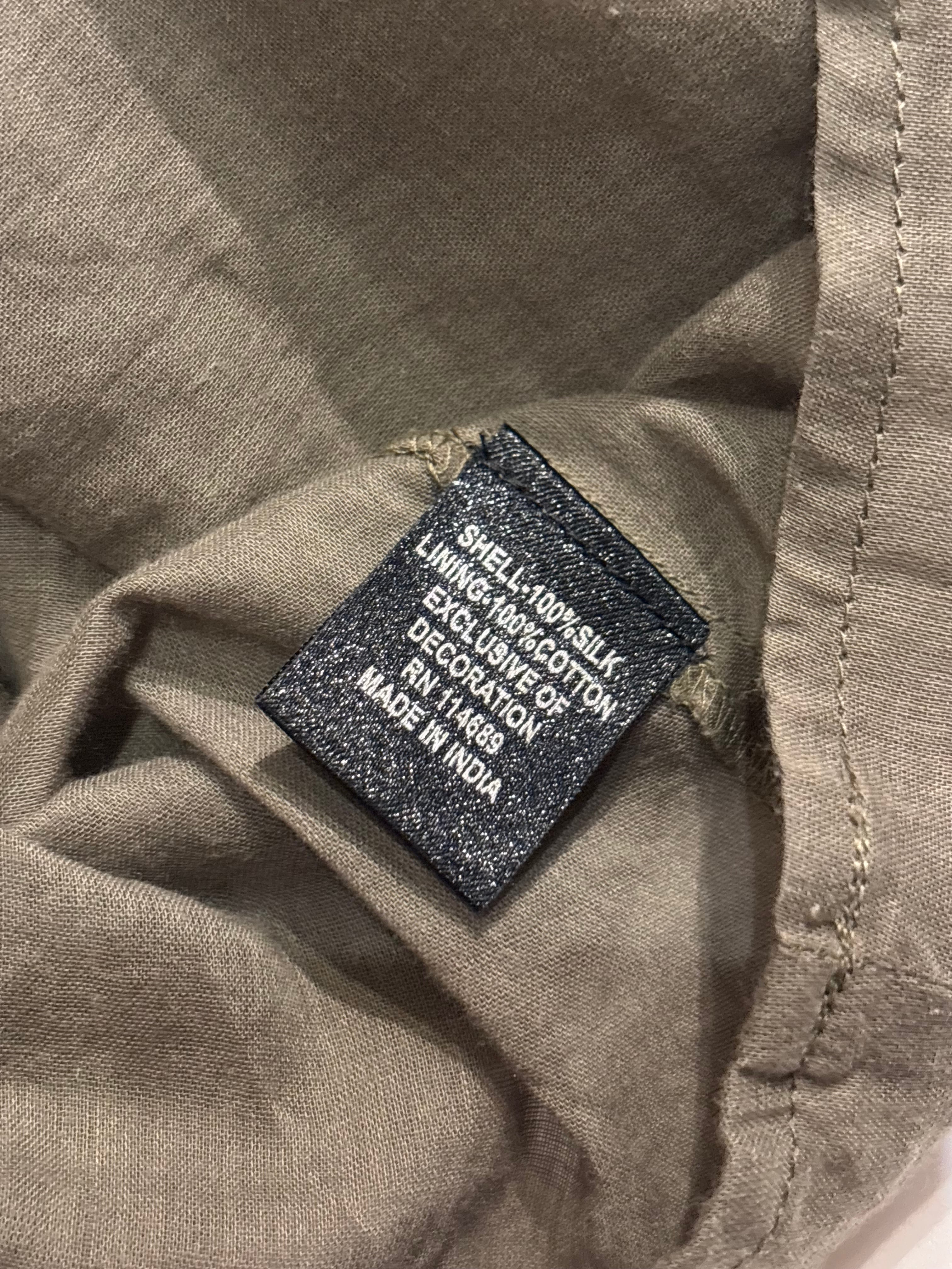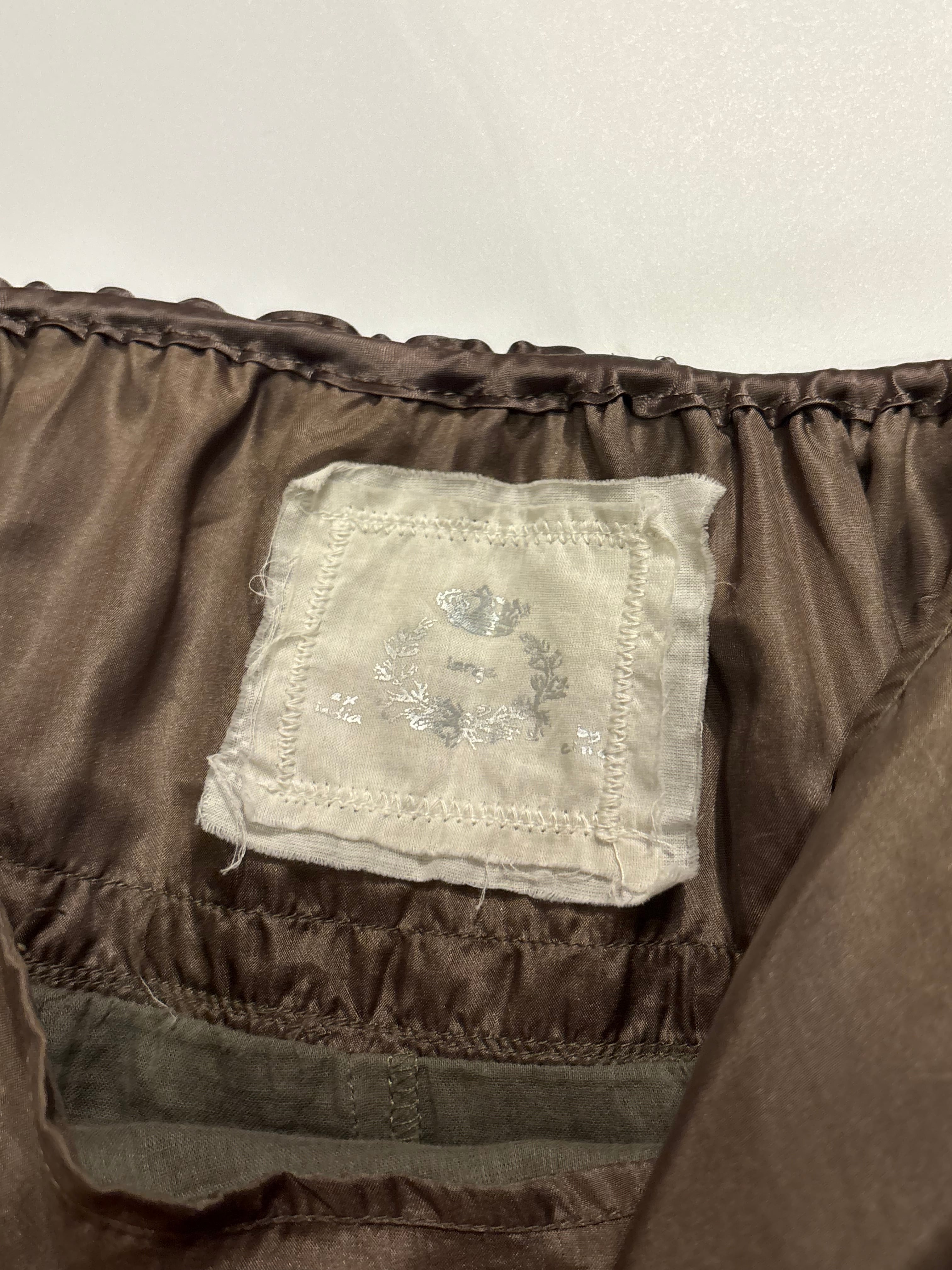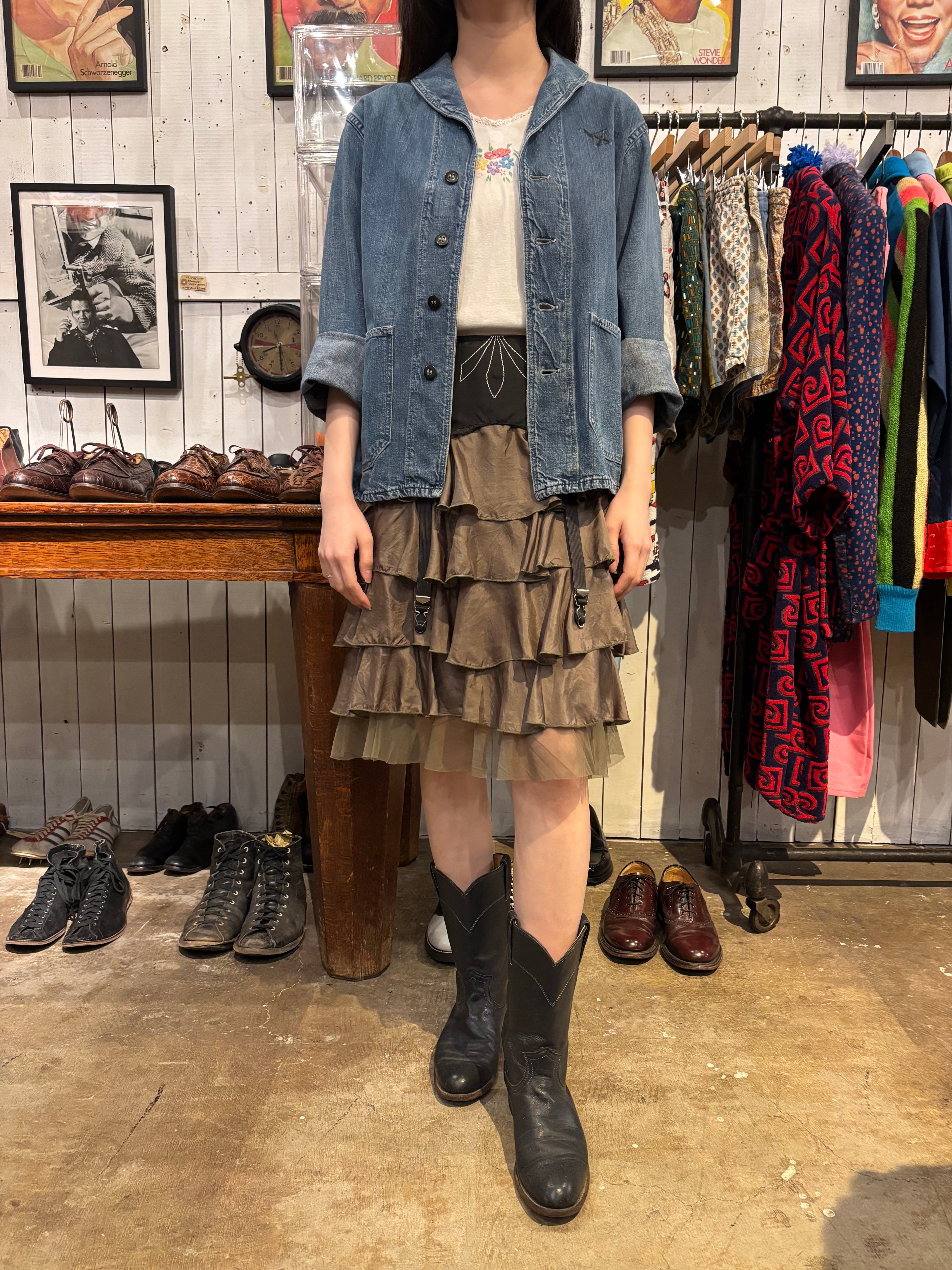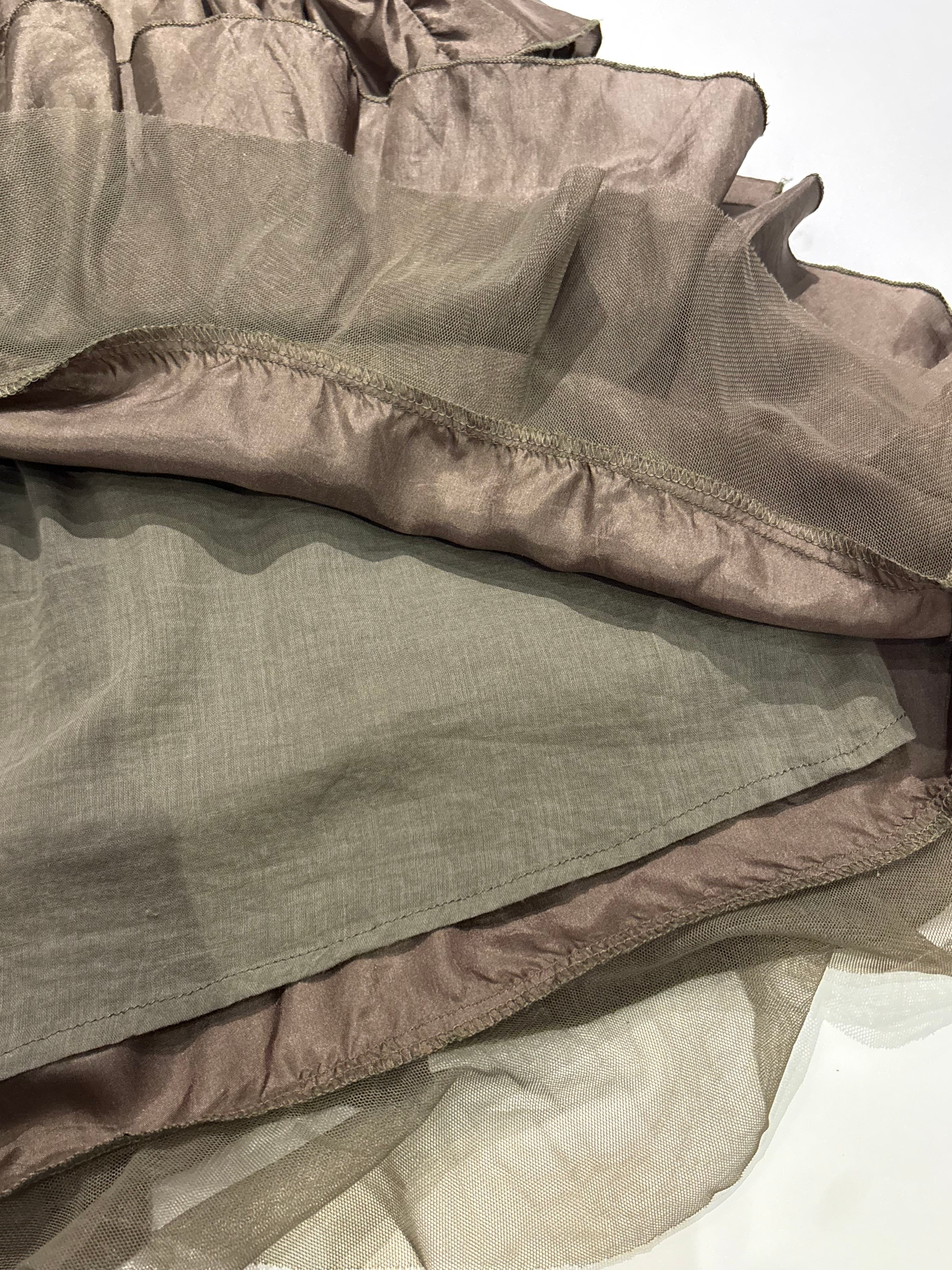 Y2Kなコーディネートにぴったりなスカートです。五段のフリルになっておりますが、シルク素材なので程よいボリューム感で使いやすく、また落ち着いた色味で光沢感も綺麗です。後ろのウエスト部分のみゴム仕様になっており、デニムなどパンツとレイヤードしても素敵です。