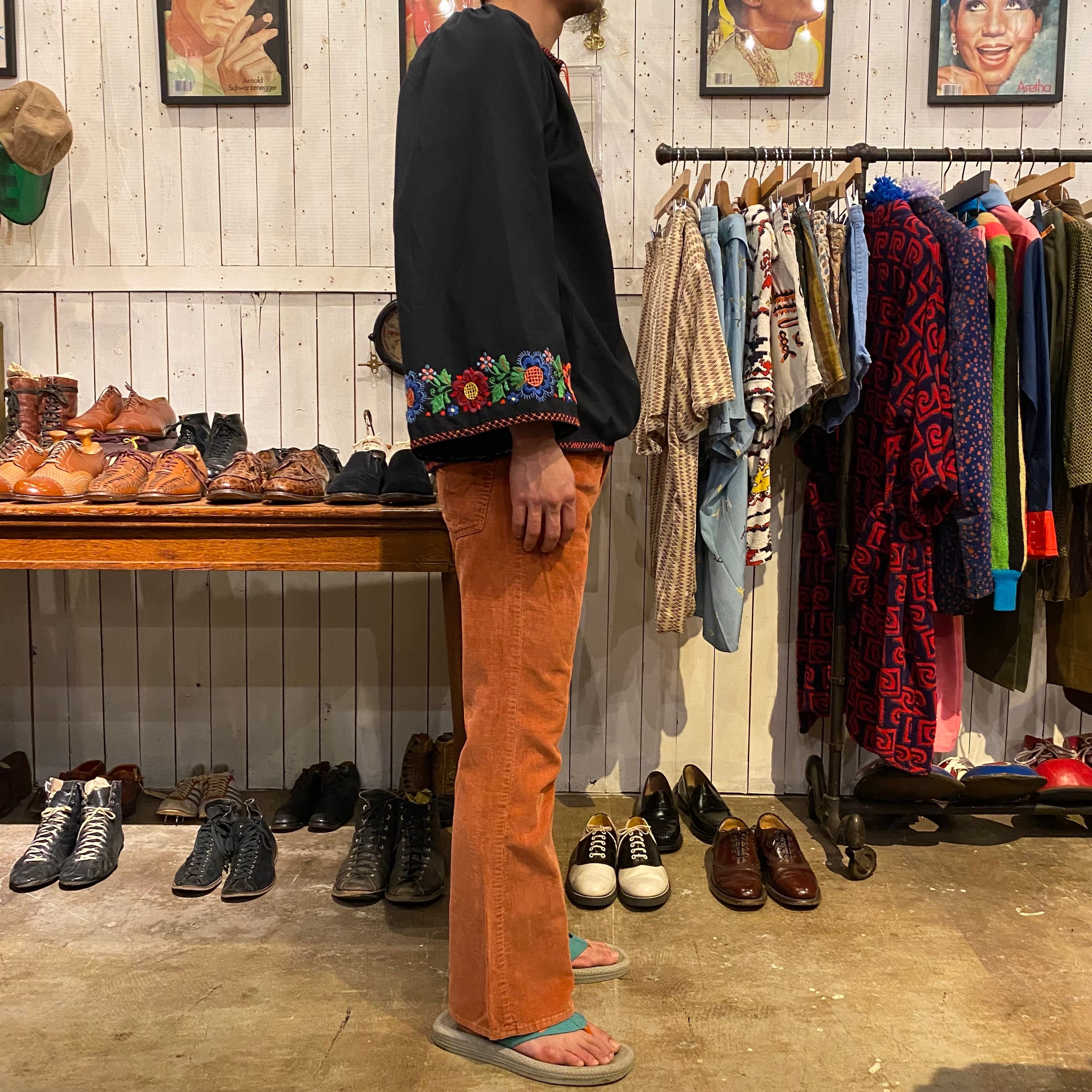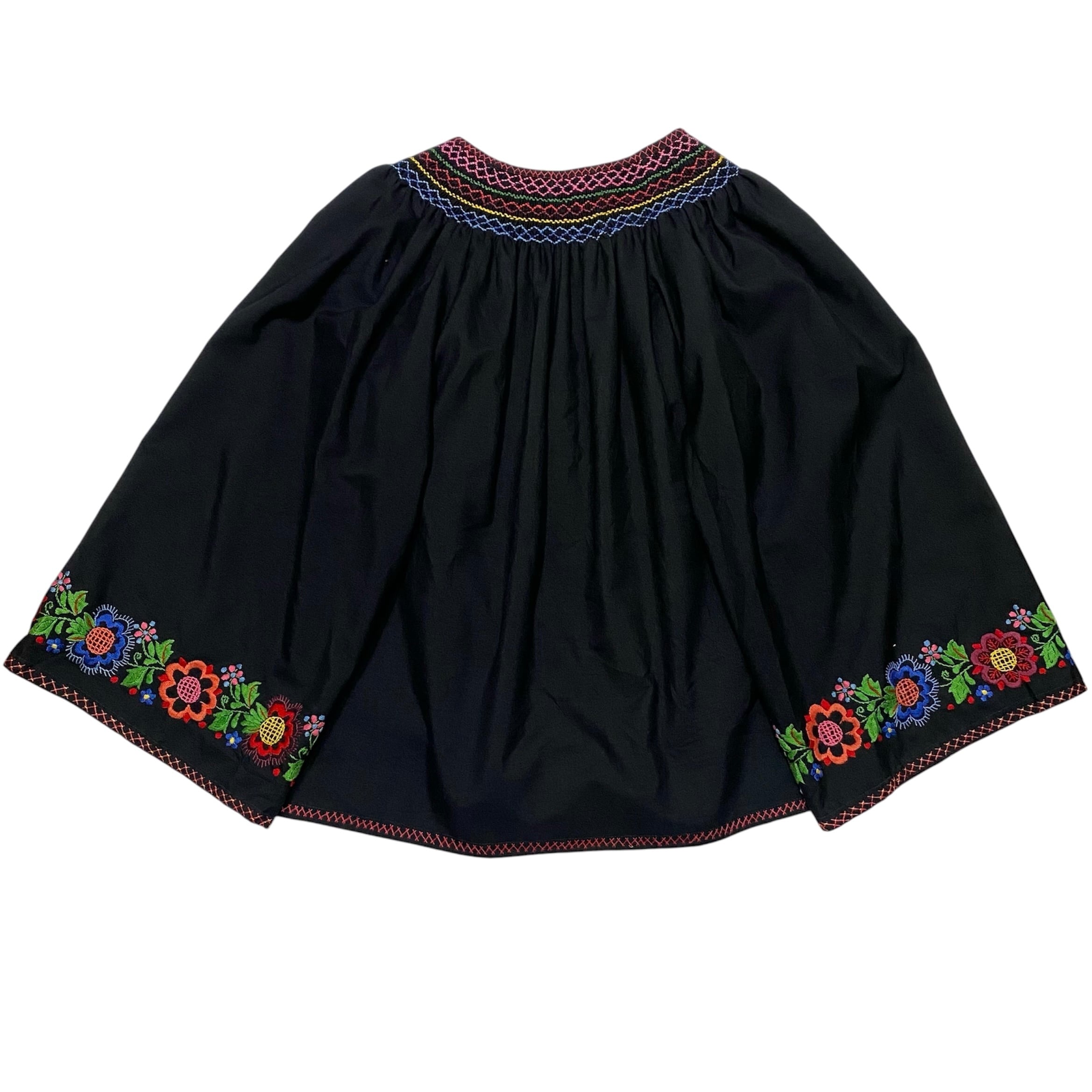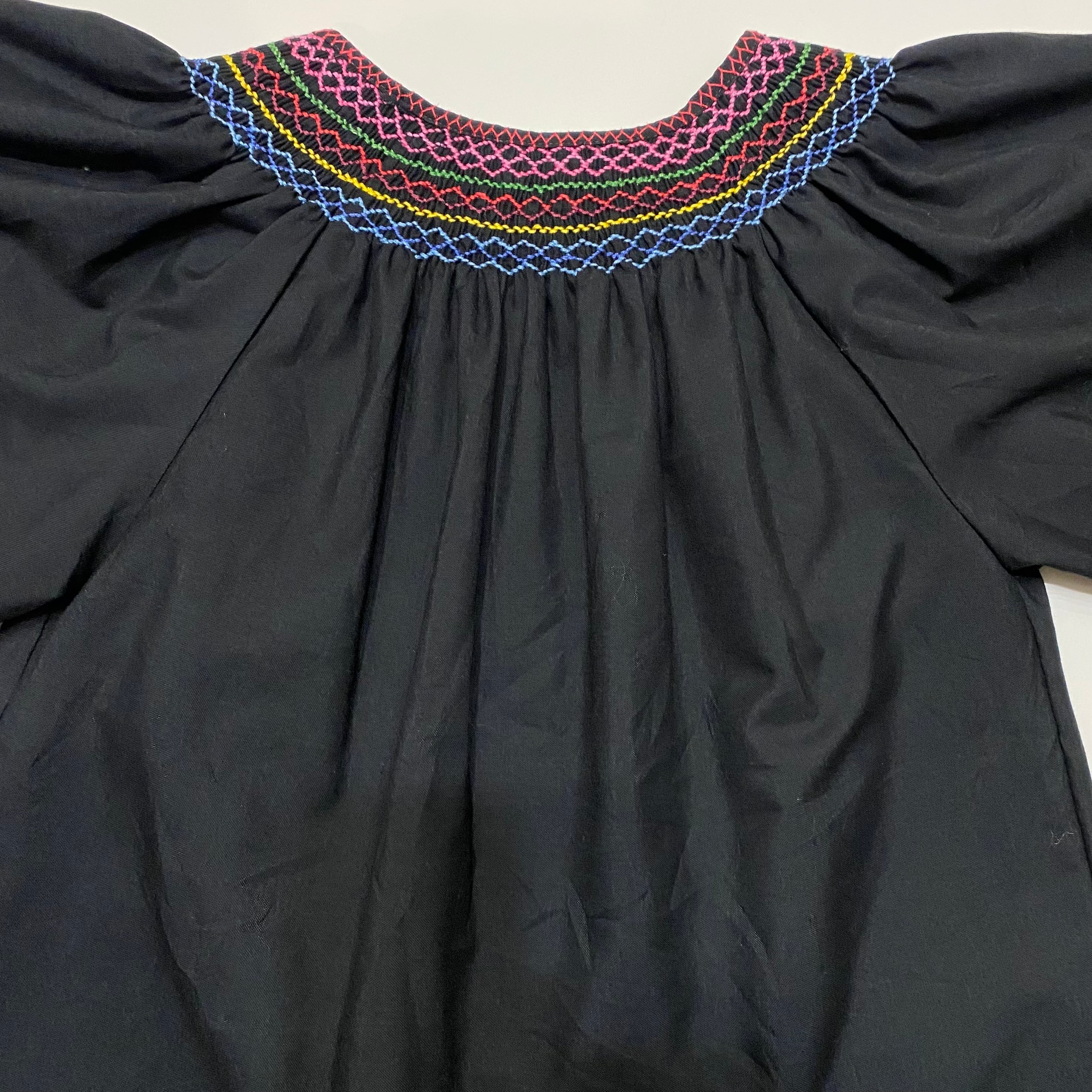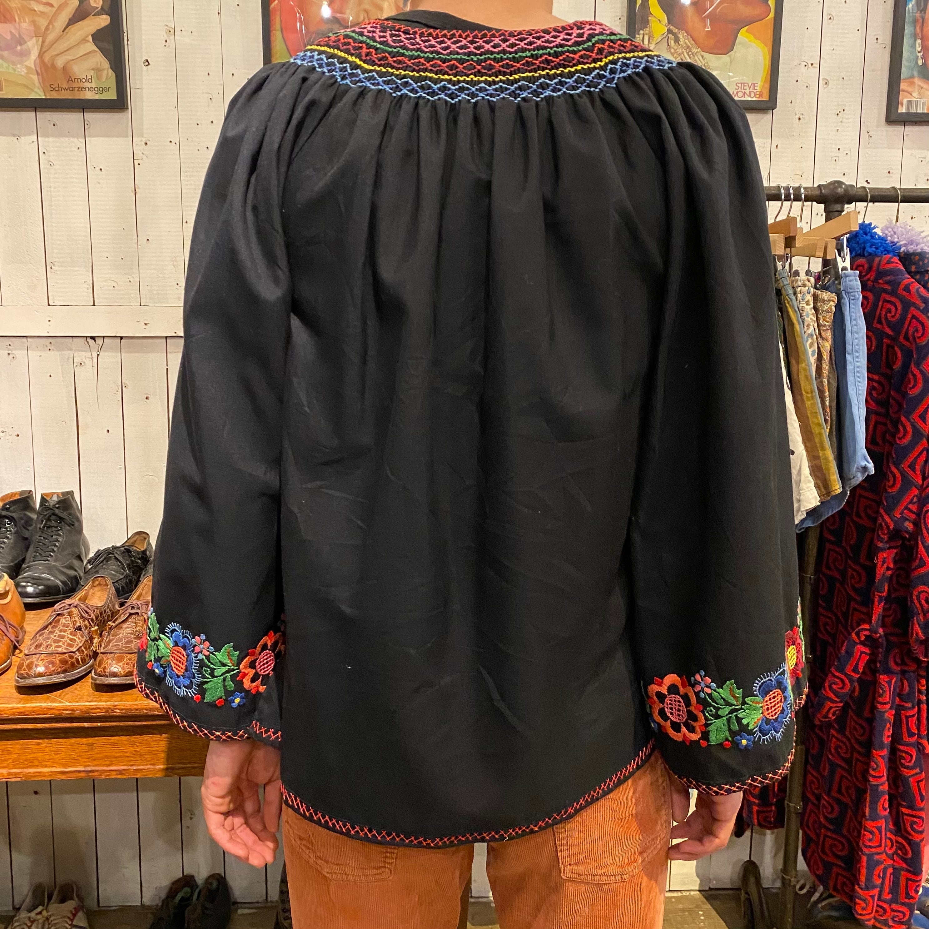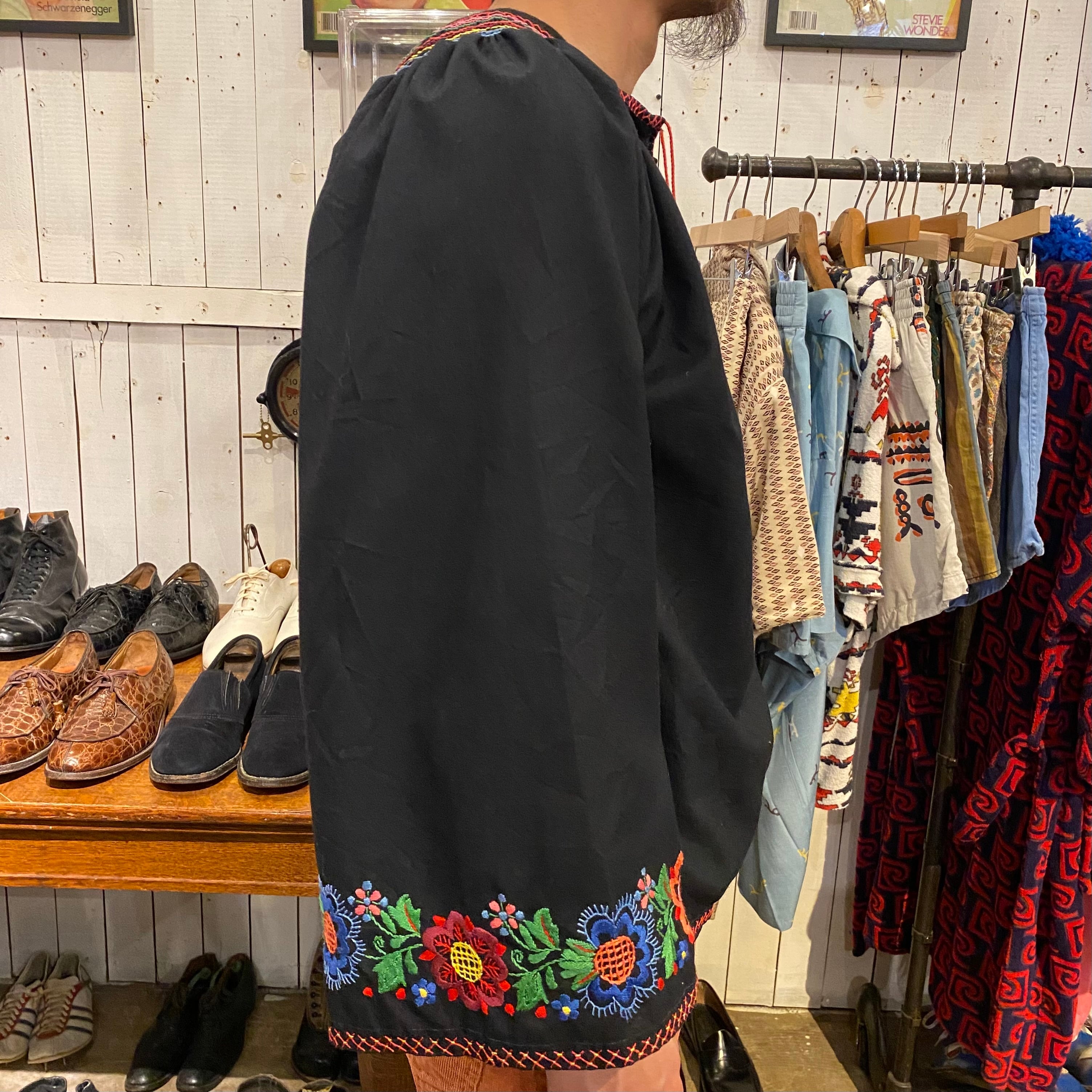 花の刺繍が施されたエスニックシャツになります。袖幅がふわっと広くとられていて、肩から背中にギャザーがはいるデザインです。メンズでも着れる希少な大きめサイズになります。さらっと着られる薄手でしっかりした生地感はこれからの季節に良さそうです。手の込んだ細かい刺繍が黒の生地にとても綺麗に写ります。