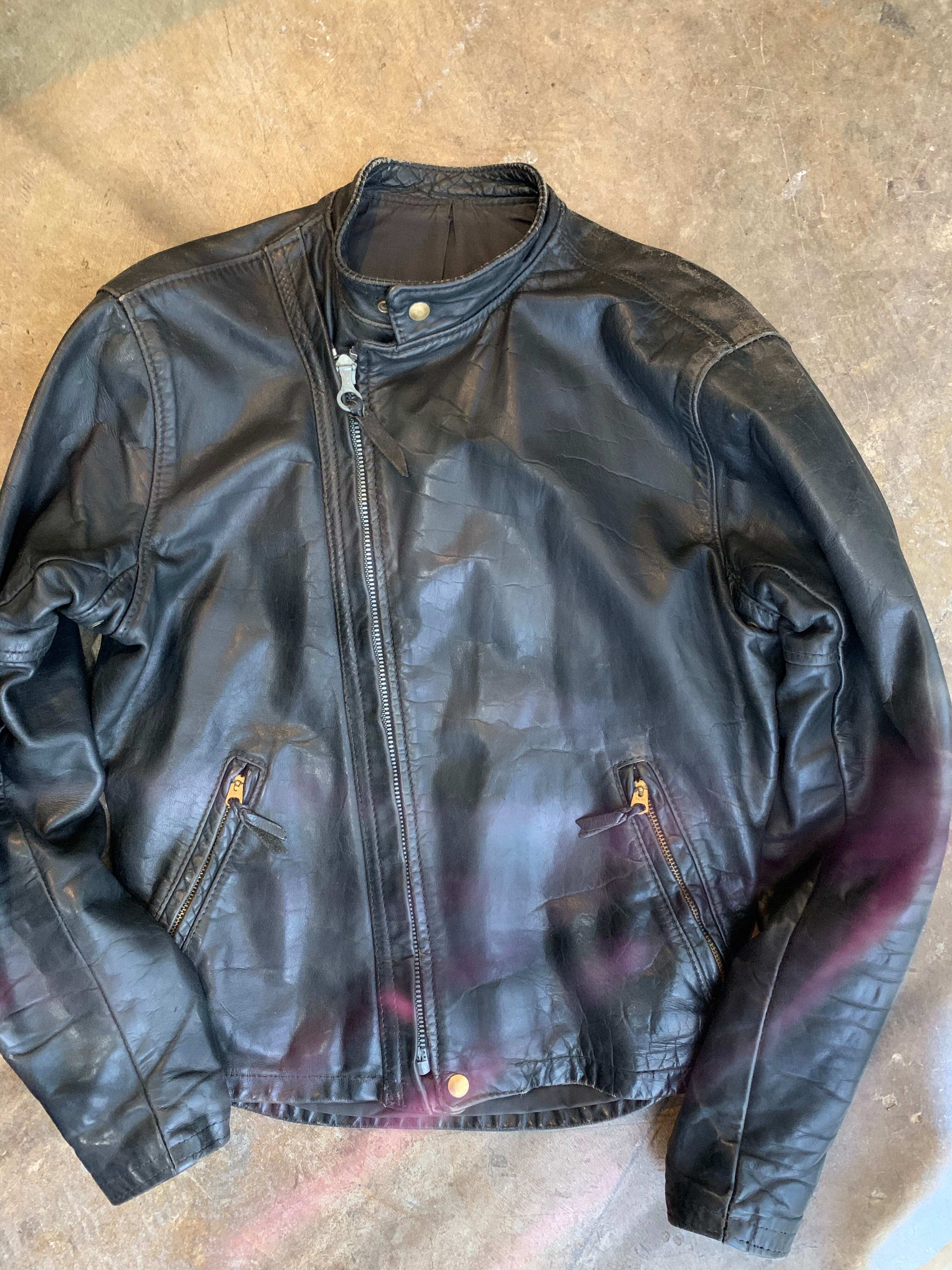年代は70年代かなと思います。元々C&Cのzipが着いてました。フライトジャケットについている大きめのCROWNに交換しています。サイズは、40ぐらいです。当時ほとんどオーダーだと思いますので、ウエストが少し狭くなってると思います。着丈69cm身幅53cmウエスト44cm肩幅48cm袖丈63cm