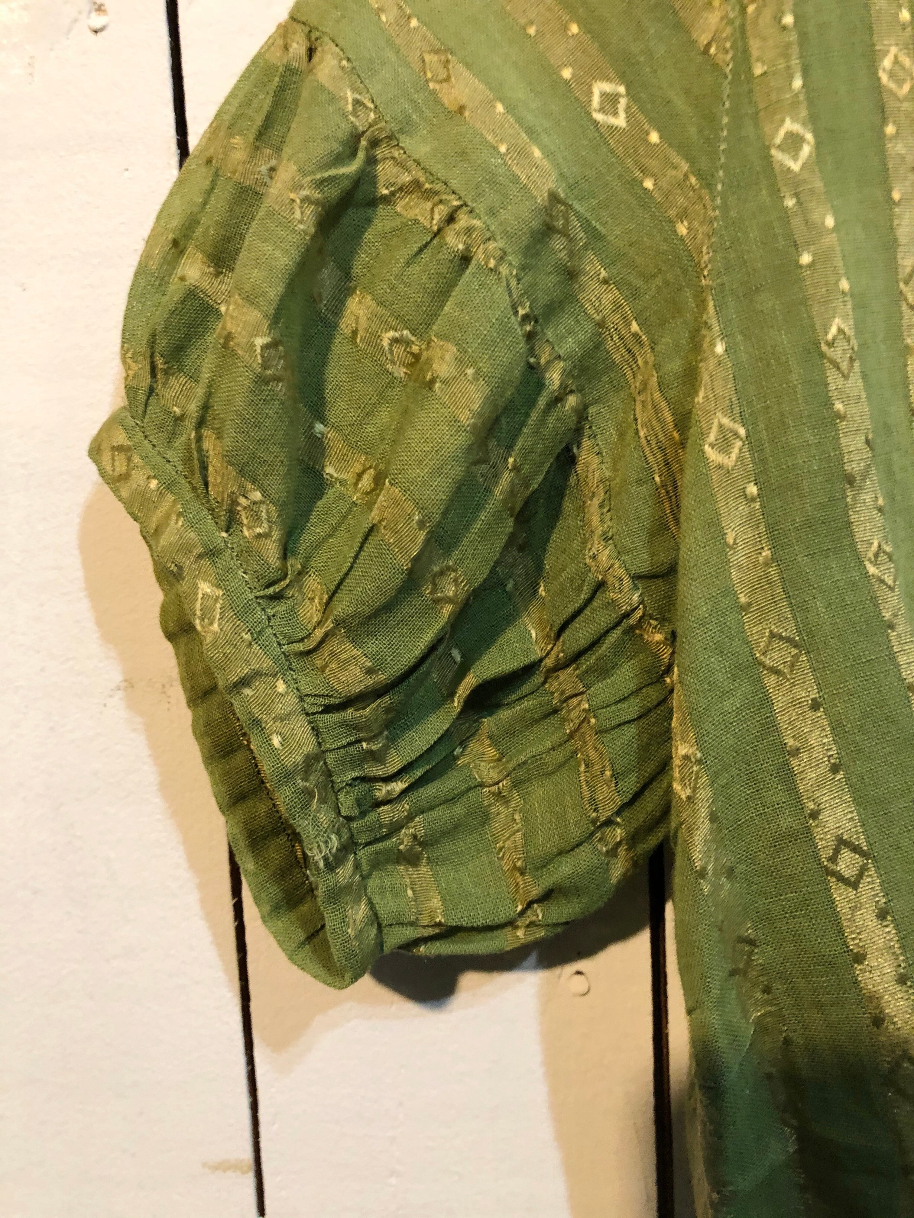 グリーンに首元のピンクが可愛い半袖ブラウス。