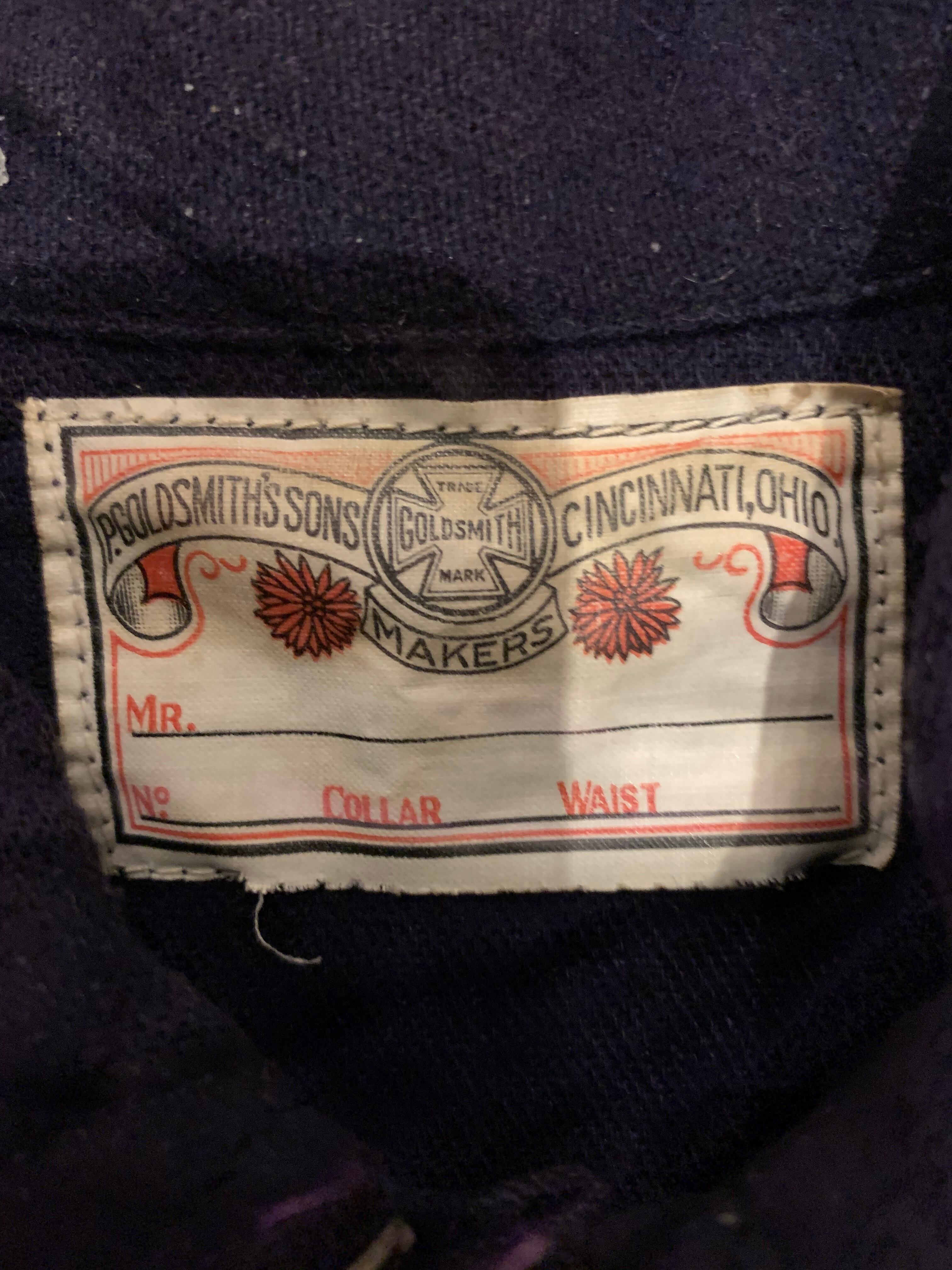 あまり古さを感じさせない100年以上前のベースボールシャツです。素材は、ウールです。ネイビーに、白パイピング袖に白い生地が付いてます。ボタンは、シェルボタンです。襟が付いているベースボールシャツは、とても珍しいです。野球やっていた方だとお分かりですが、袖丈が、通常の半袖より長めになっています。この頃から、変わってない様です