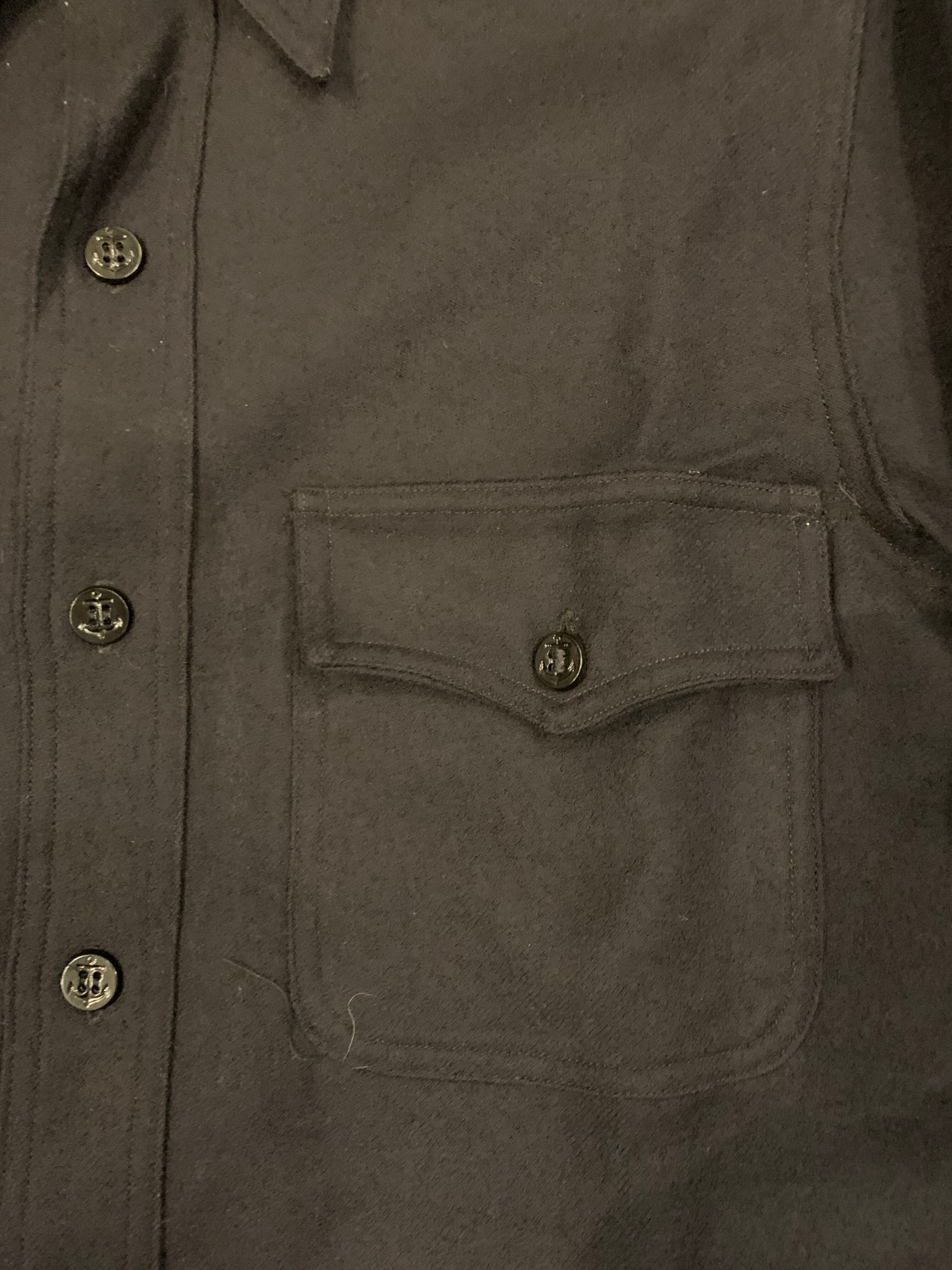 u.s.navyのcpoです。1940年代のCPOは、ウール生地が薄く着やすいサマーウールに近いです。カタログには、ブルーフランネルシャツと書いてあります。40年代は、ポケットが、片方だけです。この年代のタグは、サイズ表記がありません。16ぐらいでしょうか。
