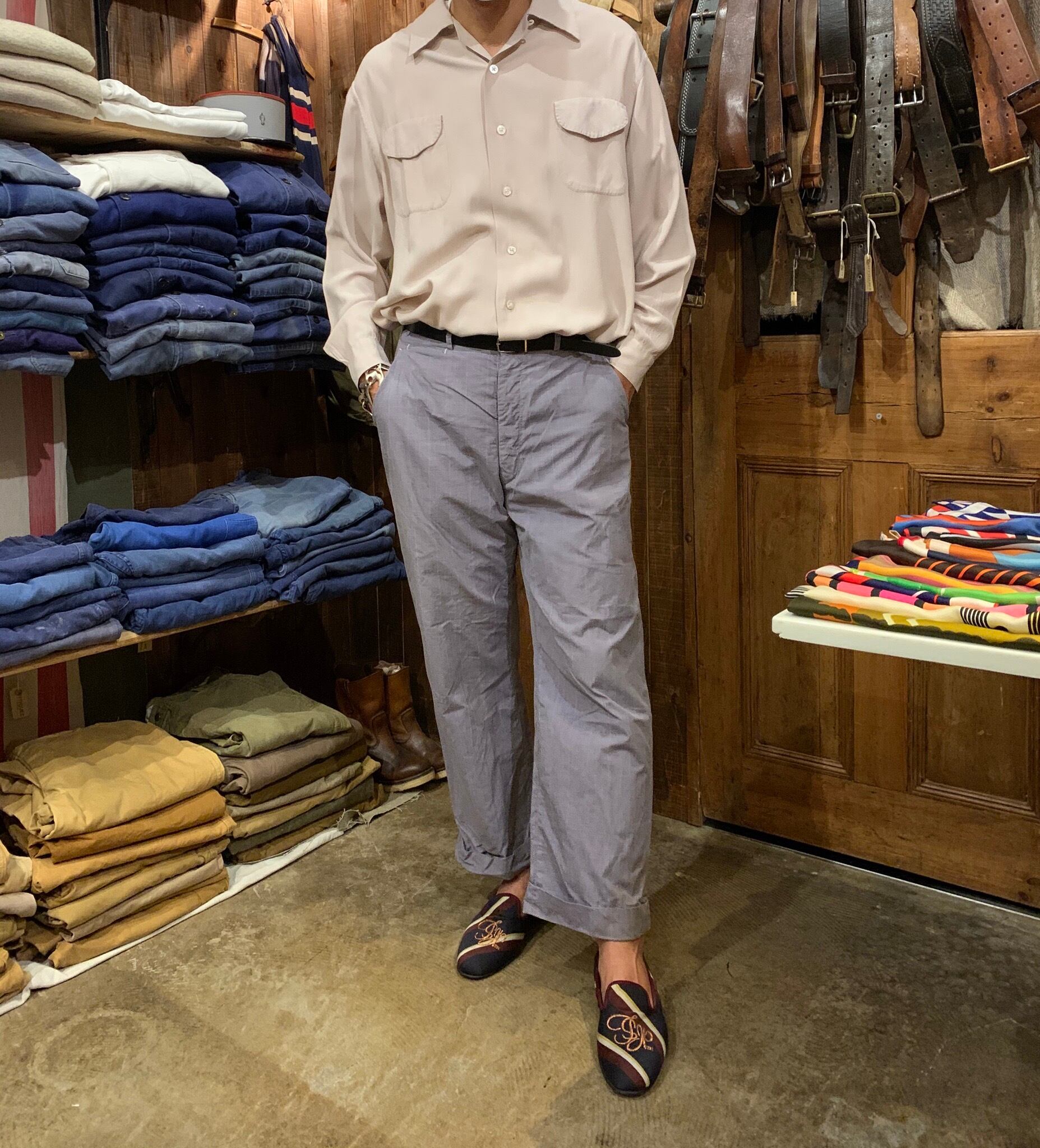 グレー地にブルーのストライプが入ったシャツ地の様なパンツです、50年代のお父さんのイメージで、着て見ました。
