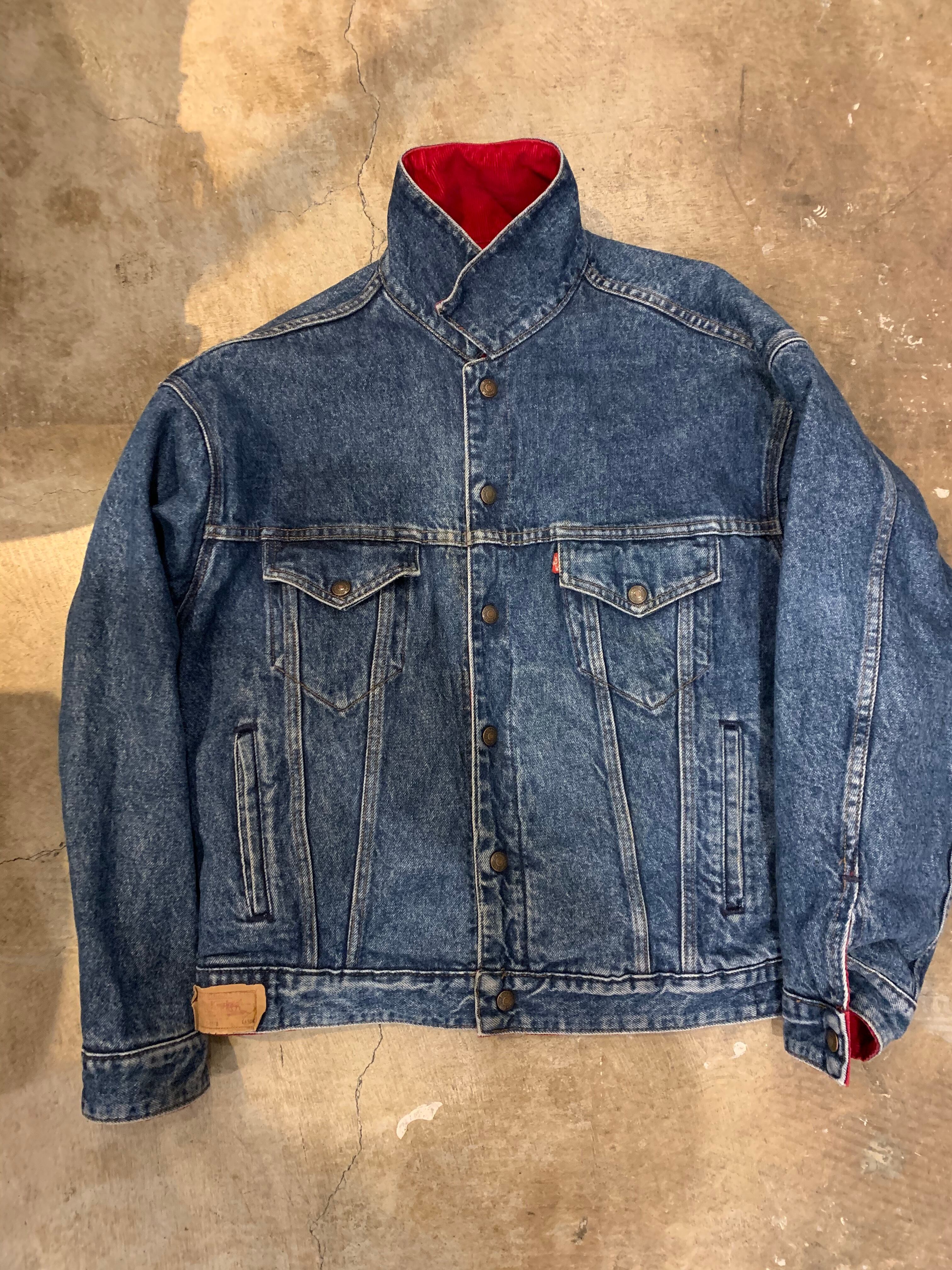 ブルーデニムと赤いコーデュロイのリバーシブルのジャケットになります。