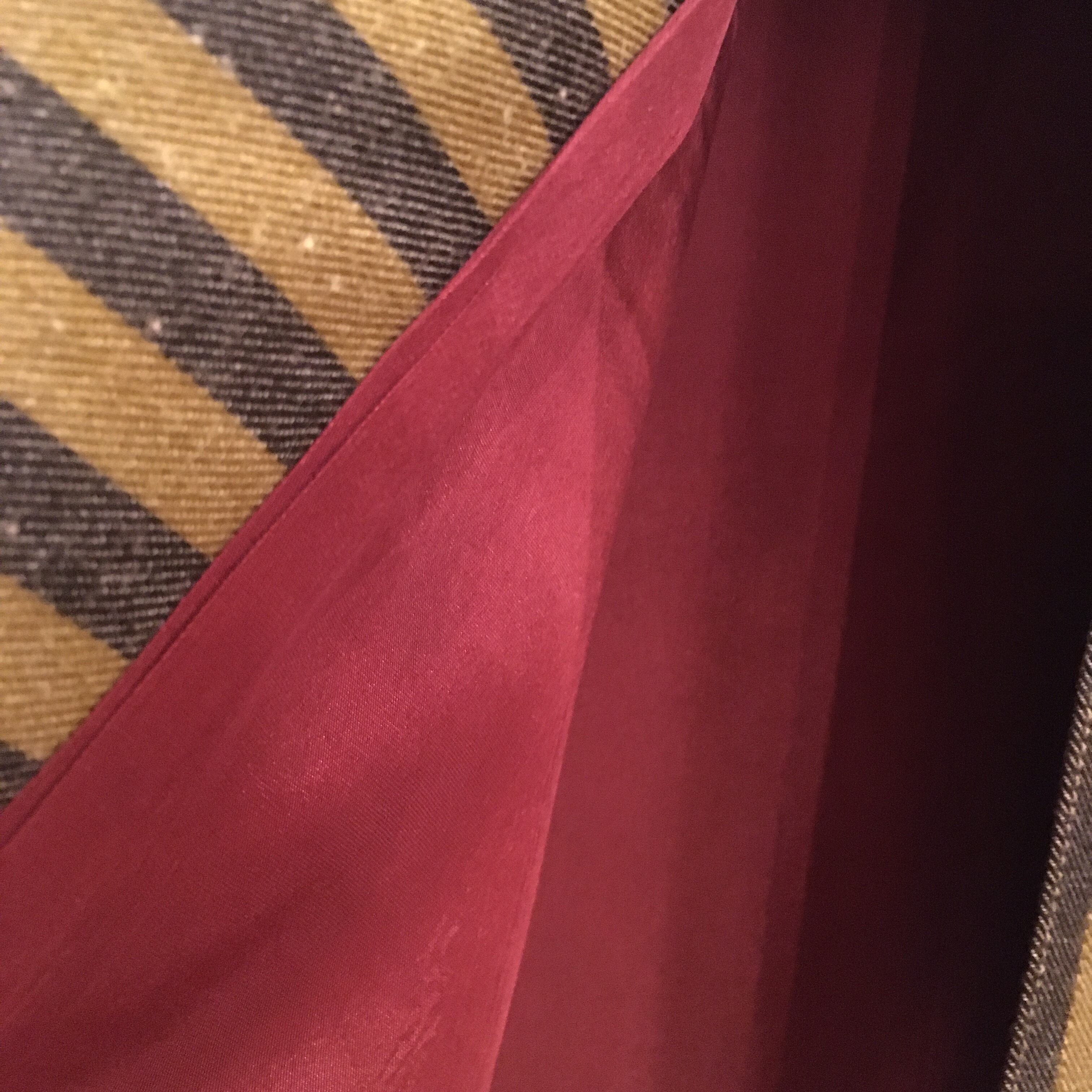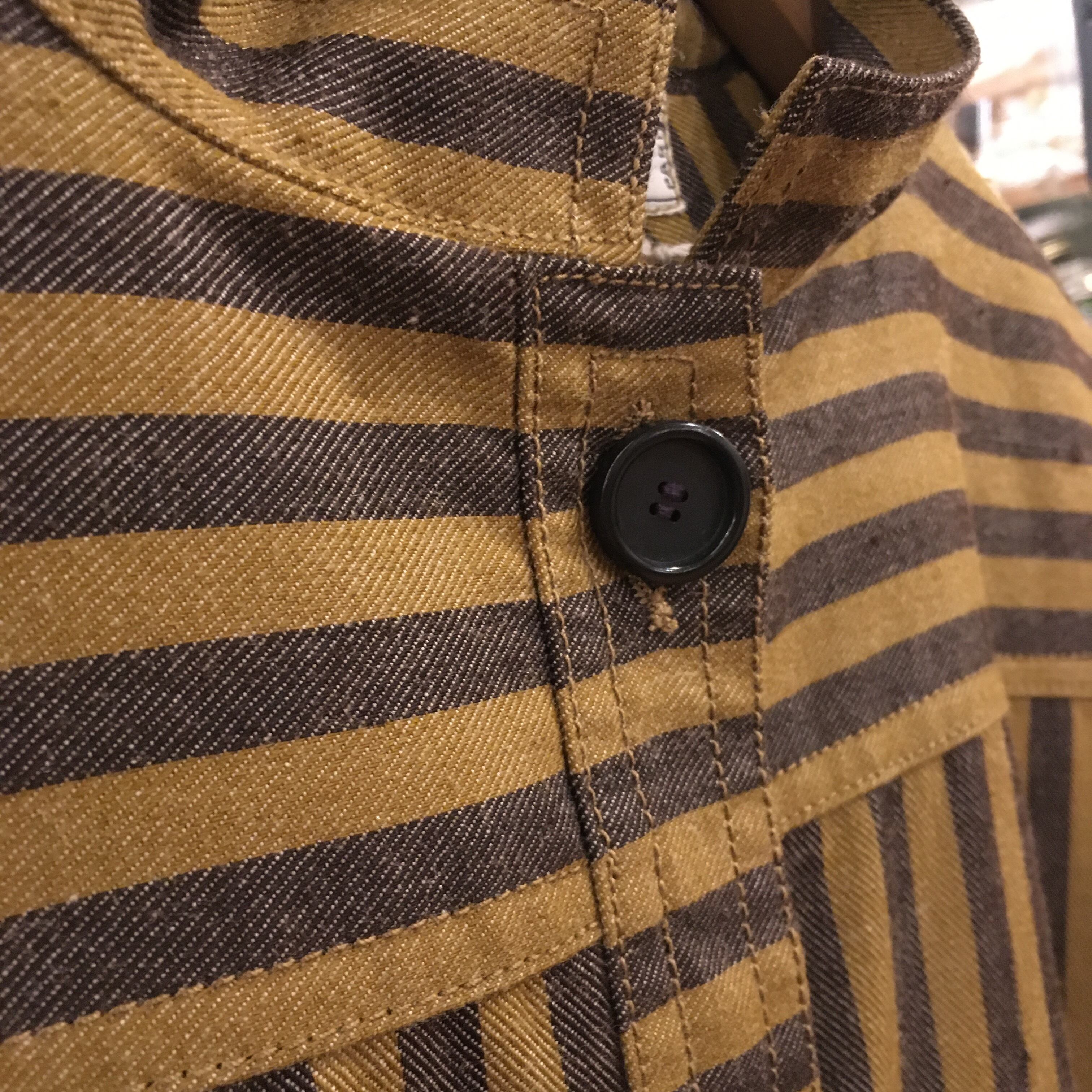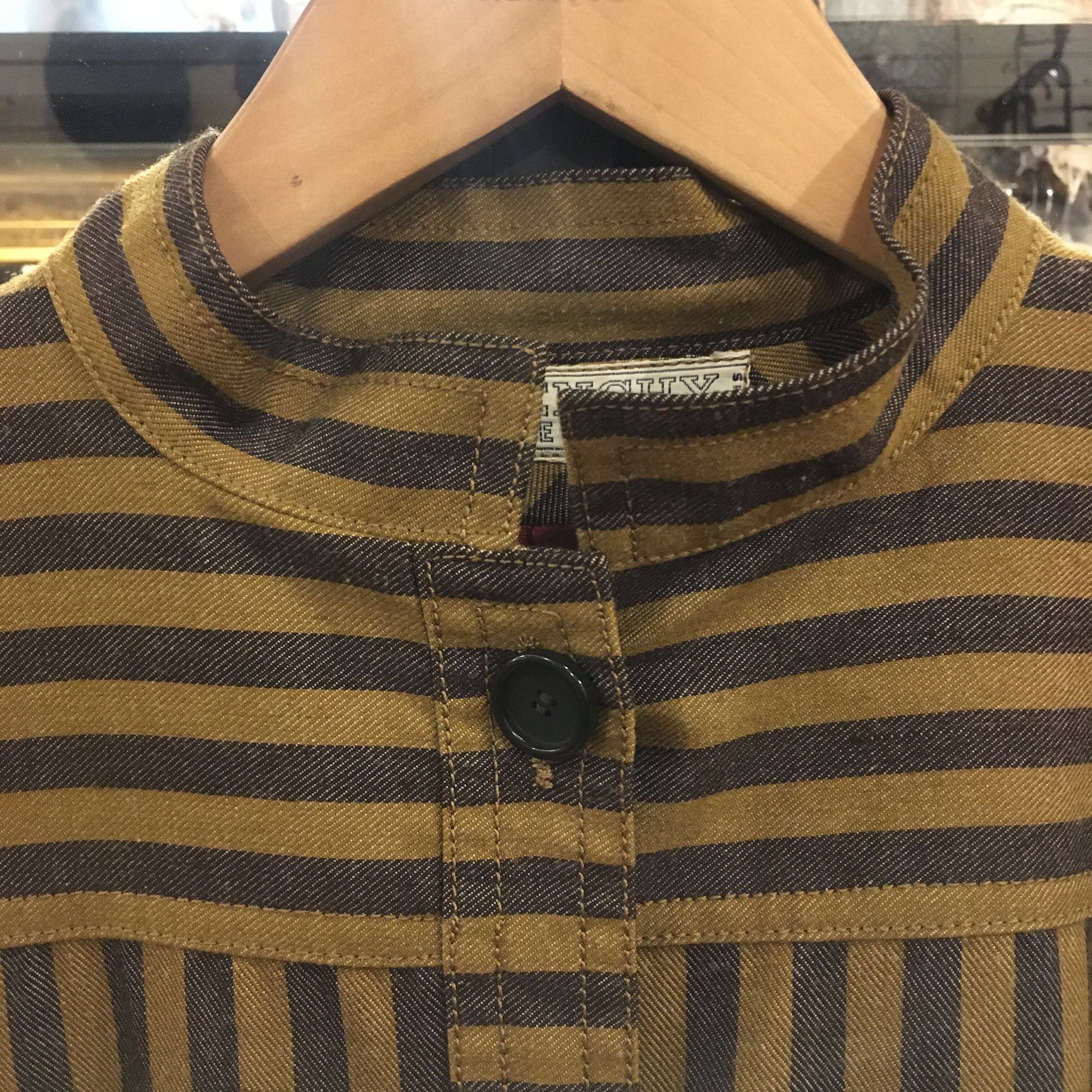 渋めの黄色とブラウンのラインを縦にストライプとして仕様したり、ボーダーとして使ったりパターンを組み替えて構築されている素敵な一枚です。袖口幅があったり、シルエットなど、どこか民族的な部分もあり、カッコいいアイテムです。