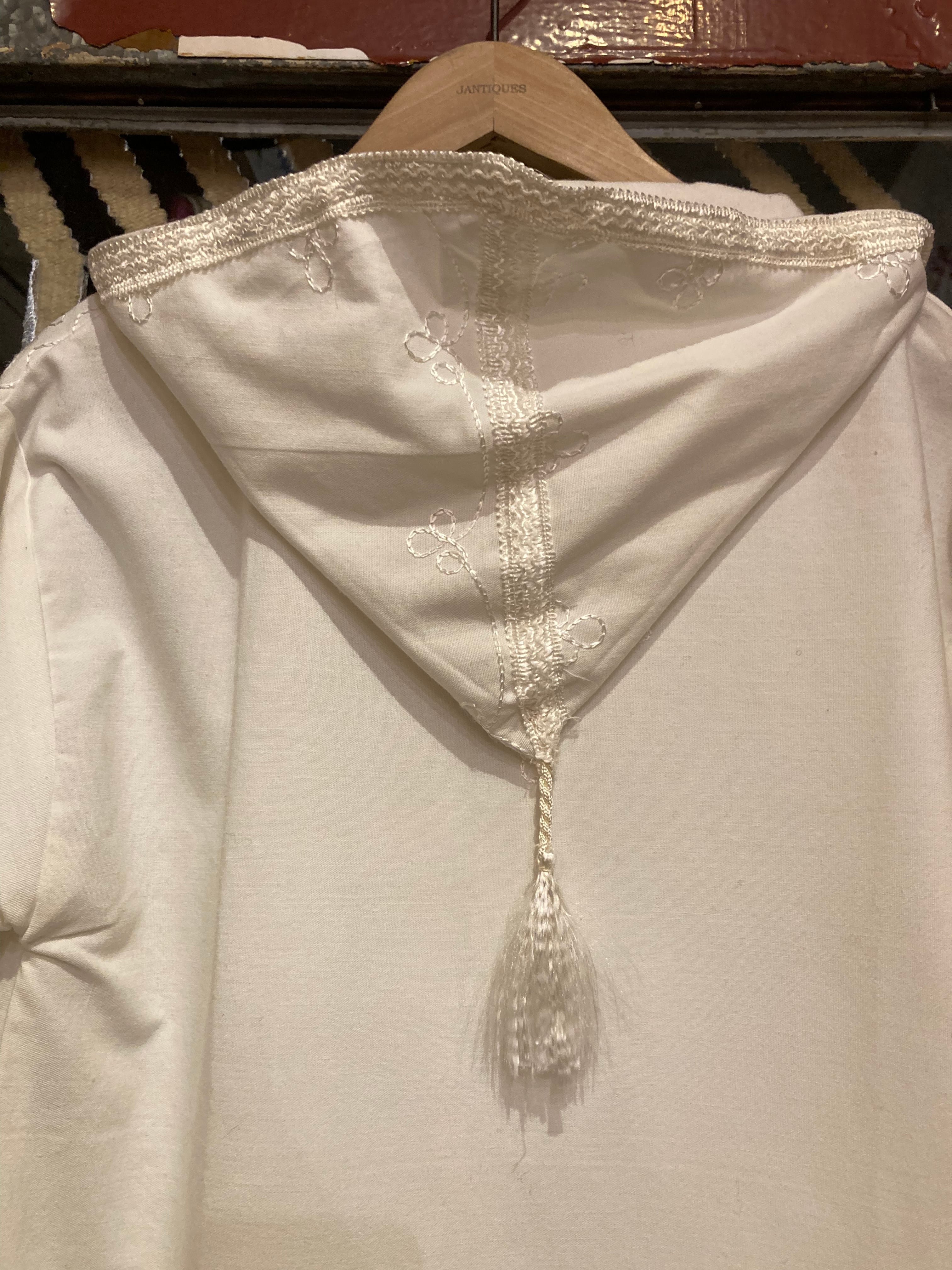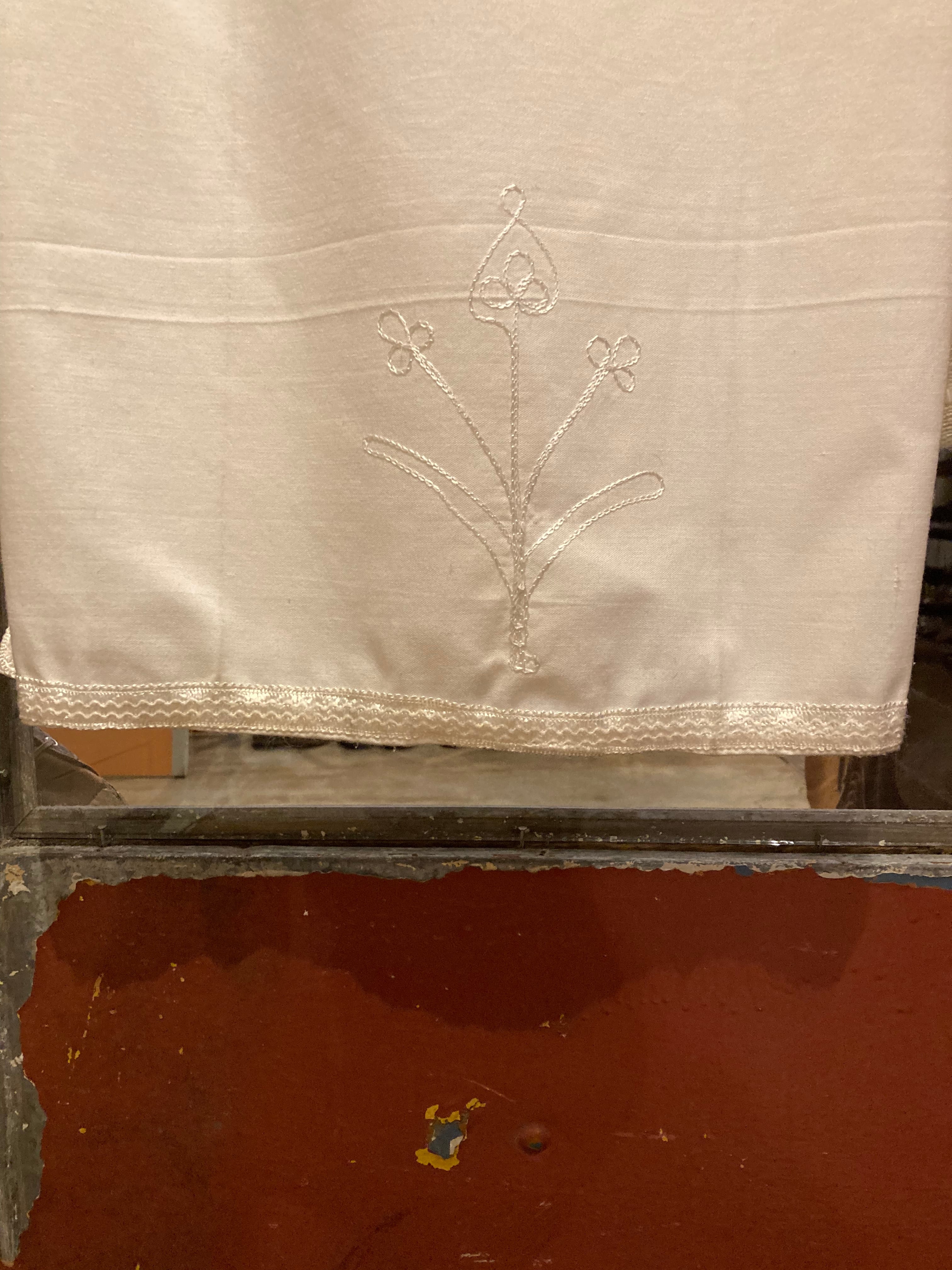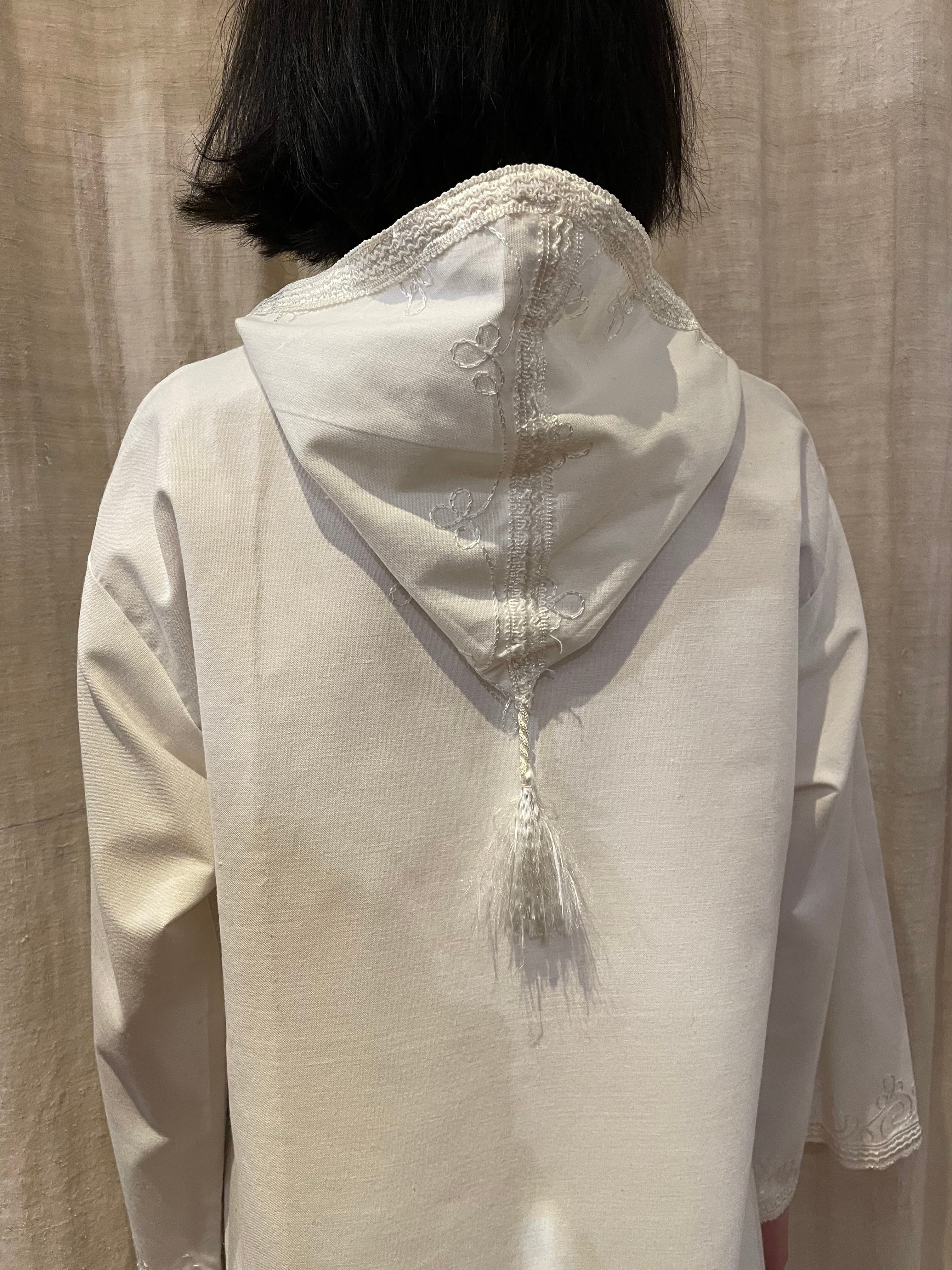 白地に白の刺繍が洒落ています。ボタンも細かく付けられていてポイントになって可愛いです。後の裾にも密かに刺繍が施されているところも素敵です。生地は比較的しっかりしてホワイトカラーですが、肌に近いアンダーウェアを着ていただければあまり気にする事なく履いて頂けそうです。