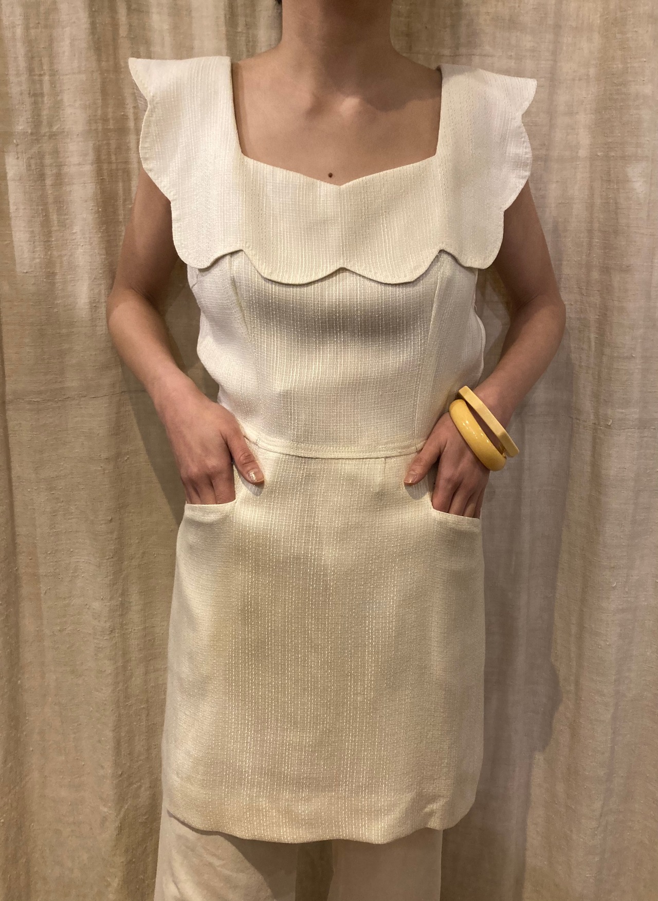 襟のように重なったフリル部分や首元がスクエアにあいていたりするデザインにきゅんとしますし、デコルテも綺麗にみせてくれます。表記はないですがさらっとしたポリエステル素材だと思います。ワンピースなのにポケット付きなのも嬉しい。一枚できてもいいですがワイドパンツなどを重ねて履いても今っぽい着こなしでおすすめです。