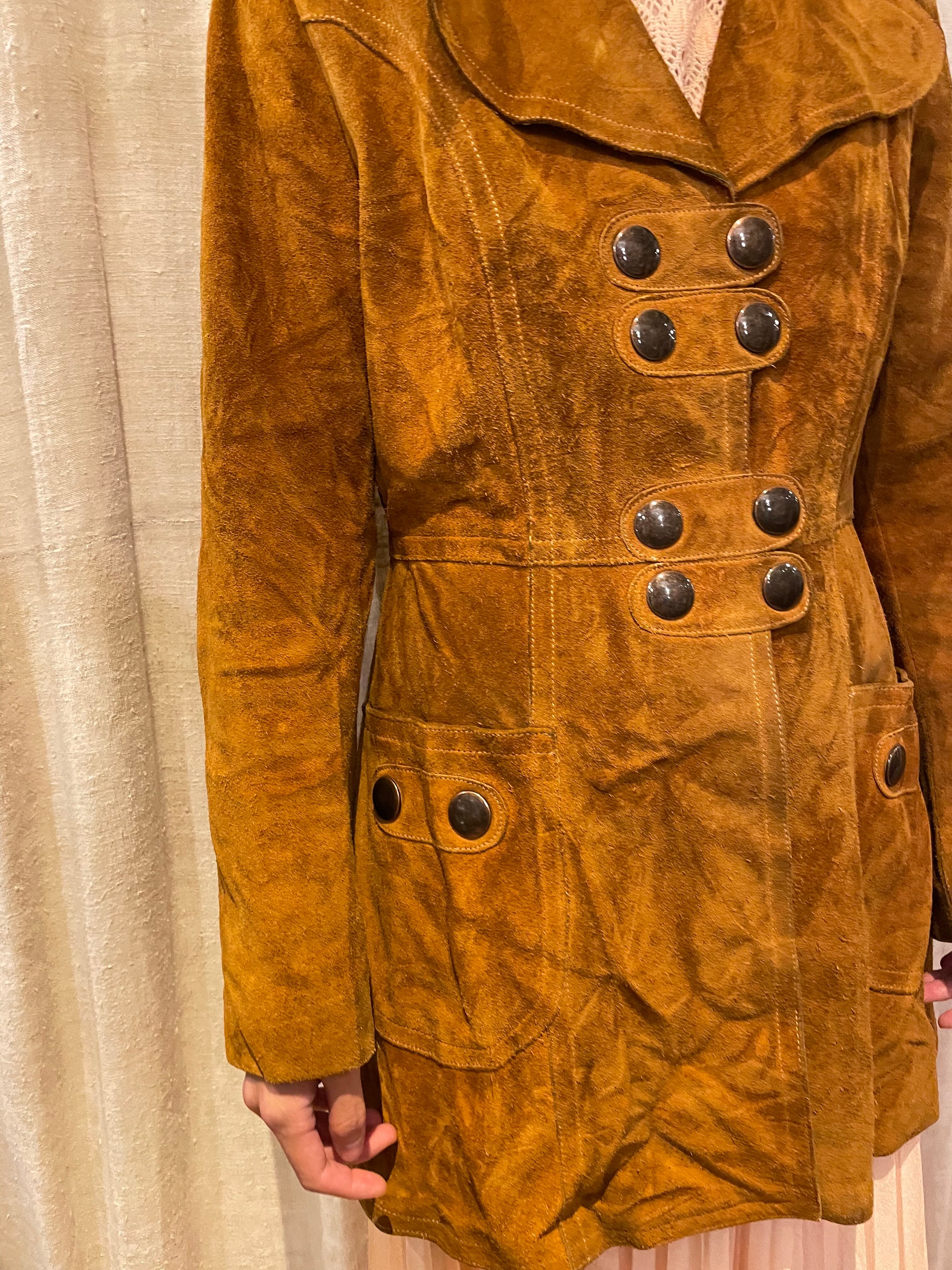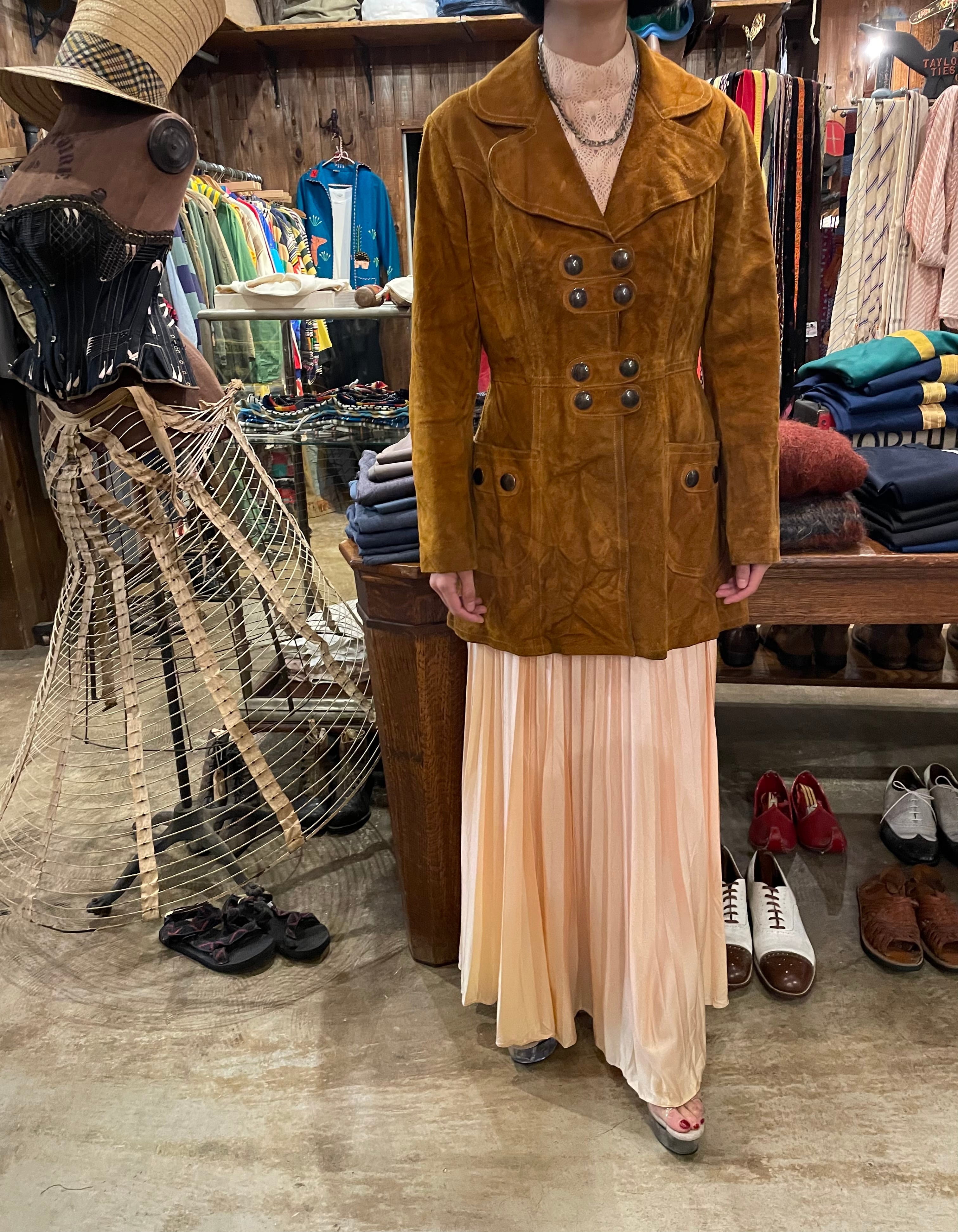 大きめのスナップボタンのデザインや大きめの襟などスエードですがハードさがないデザインが可愛い。ウエストがシェイプされたシルエットがカッコいい。固すぎず味のあるレザーで雰囲気も最高です。女性らしいワンピースなどにサラッと重ねてお洒落です。