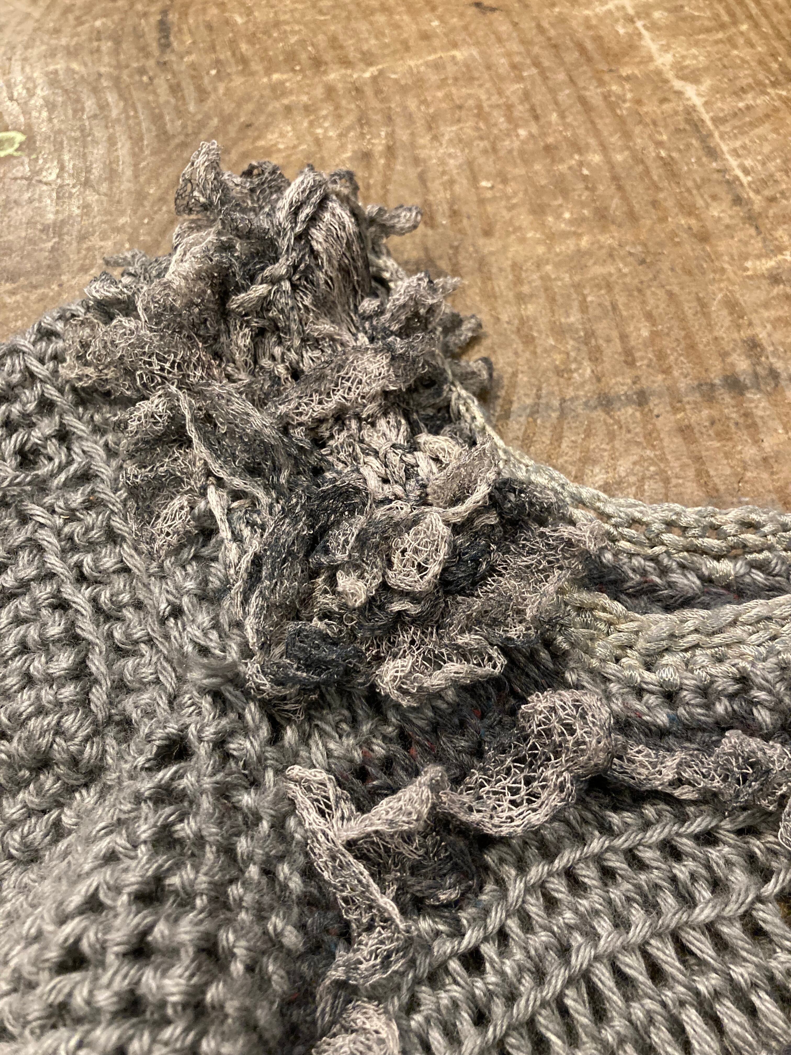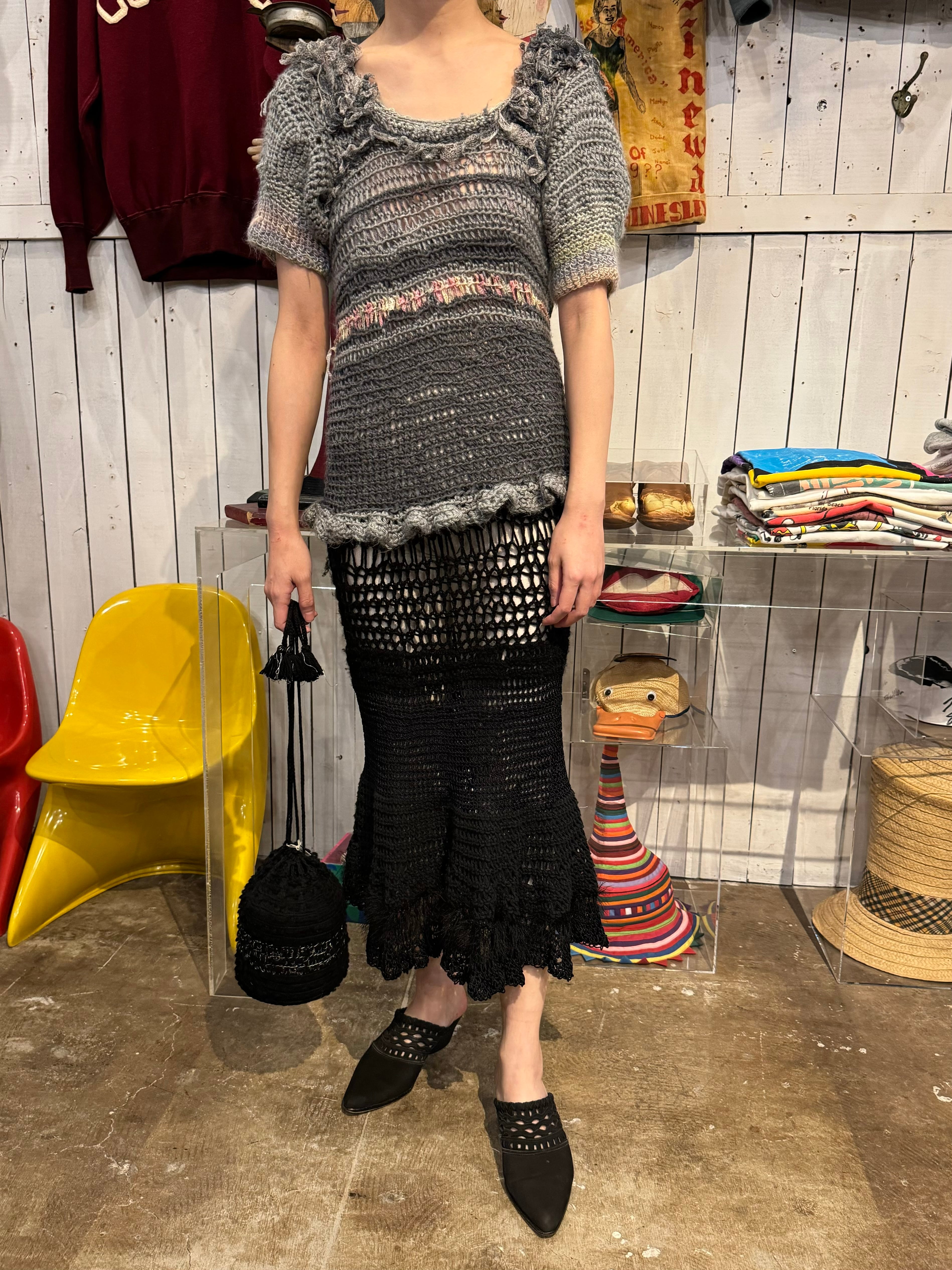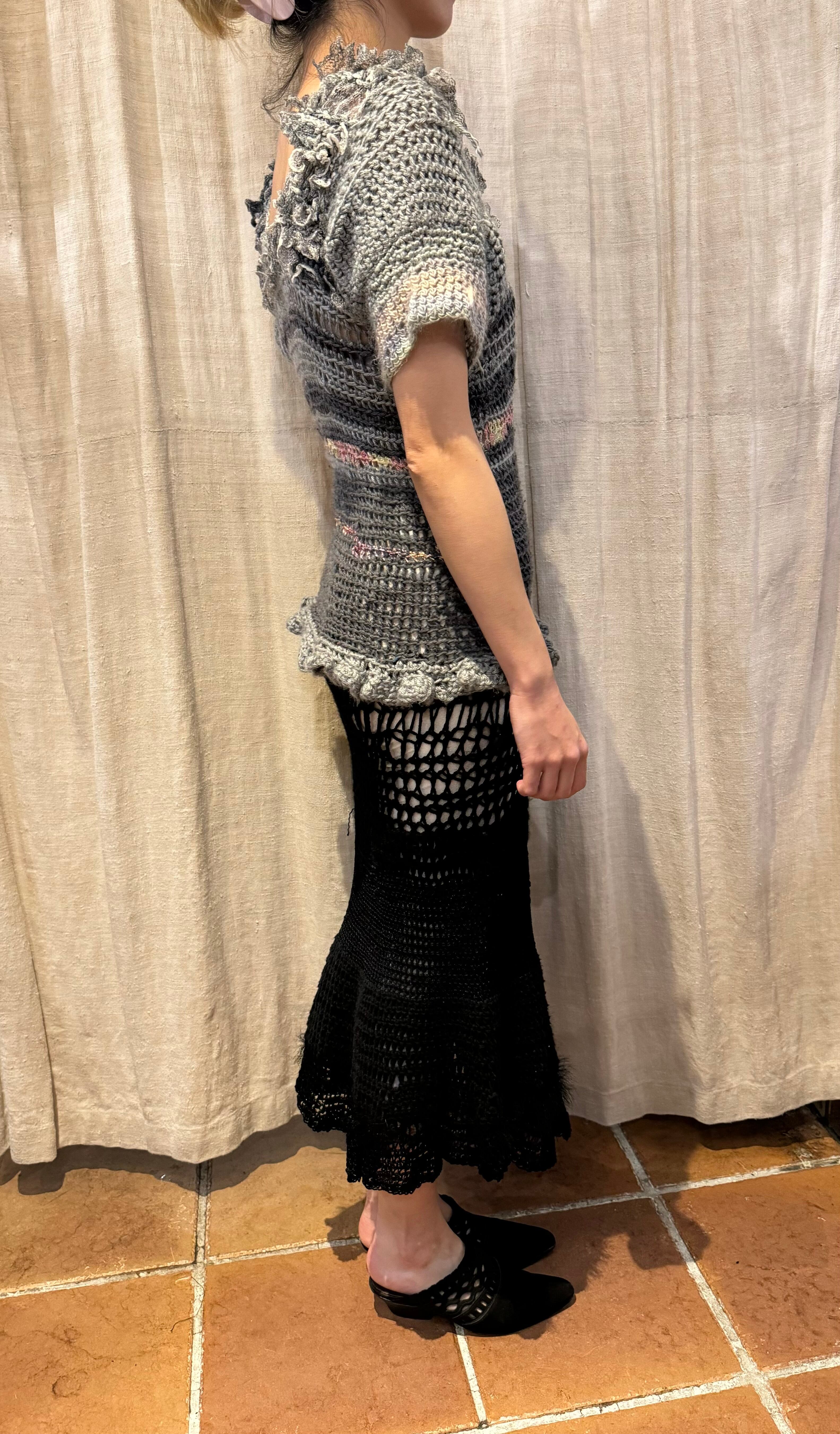 ざくざくのローゲージで所々編み方だけでなく素材も切り替わっていてどこまでも手の込んだアイテム。首元のフリルや裾などディテールにも見入ってしまいます。ニットですがほっこりしすぎない大人なカラーリングも◎レイヤードも思う存分楽しんで。