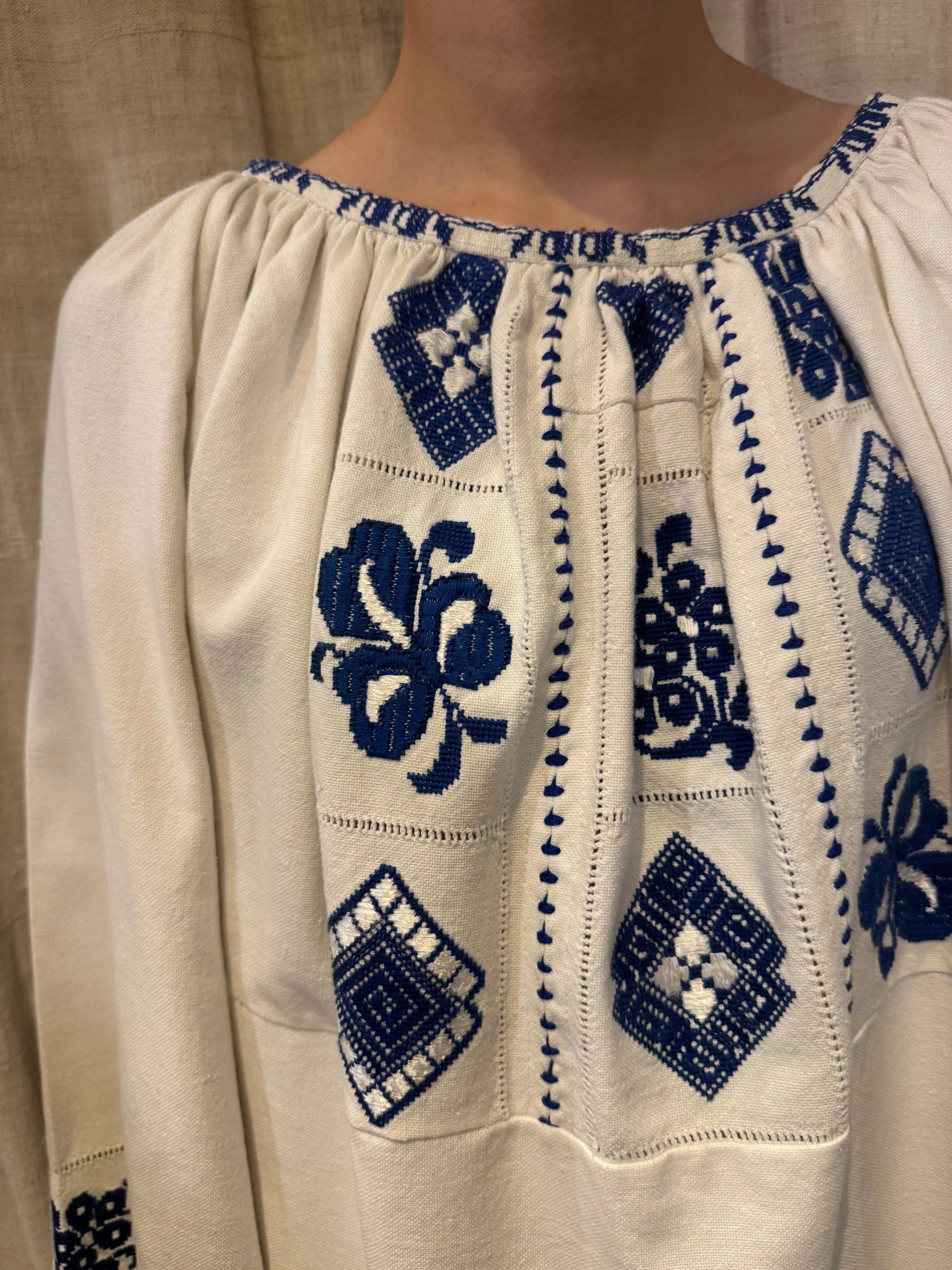様々なモチーフの細かく丁寧な刺繍に惹かれます。袖がレースになっていたり、首元にまで刺繍が入っているのは珍しいと思います。ふわっとするシルエットも言わずもがな魅力的。色味が白に青なので今からのシーズンも◎下にタートルのニットなど合わせても良いですね。