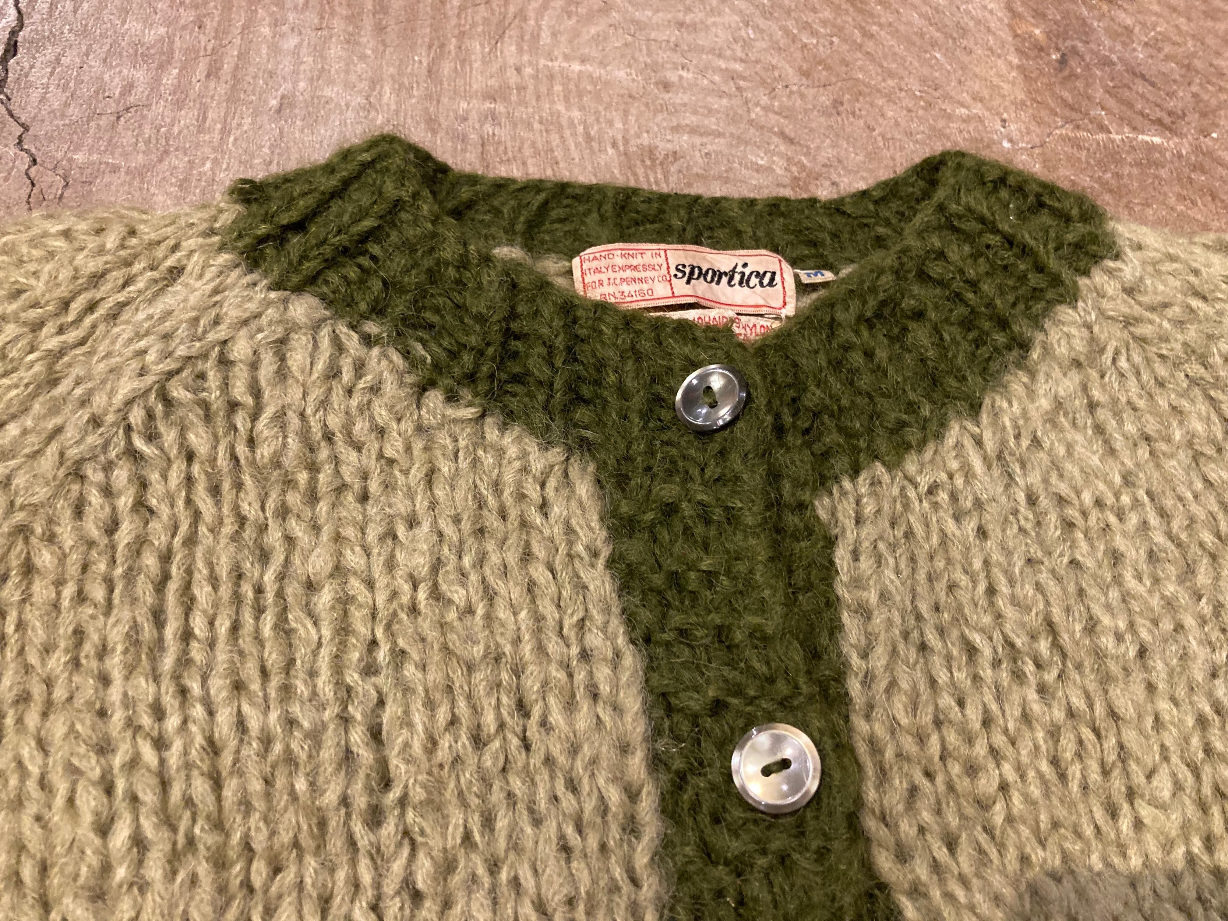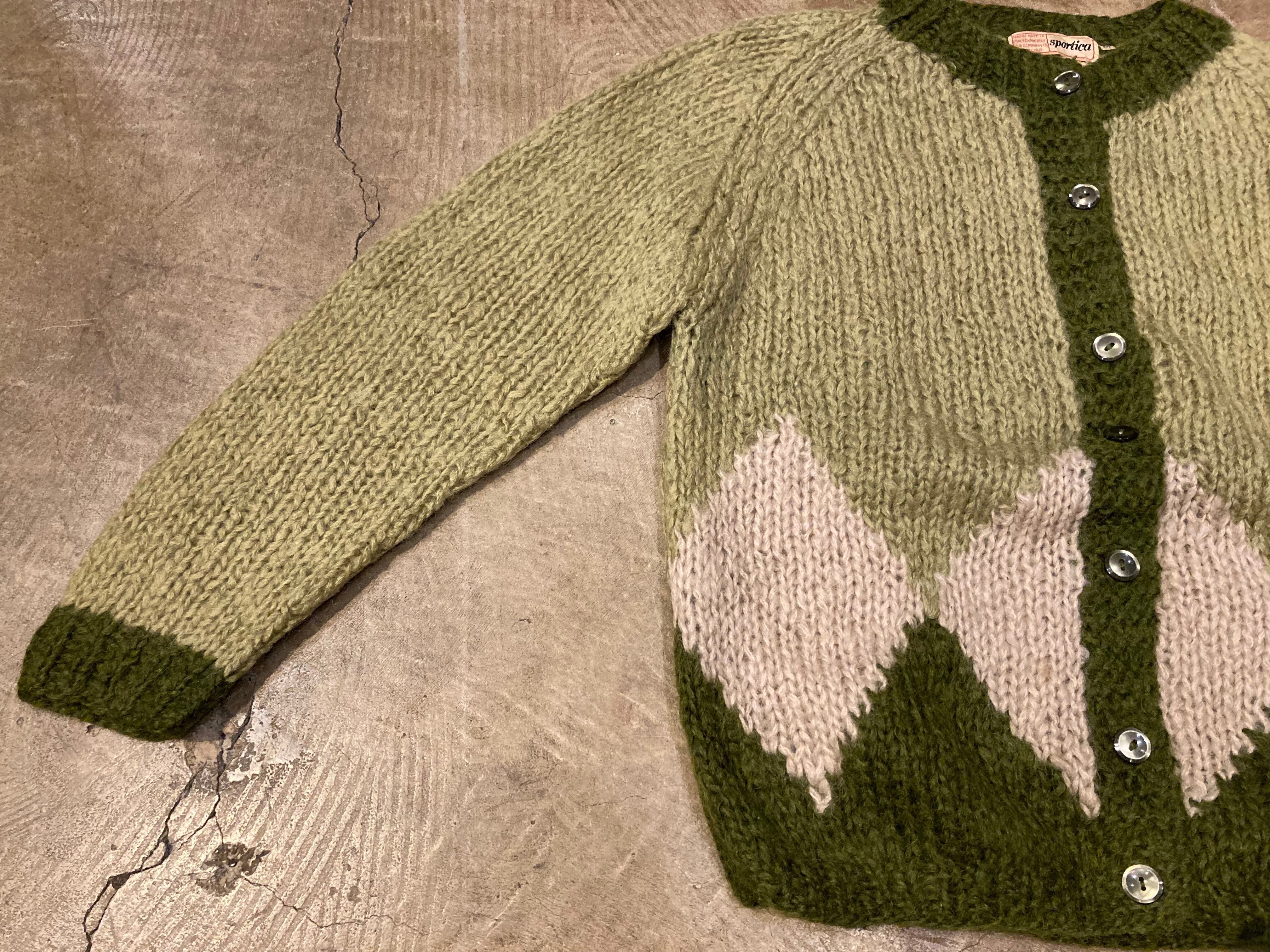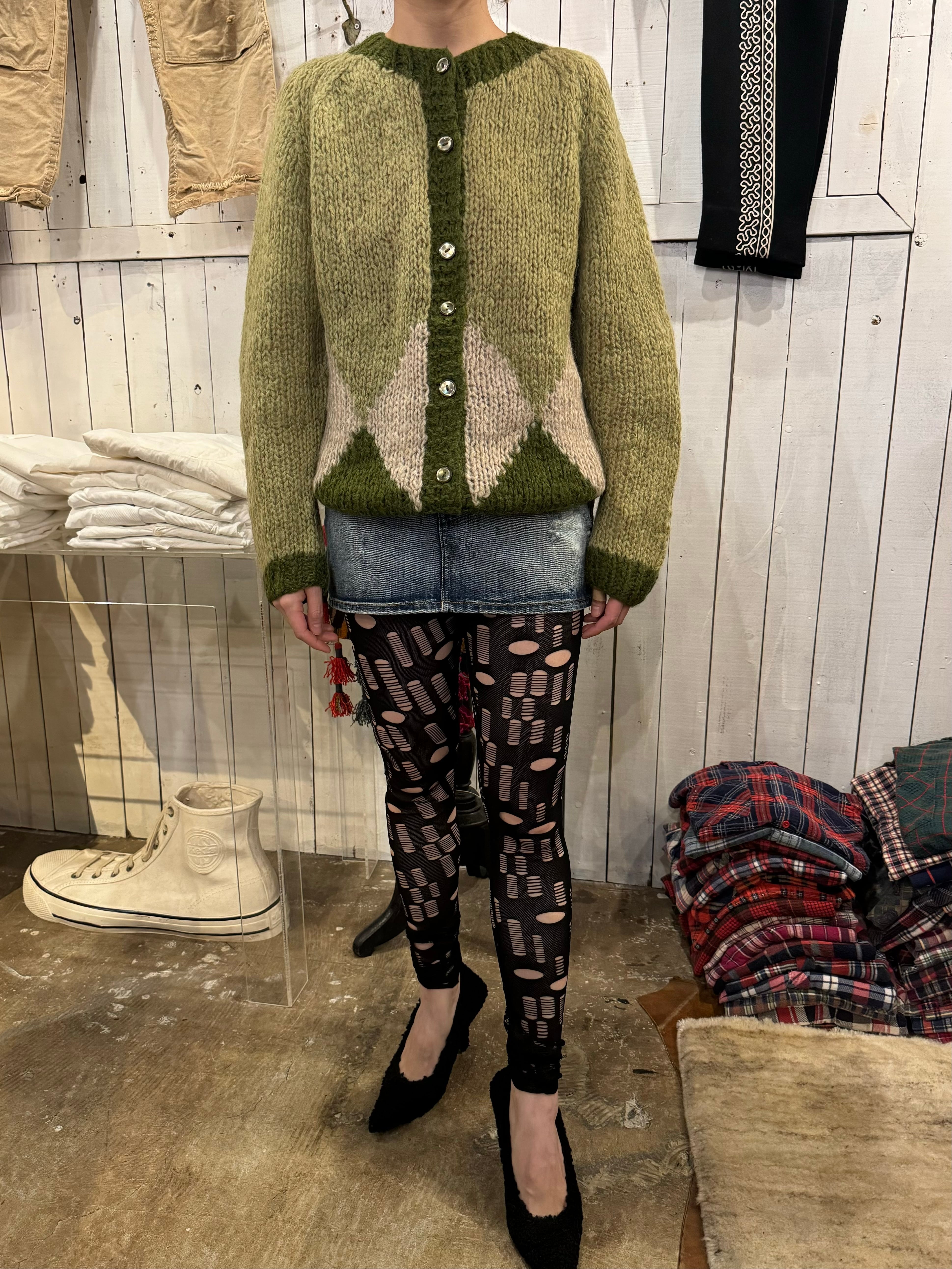 裾野あたりに控えめにあしらわれたダイヤ柄、異なるグリーンのカラーリングに惹かれます。よく見るとボタンのつき方が均等ではないのもちょっとヘンテコで可愛い。程よくコンパクトなサイズ感で暖かい時期の羽織にも重宝しそうです。vintageならではなかっこいいタグも◎
