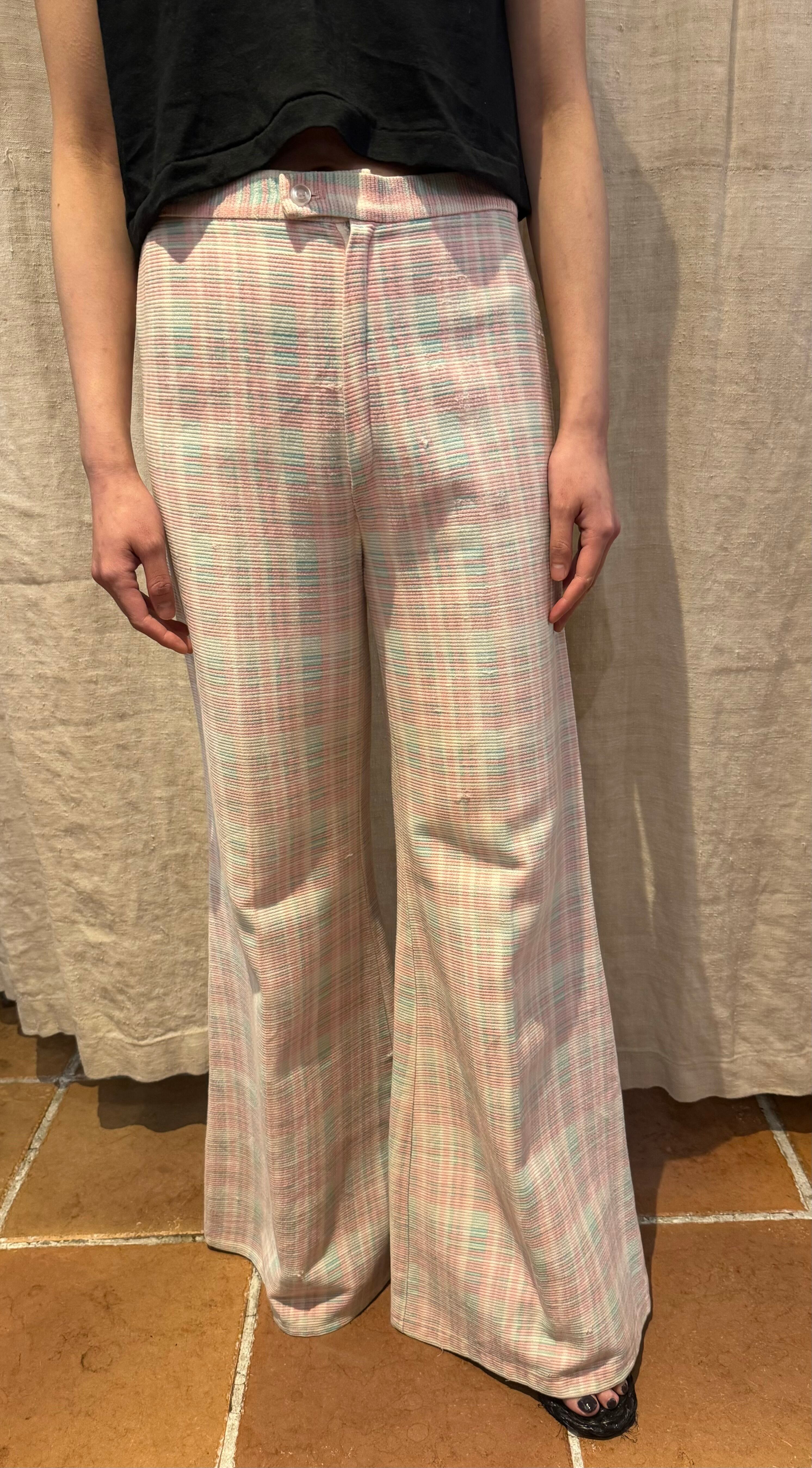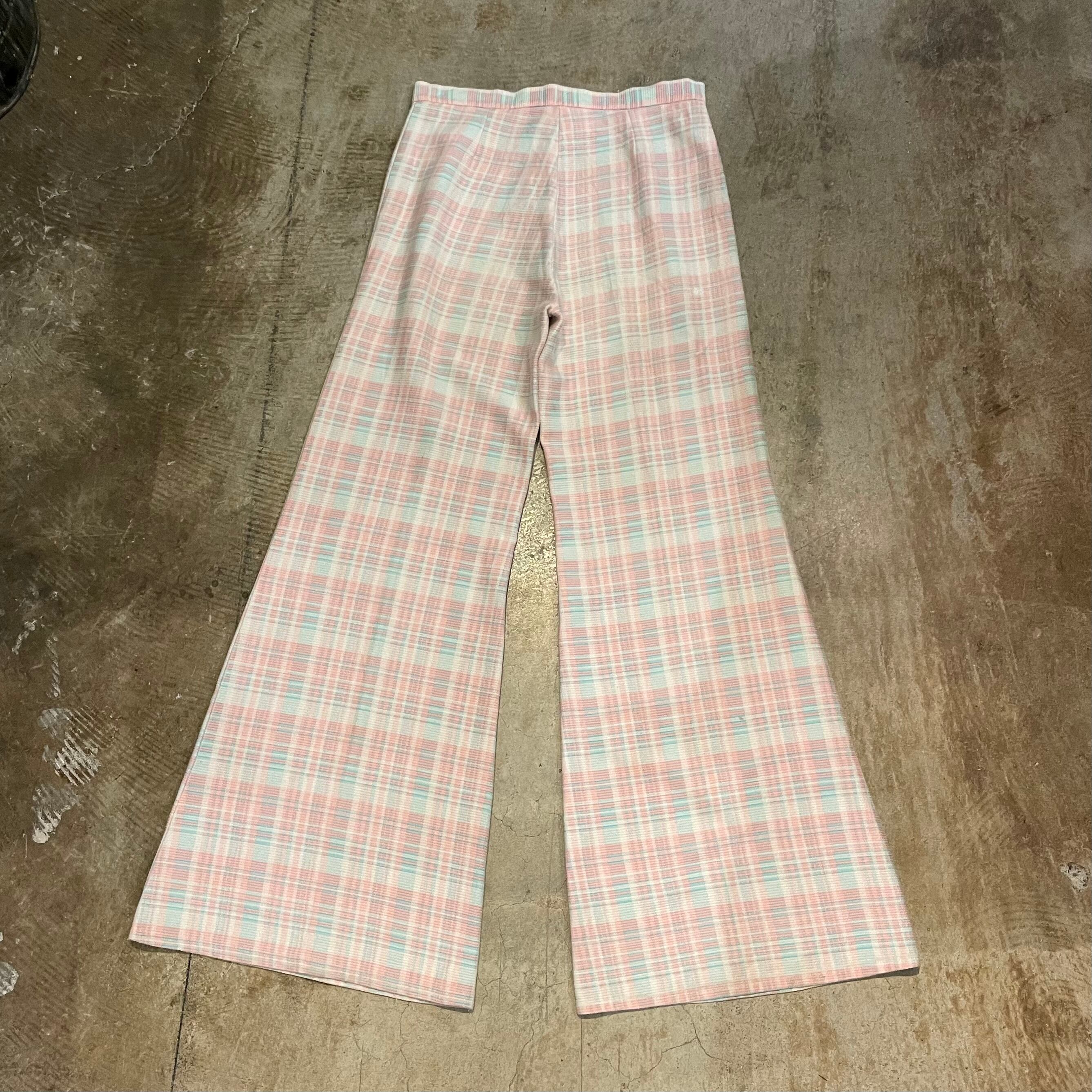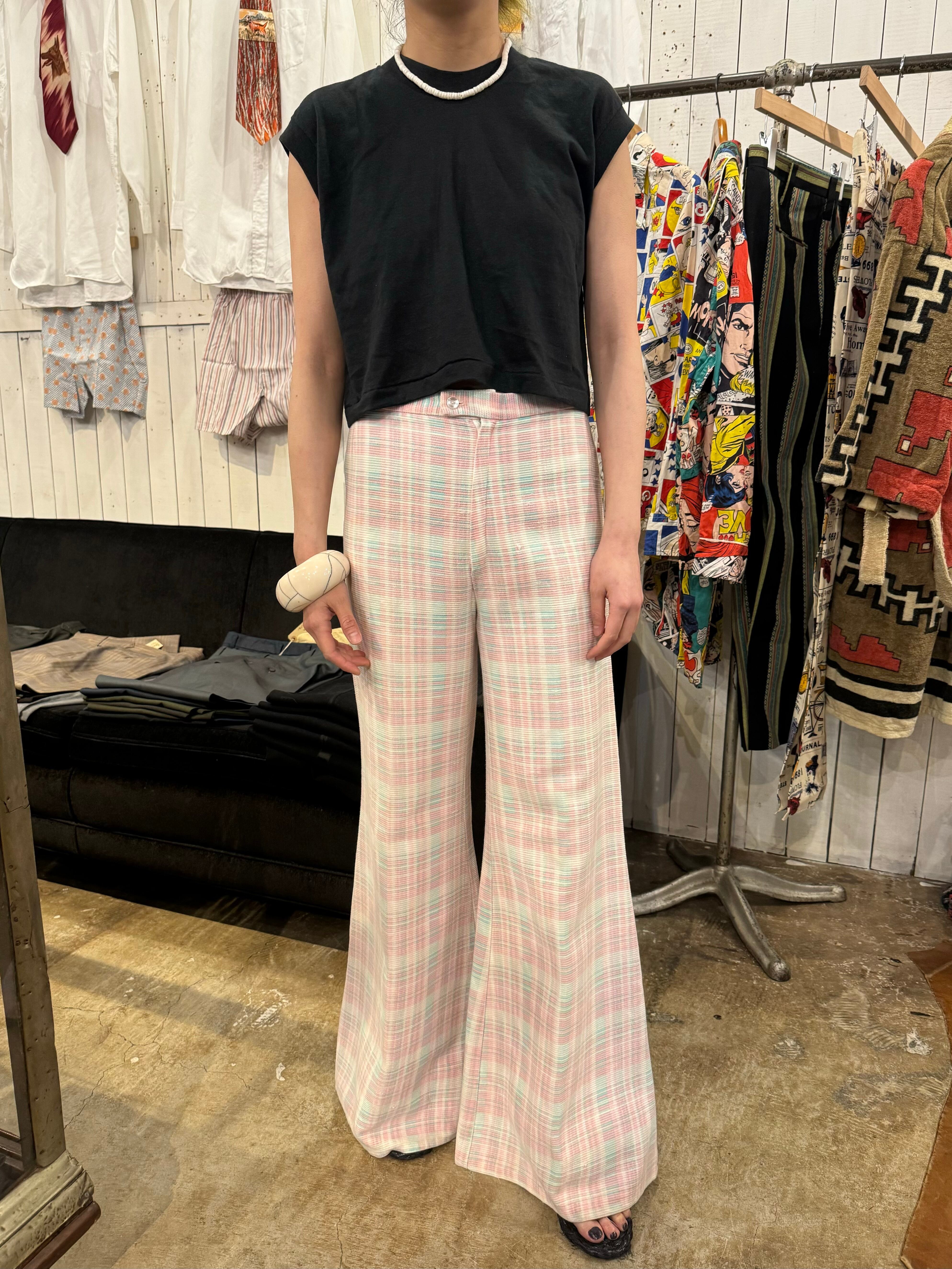 全体的に淡いカラーで派手過ぎずスタイリングに馴染み、裾にかけて大きく広がりフレアでセンタープレスがかかりシルエットが綺麗でより古着らしいスタイリングになると思います。