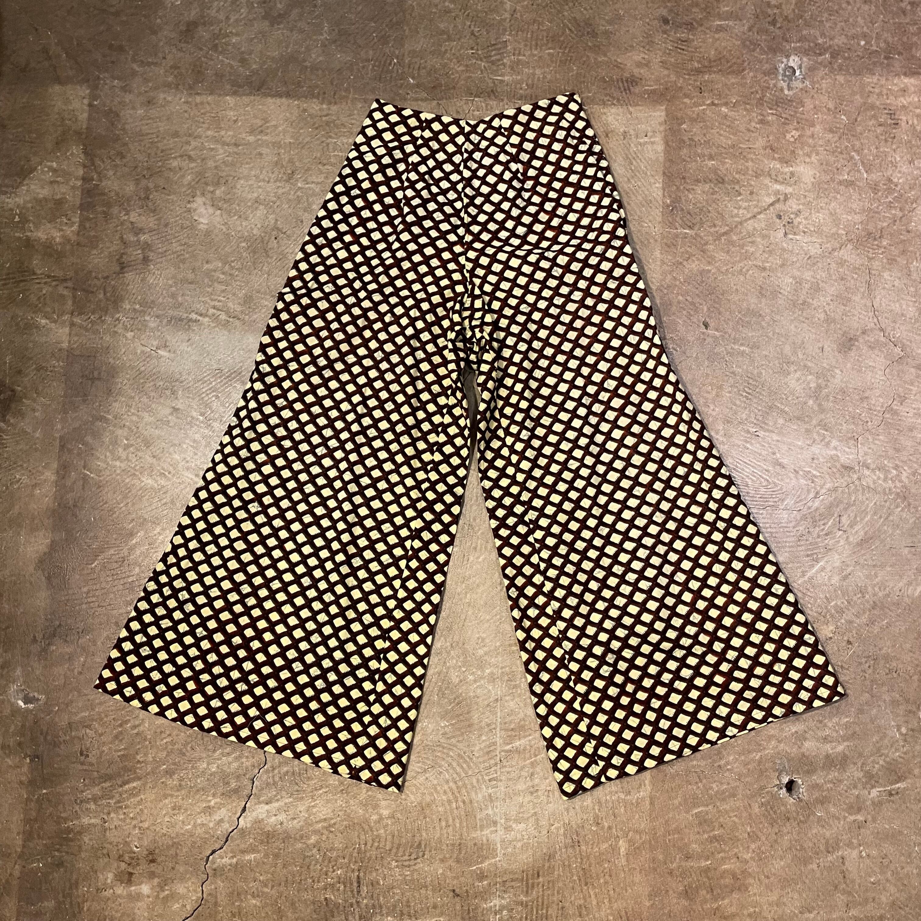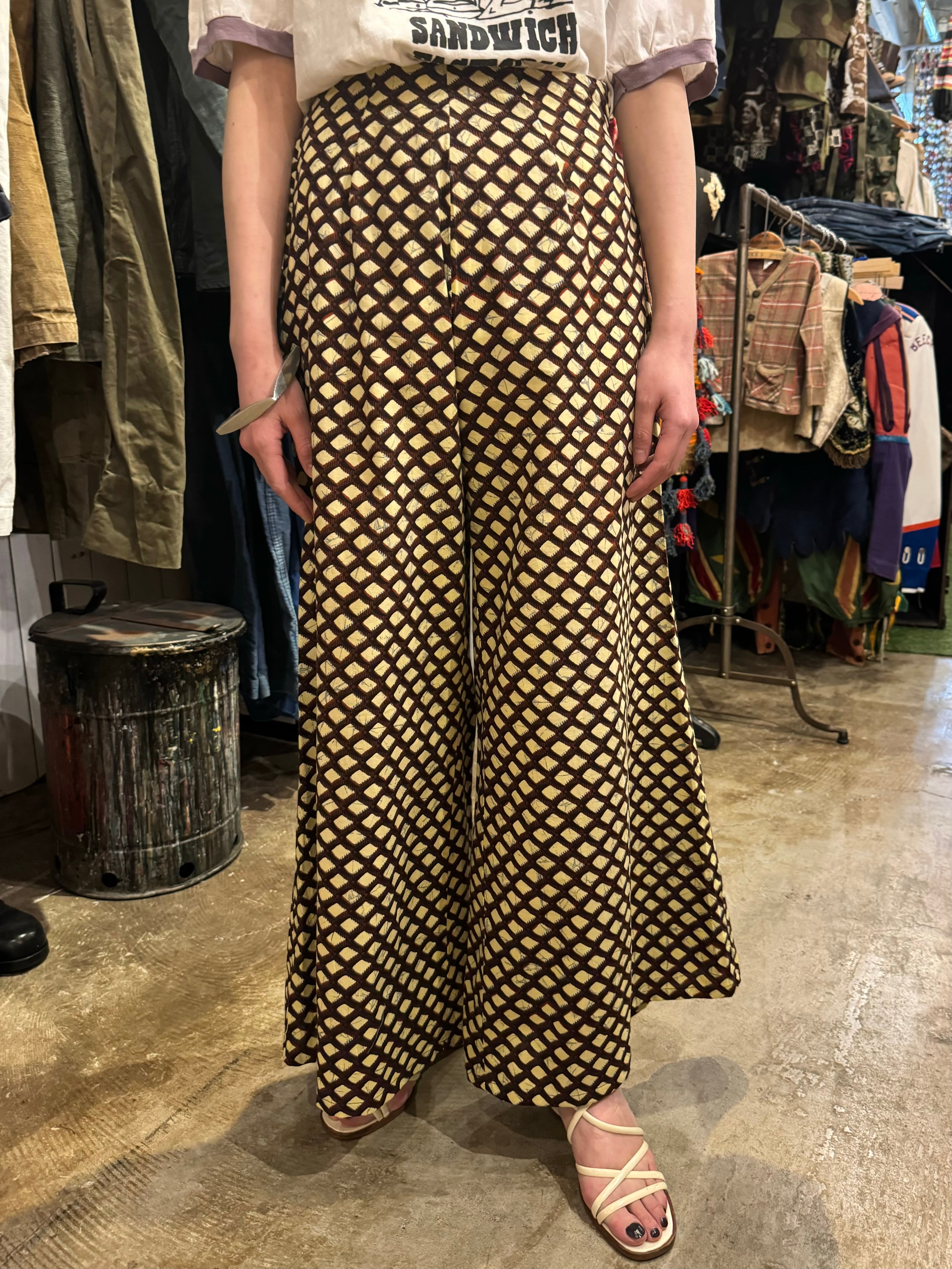 アフリカンバティック柄のフレアに広がるワイドパンツ