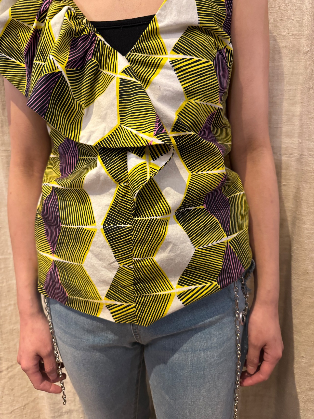 アシンメトリーな袖のデザインのアフリカンバティック柄のトップス