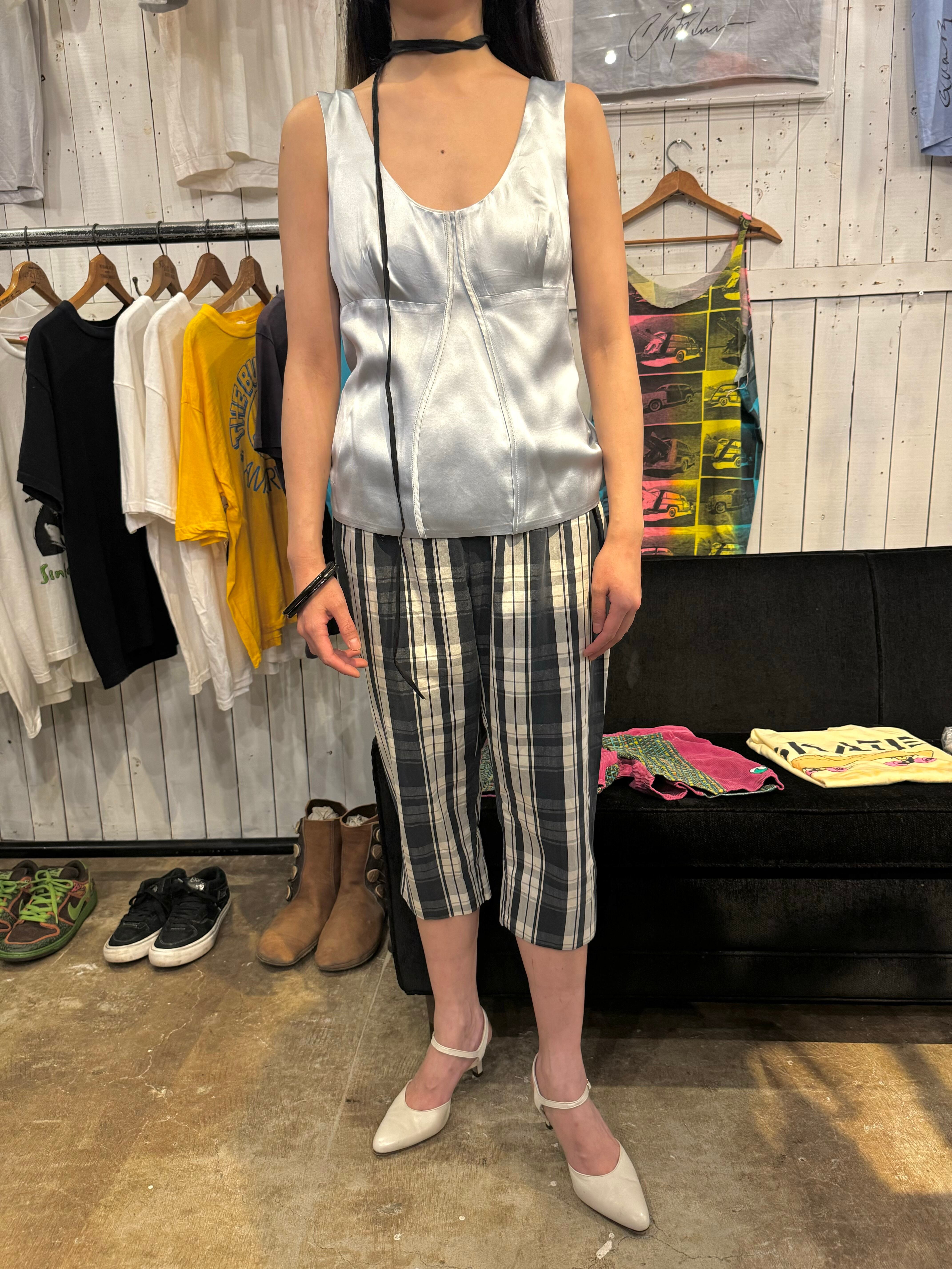 シンプルな作りですが、着用した時のラインの美しさが引き立ちます。フロントの切り替えや光沢感のある生地感はとても可愛いです。着丈は長すぎず短すぎないので、様々なボトムスと相性が良く、色々なアイテムと楽しんで頂けそうです!