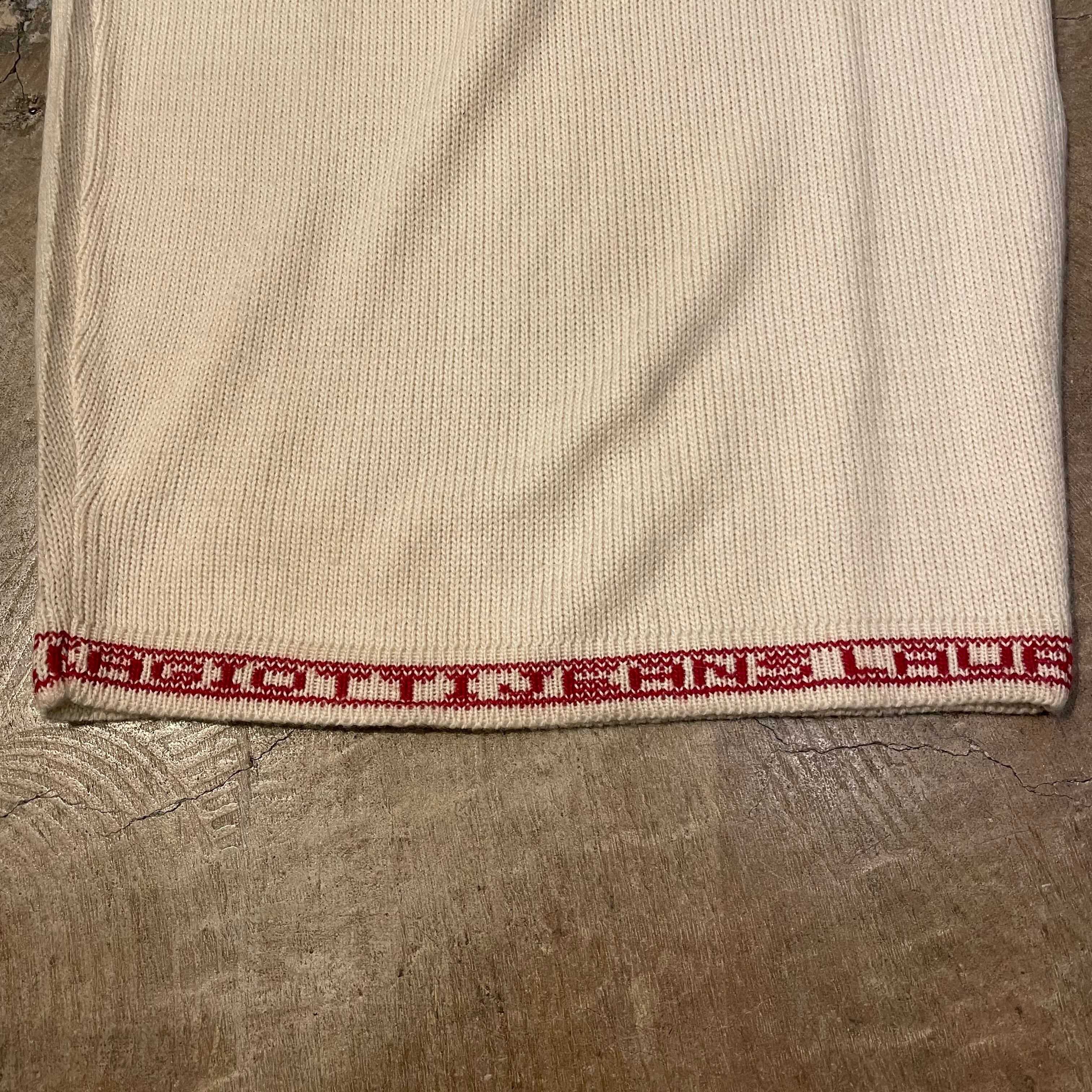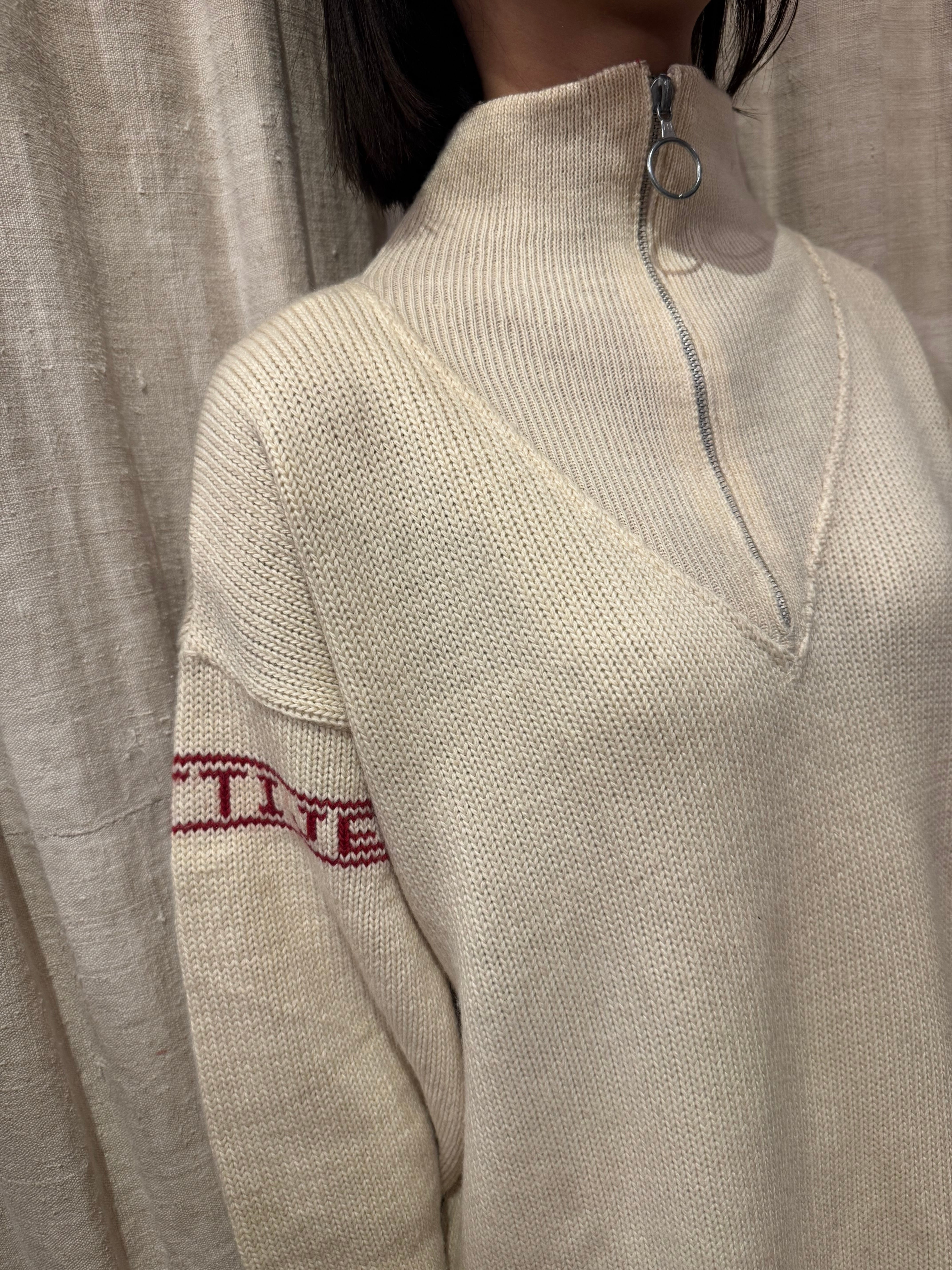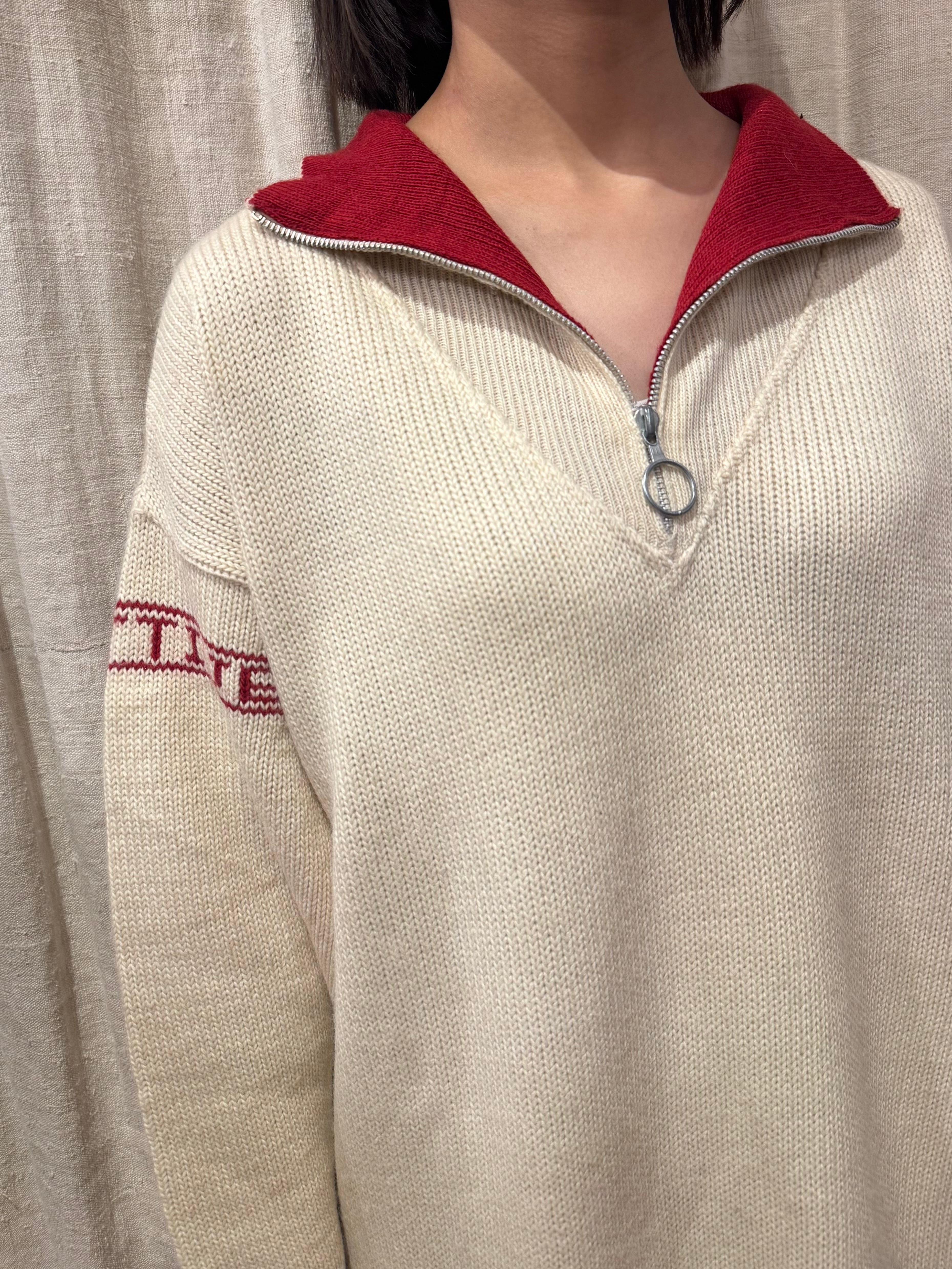 身体に馴染むくたっとしたニット生地で、ロゴのようなデザインが袖と裾に入り、ハーフジップのディテールなどもポイントになり使い勝手の良いデザイン。ジップを開けると襟の部分が赤で可愛いです。