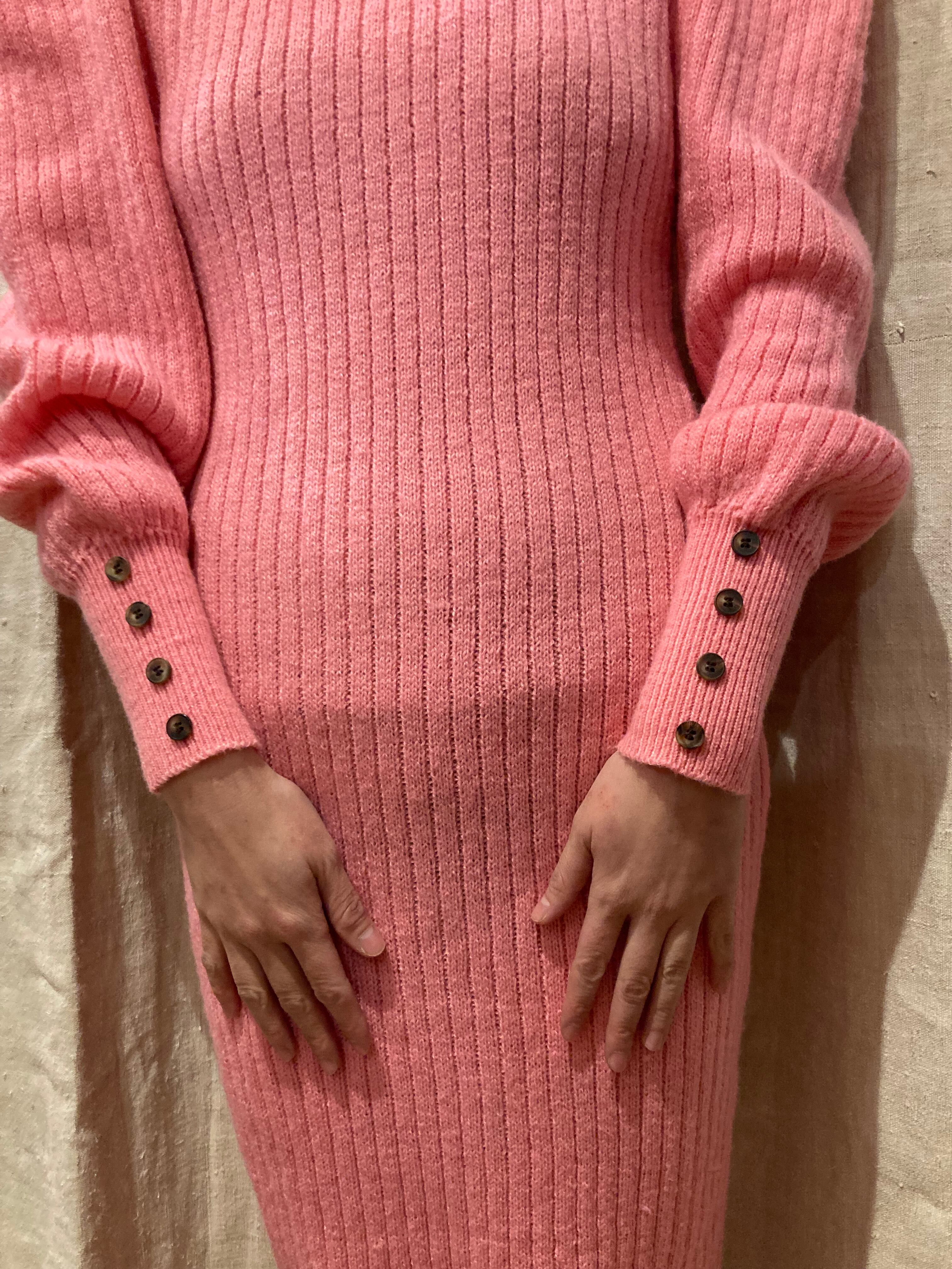 全体的に身体に馴染むIラインシルエットが上品で、ピンクカラーや袖のパフスリーブ、長めのカフスデザインが可愛いニットワンピース
