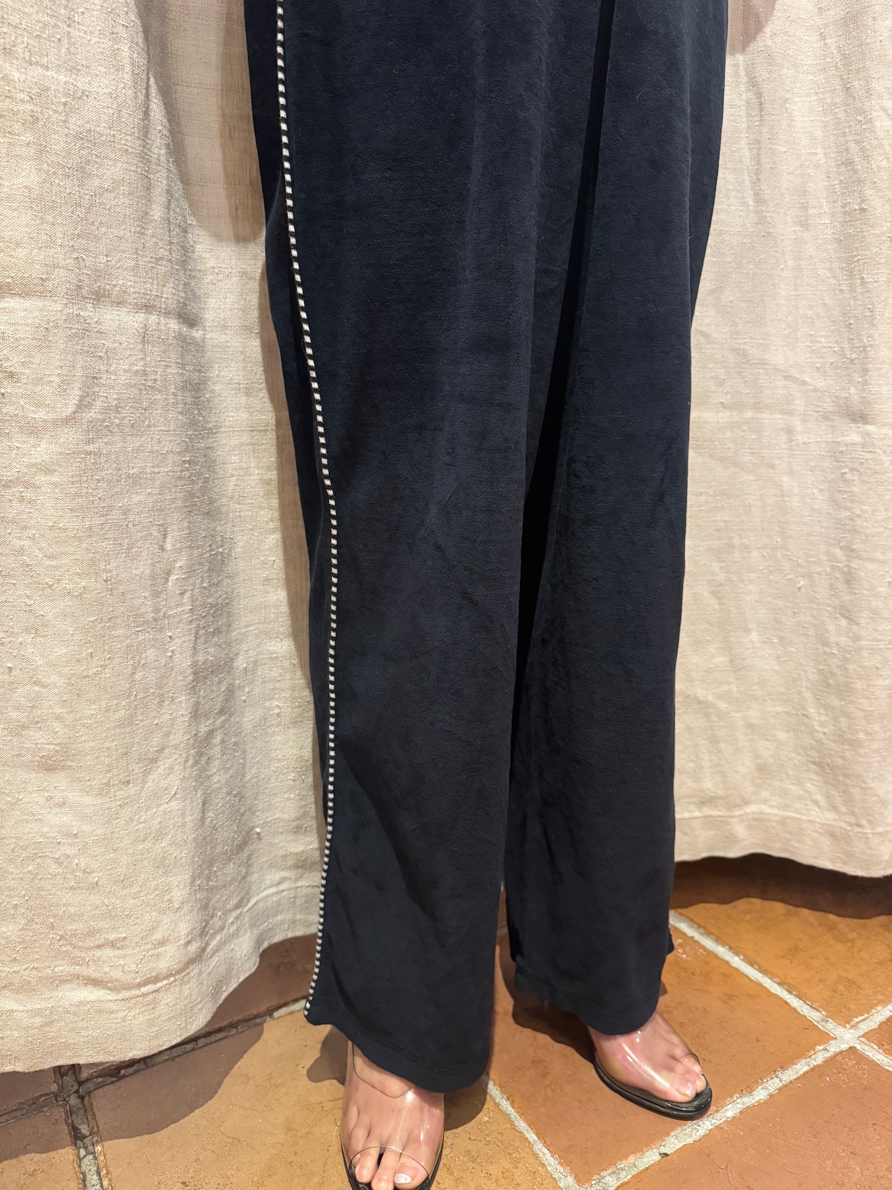ウエスト部分はゴムが入り紐もつくのでしっかりと絞ることが可能となり、白ラインのデザインが程よくポイントになります。細すぎずちょうど良くストレートに落ちるシルエットやベロア生地がカジュアルすぎず普段使いしやすいと思います。