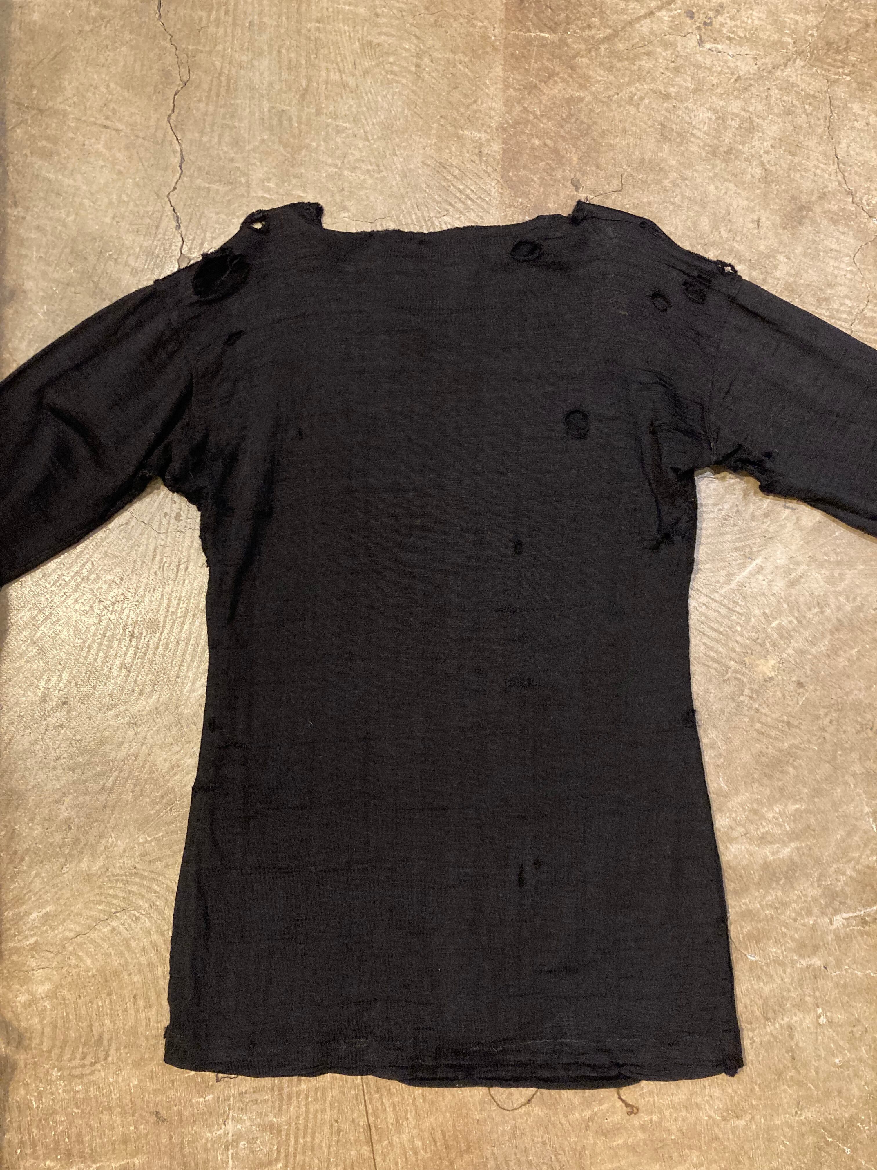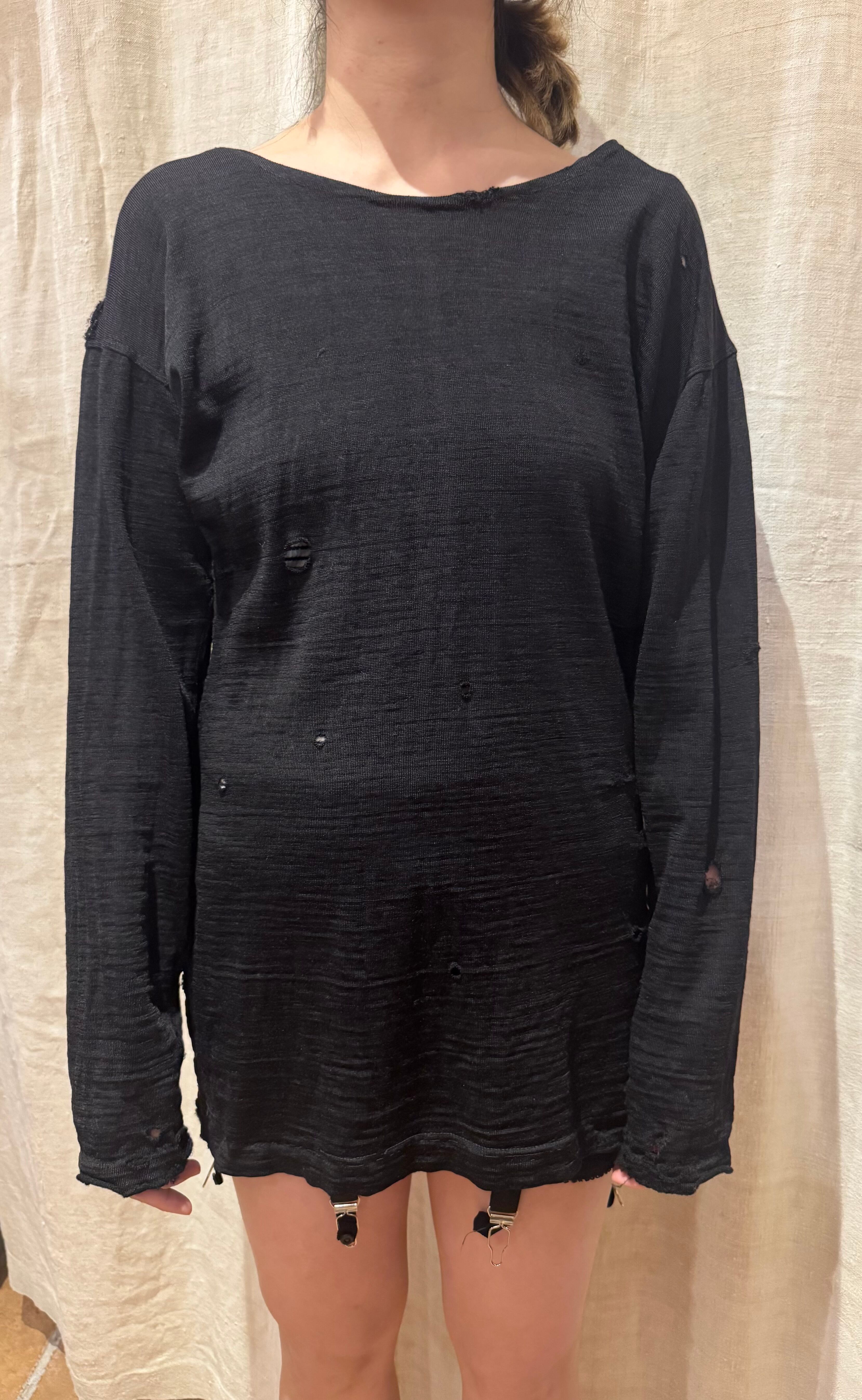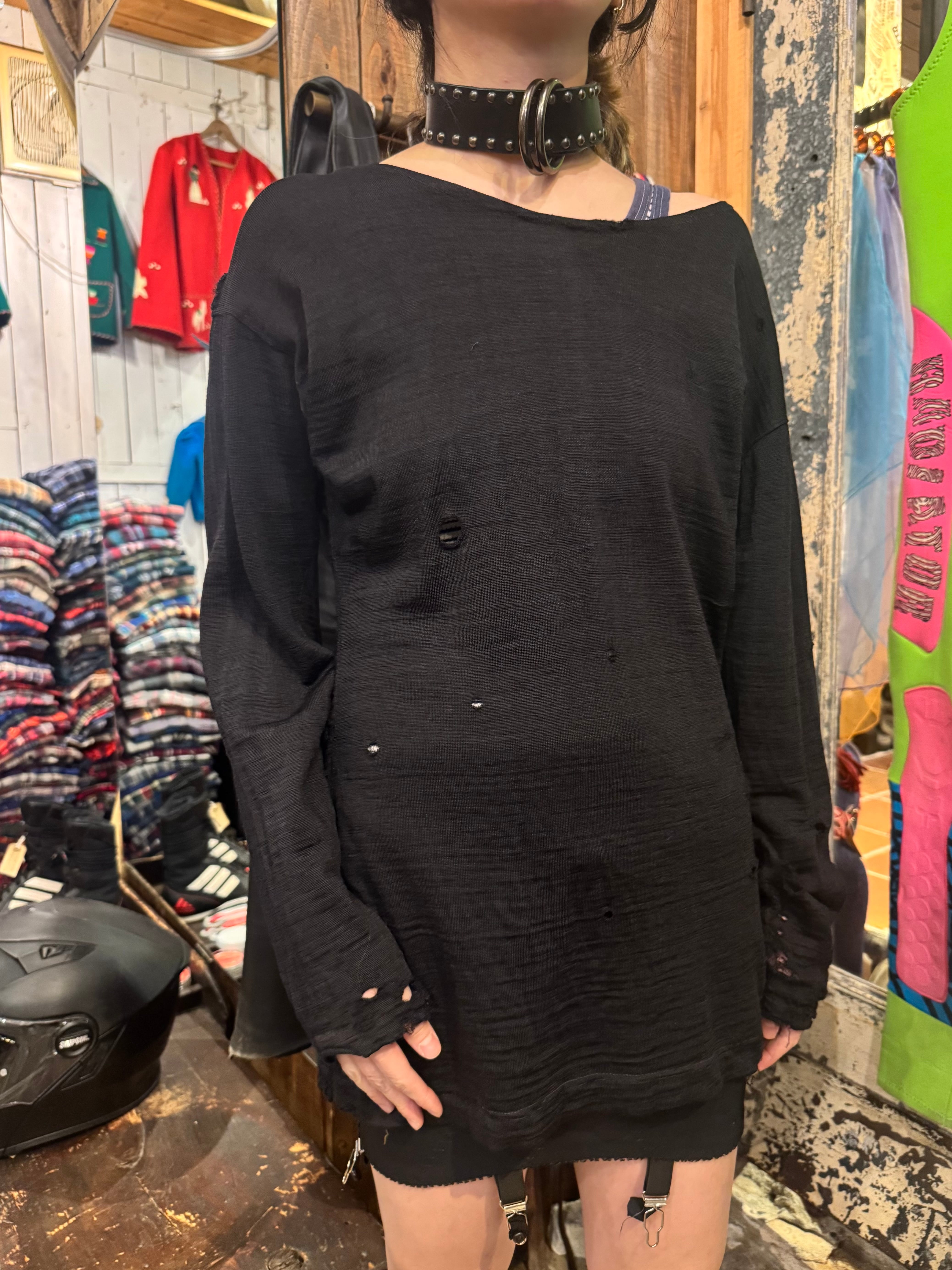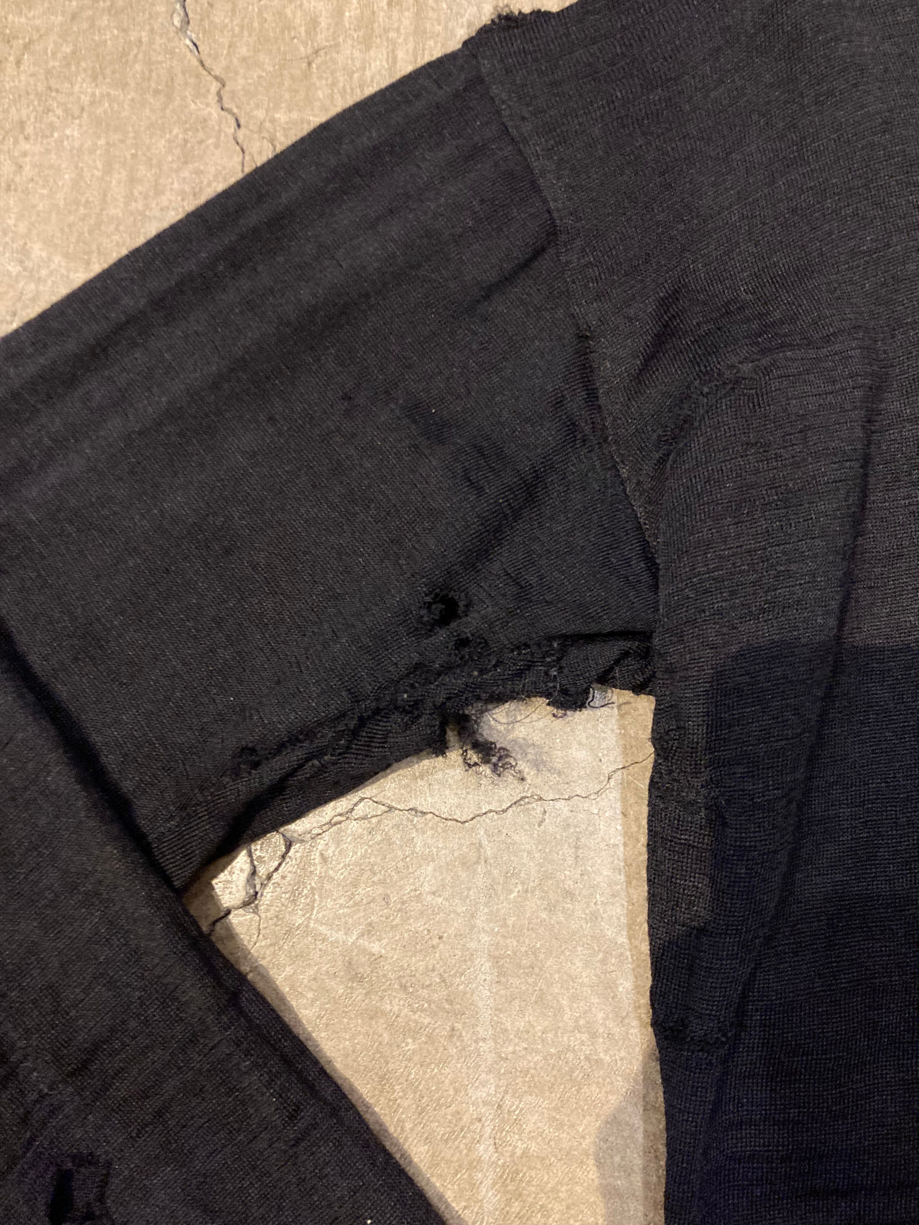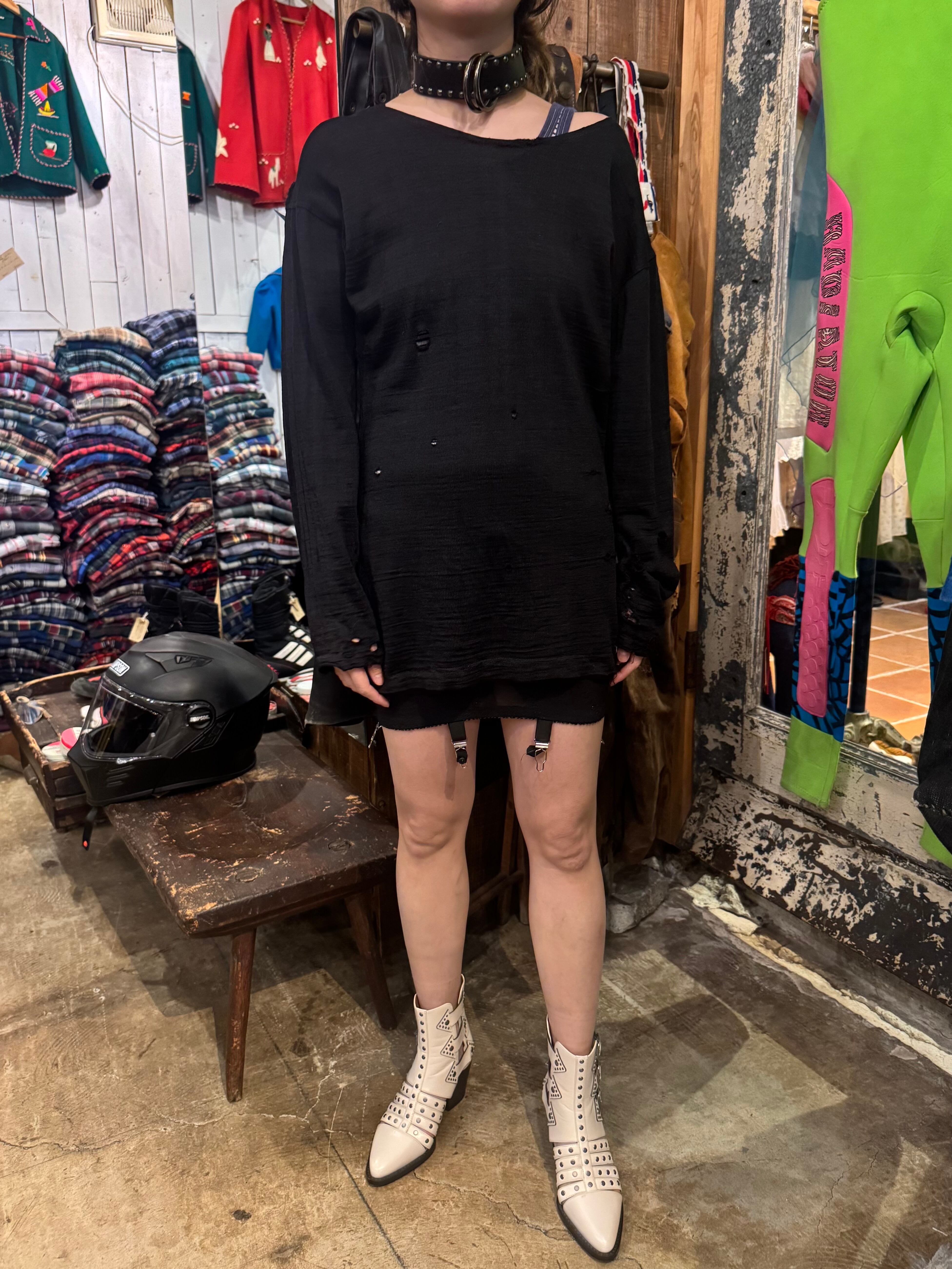 所々ざっくりとダメージの入ったボロ感がポイントとなり着丈が長めでレイヤードアイテムとしても使い勝手が良く、薄手で春先まで着用頂けると思います。雰囲気抜群で、リペア箇所までも可愛い。